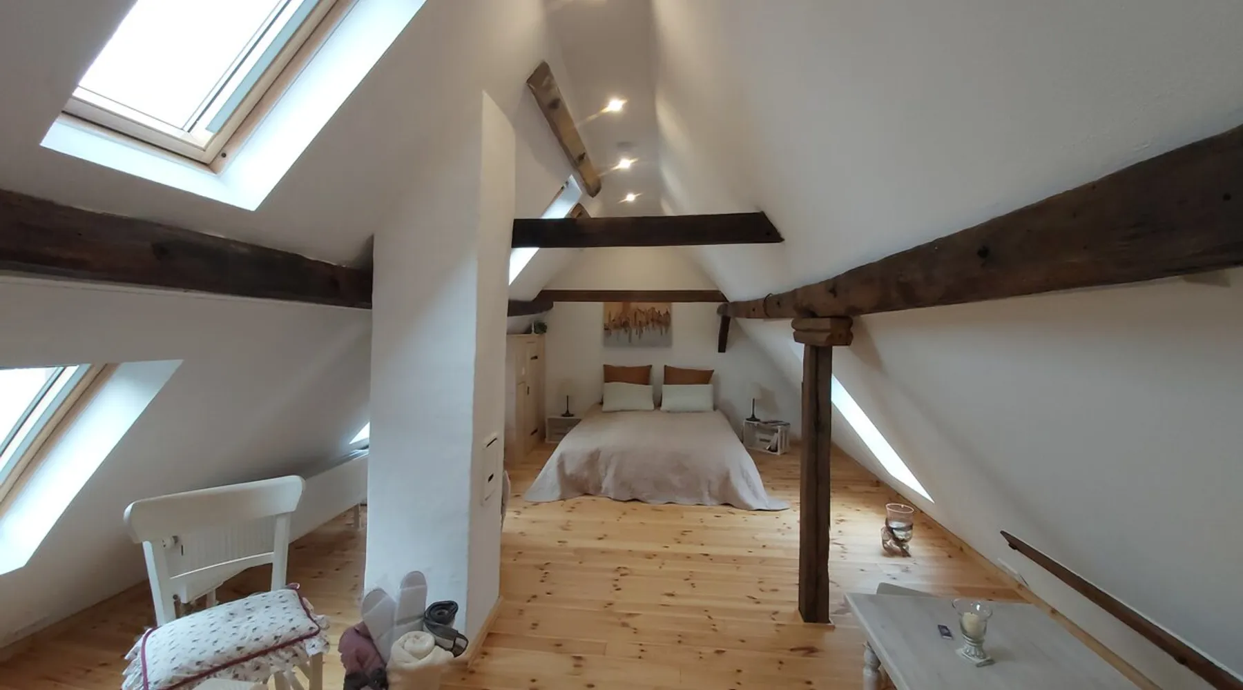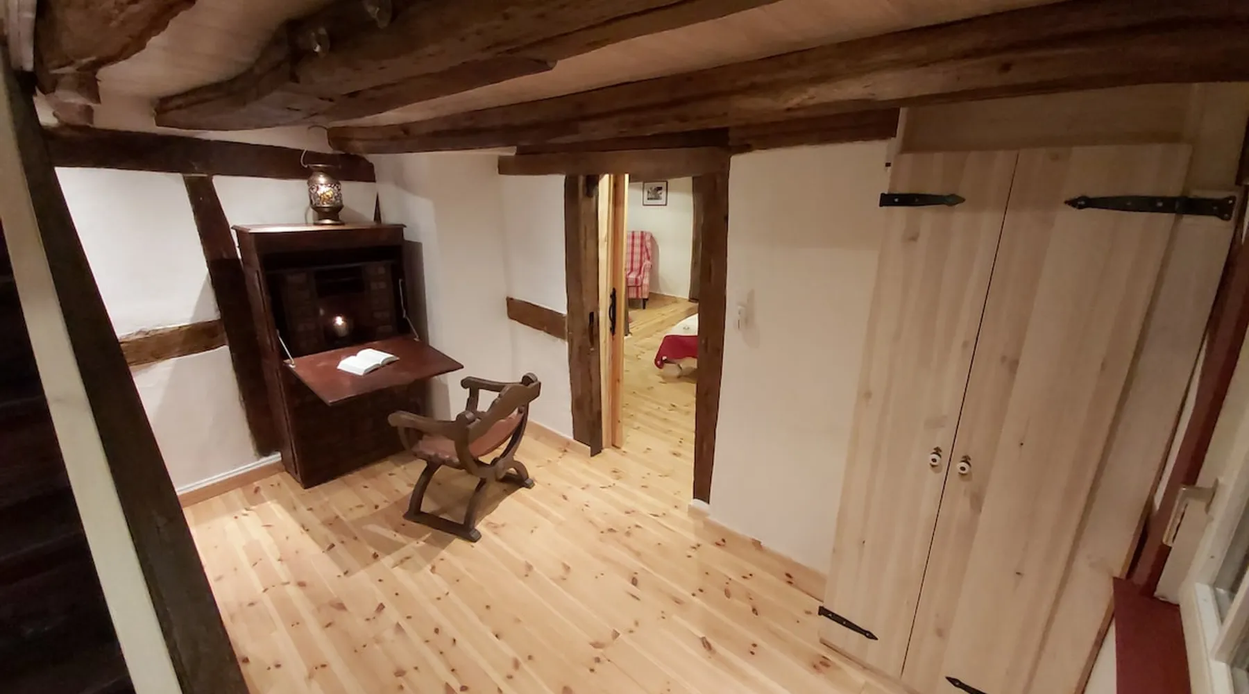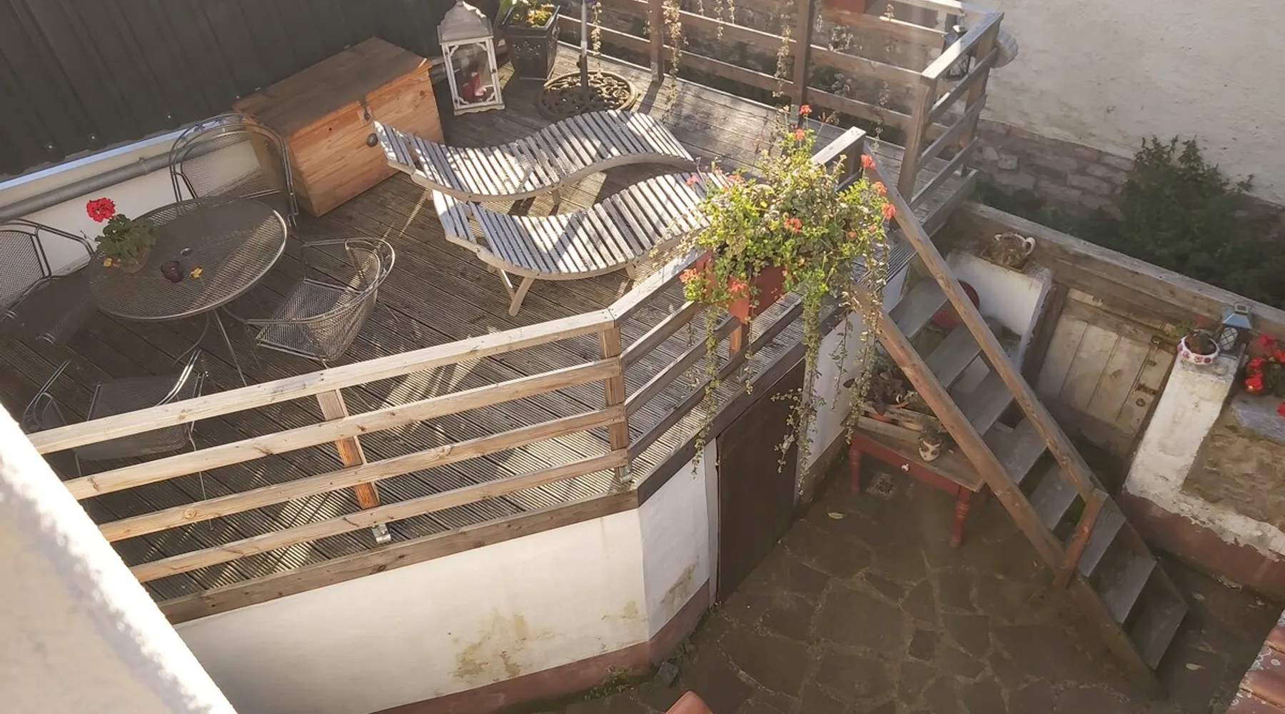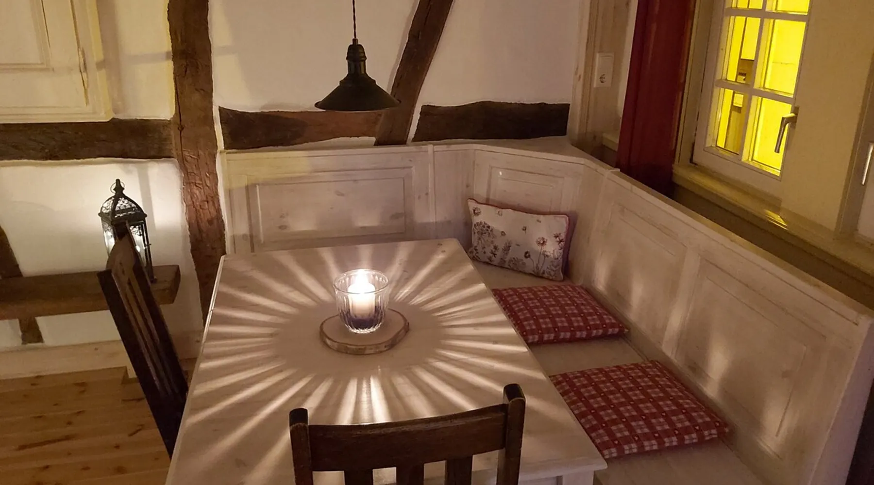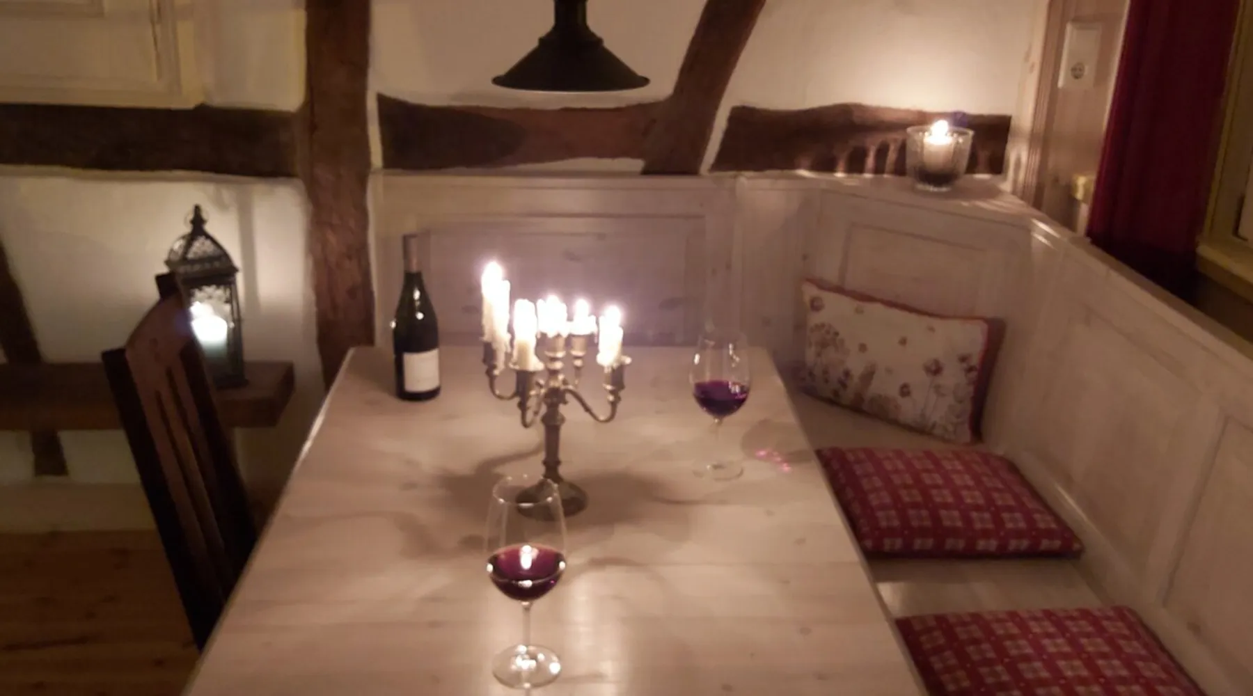 Treat yourself to a visit to our half-timbered house Anno 1690, renovated in 2019, in the very quiet old town of Stromberg, right by the Schlossbrunnen fountain below the 3 castles. The kitchen on the 2nd floor is excitingly located in the former battlement of the city wall. The medieval building still has the typical steep oak stairs and the ceiling height is outside the norm. Cozy stay in the house and as a starting point for hikers & bikers....for relaxation and adventure... The space First floor: Entrance area with access to the courtyard and sun terrace on the historic vaulted cellar. NEW!!! Another bedroom with a French double bed behind the 1.5-meter-thick city wall. NEW!!! Toilet on the first floor. 2nd floor: Kitchen, dining and living area with fireplace: The good room 3rd floor: Bedroom with separate dressing area, hallway with secretary. In addition, the marble bathroom with sitting and shower tub. 3rd floor: Attic studio can be used as a living room as well as a bedroom. Guest access You have the entire living area and the sun terrace all to yourselves. Other things to note Beds are available for 6 people; 2 bedrooms with double beds and in the living room 2 sofa beds as single beds.