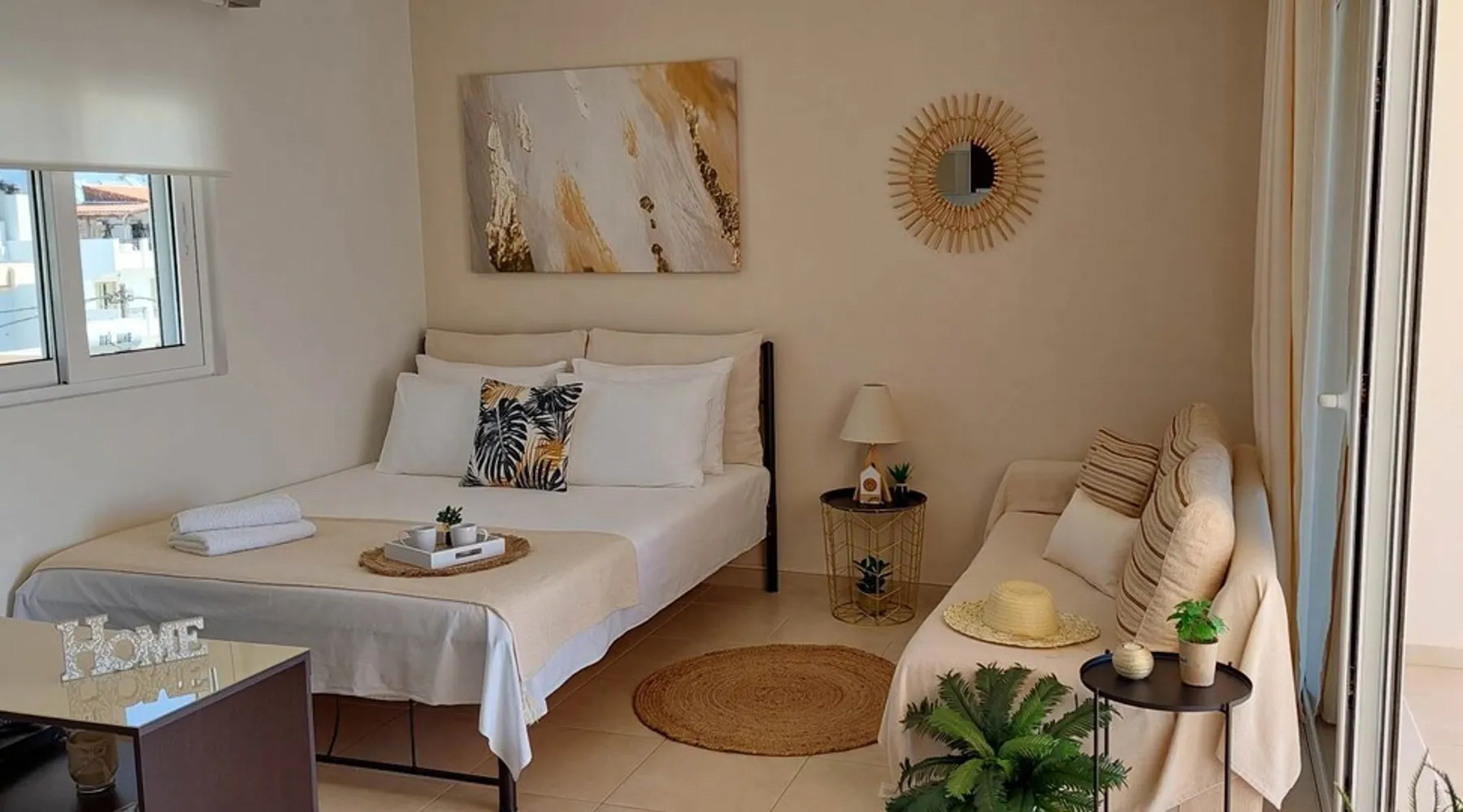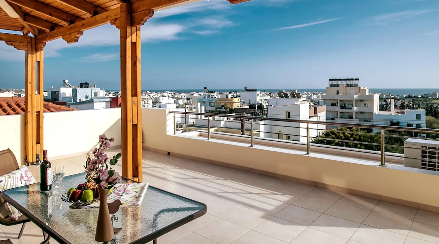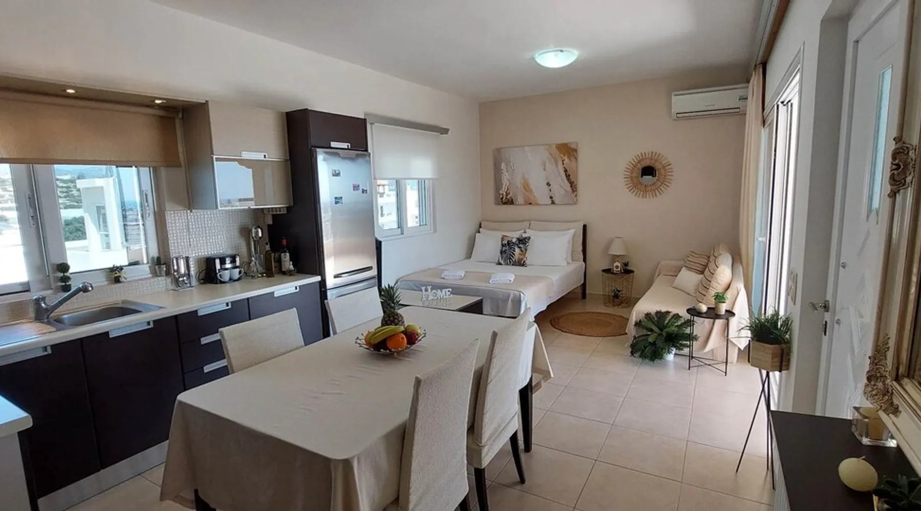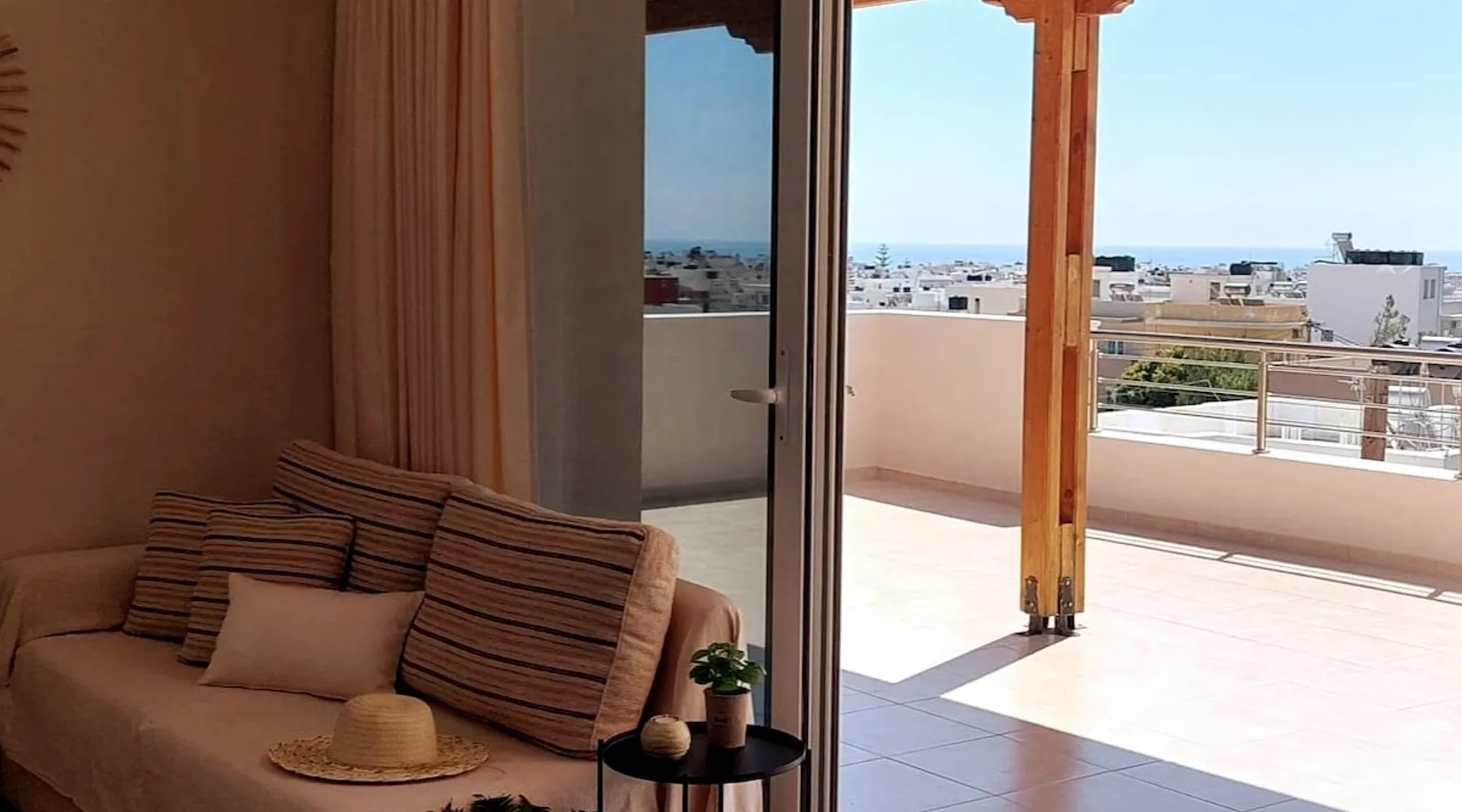 Enjoy your stay in Ierapetra in this newly built apartment with perfect view. Fully furnished a short distance from the city center.Beautiful and bright,guests can relax on the comfortable terrace overlooking the Libyan sea.Ierapetra combines montain and sea,it is the city of relaxation and tranguility.Every Saturday there is a bazaar where you can buy fresh fruit and souvenirs.It has great beaches,cafes and restaurants. We wish you a great time in our city.!!! The space The apartment is self-contained, the interior consists of a living room with a comfortable bed - smart TV and bar, air condition. The kitchen area includes a dining area, electric cooker a filter coffee machine and all the equipment is on the shelves to cook as desired. The bathroom is comfortable with shower, hair dryer and clean towels. The sleeping area is comfortable with a double bed with an anatomic mattress. On the terrace there is the dining room where you can enjoy your romantic meals with the perfect view. Guest access The apartment is located in a guiet neighborhood,with two mini markets nearby where you can buy fresh bread and fruit.It is a suitable area for walking and there is plenty of parking space on the street. Other things to note We would like to inform our potential guests that we have taken all the necessary steps and following all the Health Protocols implied by the Greek Government’s Act of Legislative Content regarding the prevention of Coronavirus, the cleaning guidelines recommended by the ECDC (European Centres of Disease Control and Prevention) as well as the United States of America CDC (Centers of Disease Control and Prevention). We are monitoring this situation closely in order to ensure that we keep all the guidelines up to date. Registration details 00000612330