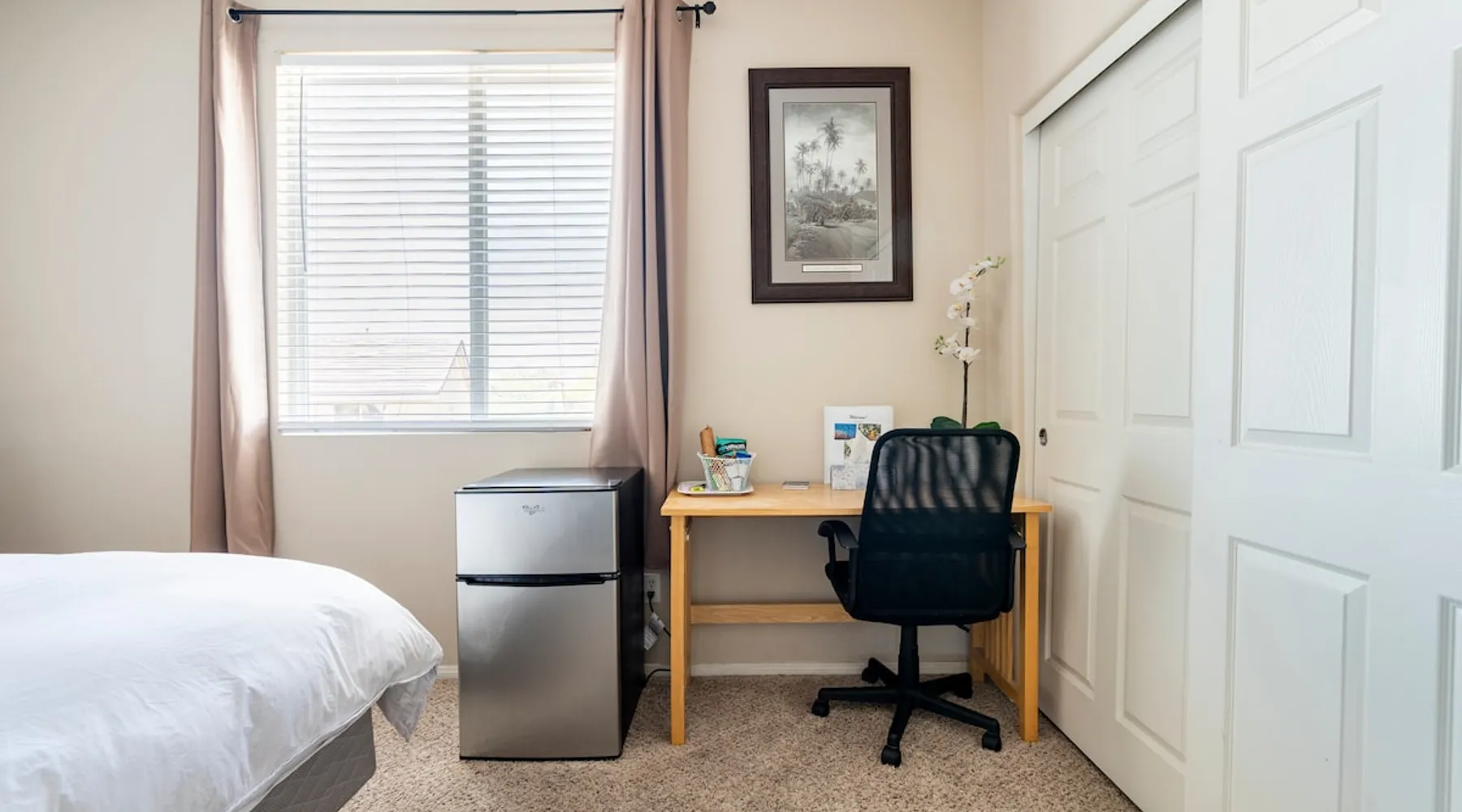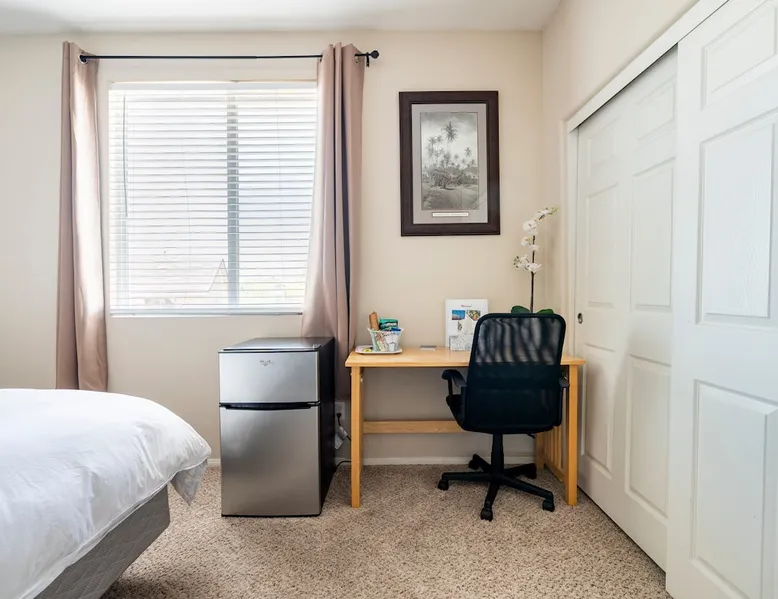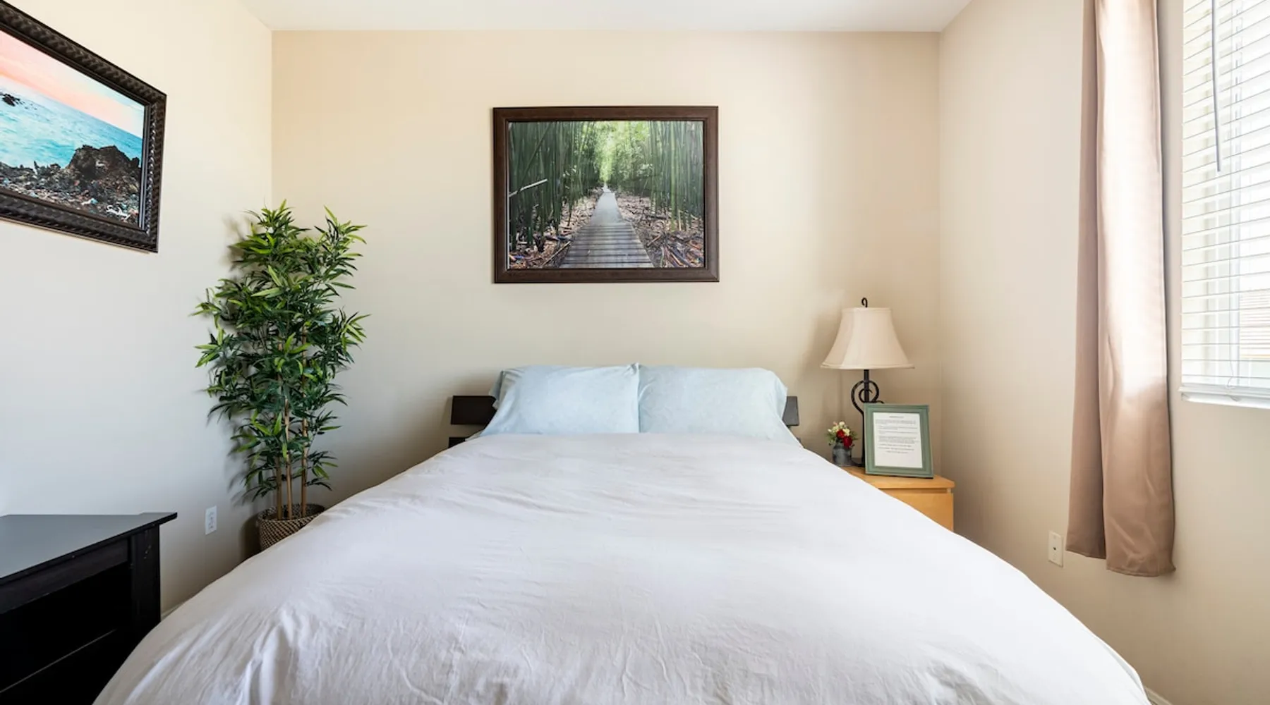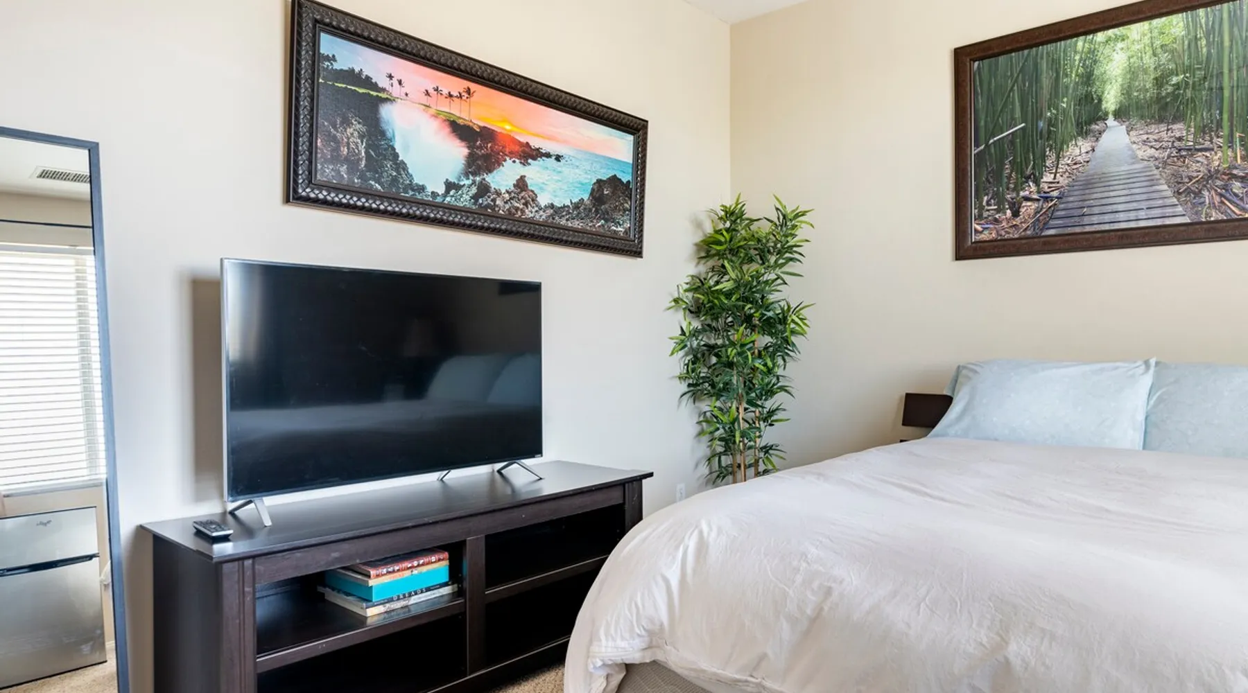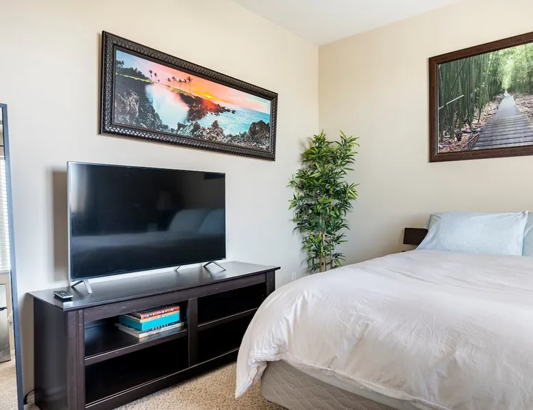 One upstairs bedroom w/ private bathroom inside the room. Includes queen bed, small refrigerator, and TV with streaming services. 24-hour check-in available. I respond to inquires immediately. **We have a roommate who has allergen to animal dander and shares living space with Airbnb guests, therefore we are unable to host any animals in the upstairs guest areas at this time since doing so will create a medical emergency for our roommate.** The space Large one bedroom with a dreamy soft queen bed, private bathroom, TV with streaming services, and mini refrigerator inside room, and comfy new amenities. Guest access Please read house rules before booking. There is a kitchenette in upstairs loft is with refrigerator, K-cup coffee maker, microwave, toaster oven. There is no kitchen access. During your stay I may not be home due to my hectic schedule, but I'm always available by text if you have questions. I respect your privacy so I won't be all in your business, but if you are social I enjoy interacting with guests to talk about food, music, or travels. Other things to note There is a TV in your room with FireTV. We have streaming services available like Amazon, Netflix, Max, YouTube. We do not have cable or local channels.