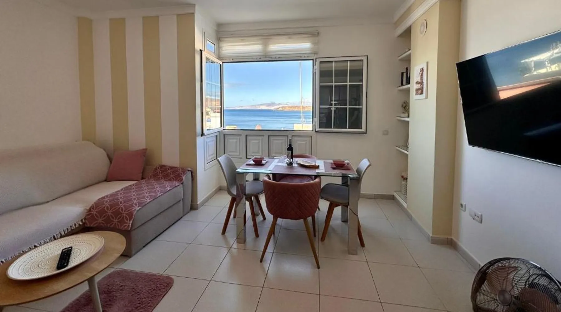 Beachfront Location: Casa Alejandro II in Tarajalejo offers direct beachfront access and stunning sea views. Guests can relax on the sandy shores just a few steps away. Modern Amenities: The apartment features free WiFi, a fully equipped kitchenette, washing machine, and a comfortable living room with a sofa. Additional amenities include a dining area, TV, and tiled floors. Convenient Facilities: Guests benefit from free off-site parking, a elevator, and a hairdresser/beautician. The property also provides a dining table, wine or champagne, chocolates or cookies, and a refrigerator. Nearby Attractions: Tarajalejo Beach is 31 mi from Fuerteventura Airport. Other points of interest include Jandia Golf (21 mi), Fuerteventura Golf Club (27 mi), and Eco Museo de Alcogida (29 mi). Cycling enthusiasts can explore the surrounding area. This apartment consists of 1 living room, 2 separate bedrooms and 1 bathroom with a shower and a hairdryer. Meals can be prepared in the well-fitted kitchen, which is equipped with a stovetop, a refrigerator, kitchenware and an oven. This apartment features a washing machine, flat-screen TV with satellite channels, sea views, as well as wine/champagne for guests. The unit offers 3 beds.