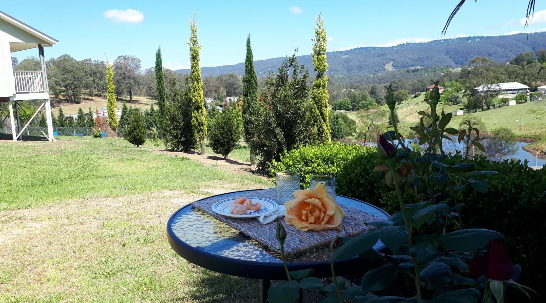 Self contained house with verandahs back and front in garden. Close to shops and a short drive fruit picking from Feb. Cottage has QBed and QSofa mountain views. You could lay a picnic rug out on the grass, watch the stars, hear the birds. NB: If 2 beds is required for 2, you need to request 3 persons. We have a 2 bedroom Cottage with 2 beds in second room. 3 Cottages sleeps 14. To discuss internet.