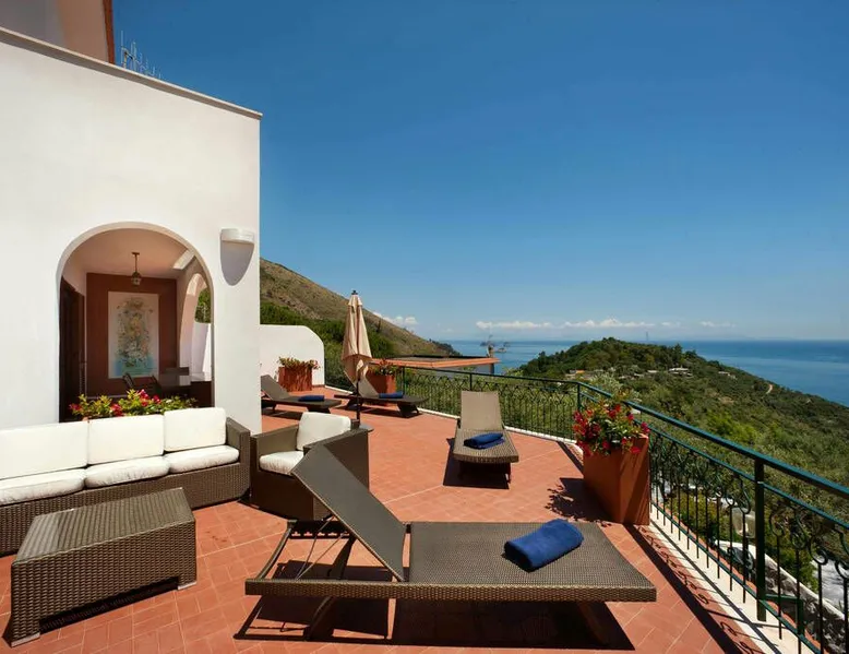 Luxury villa with sea view, recently renovated and surrounded by a Mediterranean garden with olive trees and flowers. Located in Nerano, in a very panoramic area over the bay of Nerano and Li Galli Islands. It has an ample private swimming pool equipped with deck chairs, sunbeds, shower and is surrounded by a Mediterranean garden with olive, green trees and flowers. From here you can admire a stunning sunset drinking a glass of Italian wine. The space Luxury villa with sea view, recently renovated and surrounded by a Mediterranean garden with olive trees and flowers. Located in Nerano, in a very panoramic area over the bay of Nerano and Li Galli Islands. It has an ample private swimming pool equipped with deck chairs, sunbeds, shower and is surrounded by a Mediterranean garden with olive, green trees and flowers. From here you can admire a stunning sunset drinking a glass of Italian wine. Being 1 km from the sea and the rocky beach of Nerano, it is ideal for people who love tranquillity while at the same time being close to the centre of Sorrento and other exclusive resorts such as the Island of Capri, Positano, Amalfi accessible by sea or by car. Sorrento centre, the harbour with fast hydrofoils for excursions and railway station is 16 km away. Parking spaces. Bus stop at 300 metres, shops, bars and the beach of Nerano at 1 km. Guest access From a private road you can park your car and climbing a ramp of stairs there is access to the ample villa recently refurbished, fitted with 4 bedrooms and 4 bathrooms, built on 3 levels with sea view terraces: - ground floor: sea view terrace equipped with table, chairs, sunbeds and sunshade, ample living/dining room with couch, double sofa bed, satellite TV, kitchen area supplied with coooker, oven, large fridge with freezer and water dispenser, microwave, toaster, Espresso coffee-maker. Bathroom with bath and shower cabin, double bedroom direct access to the sea view terrace; - first floor: going out from the ground floor of the villa, you climb a another ramp of stairs and reach the first floor. You'll find another living room with couch, dining area with table and chairs, satellite tv and direct acces to another sea view terrace. Equipped kitchen with cooker, electric stove, oven, dish-washer, large fridge with freezer, microwave, toaster, Espresso coffee-maker. Bathroom with shower, laundry room with washing machine, drier, sink, iron and ironing board, cupboard. From the kitchen you can enter the patio fitted with table, chairs for your meals "al fresco", wood-fired oven for pizzas, barbecue, the private swimming pool with solarium, sunbeds and deck chairs; - second floor: going up a few steps you will find the sleeping area with 1 double bedroom with en-suite bathroom (shower), private sea view terrace; 1 double bedroom with sea view window, 1 bedroom with 1 large single bed where two people can comfortably sleep, bathroom with shower. Safe. Every bedroom has air conditioning and heating, satellite tv and Wi-Fi connection. Each bathroom has hair dryer. Sleeps 8; with sofa bed sleeps 12. Other things to note Services included in the price Electricity, water, gas, washing machine, iron and ironing board, electric ovens, wood-fired oven, barbecue, dishwasher, 2 fridges with freezer, microwave, stereo, satellite TVs, Wi-Fi. Weekly change of bed/bath linen and pool towels, weekly cleaning, final cleaning. Private swimming pool with shower. Parking spaces. Air conditioning and heating. Services not included in the price City tax (Euro 4,00 per person per day). Beach facilities. Boat hire. Baby sitter. Transfer and chauffer service. Extra people in sofa bed. Cot.
