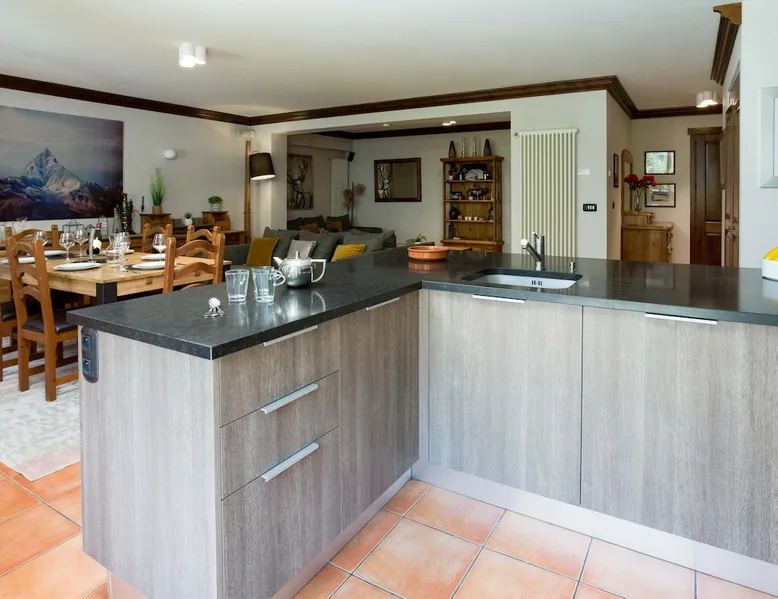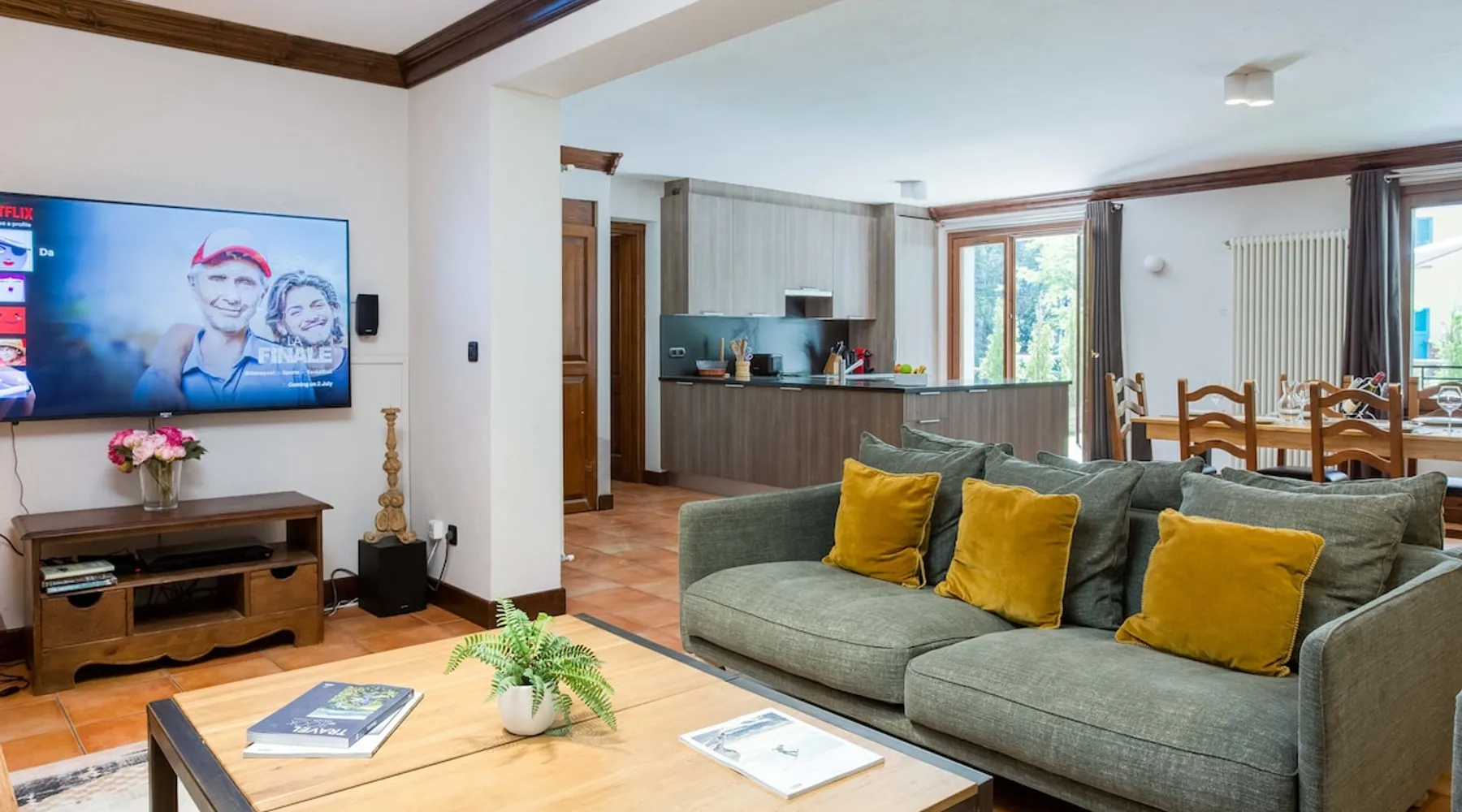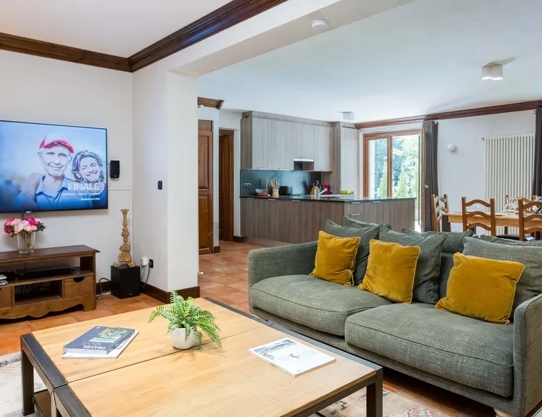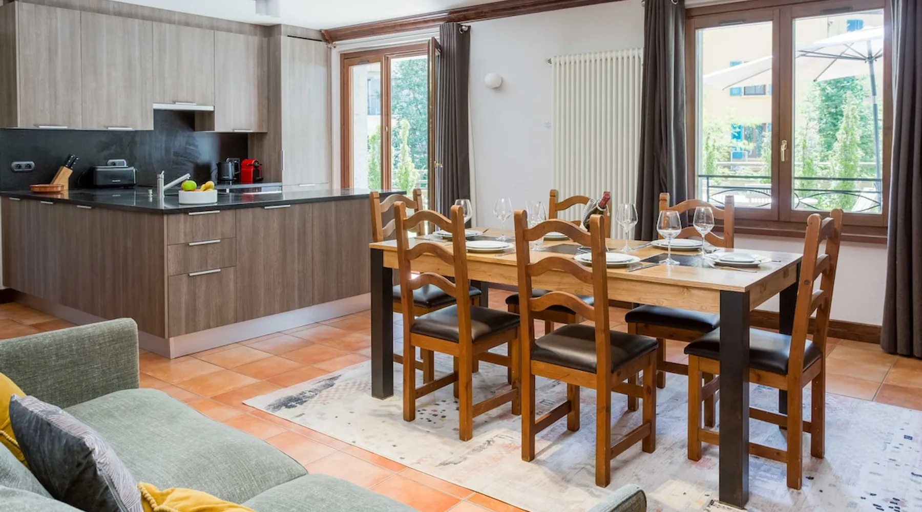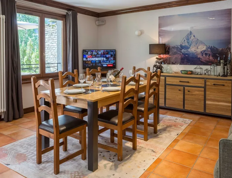Pothecary apartment in Chamonix's town centre has 3 bedrooms / 2 bathroom, sleeps 6-8 & benefits from private garden overlooking the river with Mont Blanc views, parking, Fibre internet, smart TV. The Pothecary apartment in downtown Chamonix has 3 bedrooms, 2 bathrooms for 6 à 8 people, with private gardené, view of Mont Blanc, parking, fiber optic, TV, DVD and chaî English nes. See more info or click 'Book online' for réserver. The space Located in possibly the most enviable location in Chamonix, with garden overlooking the river Arve and facing Mont Blanc, and in the middle of all the shops, restaurants and bars, Pothecary apartment is one of our most popular apartments in Chamonix. It is is extremely spacious at 120 sqm, with a huge living room including 3 full size sofas and two matching armchairs, a newly installed modern kitchen, an entertainment area with 43 inch flatscreen TV (Sky TV, surround sound, DVD player etc) and an ipod dock, Fibre internet access and a second TV and DVD player too. Pothecary apartment has 3 good sized bedrooms (one double, one twin / king bedroom and a 3rd twin bedroom ) as well as one of the sofas in the living room which converts into a sofabed in the living room, therefore sleeping 8 people very comfortably. The sunny, private garden of this apartment in Chamonix backs onto the river and has table and chairs and splendid views of Mont Blanc. If you want to be slap bang in the middle of town but have your own private terrace, and secure parking, plus stay in a truly spacious accommodation, then Pothecary apartment is the perfect retreat for you. Key Features 120 sqm Sleeps 6-8 1 double bedroom with double bed and wardrobes, and patio doors leading out to the garden & views of river 2nd bedroom with zip & link beds (can be twin or king bed) 3rd twin bedroom Family bathroom comprising bath with shower & WC 2nd bathroom with shower Separate WC Open plan living room with 3 sofas & 2 large armchairs Double sofa bed 2 TV's (Sky and IPTV with multiple language channels) Fibre internet Kitchen with oven, microwave, dishwasher & Nespresso coffee machine Dining table and 6 chairs Patio doors from living room leading out to the garden / terrace Washing machine Ski locker Underground parking available Other things to note Check-in times Normal check-in time is from 5pm, if you are arriving after 10pm please let us know in advance. Check-out times Normal check-out time is by 10am. Flexible check-in / check-out times If these times don’t suit your holiday arrangements, you can book our flexible early check-in / late check-out service (subject to availability). This must be booked with us in advance, and may be subject to a fee of 40€ for apartments and 80€ for chalets so that we can prepare the property in time. Late check-in after hours Check-in is possible until midnight, but please try to arrive before 9pm. For those arriving after 9pm there is a 40€ late check-in fee, which must be paid on arrival at your Chamonix Accommodation. Children Travel cots & high chairs / booster seats can be hired through us for 35€ to include cot mattress, bed linen and a towel. You can add this to your booking at the time of booking. What's included One set of bed linen and towels is provided at your accommodation for your stay. If you are staying for 2 weeks or more you will have a mid-stay linen change. Tourist guest cards will be left in the property for you on arrival to give you free travel on the local train and buses and more. End of stay cleaning is included at your accommodation, but we do expect you to follow our check out instructions on departure. If you prefer you can book an additional cleaning service. Cards accepted Chamonix All Year Resort Shop Order everything you need for your Chamonix holiday now via our Chamonix Resort Shop: Geneva Airport transfers Chamonix lift passes Discounted ski hire Additional Accommodation Details Pets Pets are welcome at this property but permission must be obtained in advance and a charge will be applied at time of booking. The additional fee is 40€. Bike storage Bikes can be stored in the underground parking area on the private parking space allocated to the apartment. Registration Details 74056002144ZA