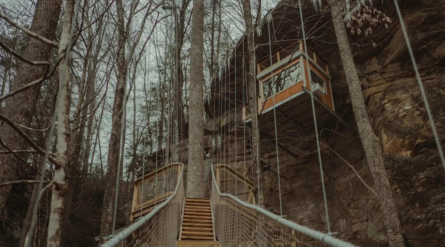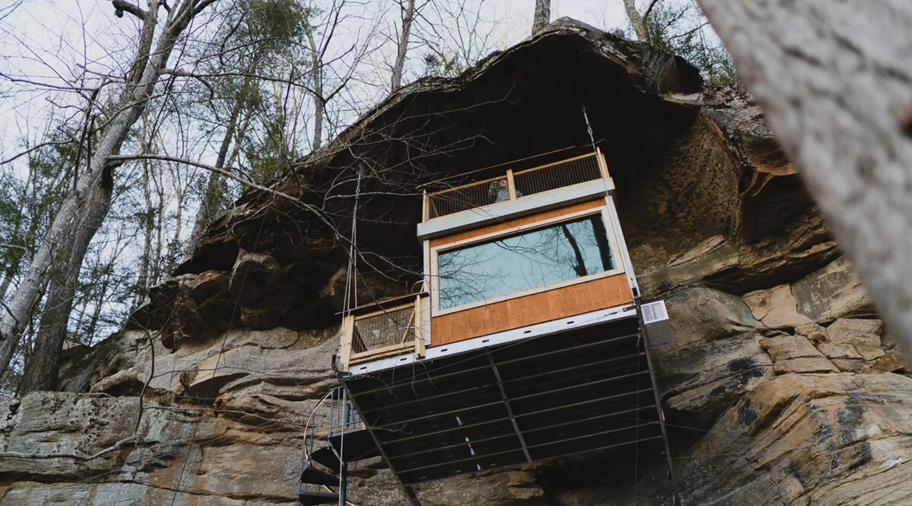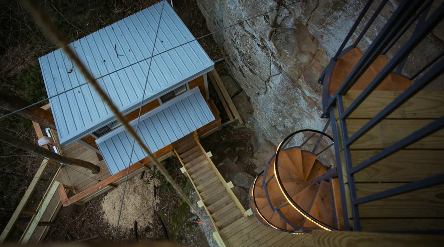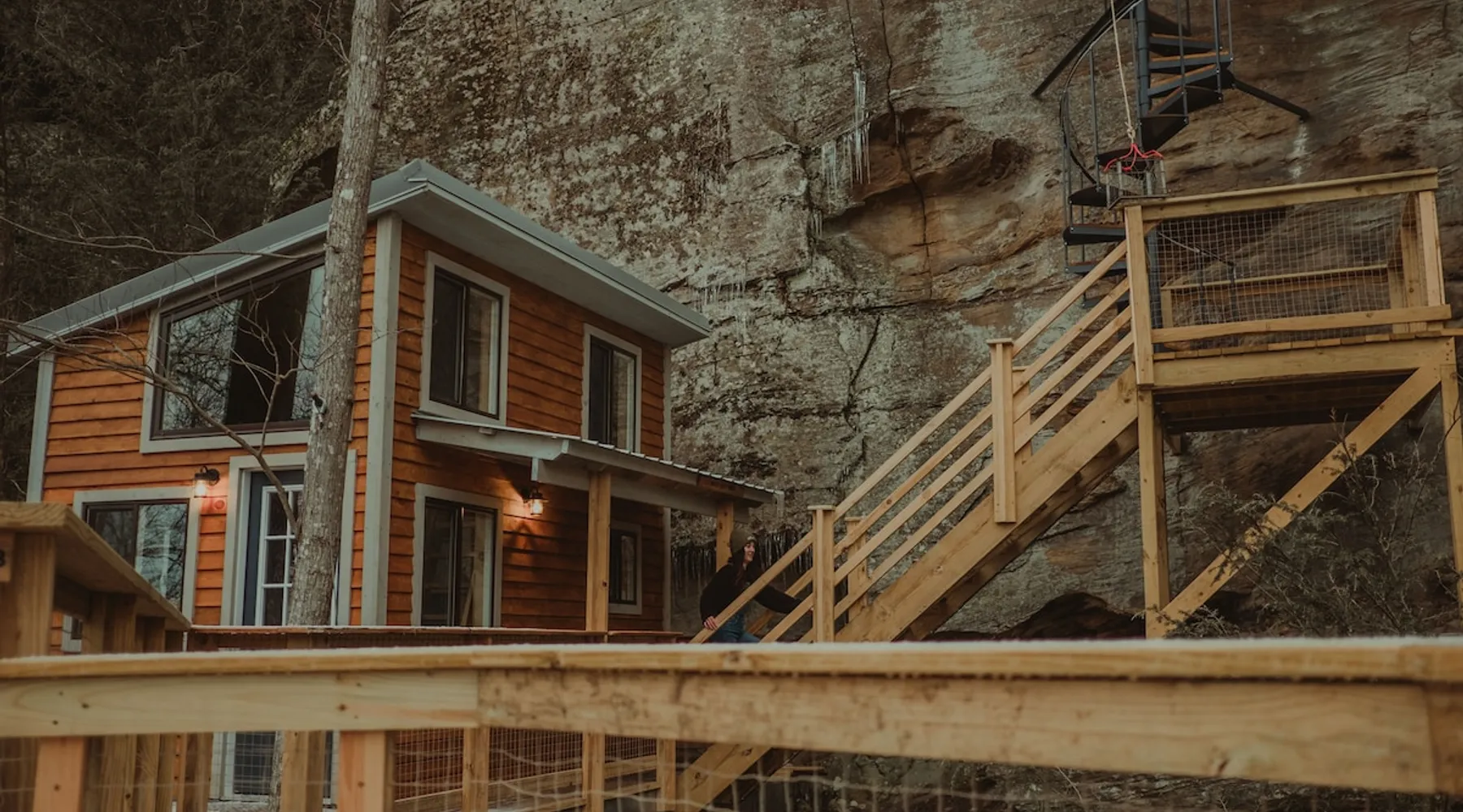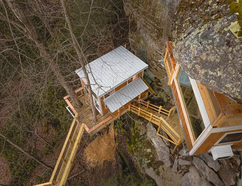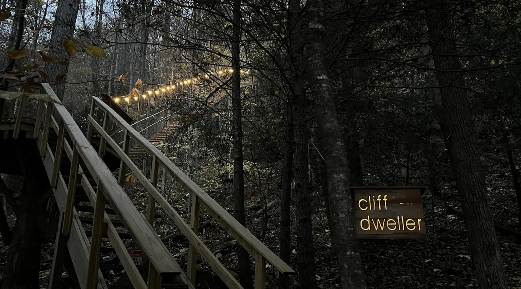 Cliff Dweller: Suspended from the Ridgeline The space Cliff Dweller is the first cliff mounted rental in the Red River Gorge! With the goal of creating a more intimate experience with the beautiful sandstone the Gorge is known for, The Canopy Crew set out to build what is now one of the most unique and adventurous dwellings you can dream of. This innovative design blends tree and stone, architecture and engineering, and comfort with exposure. When you arrive at the parking area, your jaw will slowly unhinge as you stare up at the massive floating staircase that takes you to the top of the mountain. This will likely be the largest floating staircase you will ever witness. For your future bragging rights, here is the official step count: 177 steps to get to the kitchen, 45 steps to get to the bedroom, and 11 steps to get to the roof deck! Please note, we strongly recommend packing in back packs vs suitcases, and bags instead of a cooler (there is a fridge inside). Simply put, the view from your bed will not be forgotten. You may choose to stay on the cliff your entire trip. At the top of the floating staircase you will find the first structure of the Cliff Dweller located at the base of the cliff. This quaint abode holds the kitchen, bathroom, and lofted queen bed. Note the live edge woodwork that was entirely salvaged and milled in house. From the porch head up the spiral staircase to reach the master bedroom. From here, kick your shoes off, take a seat on the bed, and contemplate how we got that giant triple pane window up there! Soak in the view; this is probably the most romantic bedroom in the gorge. Don’t forget to head to the rooftop deck where you can reach up and touch the massive stone shelf that the bedroom is hanging from! Cliff Dweller shares the suspended staircase with the neighboring treehouse, Sandstone Drifter. -- Amenities -- The Cliff Dweller has two queen beds, is heated and cooled, has an electric range and mini fridge and is designed for four guests. The outdoor lighting will be on until midnight and then we switch it off to allow the dark night forest sky to be just that--dark! We recommend packing a flashlight or headlamp to aid in moving around after the lights are off.