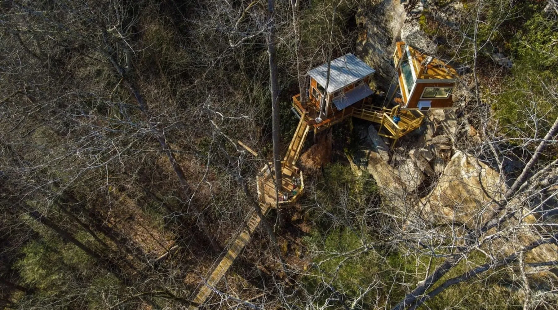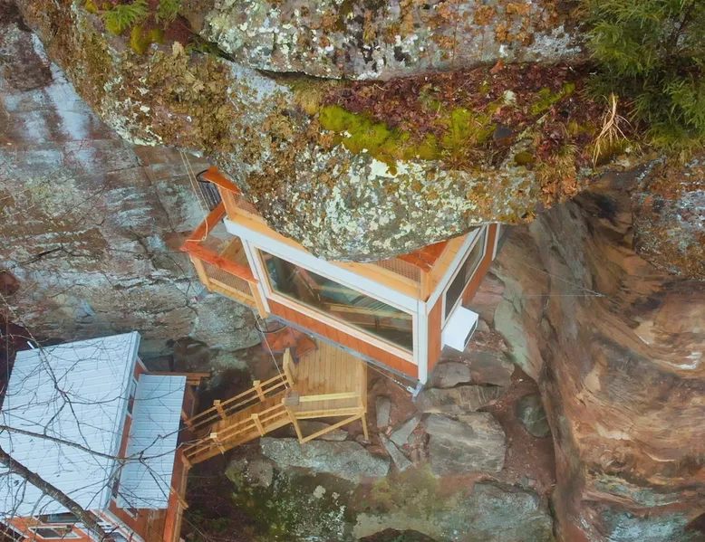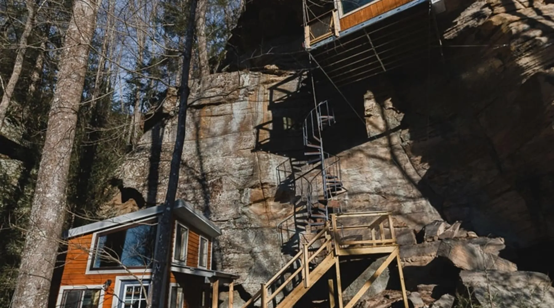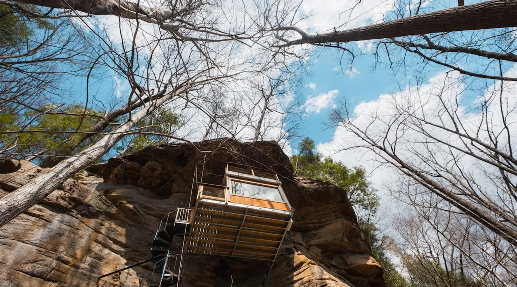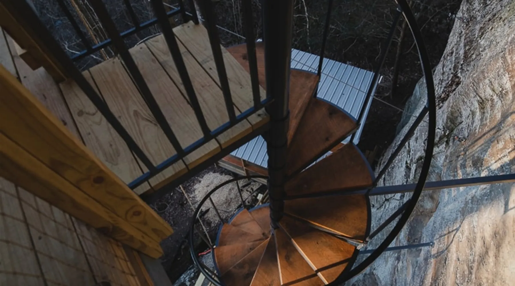Cliff Dweller: Suspended from the Ridgeline The space Cliff Dweller is the first cliff mounted rental in the Red River Gorge! With the goal of creating a more intimate experience with the beautiful sandstone the Gorge is known for, The Canopy Crew set out to build what is now one of the most unique and adventurous dwellings you can dream of. This innovative design blends tree and stone, architecture and engineering, and comfort with exposure. When you arrive at the parking area, your jaw will slowly unhinge as you stare up at the massive floating staircase that takes you to the top of the mountain. This will likely be the largest floating staircase you will ever witness. For your future bragging rights, here is the official step count: 177 steps to get to the kitchen, 45 steps to get to the bedroom, and 11 steps to get to the roof deck! Please note, we strongly recommend packing in back packs vs suitcases, and bags instead of a cooler (there is a fridge inside). Simply put, the view from your bed will not be forgotten. You may choose to stay on the cliff your entire trip. At the top of the floating staircase you will find the first structure of the Cliff Dweller located at the base of the cliff. This quaint abode holds the kitchen, bathroom, and lofted queen bed. Note the live edge woodwork that was entirely salvaged and milled in house. From the porch head up the spiral staircase to reach the master bedroom. From here, kick your shoes off, take a seat on the bed, and contemplate how we got that giant triple pane window up there! Soak in the view; this is probably the most romantic bedroom in the gorge. Don’t forget to head to the rooftop deck where you can reach up and touch the massive stone shelf that the bedroom is hanging from! Cliff Dweller shares the suspended staircase with the neighboring treehouse, Sandstone Drifter. -- Amenities -- The Cliff Dweller has two queen beds, is heated and cooled, has an electric range and mini fridge and is designed for four guests. The outdoor lighting will be on until midnight and then we switch it off to allow the dark night forest sky to be just that--dark! We recommend packing a flashlight or headlamp to aid in moving around after the lights are off.