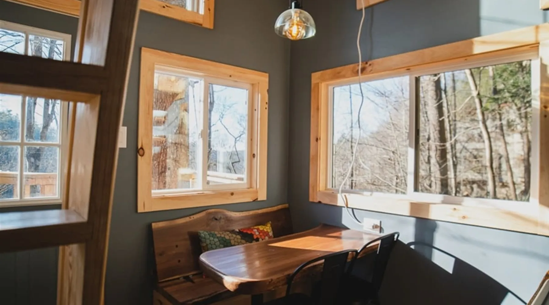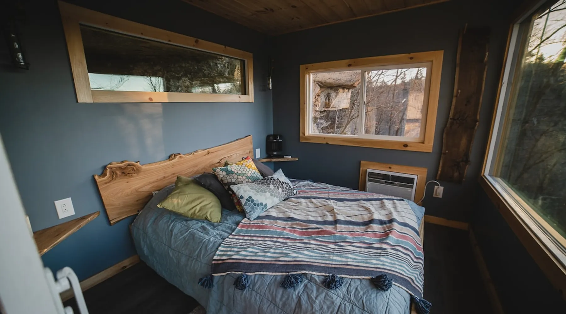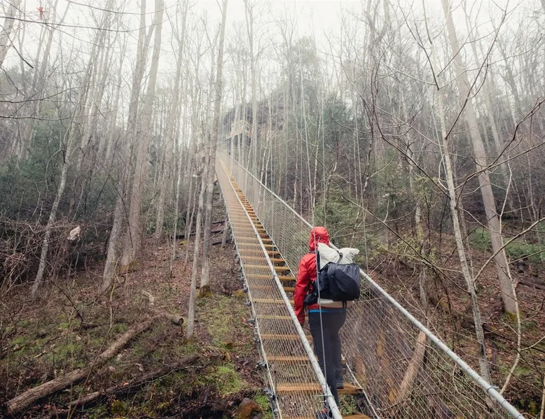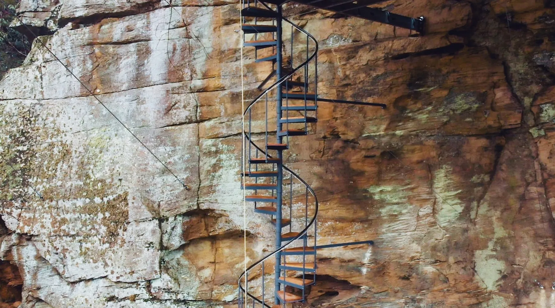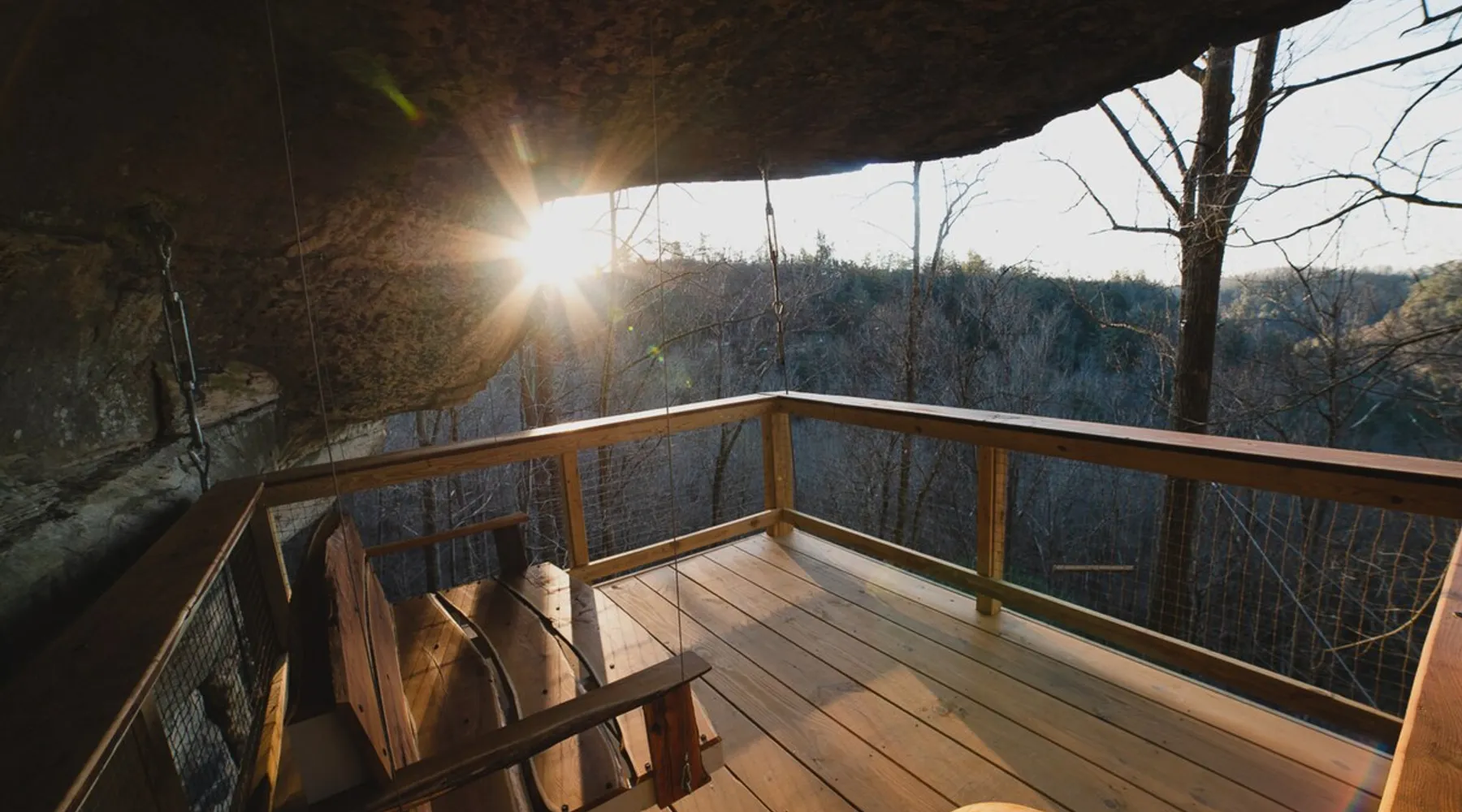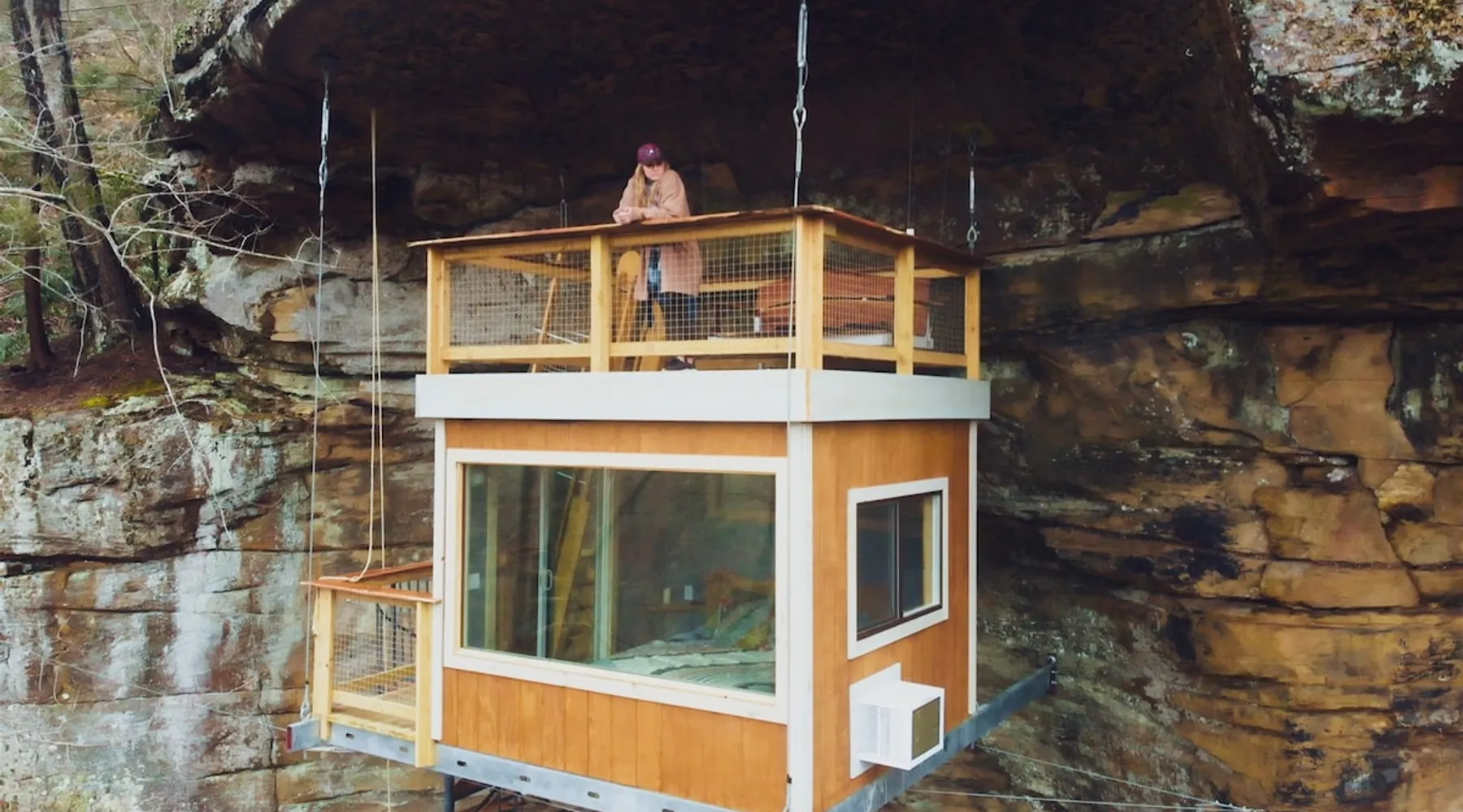 Cliff Dweller: Suspended from the Ridgeline The space Cliff Dweller is the first cliff mounted rental in the Red River Gorge! With the goal of creating a more intimate experience with the beautiful sandstone the Gorge is known for, The Canopy Crew set out to build what is now one of the most unique and adventurous dwellings you can dream of. This innovative design blends tree and stone, architecture and engineering, and comfort with exposure. When you arrive at the parking area, your jaw will slowly unhinge as you stare up at the massive floating staircase that takes you to the top of the mountain. This will likely be the largest floating staircase you will ever witness. For your future bragging rights, here is the official step count: 177 steps to get to the kitchen, 45 steps to get to the bedroom, and 11 steps to get to the roof deck! Please note, we strongly recommend packing in back packs vs suitcases, and bags instead of a cooler (there is a fridge inside). Simply put, the view from your bed will not be forgotten. You may choose to stay on the cliff your entire trip. At the top of the floating staircase you will find the first structure of the Cliff Dweller located at the base of the cliff. This quaint abode holds the kitchen, bathroom, and lofted queen bed. Note the live edge woodwork that was entirely salvaged and milled in house. From the porch head up the spiral staircase to reach the master bedroom. From here, kick your shoes off, take a seat on the bed, and contemplate how we got that giant triple pane window up there! Soak in the view; this is probably the most romantic bedroom in the gorge. Don’t forget to head to the rooftop deck where you can reach up and touch the massive stone shelf that the bedroom is hanging from! Cliff Dweller shares the suspended staircase with the neighboring treehouse, Sandstone Drifter. -- Amenities -- The Cliff Dweller has two queen beds, is heated and cooled, has an electric range and mini fridge and is designed for four guests. The outdoor lighting will be on until midnight and then we switch it off to allow the dark night forest sky to be just that--dark! We recommend packing a flashlight or headlamp to aid in moving around after the lights are off.