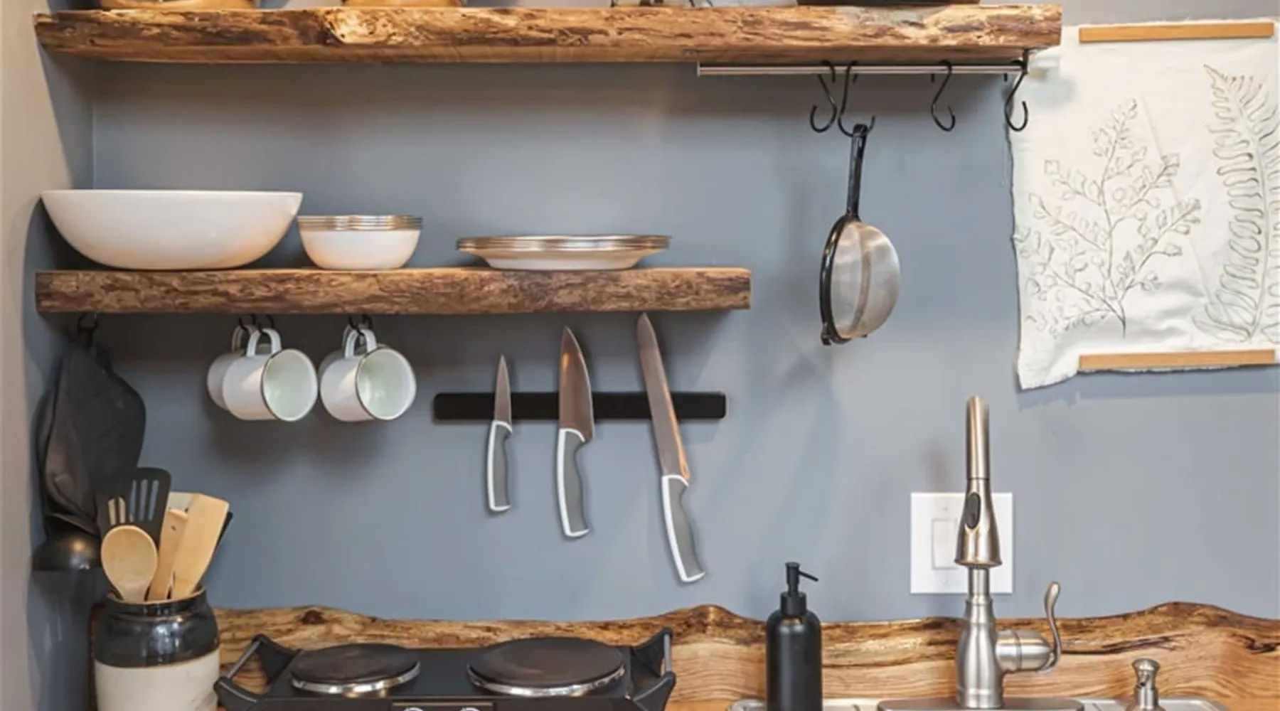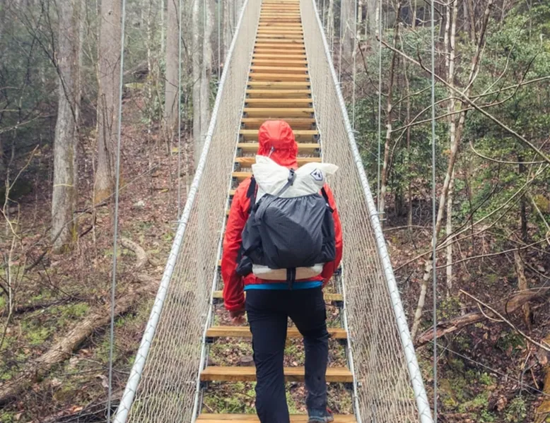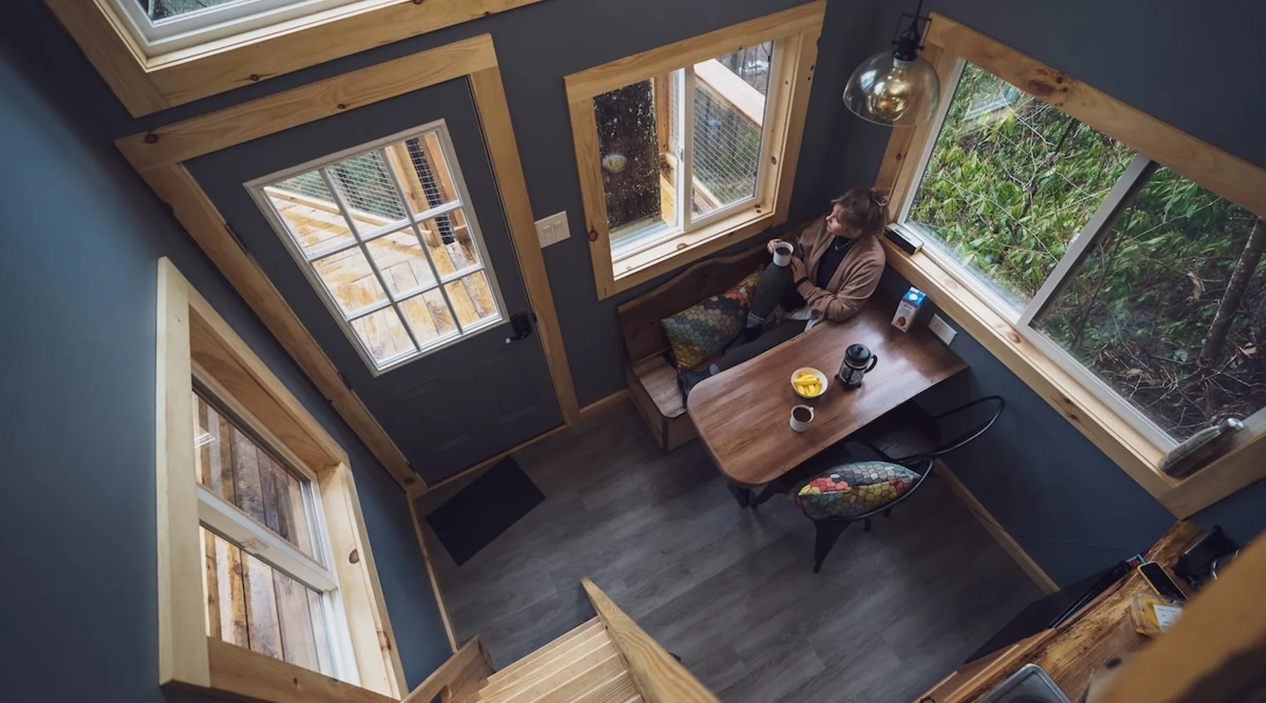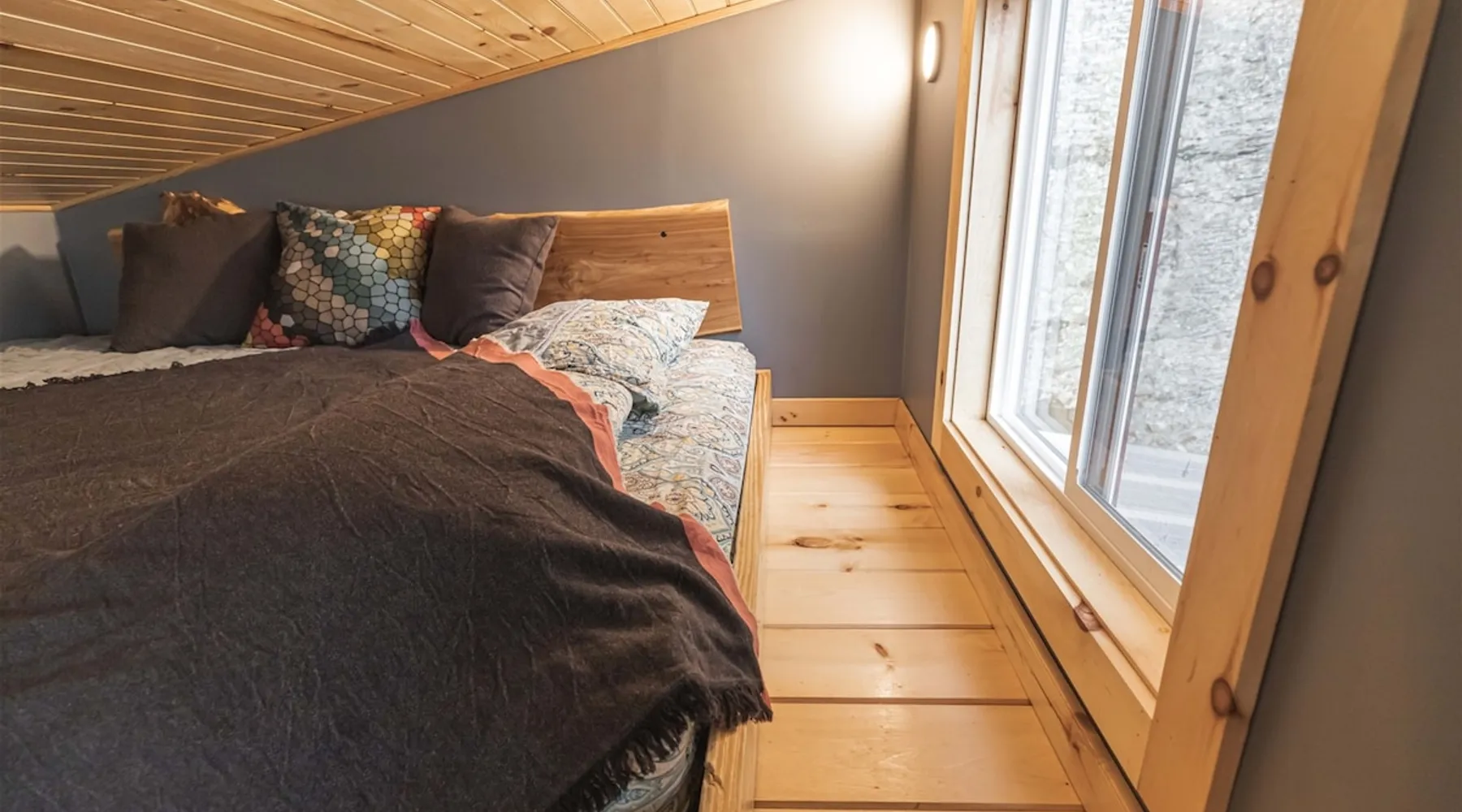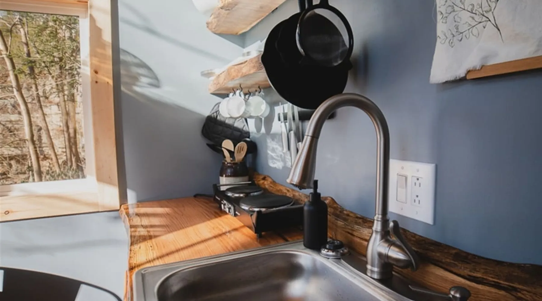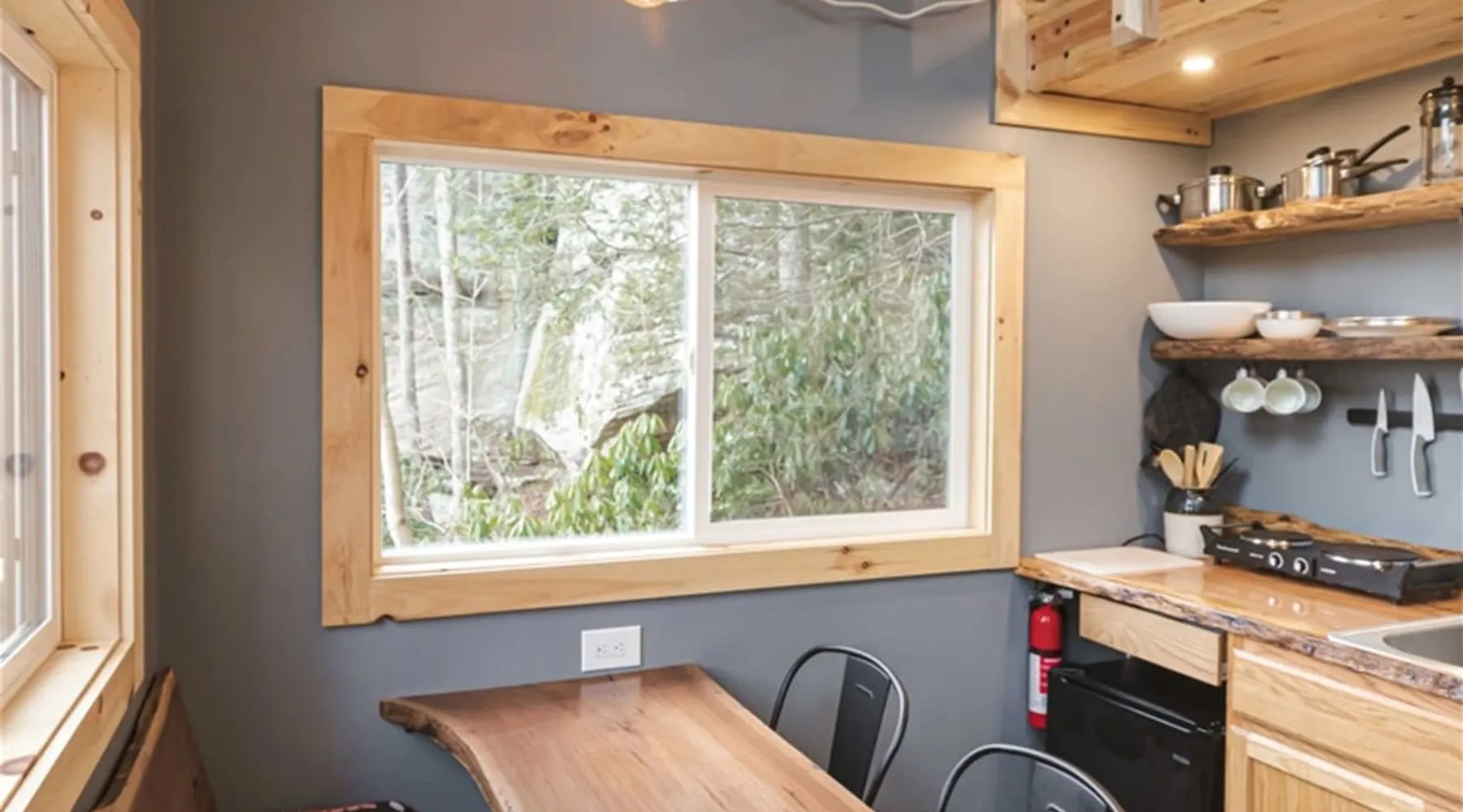 Cliff Dweller: Suspended from the Ridgeline The space Cliff Dweller is the first cliff mounted rental in the Red River Gorge! With the goal of creating a more intimate experience with the beautiful sandstone the Gorge is known for, The Canopy Crew set out to build what is now one of the most unique and adventurous dwellings you can dream of. This innovative design blends tree and stone, architecture and engineering, and comfort with exposure. When you arrive at the parking area, your jaw will slowly unhinge as you stare up at the massive floating staircase that takes you to the top of the mountain. This will likely be the largest floating staircase you will ever witness. For your future bragging rights, here is the official step count: 177 steps to get to the kitchen, 45 steps to get to the bedroom, and 11 steps to get to the roof deck! Please note, we strongly recommend packing in back packs vs suitcases, and bags instead of a cooler (there is a fridge inside). Simply put, the view from your bed will not be forgotten. You may choose to stay on the cliff your entire trip. At the top of the floating staircase you will find the first structure of the Cliff Dweller located at the base of the cliff. This quaint abode holds the kitchen, bathroom, and lofted queen bed. Note the live edge woodwork that was entirely salvaged and milled in house. From the porch head up the spiral staircase to reach the master bedroom. From here, kick your shoes off, take a seat on the bed, and contemplate how we got that giant triple pane window up there! Soak in the view; this is probably the most romantic bedroom in the gorge. Don’t forget to head to the rooftop deck where you can reach up and touch the massive stone shelf that the bedroom is hanging from! Cliff Dweller shares the suspended staircase with the neighboring treehouse, Sandstone Drifter. -- Amenities -- The Cliff Dweller has two queen beds, is heated and cooled, has an electric range and mini fridge and is designed for four guests. The outdoor lighting will be on until midnight and then we switch it off to allow the dark night forest sky to be just that--dark! We recommend packing a flashlight or headlamp to aid in moving around after the lights are off.