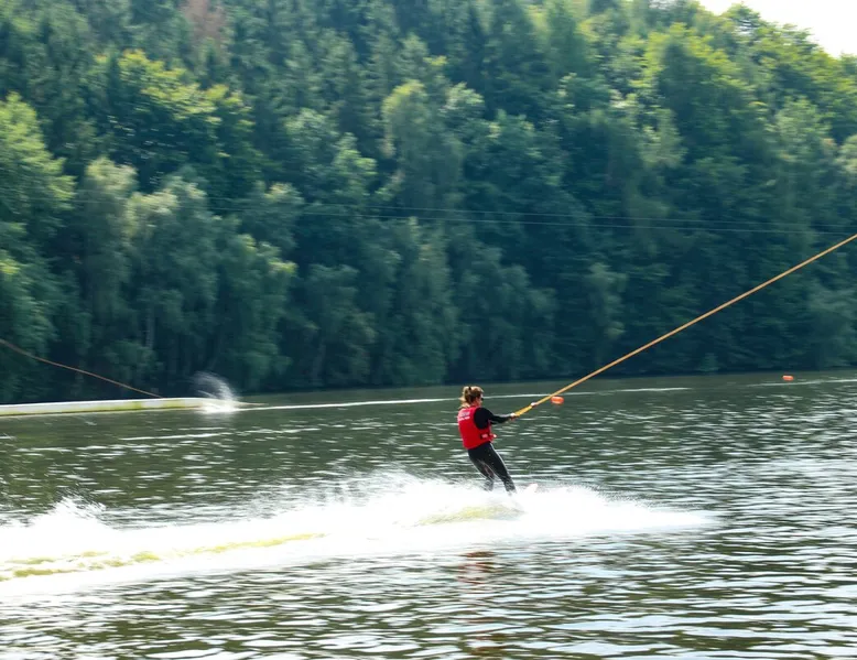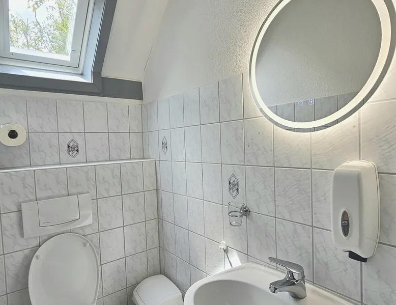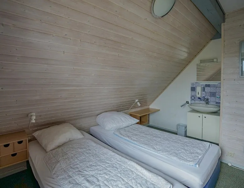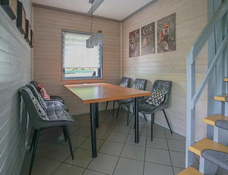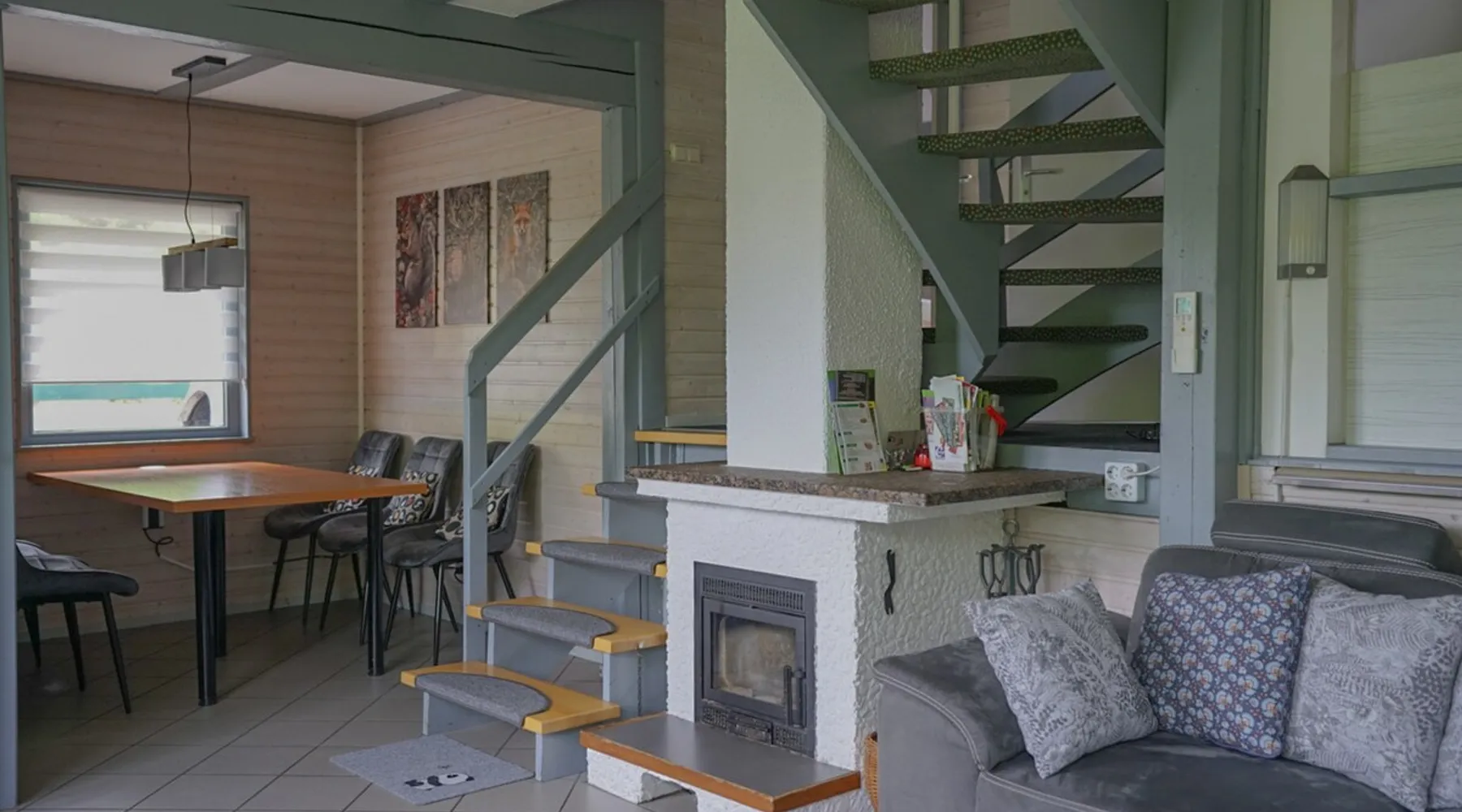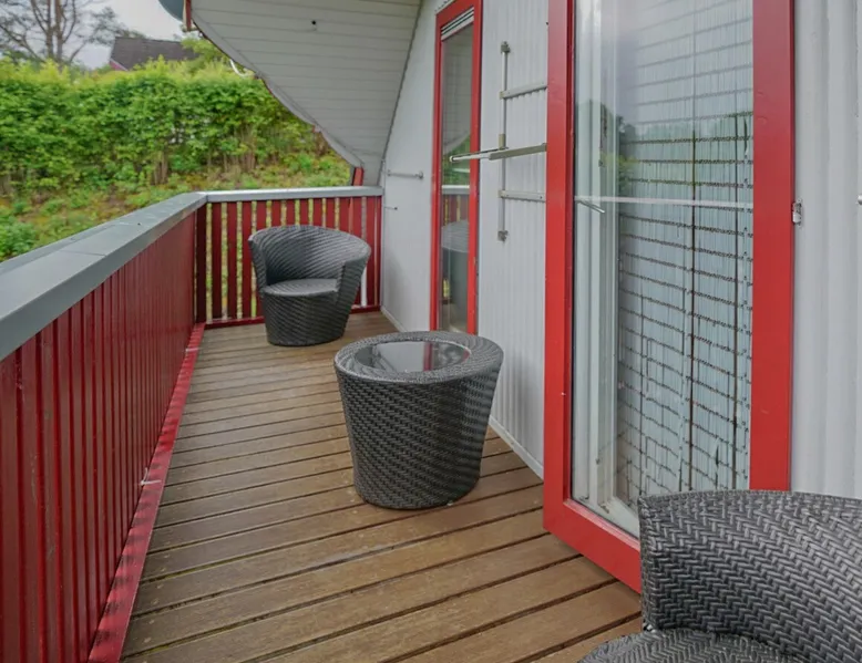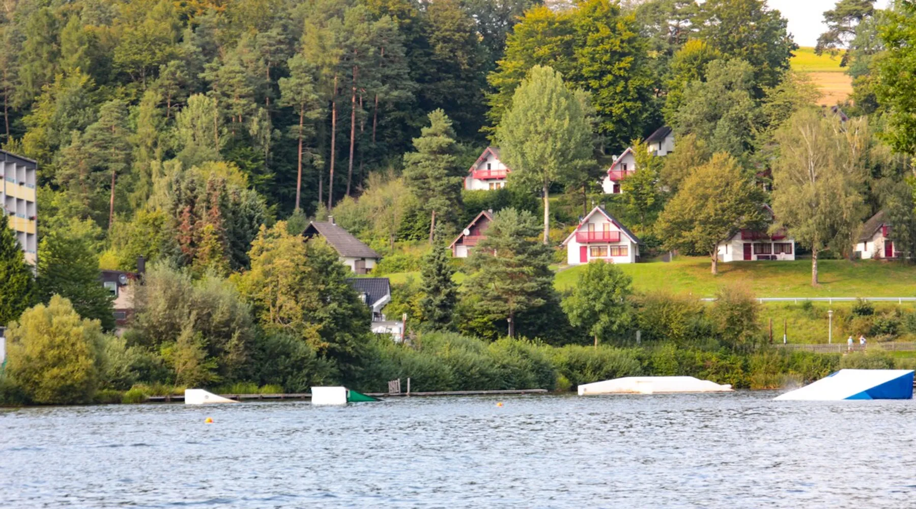 The cottage is located in a well-kept holiday home park in the North Hessian mountains. With its almost opaque property, the house is on the lake side. From here it is only about 600 m to the beach. Other things to note The very well maintained and very tastefully furnished cottage offers enough sleeping accommodation for families with 3 bedrooms. A climate splitter in winter heats the house and can cool down in summer. Furthermore, the house is stocked with various accessories that convey stylish coziness, so that you feel immediately comfortable when entering the house. The property is planted all around and therefore almost opaque in summer when it's green. On the ground floor is the entrance with wind trap and wardrobe as well as the spacious living room with fireplace. From there you can access a beautiful gallery with kitchen, bathroom as well as a guest toilet and a bedroom with double bed. Upstairs are 2 more bedrooms, one with double bed, the other with 2 separate beds. In addition, a large balcony invites you to relax upstairs and a beautiful terrace underneath on the ground floor. Both bedrooms in the DG each have their own balcony access (south). From here you can let the views wander over the entire holiday park. The shower room is timelessly bright.