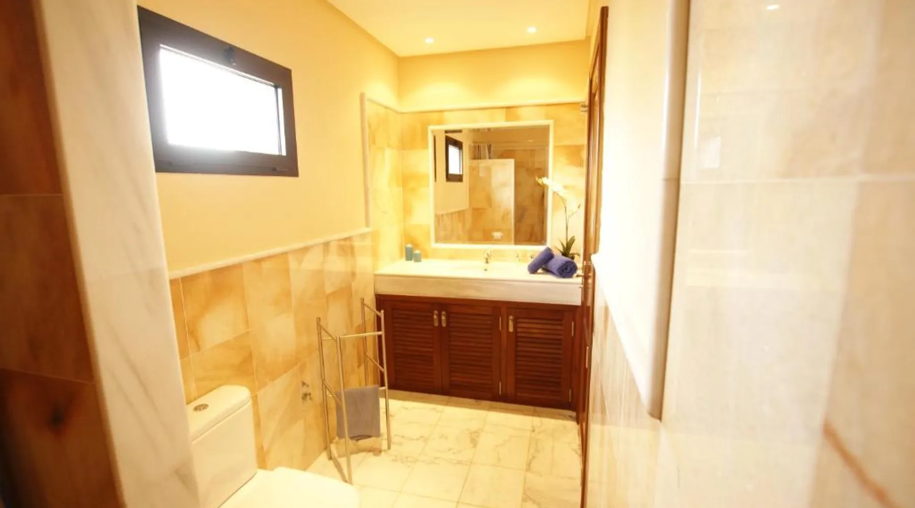 Elegant Holiday Home in Playa Blanca: Villa Alejandro offers a comfortable holiday home experience in Playa Blanca, Spain. Guests enjoy a sun terrace, lush garden, and a year-round outdoor swimming pool. Free WiFi is available throughout the property. Modern Amenities and Facilities: The property features a waterpark, outdoor seating area, and family rooms. Free on-site private parking ensures convenience for all visitors. Additional amenities include a washing machine, patio, kitchen, and barbecue. Nearby Attractions and Activities: Montana Roja Beach is a 19-minute walk away. Parque Nacional de Timanfaya lies 14 mi from the property. Guests can engage in hiking, scuba diving, and other activities in the surrounding area. Lanzarote Airport is 21 mi distant. The private pool is the special feature of this holiday home. Featuring a private entrance, this holiday home consists of 1 living room, 2 separate bedrooms and 2 bathrooms with a bath and a hairdryer. Guests will find a stovetop, a refrigerator, a dishwasher and kitchenware in the well-equipped kitchen. The holiday home also provides guests with a barbecue. Boasting a terrace with garden views, this holiday home also provides a washing machine and a flat-screen TV with cable channels. The unit offers 3 beds.