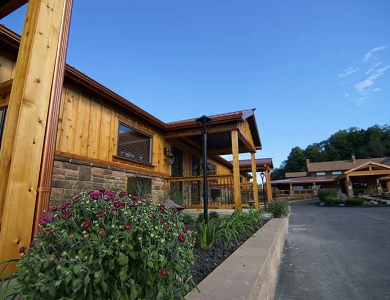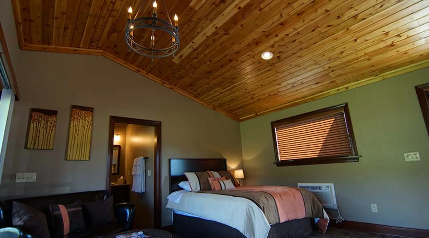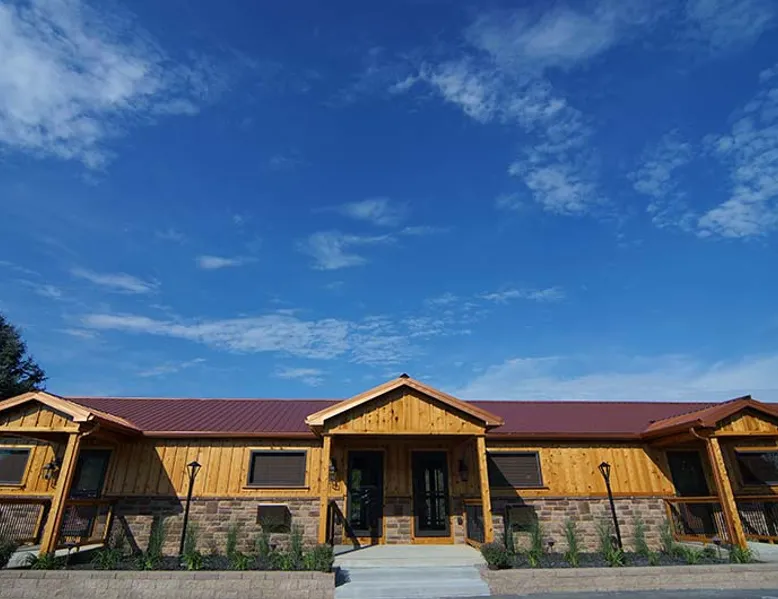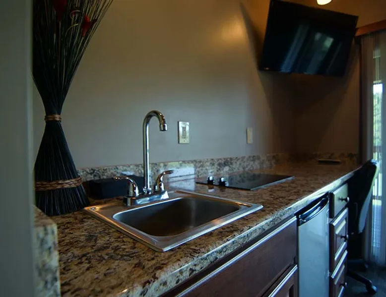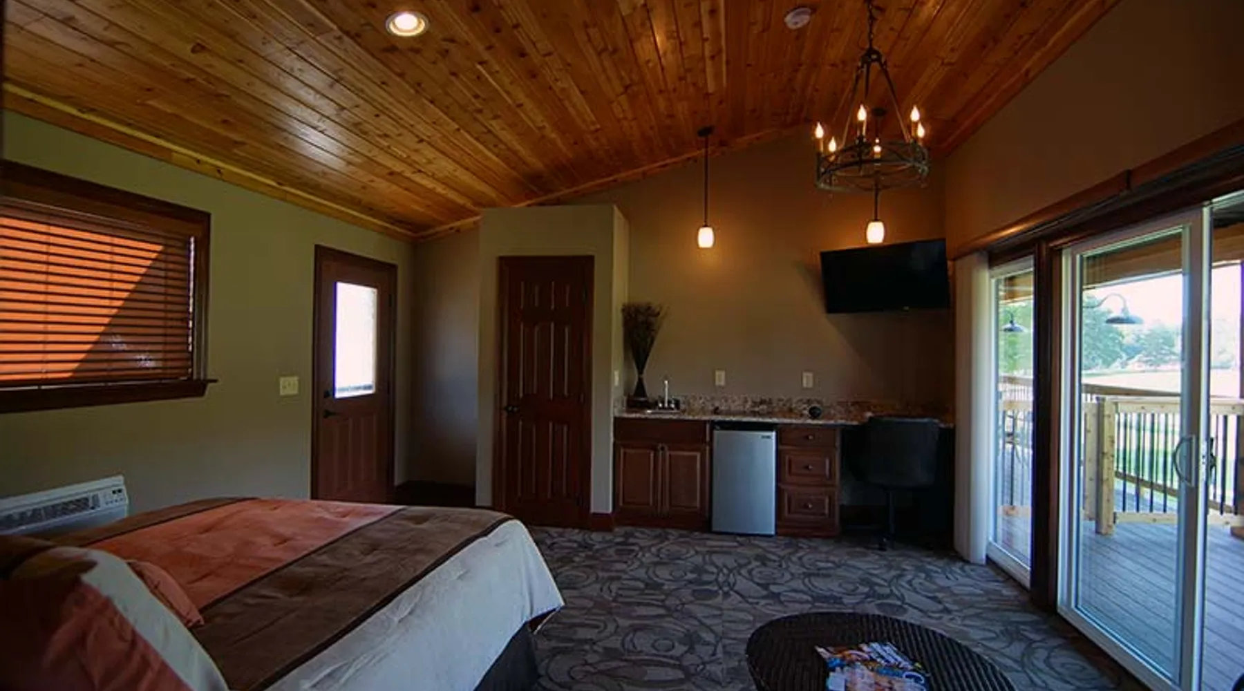 The rustic Licking Springs Villas are quaint hotel rooms in Newark, Ohio with wonderful views overlooking the 18th hole of our golf course. This room includes two queen size beds, a sizable kitchenette which includes a small fridge and a stove top(pans not included), modern bathrooms, and a spacious porch. Reservations are required to dine at our private restaurant. Call after booking to make a reservation. No pets, please.