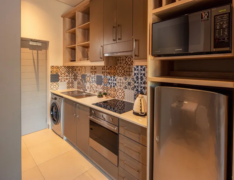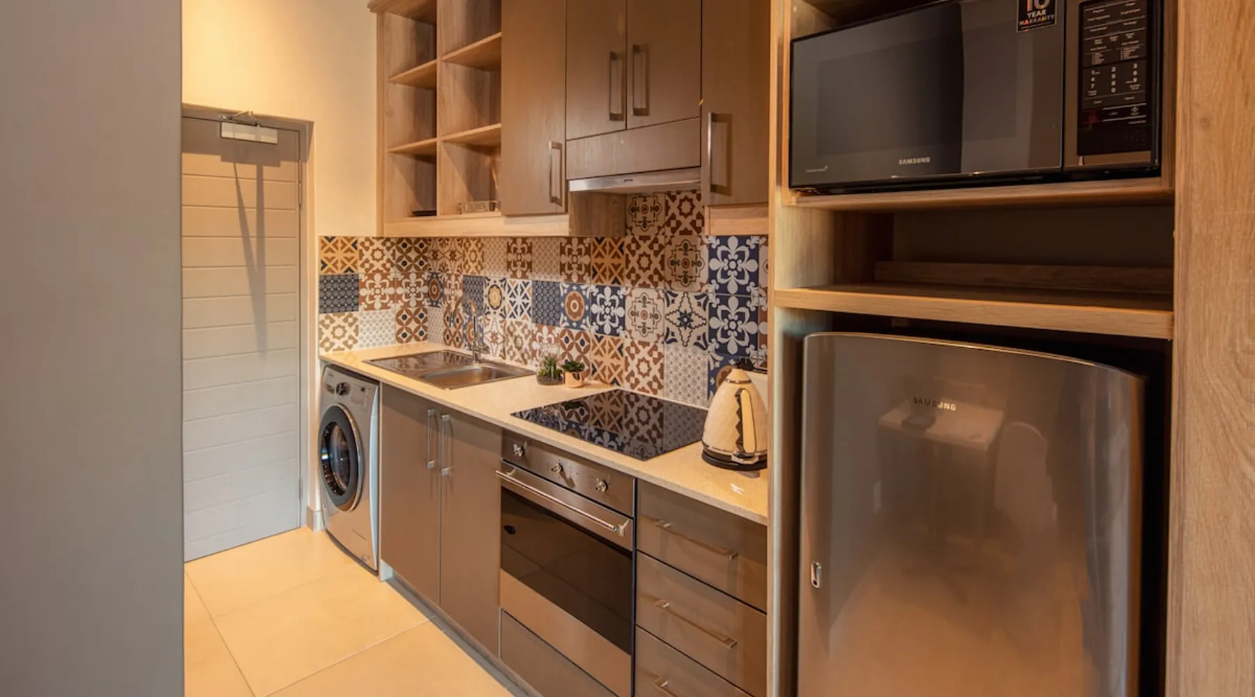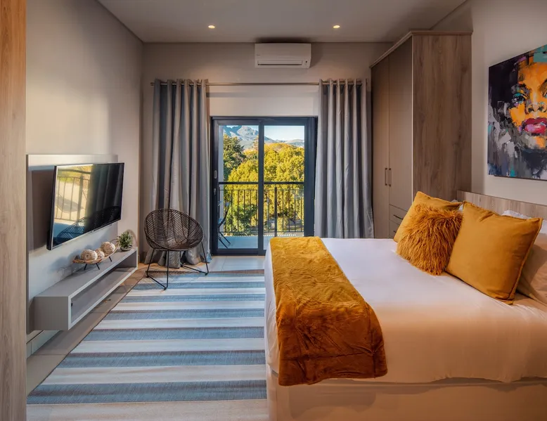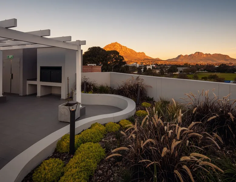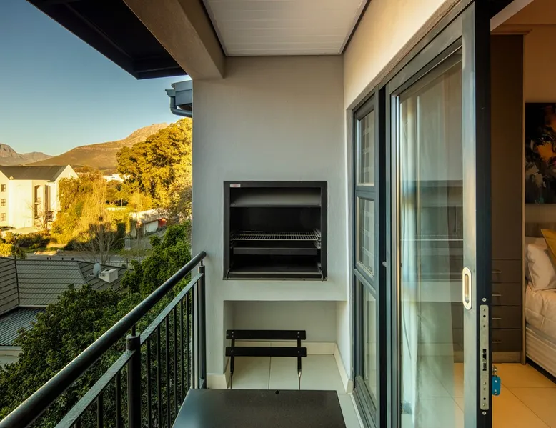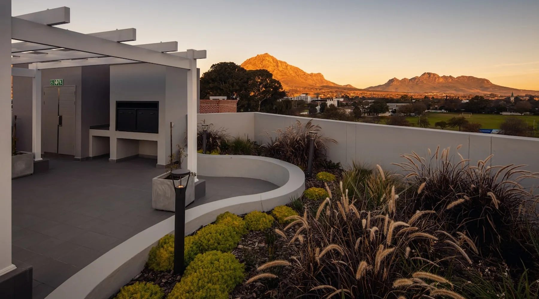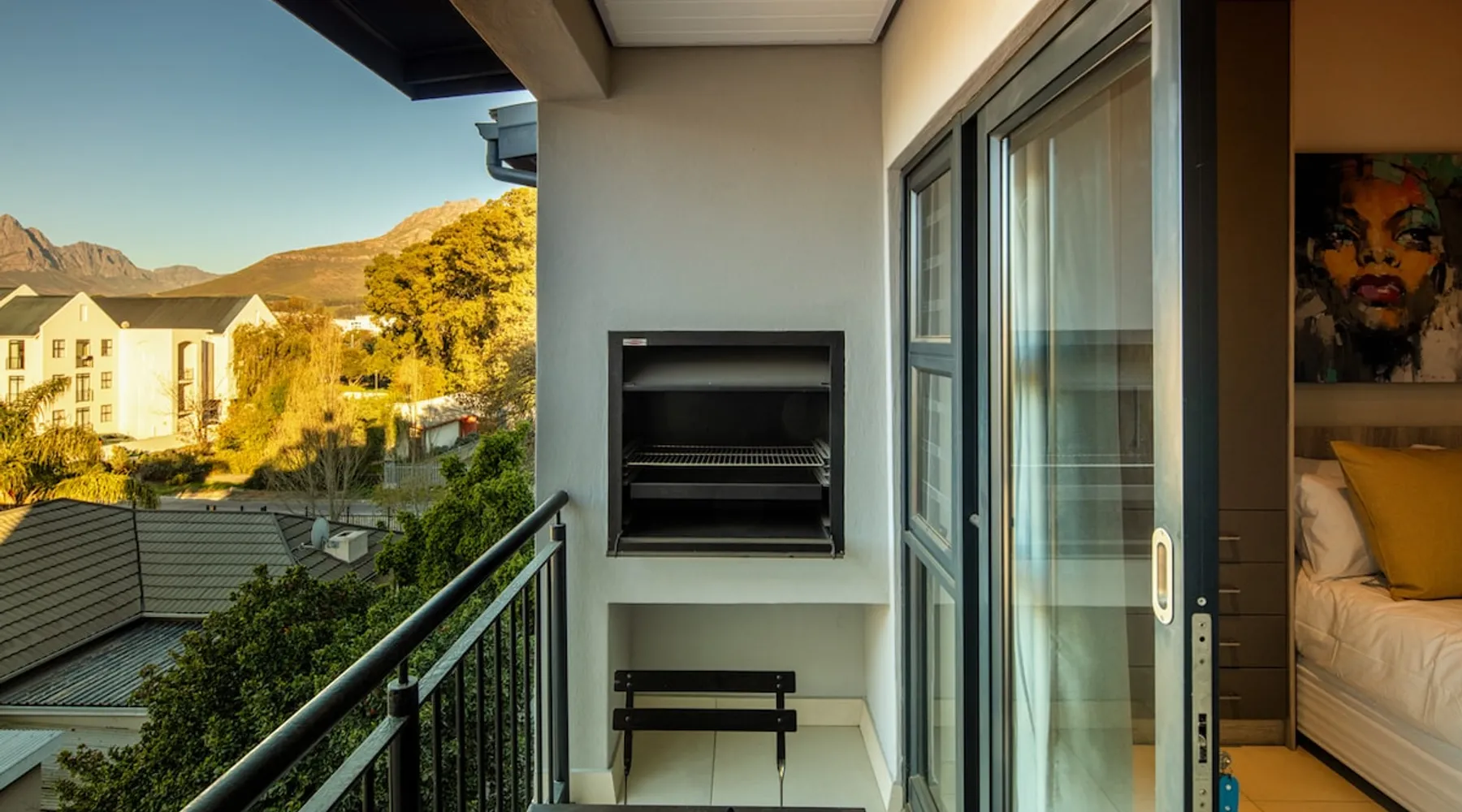 The Den Apartments by Cape Summer Villas, located only a 5 minute walk from the Stellenbosch University Campus. These open plan units have been meticulously designed to create a harmonious work-play environment, complete with high-quality finishes, making The Den the perfect space to unwind. The Den Apartments offer high-speed fiber internet and a serviced lift while the building ensures a safe environment with private parking, closed circuit cameras, bio-metrics and 24-hour security. The space Air Conditioning & Heating, Build in braai on private balcony, Complimentary Amenities, Washing machine, DSTV/Netflix, Samsung Smart HD TV, Fridge & Freezer, Hair Dryer, Nespresso Coffee Machine, Pure Cotton Percale Linen, Safe, 24h Security, Self Catering, Smeg Appliances, Stove Top & Oven.