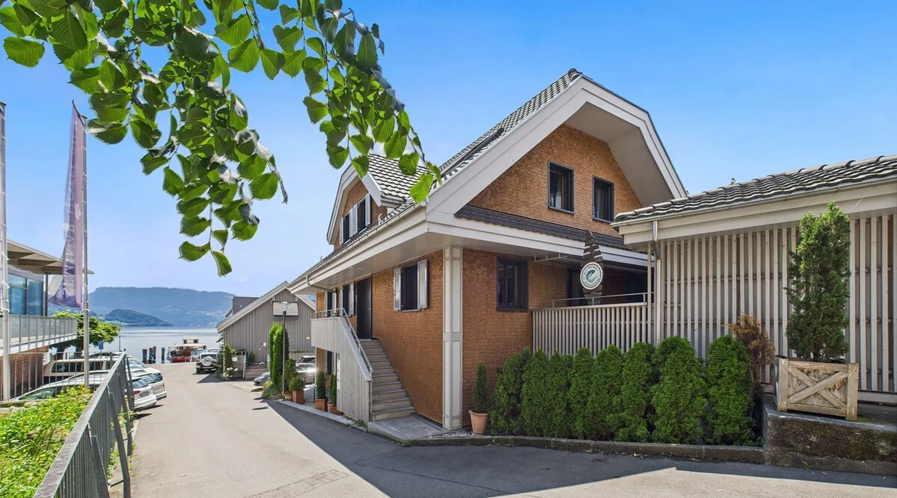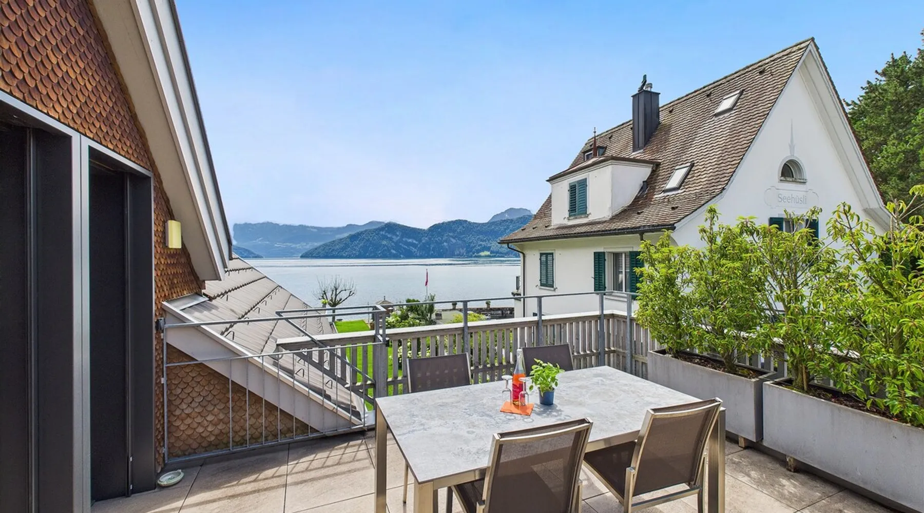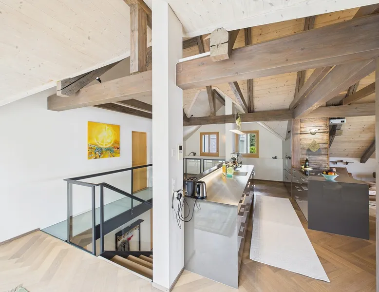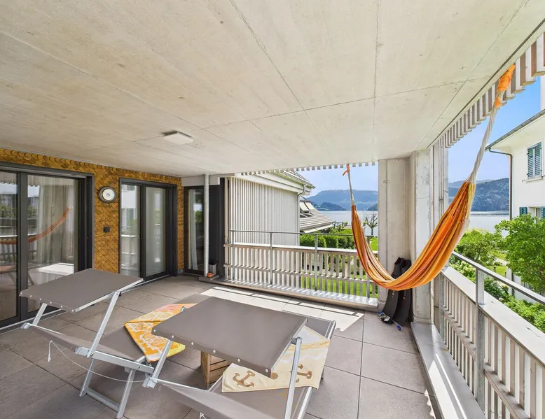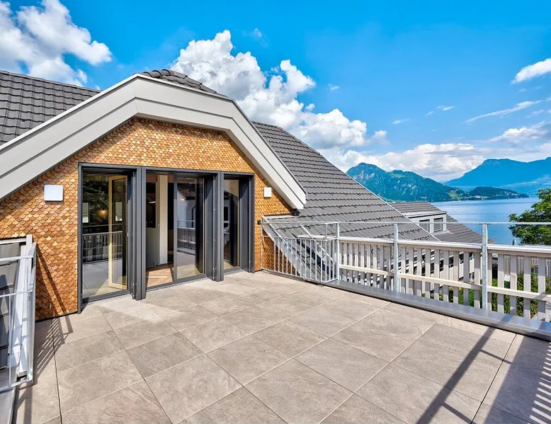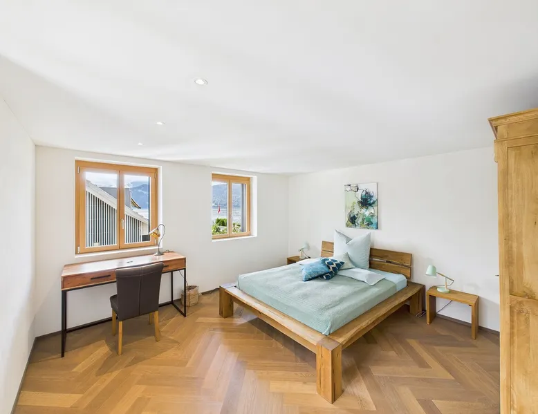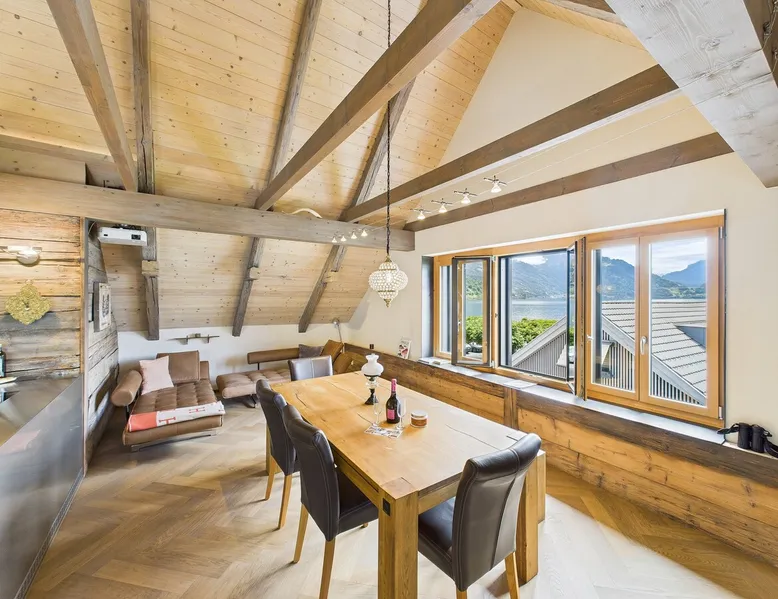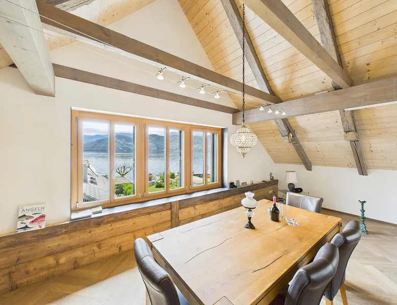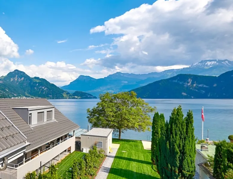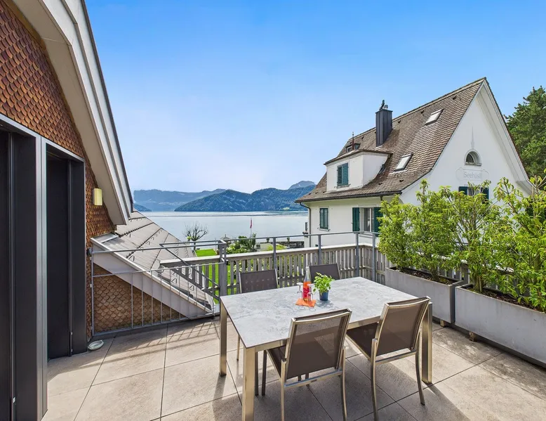Exclusive and charming guesthouse right in the heart of Weggis/Hertenstein. In the former fishing you will experience a feeling of the extra class and it offers you absolute relaxation directly on the lake. The entire gallery, including the living room and kitchen, is inviting and is flooded with sunshine or, in the event of rain and storm, always a haven of peace in front of the window. The open kitchen/living room is very modern, chic but also cozy. It shines through timelessly elegant furnishings with real chics. The space The rooms impress with a unique mixture of design and function. Both rooms are very spacious and with direct lake views. Guest access Two parking spaces available right next to the house (medium and left parking). Other public parking spaces are available directly below the property (blue zone). These guest parking spaces are reserved for you. Other things to note In our duplex apartment, you are surrounded by aesthetic design as well as practical functionality.