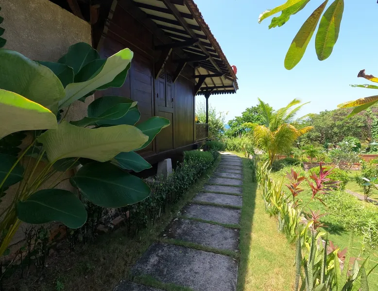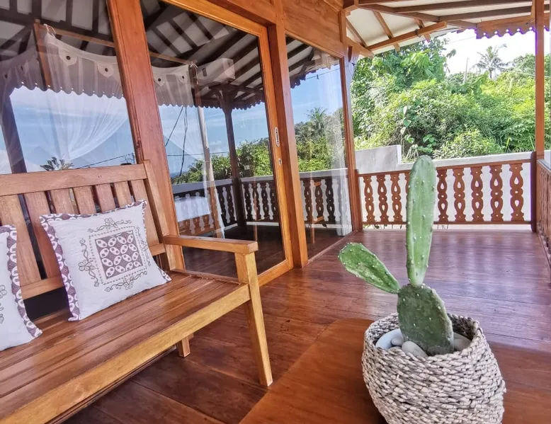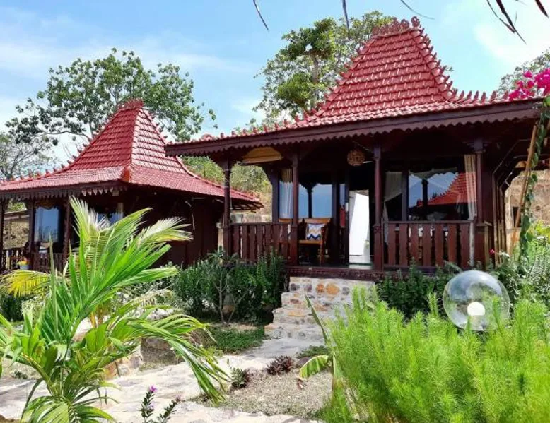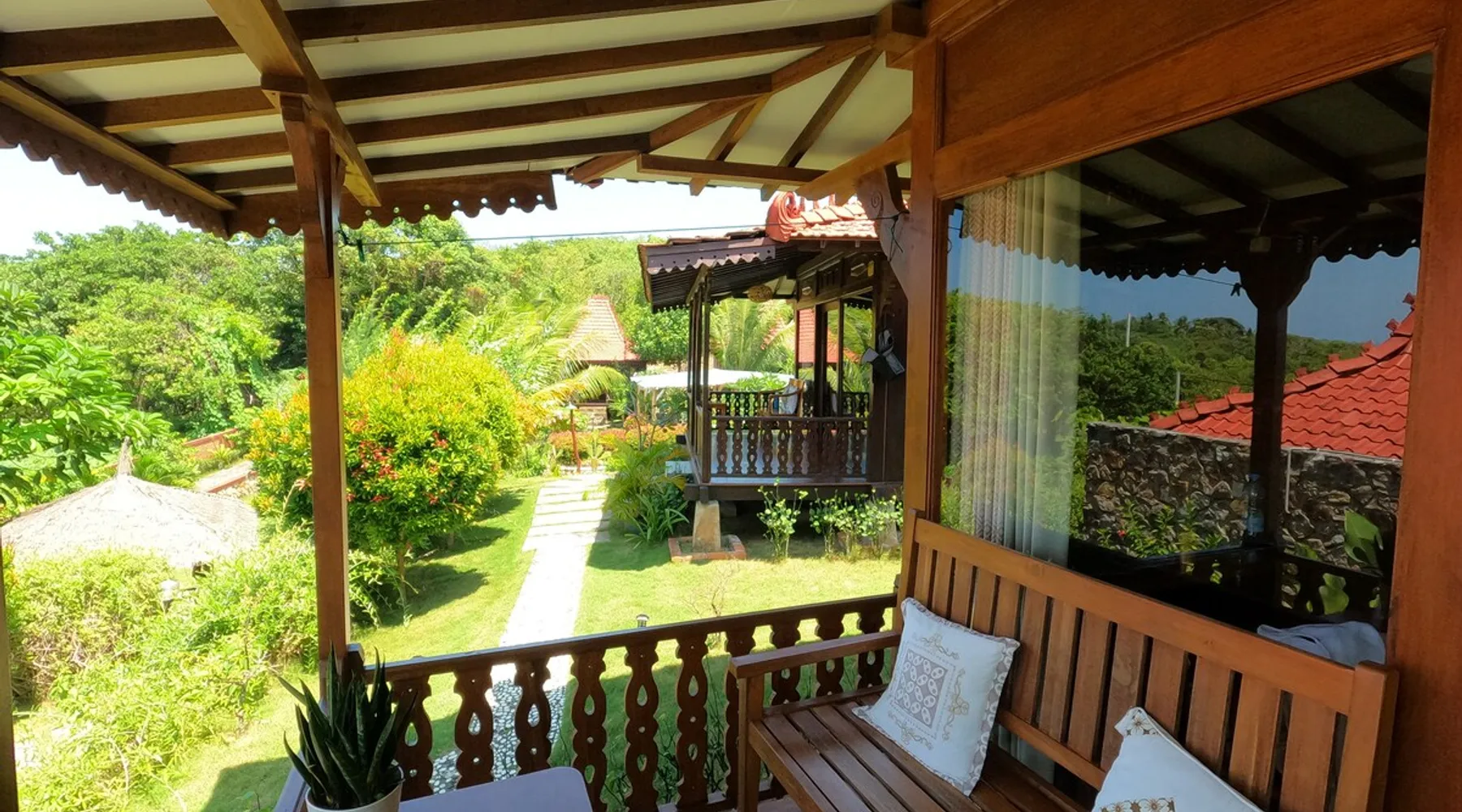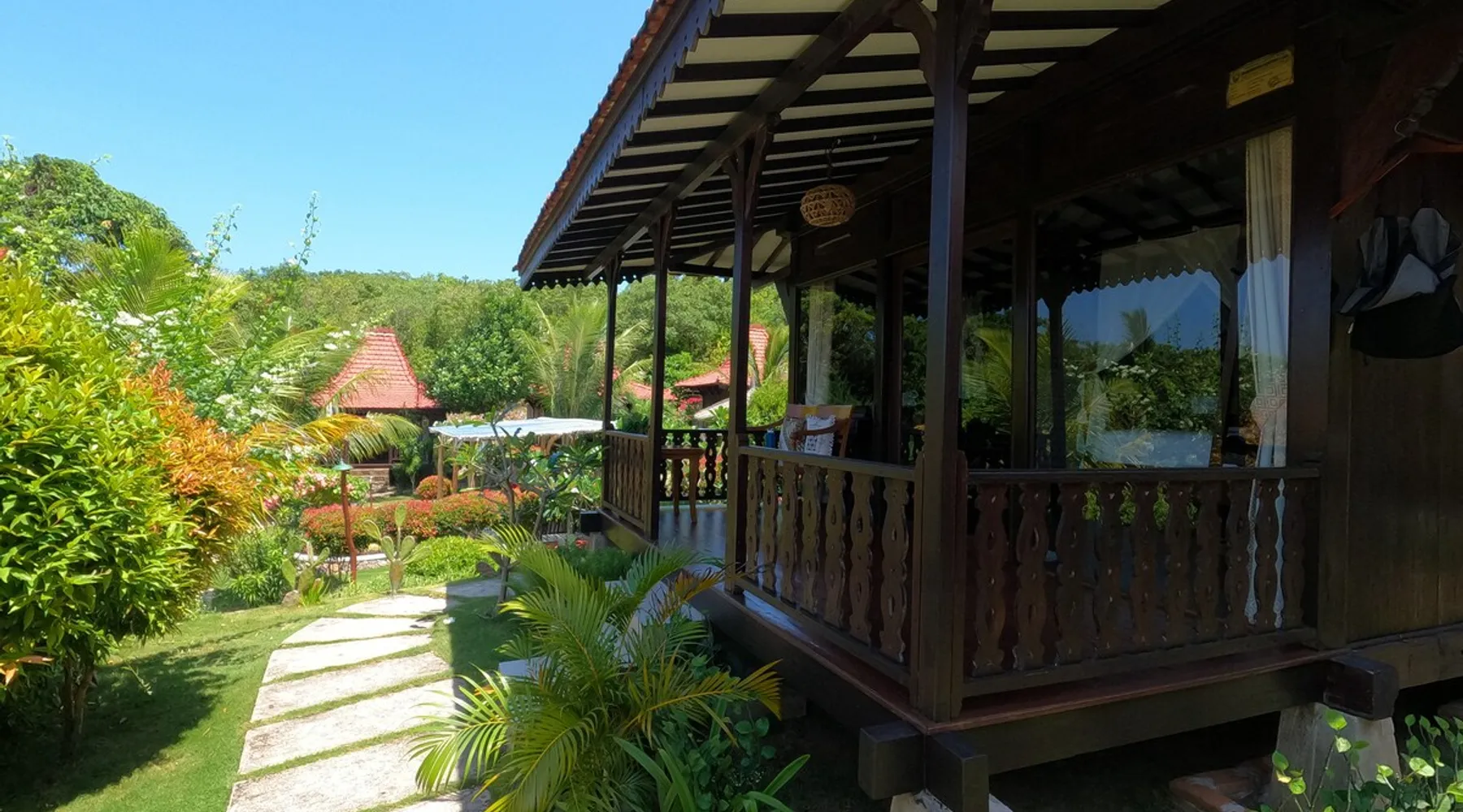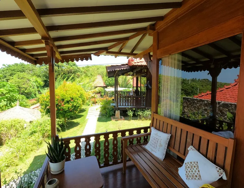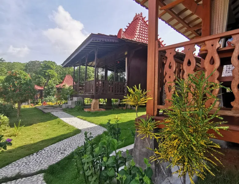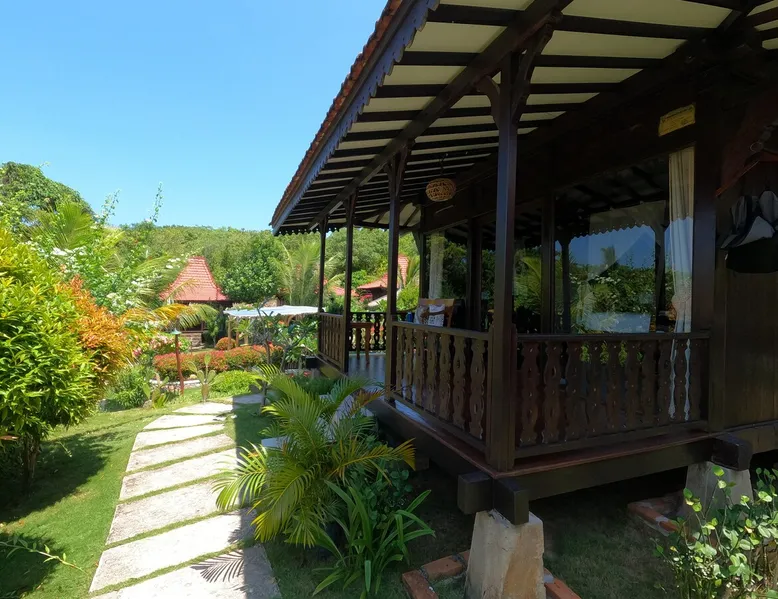 Situated in the most quiet area (but less 5min from center by scooter), Mirabelle Joglo Village is a unique experience for nature lovers searching for a peacefull place in harmony with nature. Traditionnal javanese-design village where you can enjoy your stay without the noise of the center and its loud mosquee.With a 32 meter square of cozy living space, our bungalows are ideal for a couple looking for a getaway in a more private setting.Each bungalow offer private terrace and view on the sea