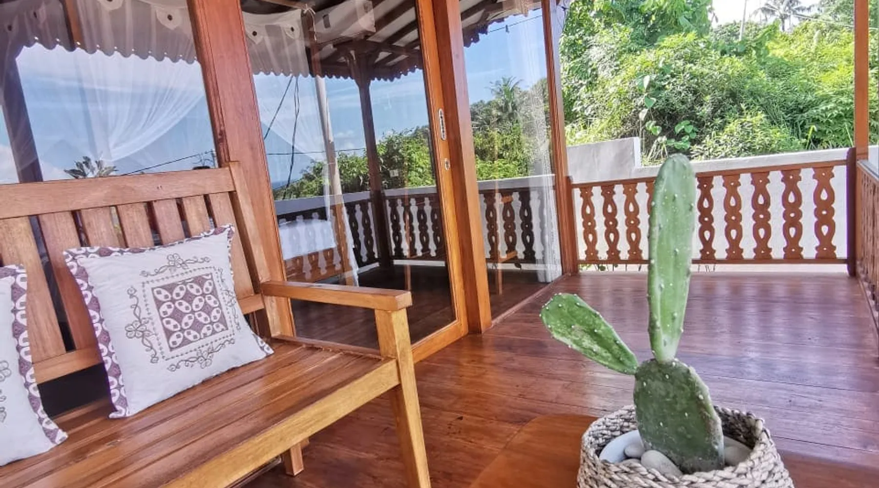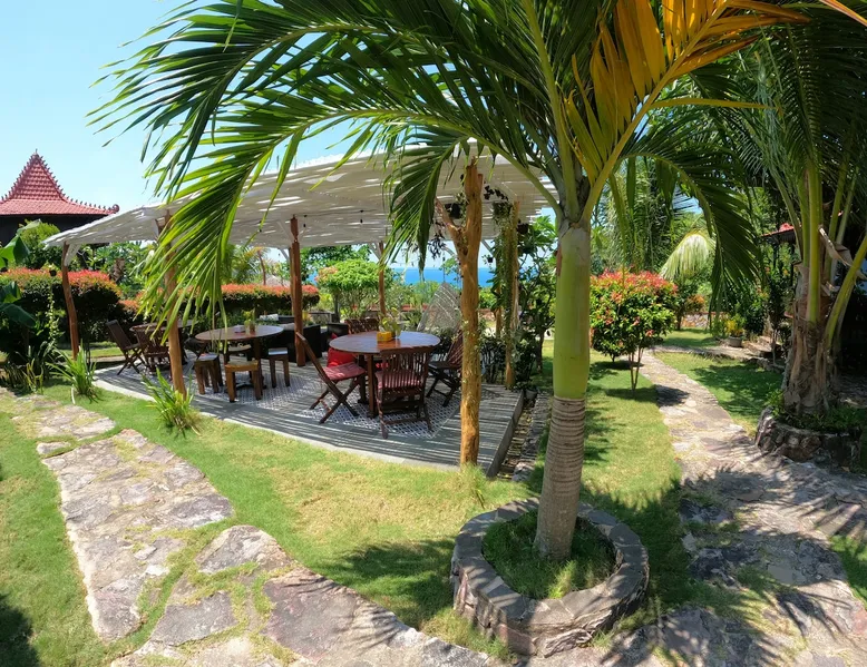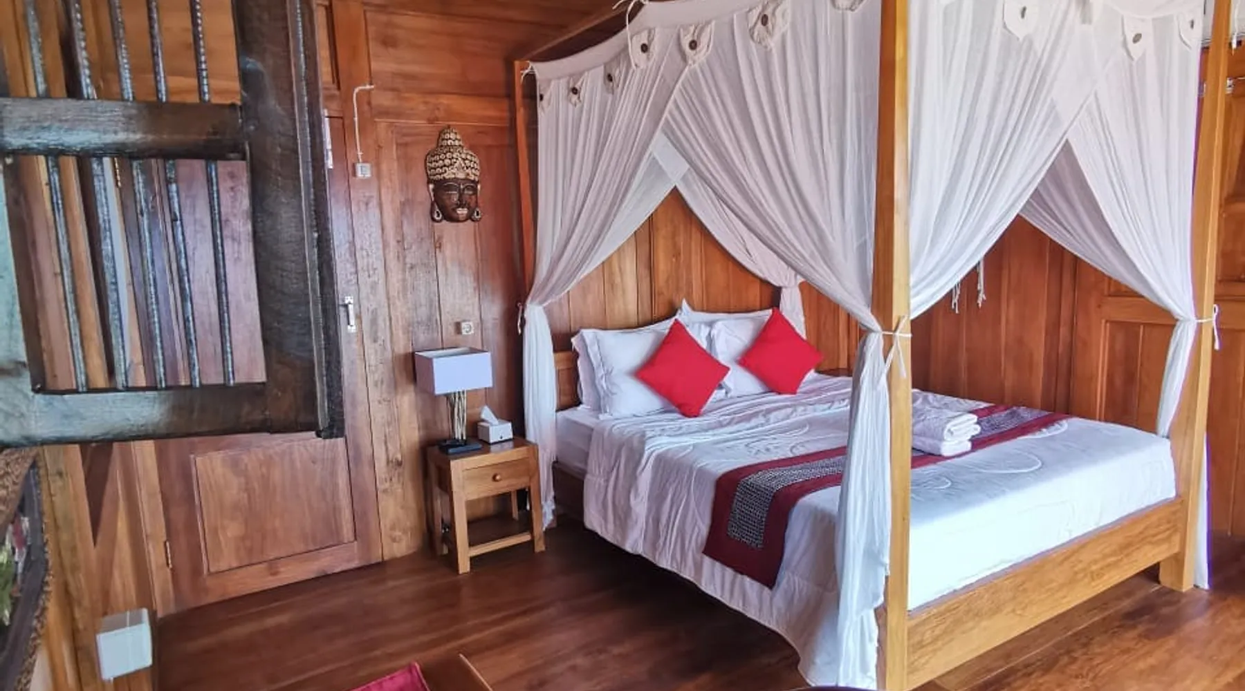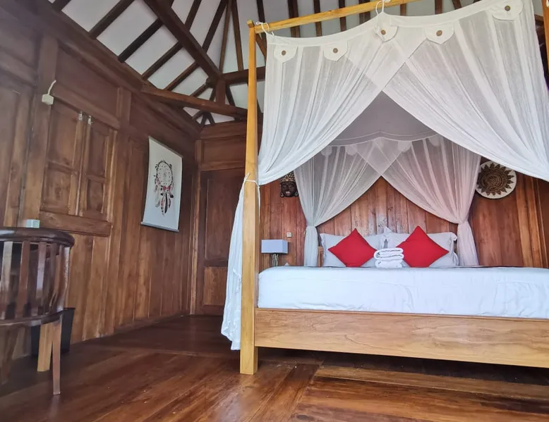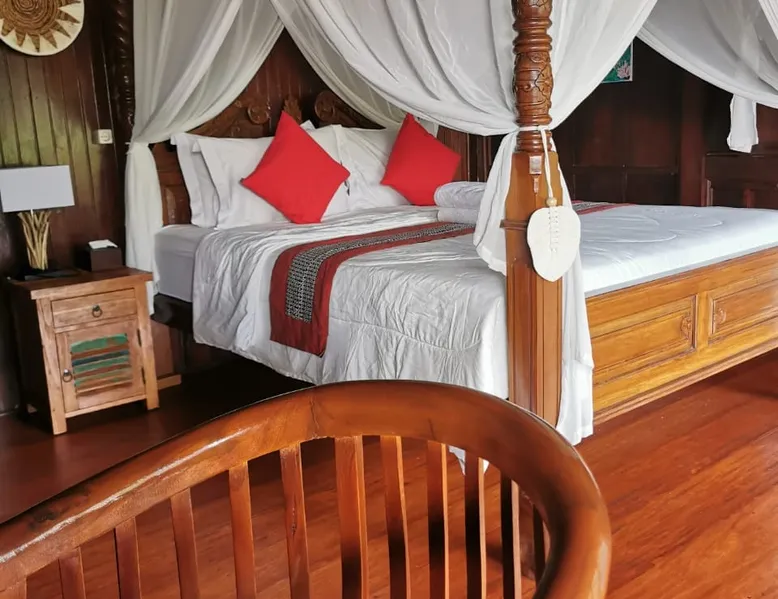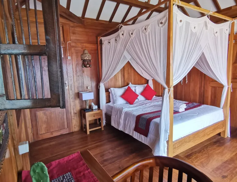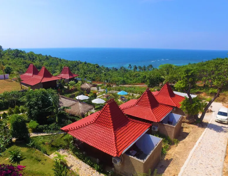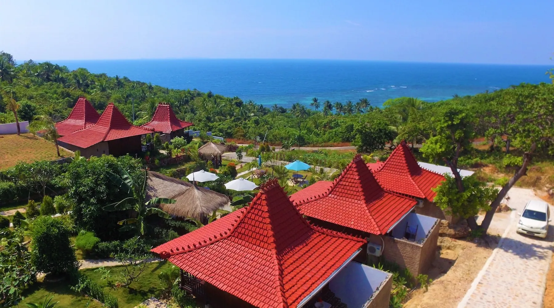 Situated in the most quiet area (but less 5min from center by scooter), Mirabelle Joglo Village is a unique experience for nature lovers searching for a peacefull place in harmony with nature. Traditionnal javanese-design village where you can enjoy your stay without the noise of the center and its loud mosquee.With a 32 meter square of cozy living space, our bungalows are ideal for a couple looking for a getaway in a more private setting.Each bungalow offer private terrace and view on the sea
