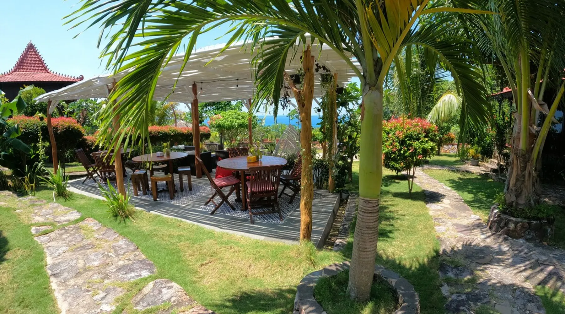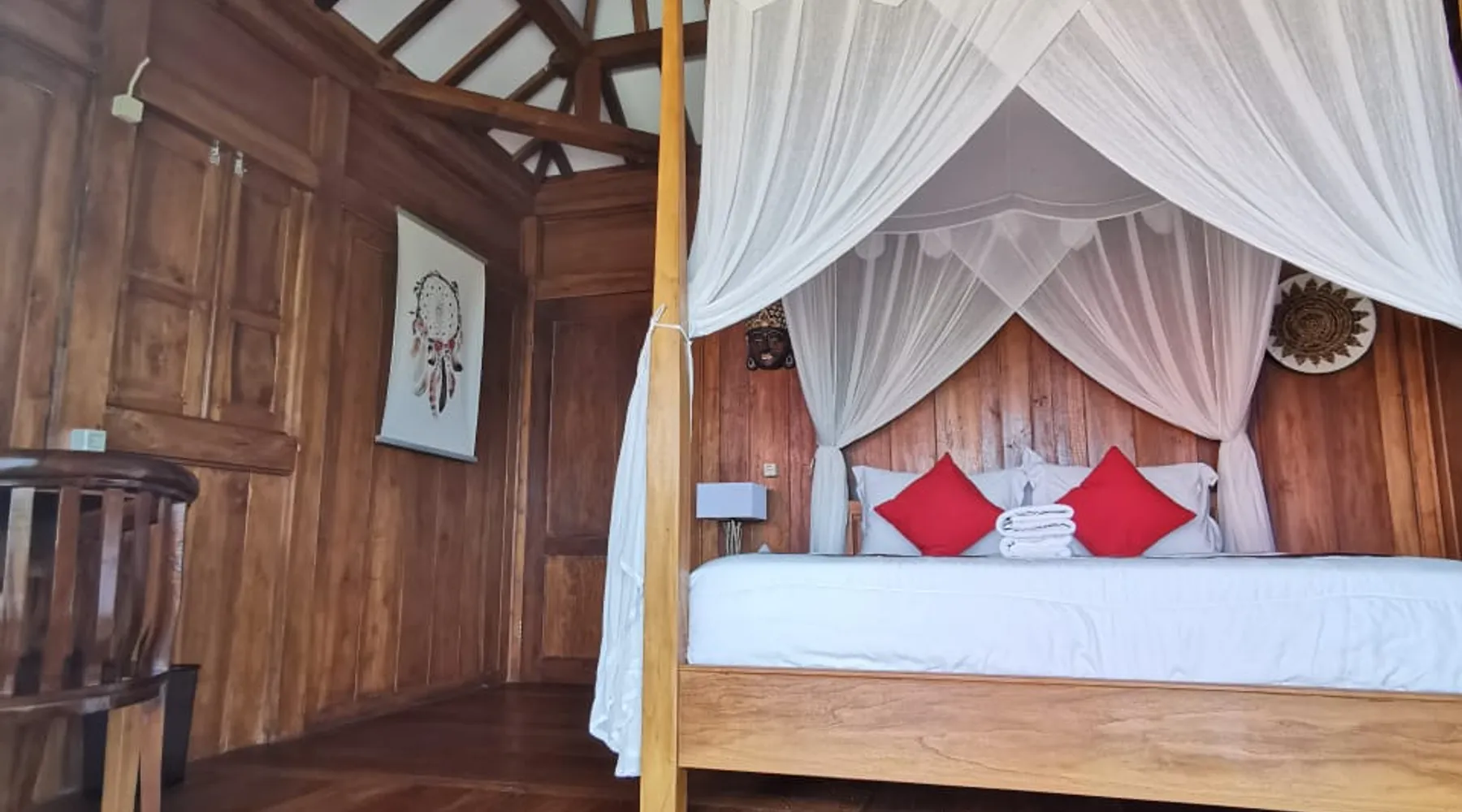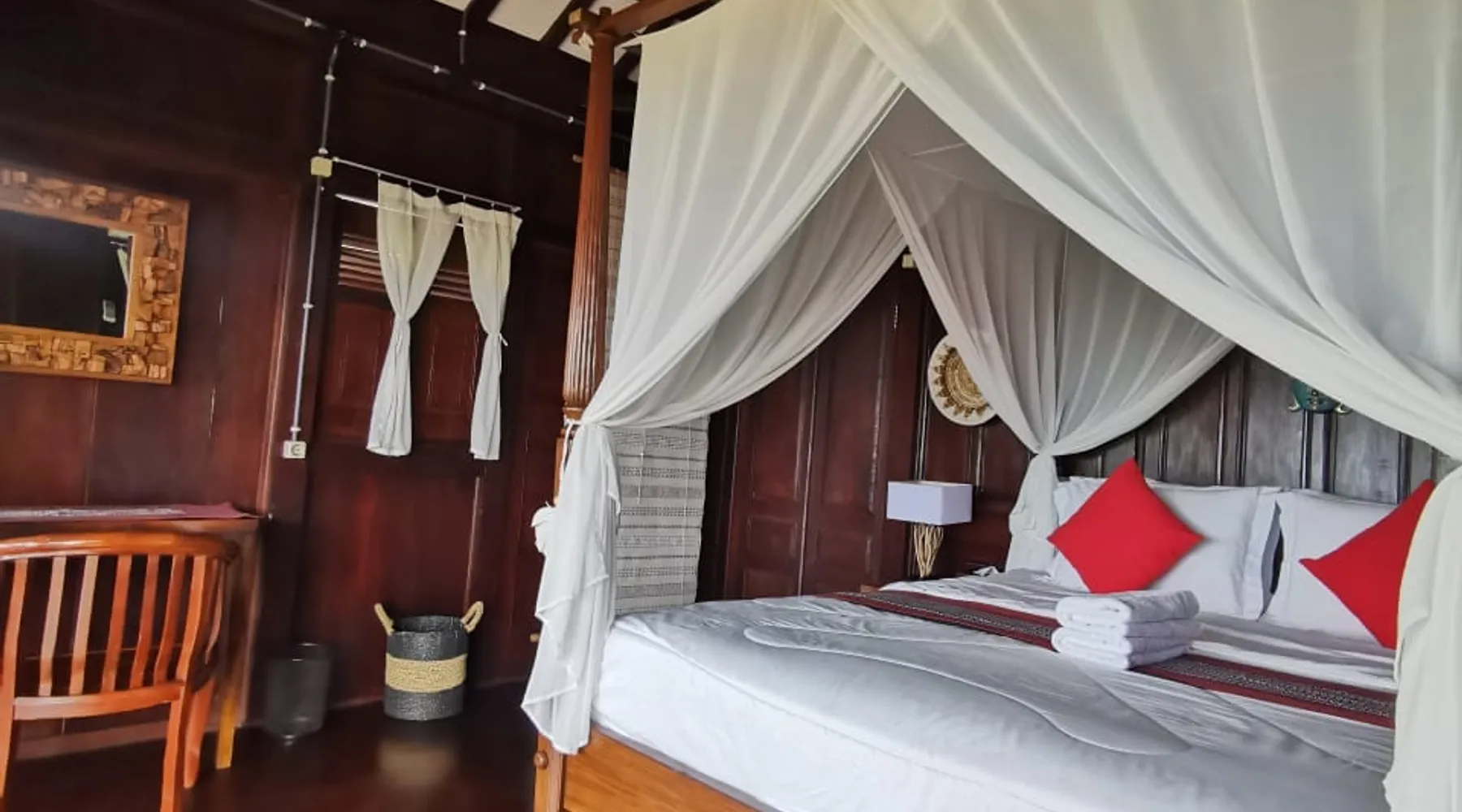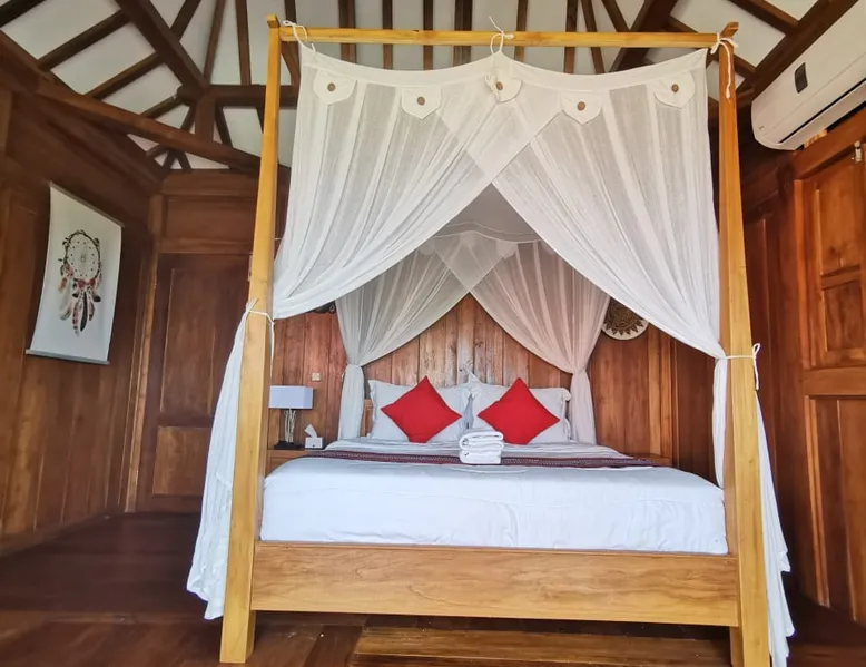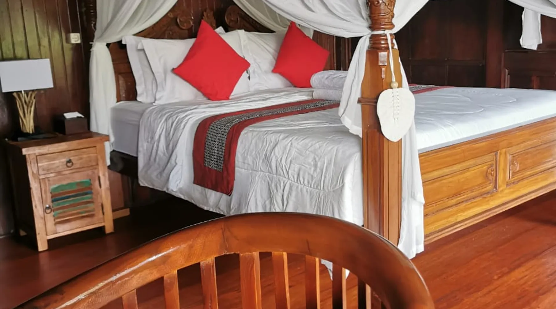 Situated in the most quiet area (but less 5min from center by scooter), Mirabelle Joglo Village is a unique experience for nature lovers searching for a peacefull place in harmony with nature. Traditionnal javanese-design village where you can enjoy your stay without the noise of the center and its loud mosquee.With a 32 meter square of cozy living space, our bungalows are ideal for a couple looking for a getaway in a more private setting.Each bungalow offer private terrace and view on the sea