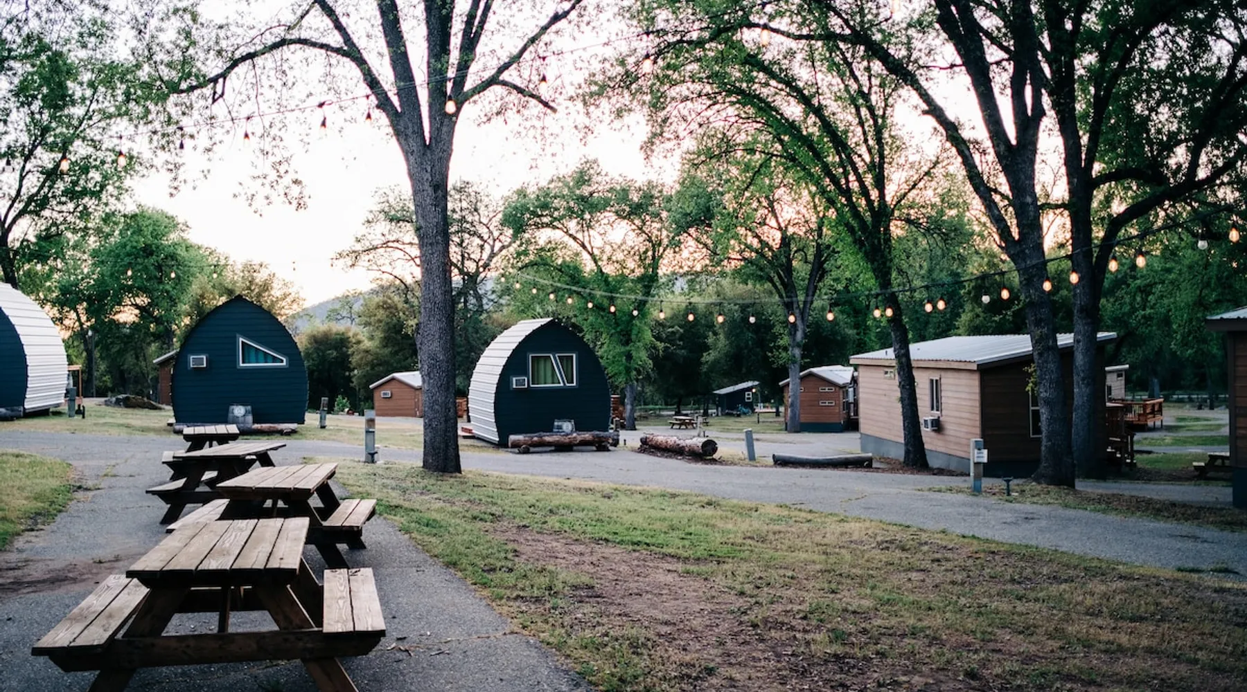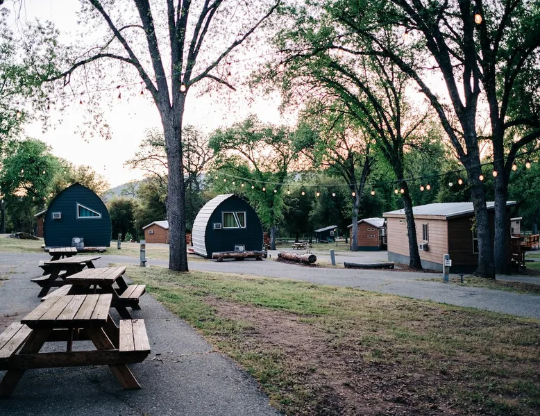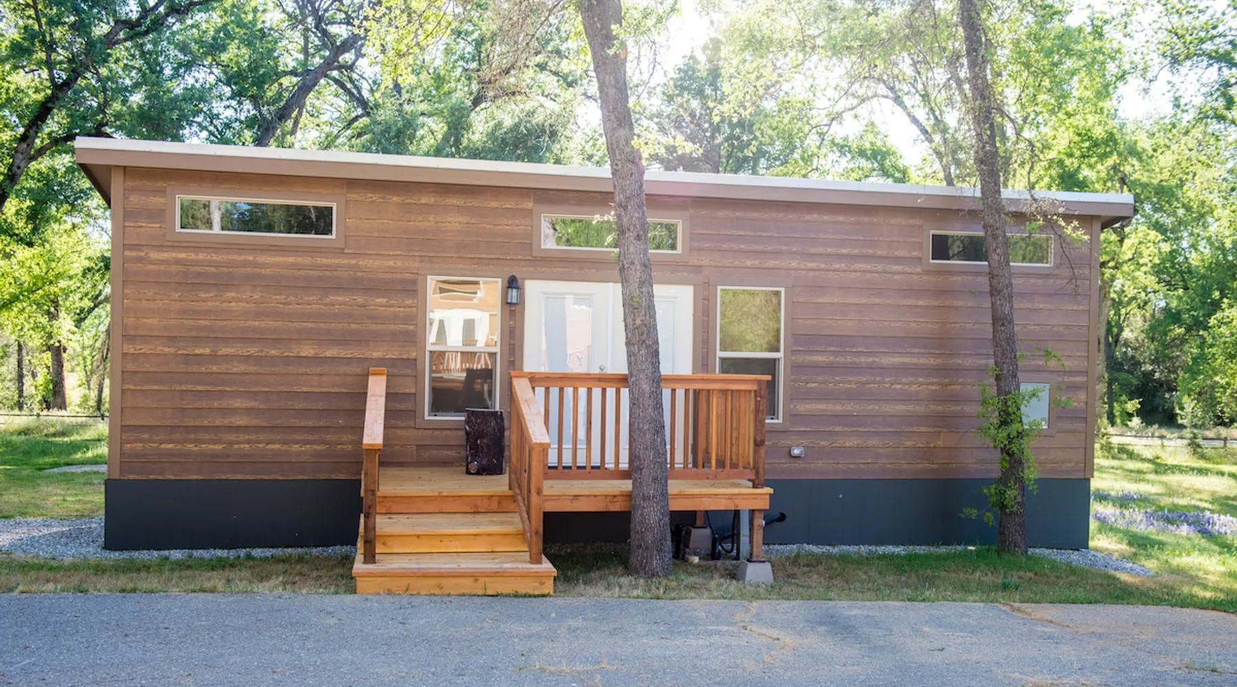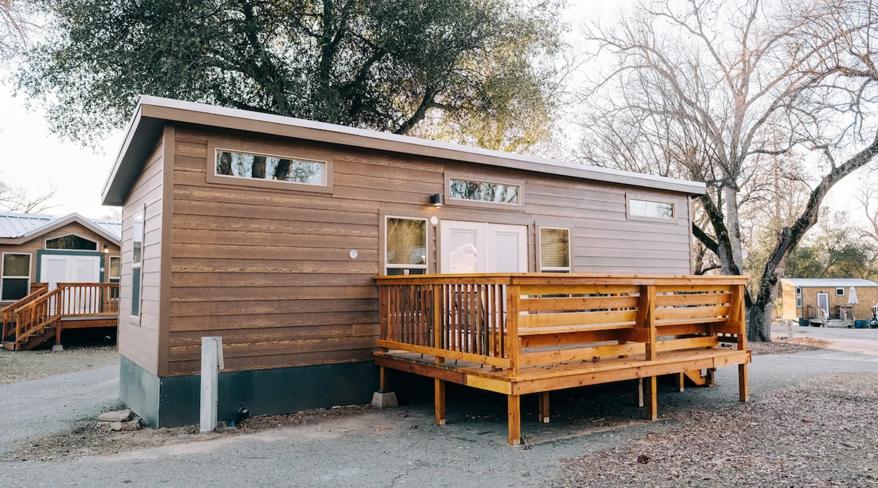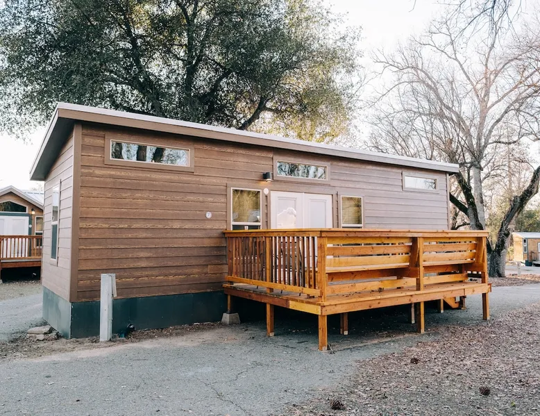 Welcome to your cozy Yosemite retreat nestled in the peaceful Sierra Foothills - a comfortable escape for families, couples, & small groups. - Sleeps 6 | 2 bedrooms | 3 beds | 1 bath - Shared hot tub (Oct-Apr) & shared pool (May-Sep) - Private patio, backyard space & hammock - Kitchenette w/ dining table workspace - Fast wifi (91 Mbps) - Pet-friendly & family-ready The space Soft morning light filters through the trees as you step onto your private patio, the cool Sierra air settling around you. Birds move across the quiet meadows nearby, and the surrounding foothills create a peaceful backdrop that encourages you to slow down, breathe, and settle in. As winter settles over this part of California, the cabin becomes a warm and comfortable place to return to after exploring the nearby trails or spending time in the crisp outdoor air. Sleeping arrangements Inside the 400 sq. ft. cabin, two private bedrooms each offer a queen bed with soft lighting for winding down at the end of the day. In the living area, a leather sofa converts into a full-sized bed, allowing up to six guests to stay comfortably. Fresh linens and essential bedding are provided so you can rest well between days spent outdoors. Outdoor living This cabin sits within the Sierra Foothills in a glamping-style resort setting, surrounded by grass, trees, and wide open spaces. In the colder months, the shared hot tub is available from October to April during specific hours, offering a relaxing spot to warm up after time outside. You also have access to a private patio or balcony, a hammock, outdoor furniture, and a backyard space on the property. Complimentary bikes are available for exploring the nearby grounds, and a lake can be reached by a path or dock. Walking trails, ponds, creeks, and streams are located across the street, giving you plenty of opportunities for fresh air and gentle winter exploration. Kitchen and dining A kitchenette provides the basics for preparing simple meals, with a refrigerator, microwave, cooking essentials, dishes, and silverware. A dining table serves as a comfortable place for shared meals or as a dedicated workspace when needed. A pour-over coffee setup is provided so you can begin your day with a warm cup in the quiet of the morning. Bathroom The cabin includes a full bathroom with a bathtub and hot water, along with bathroom essentials for your stay. It is a practical, comfortable space to refresh after being outdoors. Family-friendly touches Families will find the cabin equipped with a crib, a pack n play/travel crib, a high chair, outlet covers, board games, and children's books and toys, making it easy to settle in with little ones. Connectivity and comfort Fast wifi, verified at 91 Mbps, supports streaming or remote work. A window AC unit, ceiling fan, and heating help maintain a comfortable indoor environment throughout the year. Entertainment includes a Bluetooth speaker and books and reading material. Resort access and features Guests can access nearby resort facilities, free parking on the premises, and an EV charger. Exterior security cameras are located at the camp store and swimming pool for safety. The property is pet-friendly, allowing you to bring up to two dogs. Self check-in is available through a keypad for a smooth arrival. Neighborhood The surrounding park-like setting is quiet and shaded, offering a peaceful place to spend time outdoors. Trails, water features, and natural scenery are just steps away, creating a simple yet relaxing foothills experience. Guest access Guests will also have access to the 140 acre former golf course, which is a great place to take a walk on the miles of concrete pathways. When the weather is warmer (typically mid-May through early September), guests also have access to the Lodge swimming pool. The pool is open from 8am to 8pm each day. Other things to note Our wifi is strong at the cabins & pool area and we are connected to the internet with a reliable fiber connection. We only allow dogs, fee may apply. No other pets are allowed; no exceptions to this policy.