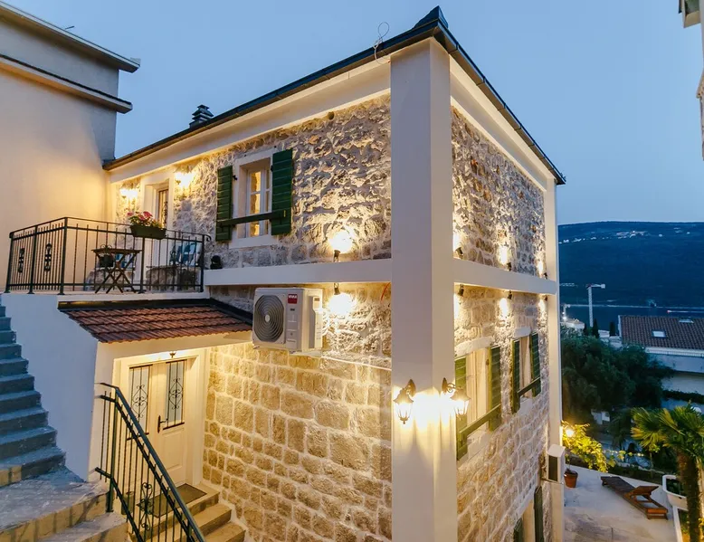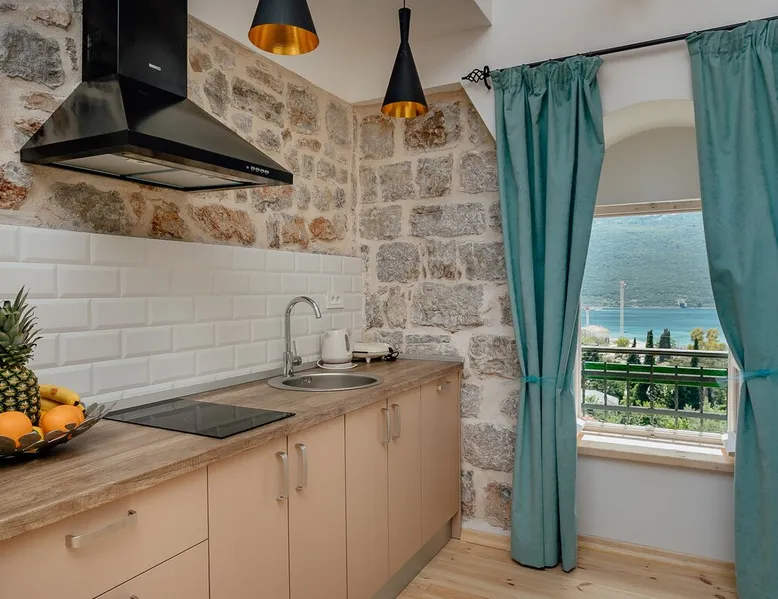 After 130 years house gets its new look. During renovation, we took special care to preserve authenticity of stone and wood that adorns this charming house. Wooden windows and green blinds remind us of coastal style of building in this area.The interior of the house is completely adapted to the modern way of life. Provides comfort and everything that is needed for a good and relaxing vacation. Its blue tones that dominate the interior reflect the surroundings in which the house is located. The space In the part of Boka Kotorska Bay, between Topljan and Tivat bay, you can find Kumbor canal that connects them, and the village Kumbor that is only 6km far from Old town Herceg Novi. The name of the city originates from the Italian word conborgo - suburb, because the settlement used to be in the immediate vicinity of the old town Stoli. That term served us to name this over 130 years old house, which once used to be the first school in Kumbor. In this house, school was established during Kingdom of Serbs, Croats and Slovenes in 1921, and its host was Mr. Niko Matov Dabižinović. School worked until World War II. During that time 64 students attended school where they learned basic literacy and also, craftsmanship. On the second floor of the house there is a studio apartment of only 39 square meters. It consists of an entrance hall, fully equipped kitchen with dishwasher, small kitchen appliances (toaster, water kettle, microwave), dining room, living room with convertible sofa (140x200cm), LCD TV with satellite channels, cozy double bed (160x200cm), a bathroom with a washing machine and a shower adorned in genuine stone for a special atmosphere. Apartment also offers beautiful view over the sea, the mountains and the backyard of the house. Equipped with free WIFI, hairdryer, ironing facilities, toiletries, clean towels and linens, this apartment also has its own private terrace facing the backyard of the house. The studio apartment is ideal for 2 adults + 2 children.