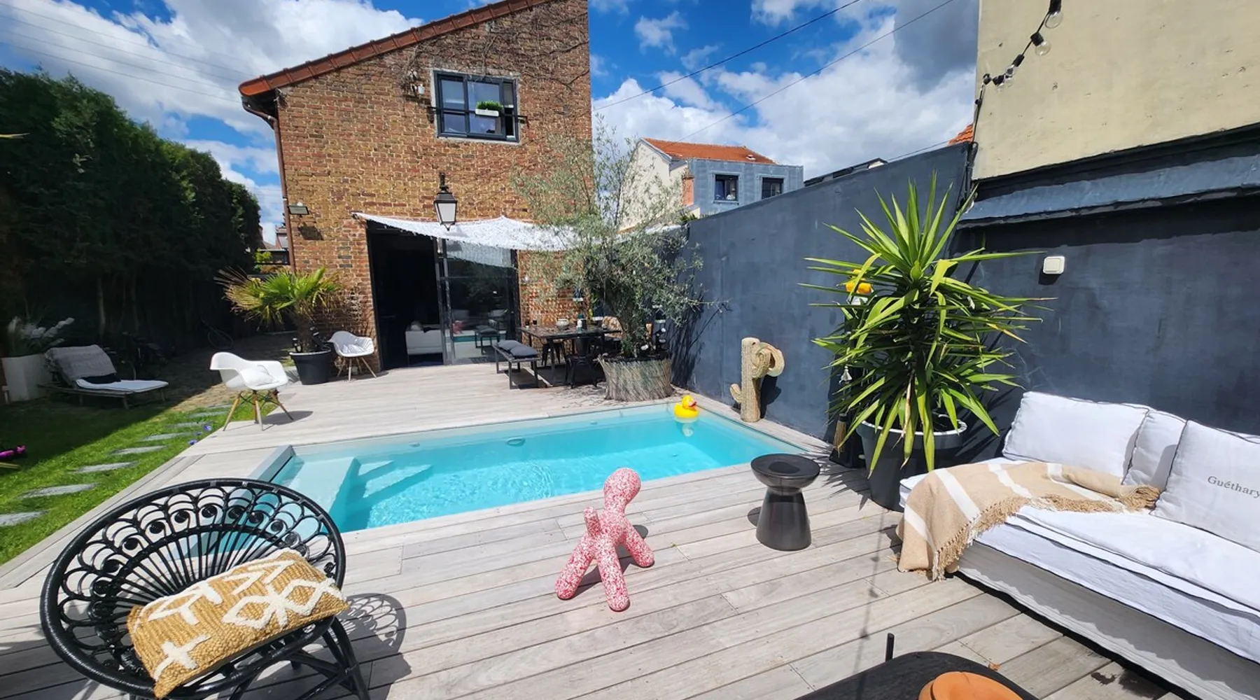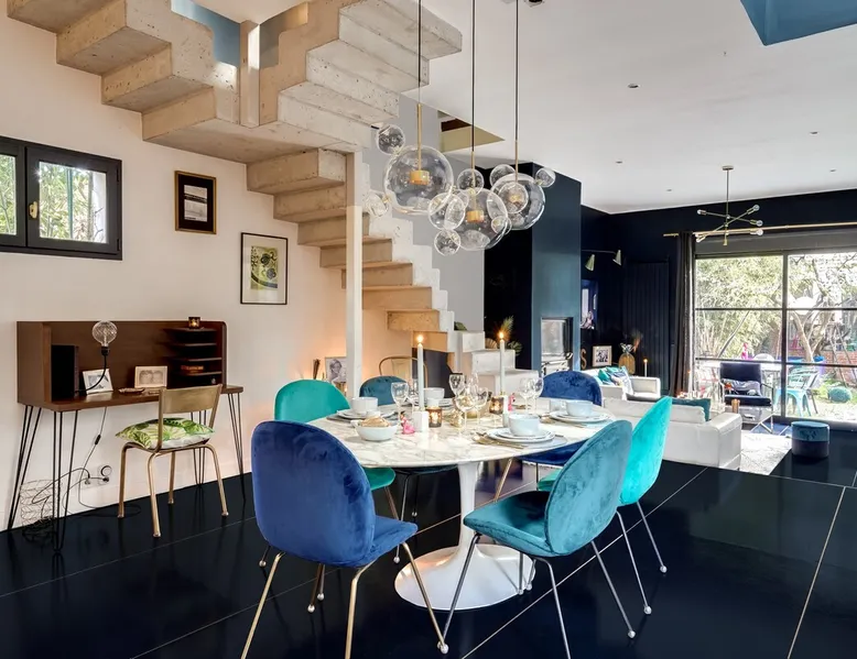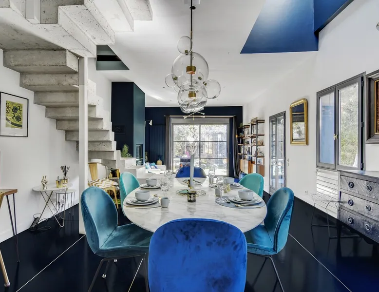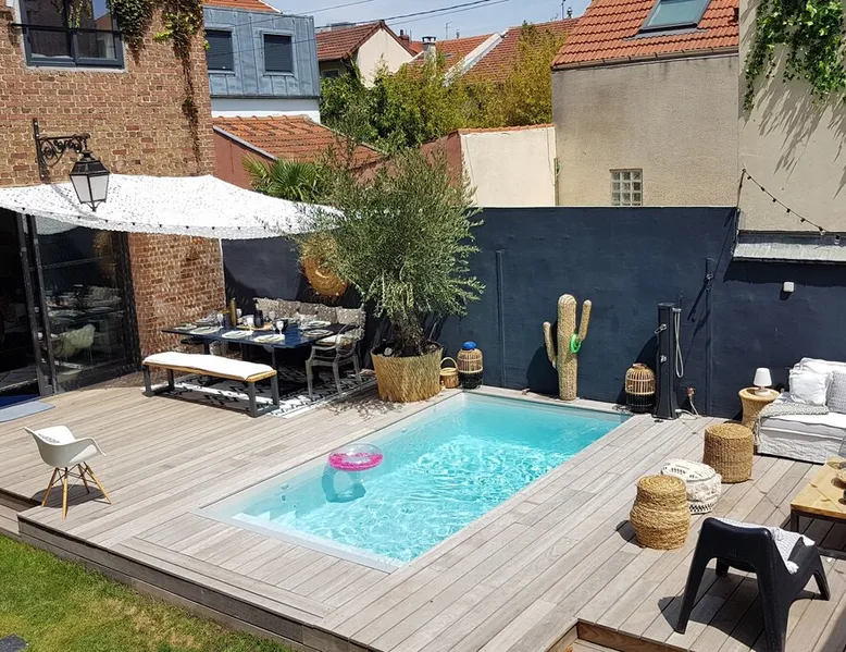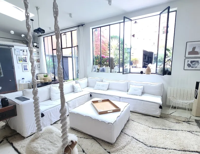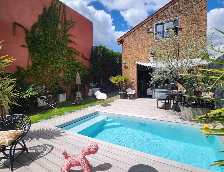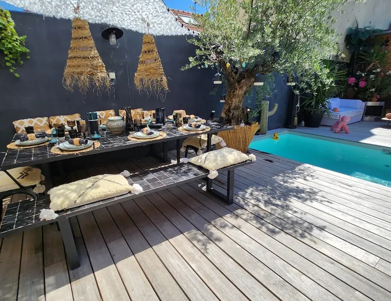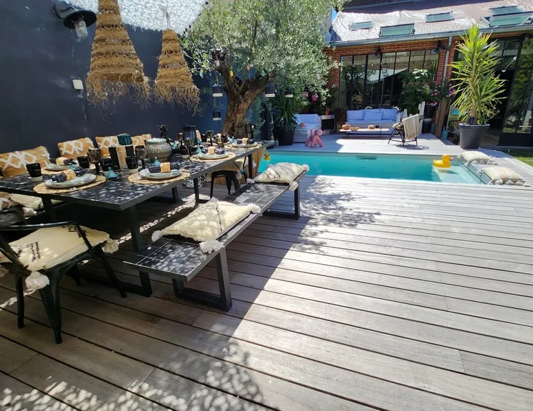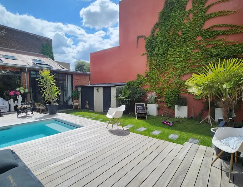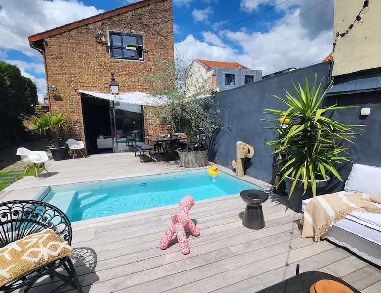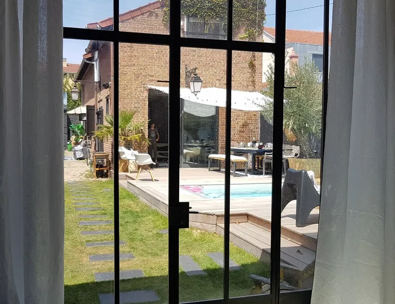 2 large houses to designate 170m2 each, 340m2 in total, 11 beds. Perfect for 2/3 families,Ideally located 3 km from Paris Champs Elysées Garden, secure heated pool, 2 living rooms, 2 kitchens 6 bedrooms. Bus 30 meters to Paris or to get there by bike on the bike paths.Tramway at the end of the street for the business center or metro 5 minutes from Paris stem Lazare 10 minutes by train Shooting/show OK The space 2 large separate houses of 170m2 each, 370m2 in total, both separated by the garden and pool Ideally located at the 2024 Olympics, very close to Paris, Very well served by public transport. Bus, RER, trains, subways, tram. 2 large living rooms of 90 m2 each, two large American kitchens, floors 6 bedrooms (3 bedrooms per house), 4 bathrooms/shower/WC Up to 16 beds Nice and large exteriors in a quiet area with its heated secure swimming pool. - 15 minutes from the Olympic Village 2024 by the city's metro -4 minutes by bike from the Olympics of the Hockey events on grass, - Between 15 and 30 minutes of all events in Paris, by tram, metro, trains, bus, car or bikes. A small haven of peace with heated swimming pool all year round, a holiday atmosphere in Marrakech or Bali à la Parisienne, and 10/15 minutes from the Champs Élysées Paris In a neighborhood is family-friendly, quiet and residential. You can park 2 cars in the main driveway of the houses or free parking spaces on the street. Bike trails in front of the house to go to Paris Guest access Guests can use both houses, garden, swimming pool, bbq and bikes and scooters, bath towels, buoys... Free parking spaces in the streets (unless the Town Hall blocks places on the street for the Olympics) 2 parking spaces in the driveway of house 1, (one behind the other) Other things to note If you stay more than 1 week please take out the garbage on the days of passage Registration details 9202500028515