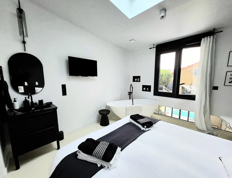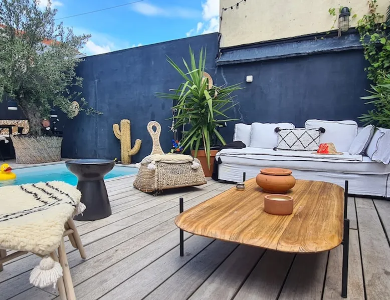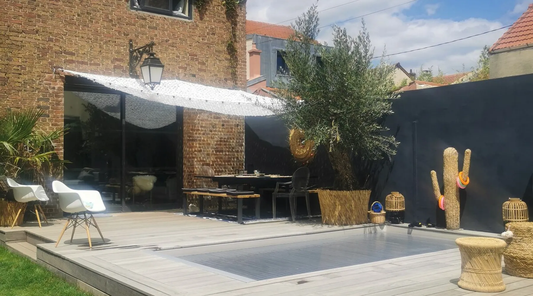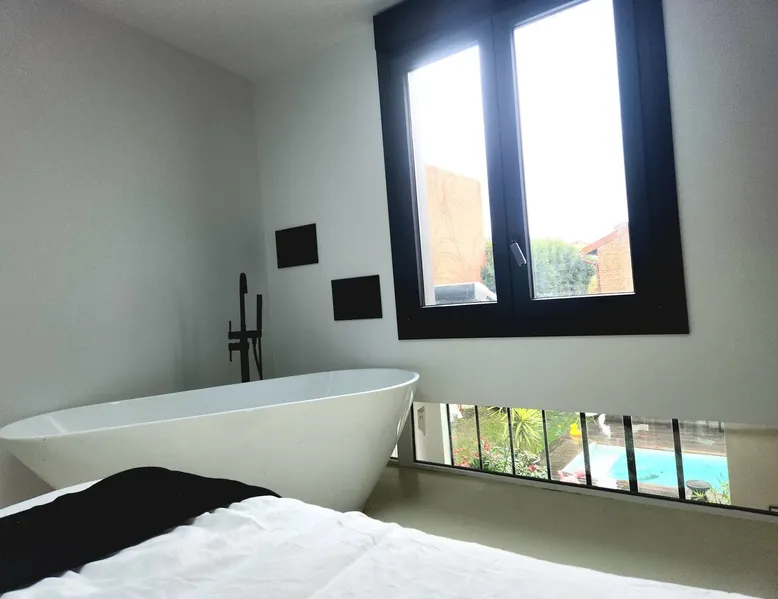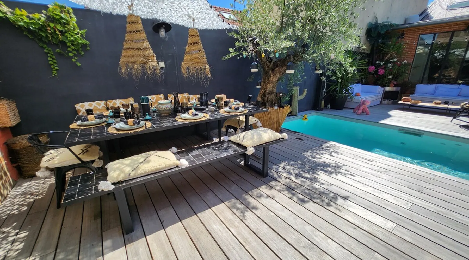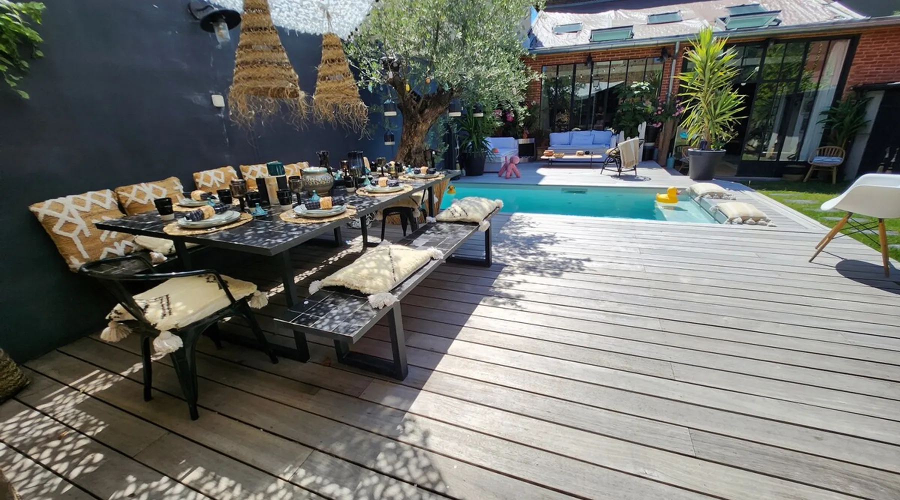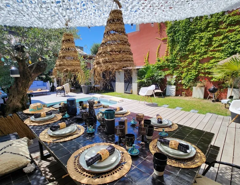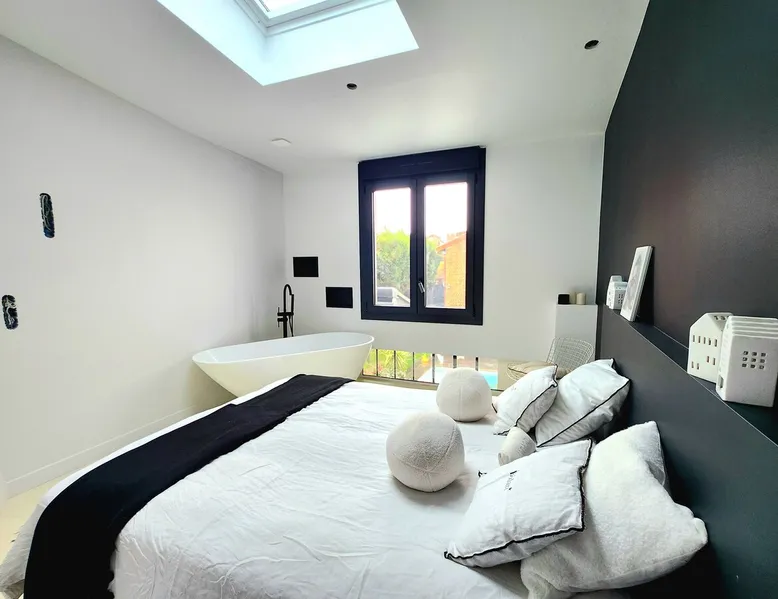 2 large houses to designate 170m2 each, 340m2 in total, 11 beds. Perfect for 2/3 families,Ideally located 3 km from Paris Champs Elysées Garden, secure heated pool, 2 living rooms, 2 kitchens 6 bedrooms. Bus 30 meters to Paris or to get there by bike on the bike paths.Tramway at the end of the street for the business center or metro 5 minutes from Paris stem Lazare 10 minutes by train Shooting/show OK The space 2 large separate houses of 170m2 each, 370m2 in total, both separated by the garden and pool Ideally located at the 2024 Olympics, very close to Paris, Very well served by public transport. Bus, RER, trains, subways, tram. 2 large living rooms of 90 m2 each, two large American kitchens, floors 6 bedrooms (3 bedrooms per house), 4 bathrooms/shower/WC Up to 16 beds Nice and large exteriors in a quiet area with its heated secure swimming pool. - 15 minutes from the Olympic Village 2024 by the city's metro -4 minutes by bike from the Olympics of the Hockey events on grass, - Between 15 and 30 minutes of all events in Paris, by tram, metro, trains, bus, car or bikes. A small haven of peace with heated swimming pool all year round, a holiday atmosphere in Marrakech or Bali à la Parisienne, and 10/15 minutes from the Champs Élysées Paris In a neighborhood is family-friendly, quiet and residential. You can park 2 cars in the main driveway of the houses or free parking spaces on the street. Bike trails in front of the house to go to Paris Guest access Guests can use both houses, garden, swimming pool, bbq and bikes and scooters, bath towels, buoys... Free parking spaces in the streets (unless the Town Hall blocks places on the street for the Olympics) 2 parking spaces in the driveway of house 1, (one behind the other) Other things to note If you stay more than 1 week please take out the garbage on the days of passage Registration details 9202500028515