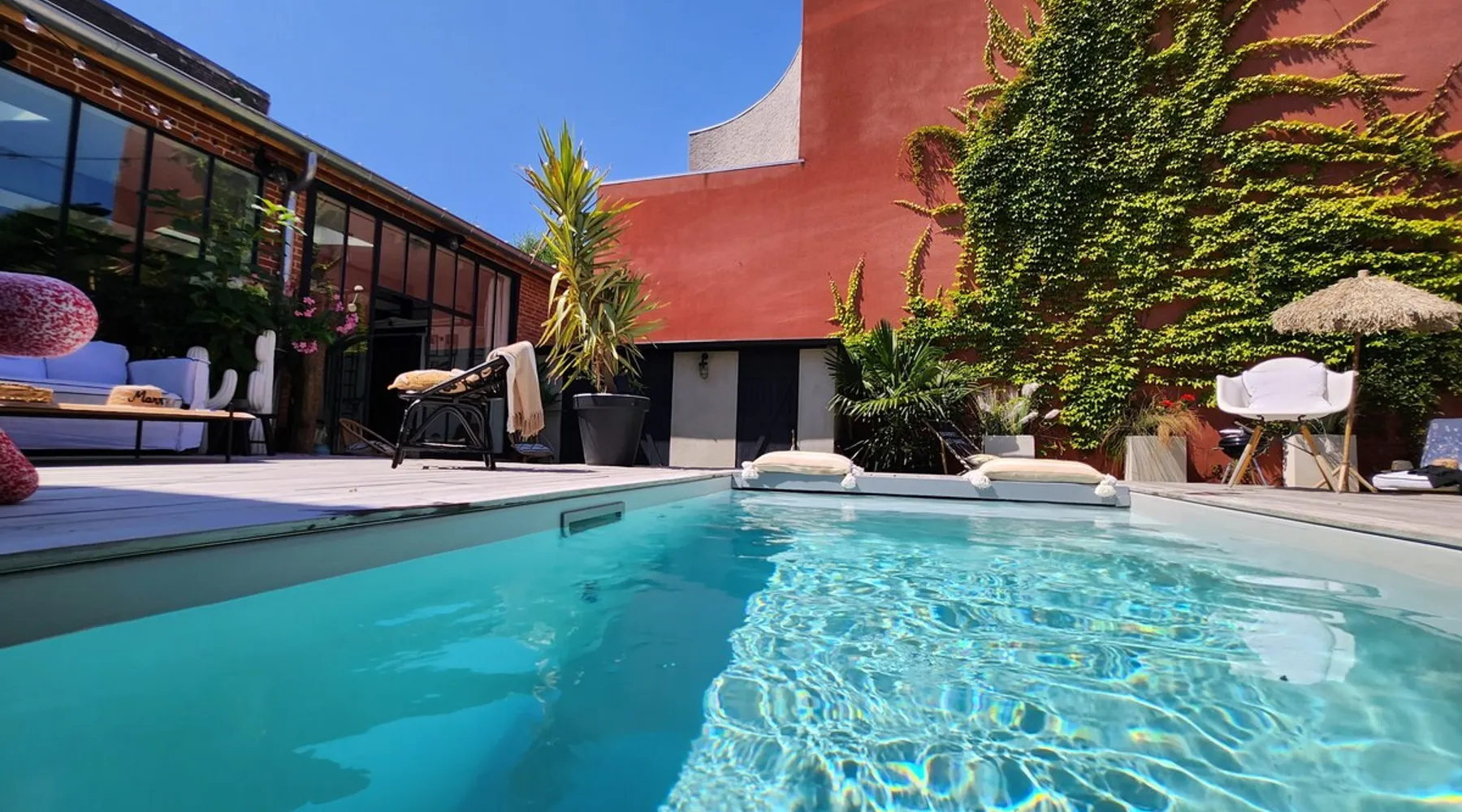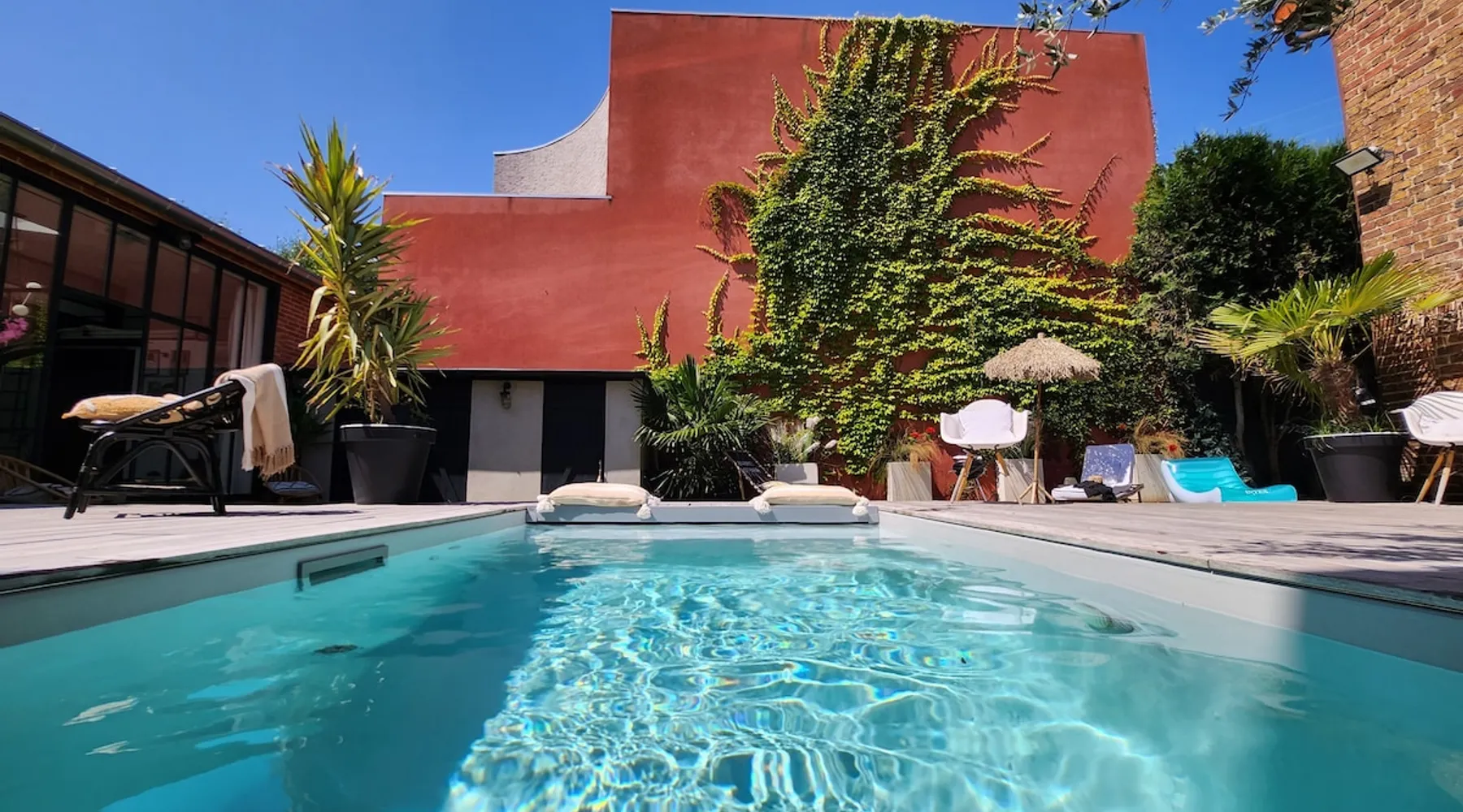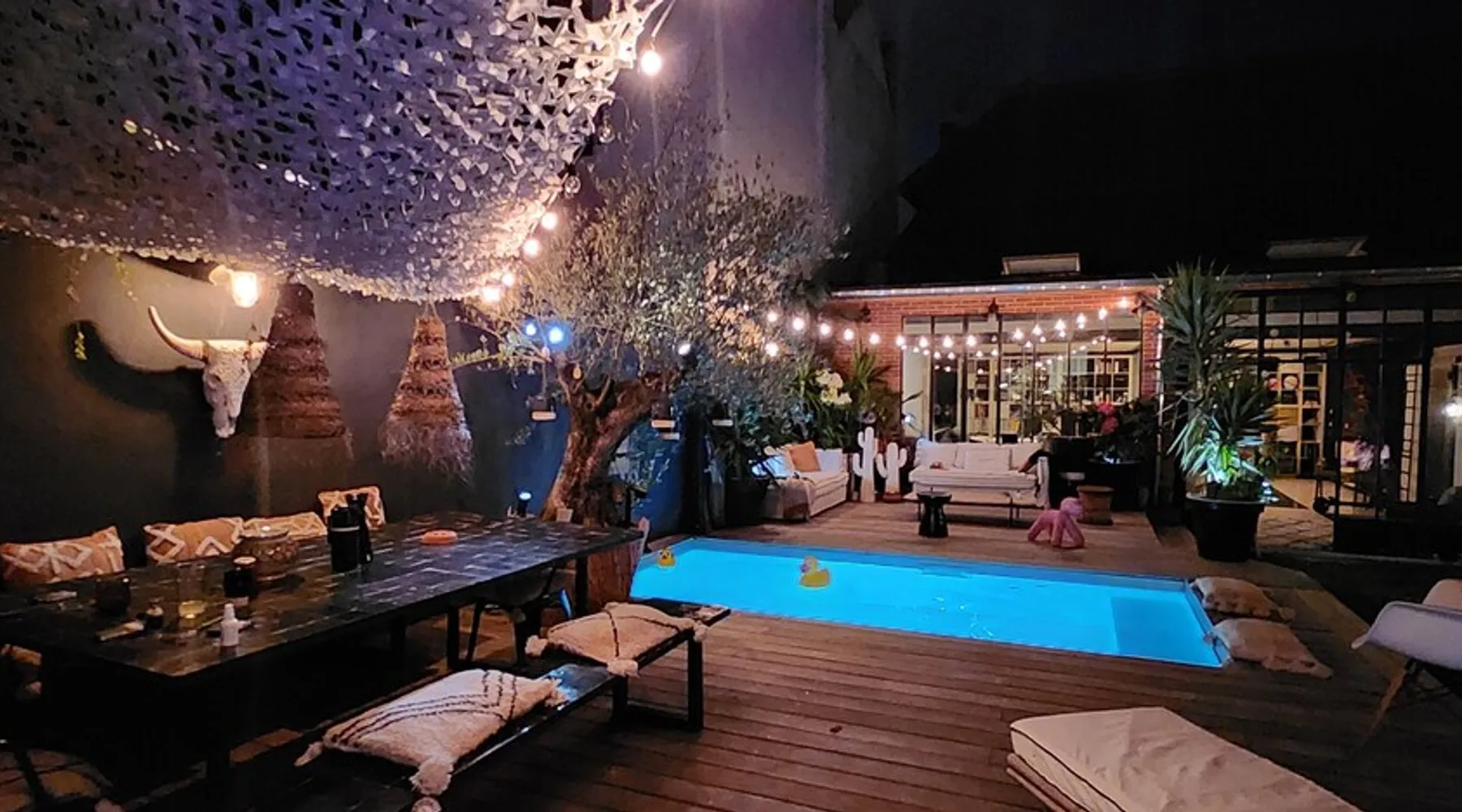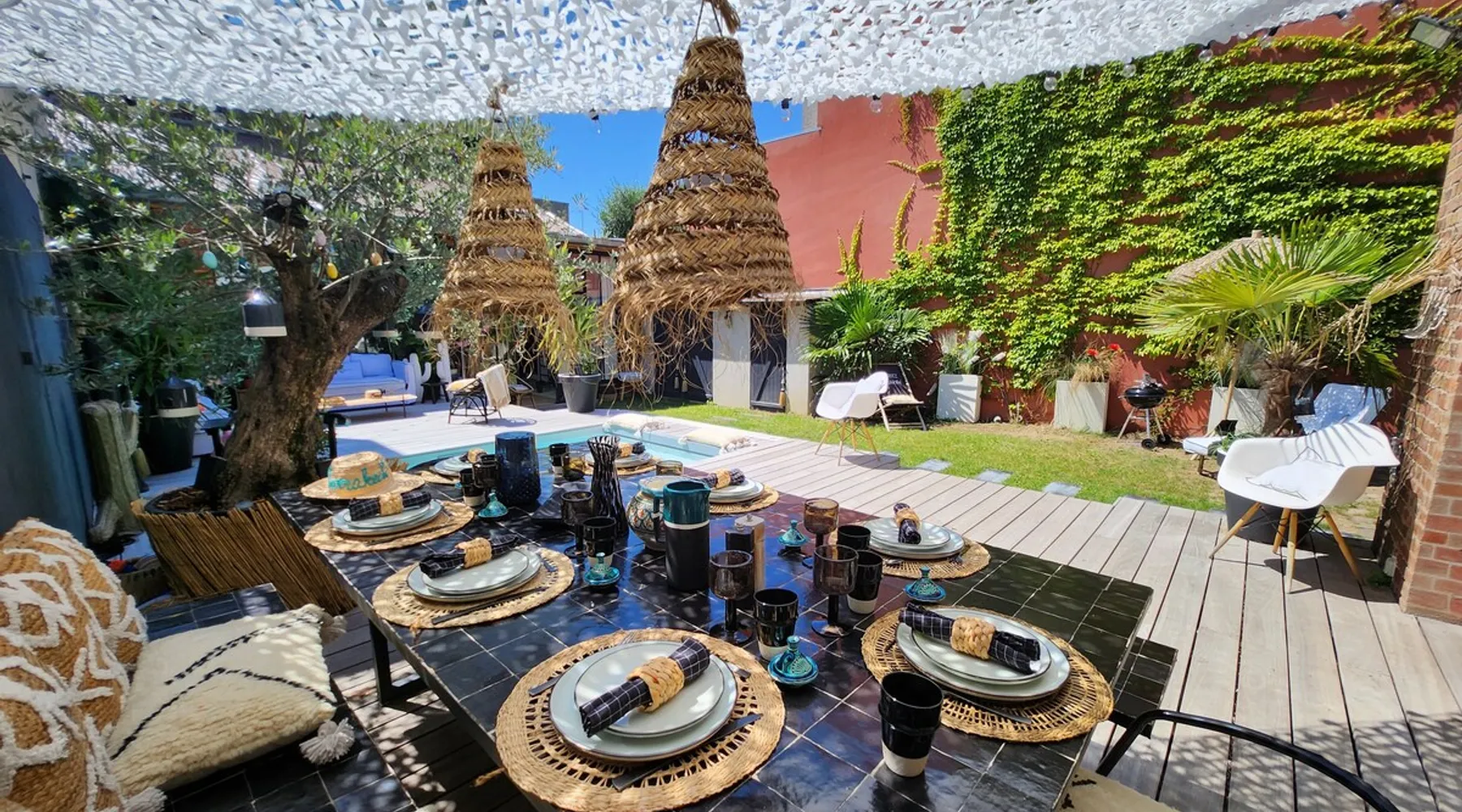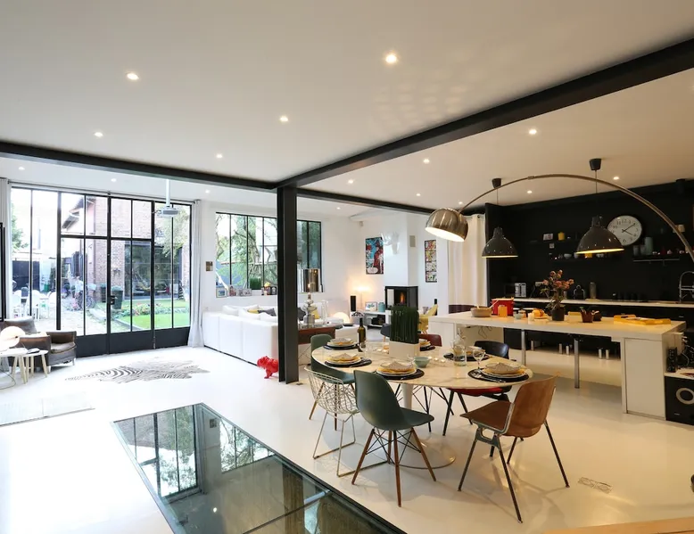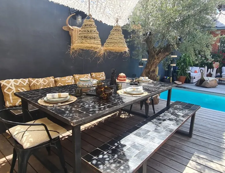 2 large houses to designate 170m2 each, 340m2 in total, 11 beds. Perfect for 2/3 families,Ideally located 3 km from Paris Champs Elysées Garden, secure heated pool, 2 living rooms, 2 kitchens 6 bedrooms. Bus 30 meters to Paris or to get there by bike on the bike paths.Tramway at the end of the street for the business center or metro 5 minutes from Paris stem Lazare 10 minutes by train Shooting/show OK The space 2 large separate houses of 170m2 each, 370m2 in total, both separated by the garden and pool Ideally located at the 2024 Olympics, very close to Paris, Very well served by public transport. Bus, RER, trains, subways, tram. 2 large living rooms of 90 m2 each, two large American kitchens, floors 6 bedrooms (3 bedrooms per house), 4 bathrooms/shower/WC Up to 16 beds Nice and large exteriors in a quiet area with its heated secure swimming pool. - 15 minutes from the Olympic Village 2024 by the city's metro -4 minutes by bike from the Olympics of the Hockey events on grass, - Between 15 and 30 minutes of all events in Paris, by tram, metro, trains, bus, car or bikes. A small haven of peace with heated swimming pool all year round, a holiday atmosphere in Marrakech or Bali à la Parisienne, and 10/15 minutes from the Champs Élysées Paris In a neighborhood is family-friendly, quiet and residential. You can park 2 cars in the main driveway of the houses or free parking spaces on the street. Bike trails in front of the house to go to Paris Guest access Guests can use both houses, garden, swimming pool, bbq and bikes and scooters, bath towels, buoys... Free parking spaces in the streets (unless the Town Hall blocks places on the street for the Olympics) 2 parking spaces in the driveway of house 1, (one behind the other) Other things to note If you stay more than 1 week please take out the garbage on the days of passage Registration details 9202500028515