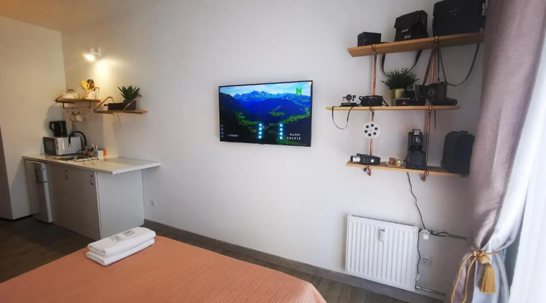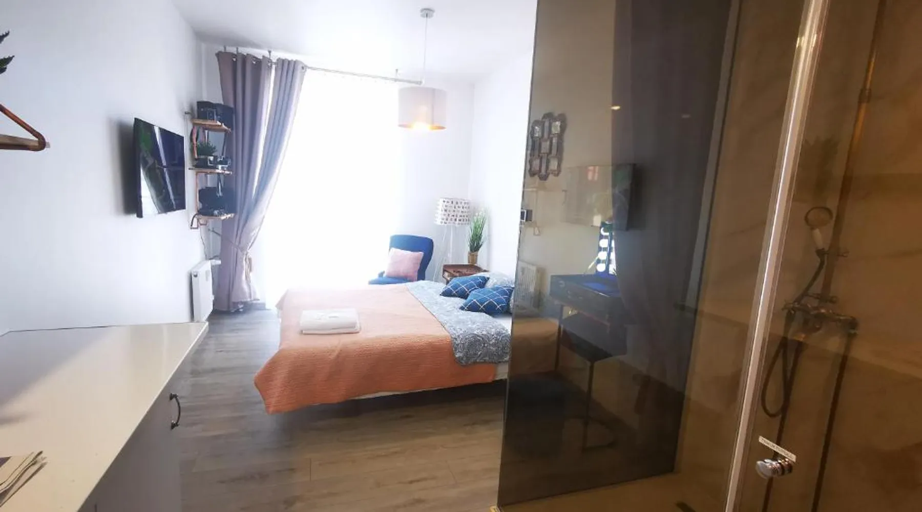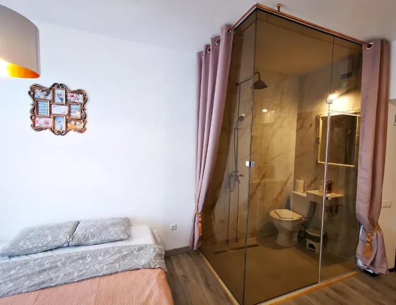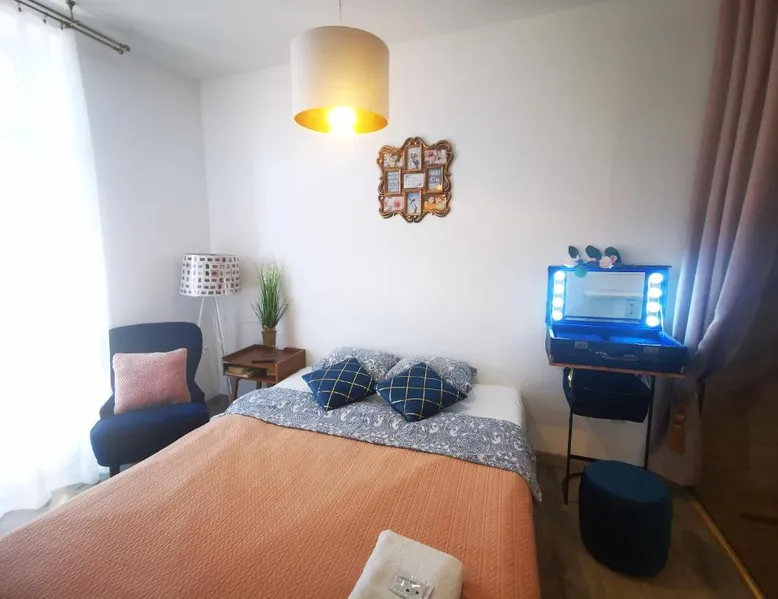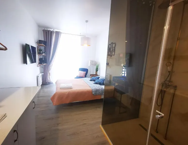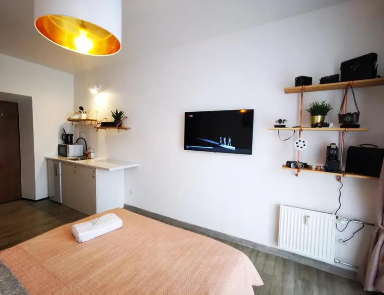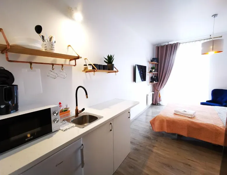 Comfortable Living Space: S14 Foto studio with balcony in Klaipėda offers a one-bedroom apartment with a balcony. The property includes a fully equipped kitchen, washing machine, and free WiFi. Convenient Facilities: Guests benefit from private check-in and check-out services, a paid on-site parking, and a private entrance. The apartment features a TV, microwave, and free toiletries. Prime Location: Located 19 mi from Palanga International Airport, the apartment is less than 0.6 mi from Homeland Farewell. Nearby attractions include Klaipėda Švyturio Arena (3 mi) and Palanga Botanical Park (17 mi). An ice-skating rink is also in the surroundings. The fully equipped kitchen has a stovetop, a refrigerator, kitchenware and a microwave. Boasting a balcony, this apartment also features a washing machine, a private entrance and a flat-screen TV with cable channels. The unit has 1 bed.