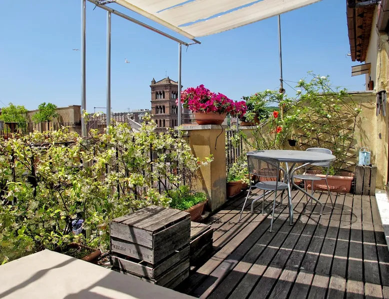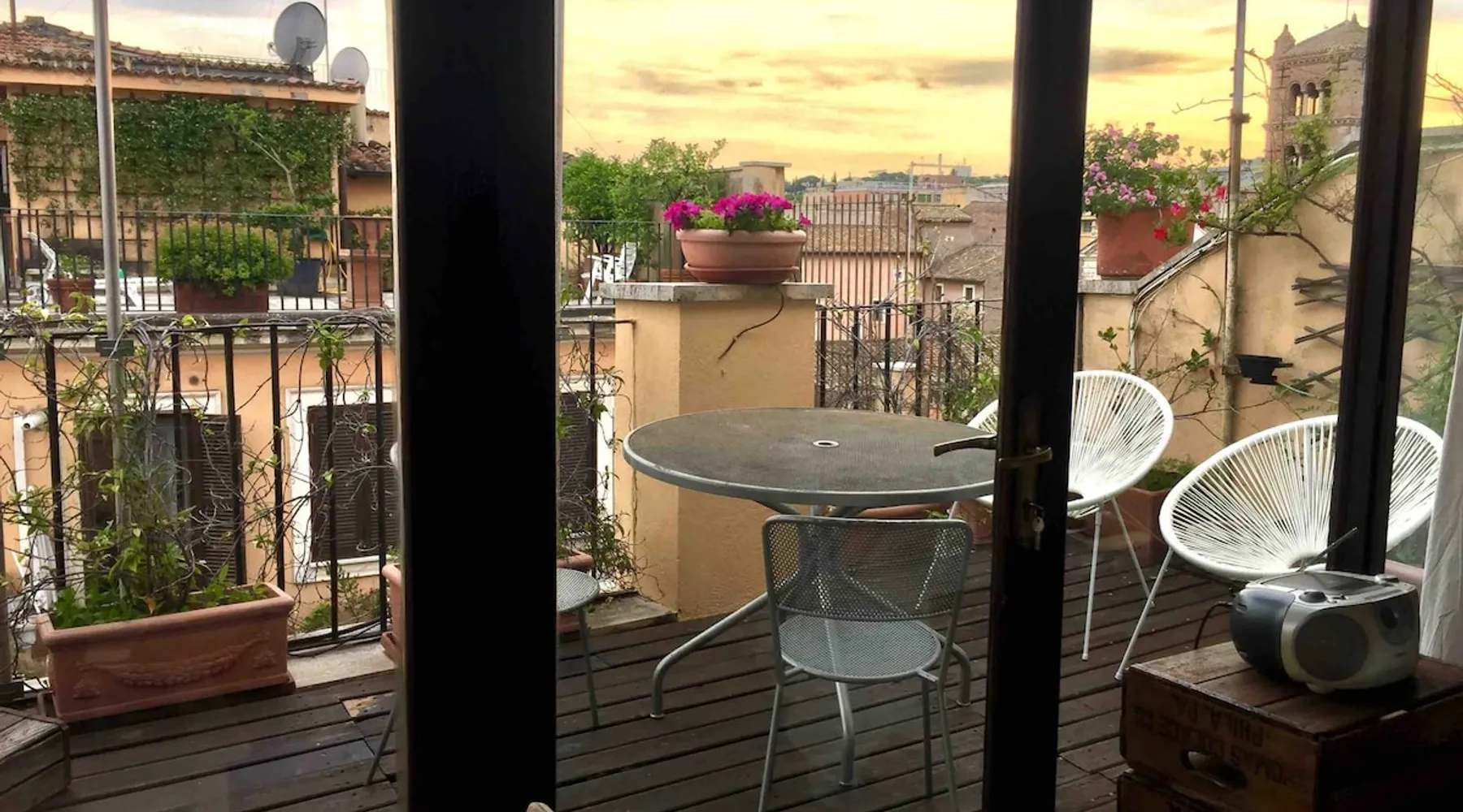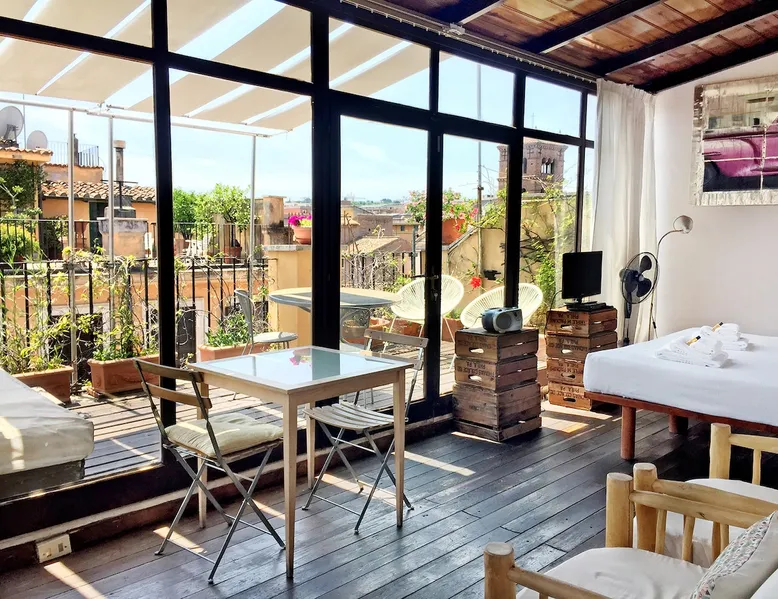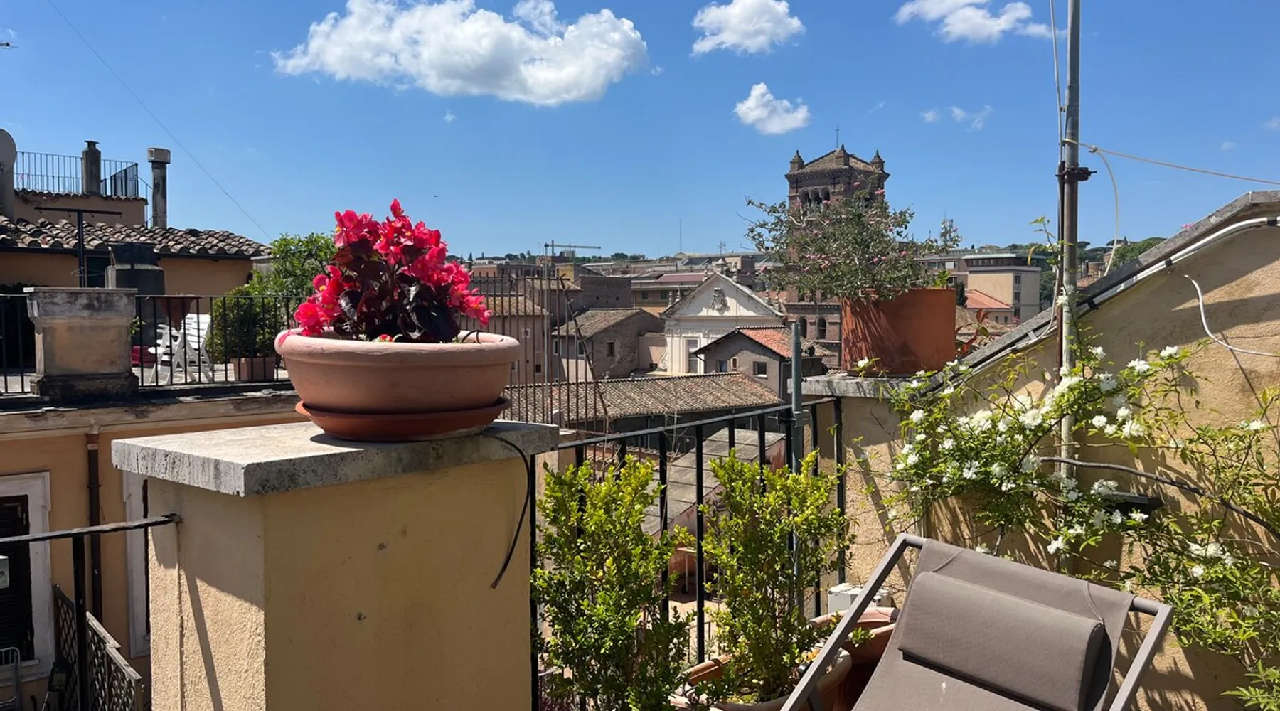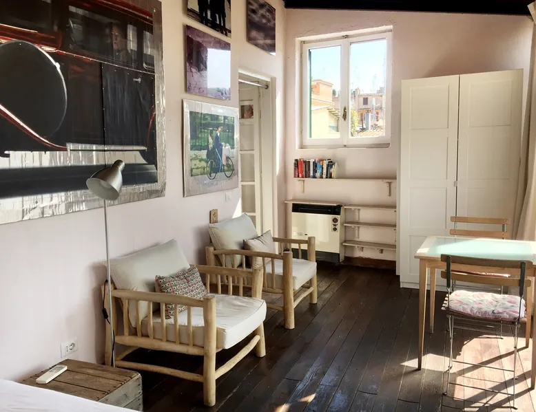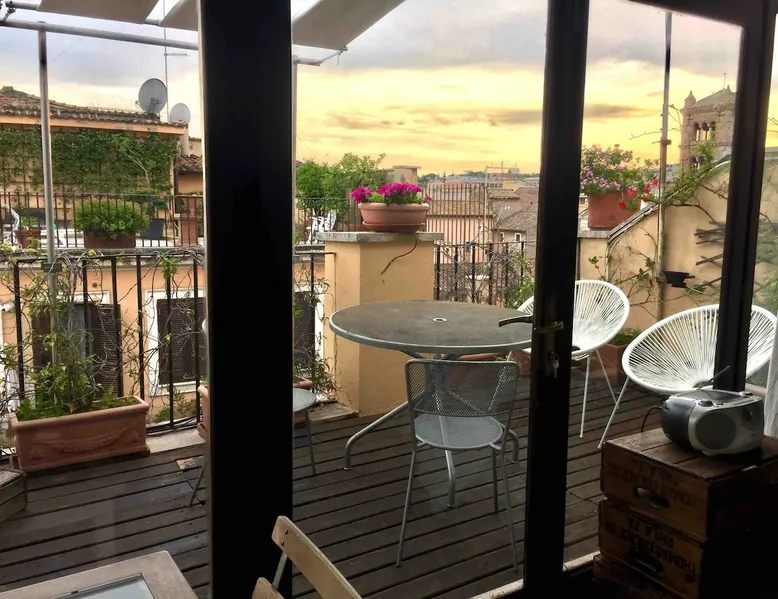 Artistic Loft, with terrace overlooking the ancient Roman rooftops! The apartment is a short walk from all the main attractions. There are bars, groceries, a bakery & grocery store and fabulous restaurants immediately near the building. The space A wonderful love nest! Artistic Loft with terrace on the ancient Roman rooftops! This spectacular, authentic artist studio has one of the best views in Trastevere. The apartment is ideal for couples who really want to spend the most romantic nights above the rooftops of ancient Trastevere. The penthouse is very bright and cozy. It’s located on the fourth floor of an old building (no elevator) in a very nice area of Trastevere. It comprise of a large living room with a queen size bed, two comfortable armchairs, a dining table, a spacious terrace with dining table, a comfortable outdoor sofa and sun loungers, a fully equipped kitchenette, a comfy entrance area, a modest bathroom, complete with toilet, sink, bidet and shower (warm water is produced by an electric water heater that contains 80 liters of hot water.) Complete with sheets, towels, kitchen utensils, pots and pans, dishes, cups and glasses, crockery, moka, kettle, toaster, microwave, hair dryer, iron and ironing board, satellite TV with international channels, WiFi internet, heating and air conditioning. Located in a romantic area of Trastevere, next to Piazza Santa Cecilia. The apartment is a short walk to all the main attractions. It is only 3 to 20 minutes walk from all the famous squares and monuments: 10 minutes from the Roman Forum and Campo de Fiori (only 600 meters away). In about 15 -20 minutes walk you can reach Piazza Navona, the Pantheon, Colosseum, Trevi Fountain and St. Peter's Basilica. The apartment is only 200 meters from the bus stop and not far from the metro (1200 meters) (which you don't need to use because you can walk or take a short bus ride to get to all the tourist locations). Nice bars, a bakery & grocery store, and fabulous restaurants are right next to the building. The location is the best you could wish for!