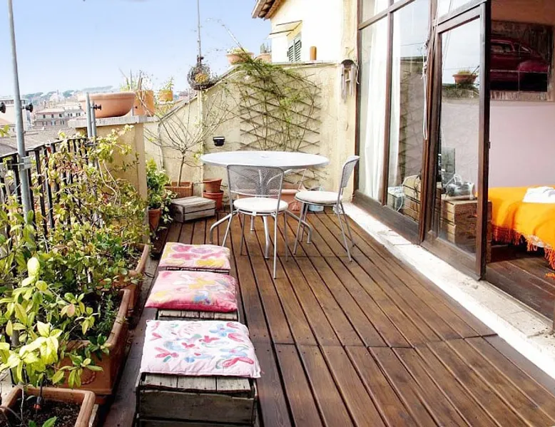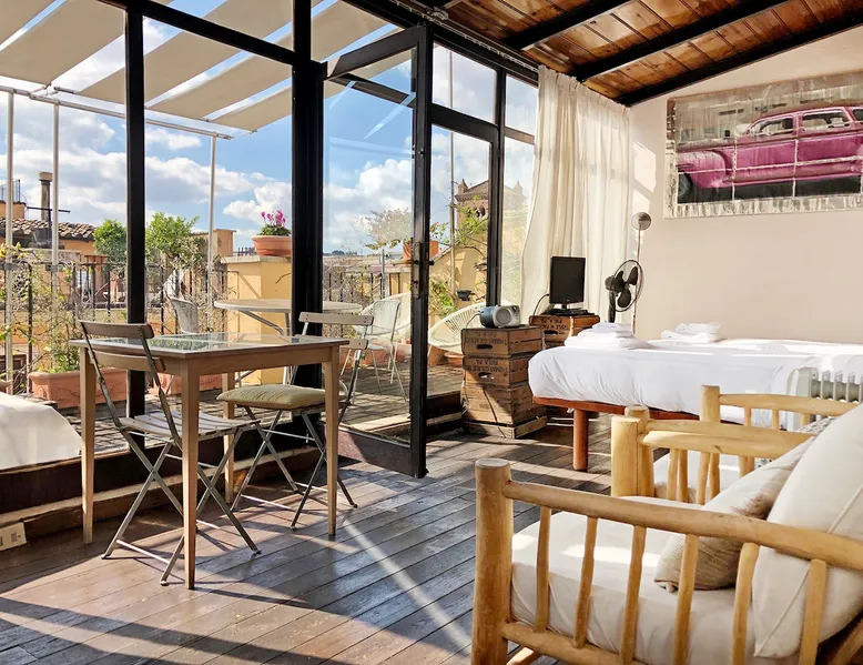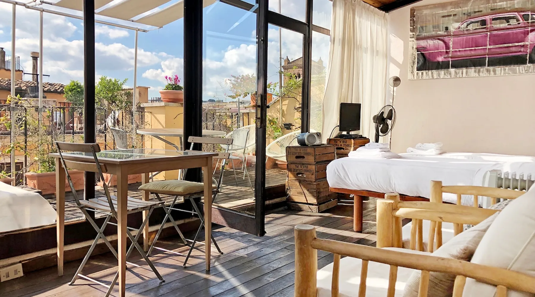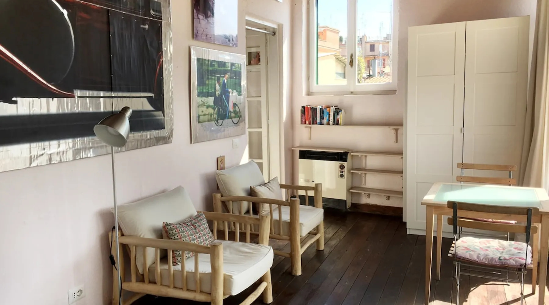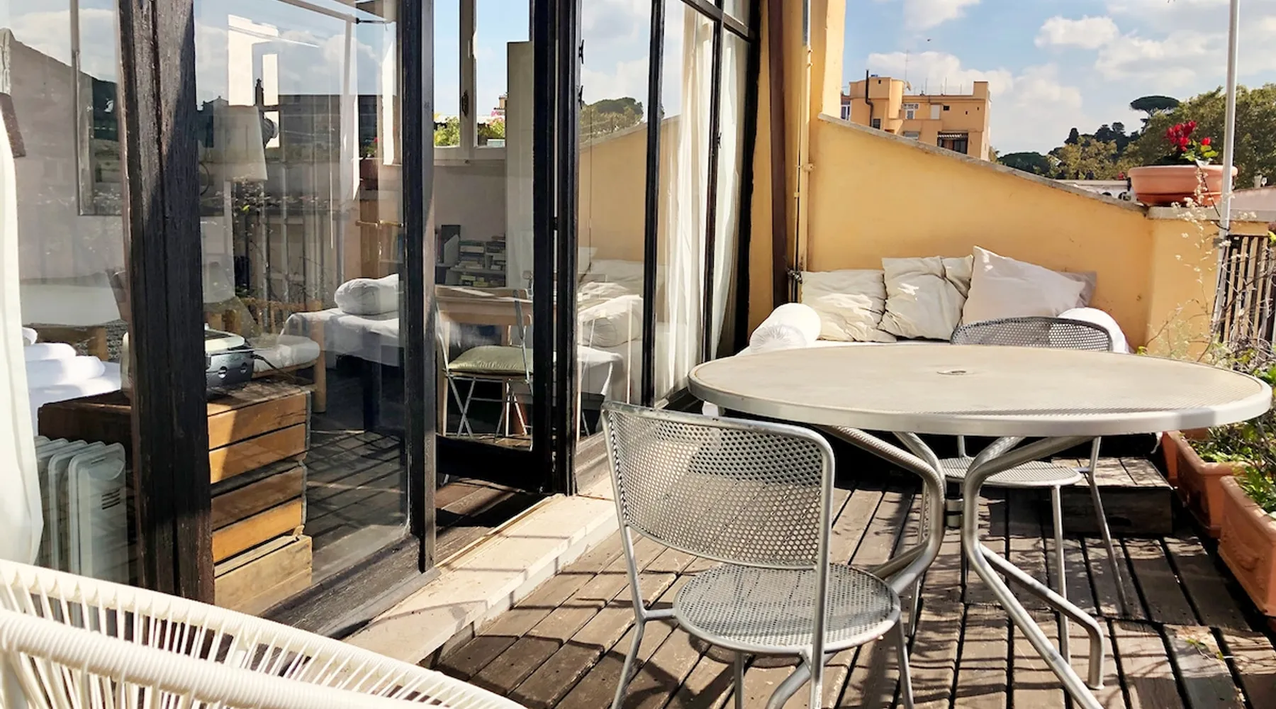 Artistic Loft, with terrace overlooking the ancient Roman rooftops! The apartment is a short walk from all the main attractions. There are bars, groceries, a bakery & grocery store and fabulous restaurants immediately near the building. The space A wonderful love nest! Artistic Loft with terrace on the ancient Roman rooftops! This spectacular, authentic artist studio has one of the best views in Trastevere. The apartment is ideal for couples who really want to spend the most romantic nights above the rooftops of ancient Trastevere. The penthouse is very bright and cozy. It’s located on the fourth floor of an old building (no elevator) in a very nice area of Trastevere. It comprise of a large living room with a queen size bed, two comfortable armchairs, a dining table, a spacious terrace with dining table, a comfortable outdoor sofa and sun loungers, a fully equipped kitchenette, a comfy entrance area, a modest bathroom, complete with toilet, sink, bidet and shower (warm water is produced by an electric water heater that contains 80 liters of hot water.) Complete with sheets, towels, kitchen utensils, pots and pans, dishes, cups and glasses, crockery, moka, kettle, toaster, microwave, hair dryer, iron and ironing board, satellite TV with international channels, WiFi internet, heating and air conditioning. Located in a romantic area of Trastevere, next to Piazza Santa Cecilia. The apartment is a short walk to all the main attractions. It is only 3 to 20 minutes walk from all the famous squares and monuments: 10 minutes from the Roman Forum and Campo de Fiori (only 600 meters away). In about 15 -20 minutes walk you can reach Piazza Navona, the Pantheon, Colosseum, Trevi Fountain and St. Peter's Basilica. The apartment is only 200 meters from the bus stop and not far from the metro (1200 meters) (which you don't need to use because you can walk or take a short bus ride to get to all the tourist locations). Nice bars, a bakery & grocery store, and fabulous restaurants are right next to the building. The location is the best you could wish for!