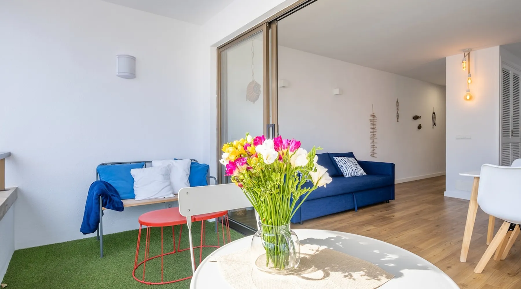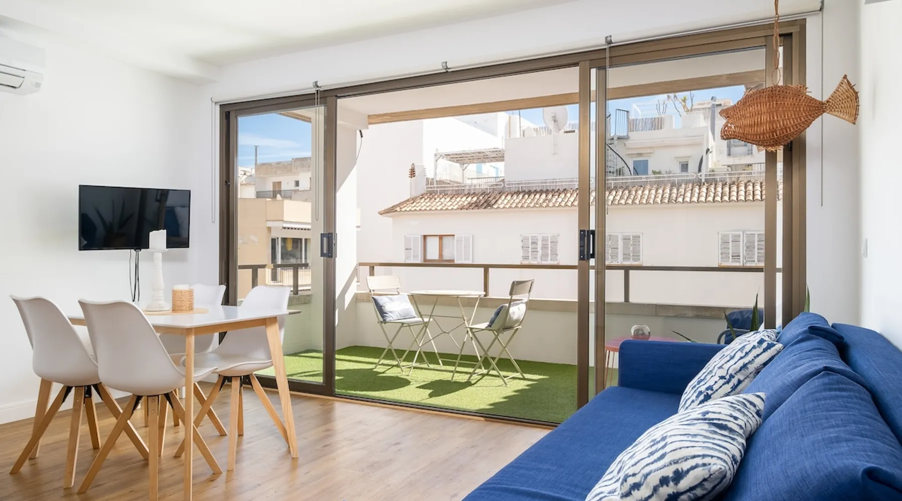 The apartment in Puerto Pollensa is just 50 metres from the sandy beach. Situated on the 2nd floor the apartment offers a spacious sun terrace, a modern living/dining room with open plan kitchen, bathroom and a bedroom. There is a bicycle rental on the ground floor. Beach bars, restaurants and shops are just around the corner, mainly by the sea. The surf and sailing school Sail & Surf offers courses for different age groups. The space Apartment Mateo is located just 50 metres from the sandy beach of Puerto Pollensa. Beach bars, restaurants and shops are just around the corner, mainly by the sea. The surf and sailing school Sail & Surf offers courses for different age groups. If you need peace and quiet and a relaxing holiday to unwind, Apartment Mateo is the perfect holiday accommodation. You can easily do without a car here. The bird watching centre La Gola is right in the neighbourhood. The perfect holiday flat on Mallorca, in Puerto Pollença for families, singles and couples. Guest access The entire flat is exclusively available to guests. Other things to note On the same floor there is another flat with the same facilities. On the 1st floor there is another flat with 2 double bedrooms. For long-term rentals of one month or more from December to the end of March - at reduced prices - the price does not include intermediate cleaning. Registration details Spain – National registration number ESFCTU0000070300069549010000000000000000000000VT/2467