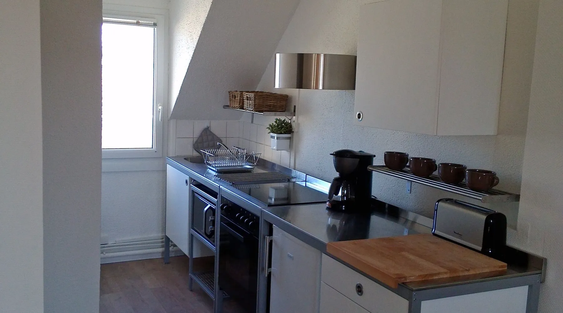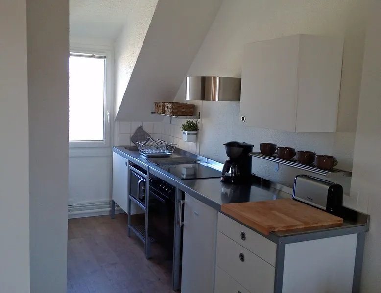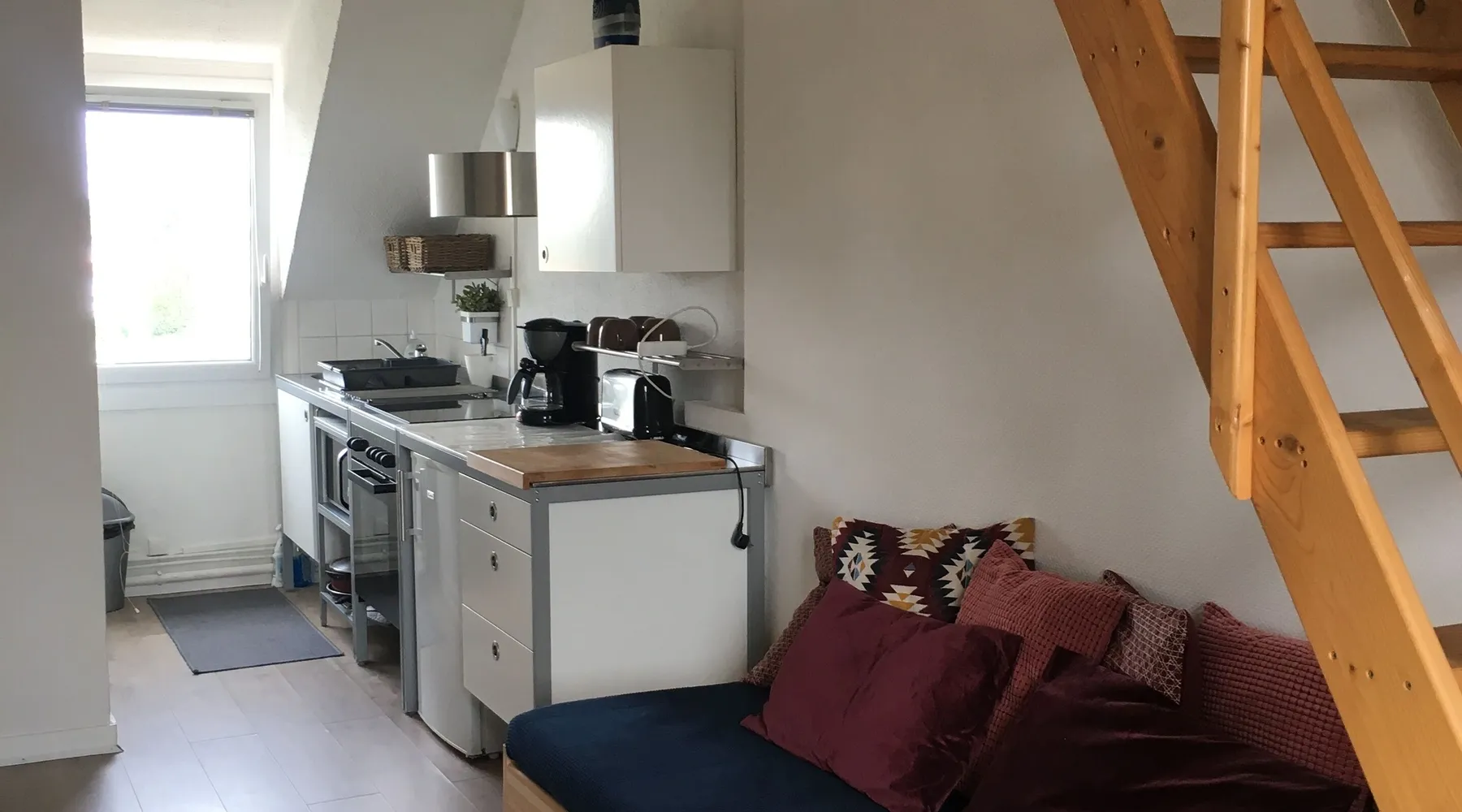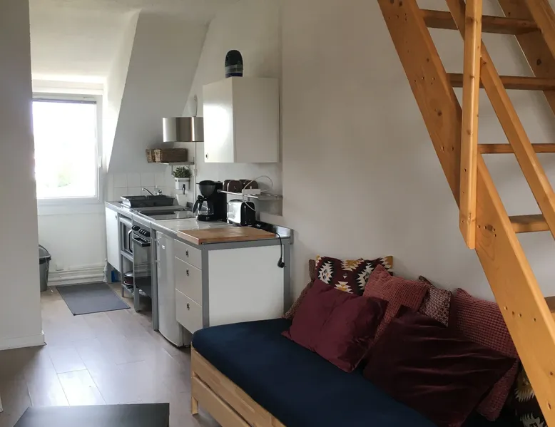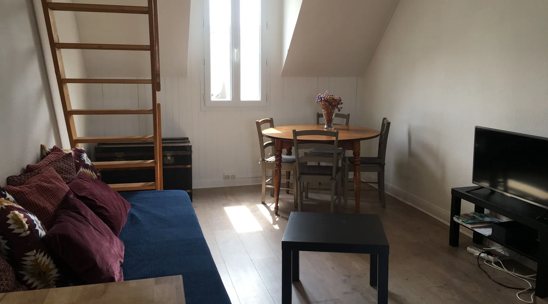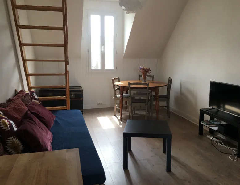 Description: -Fitted kitchen opening onto main room (4 ceramic hobs, traditional oven, microwave, extractor hood, fridge with small freezer, coffee maker, toaster) -Living-dining room with convertible sofa, round table with 4 chairs, coffee table and TV 80 cm -Shower room with wc -Large closet -Fitted roofs with sleeping 2 people -Cave and local bike Situation: -2nd and last floor of a small old building (without elevator) - 50 m from the covered market of La Baule and all food shops -150 m from La Baule shopping avenue (restaurants, bars, cinema, etc.) -300 m from the TGV station - 5-6 minutes walk from the beach