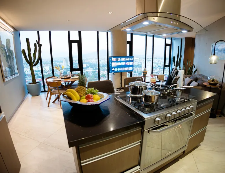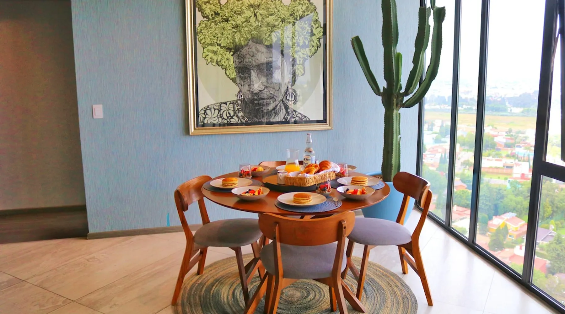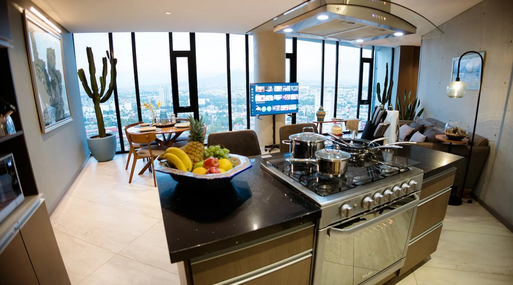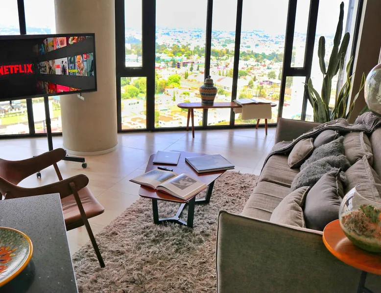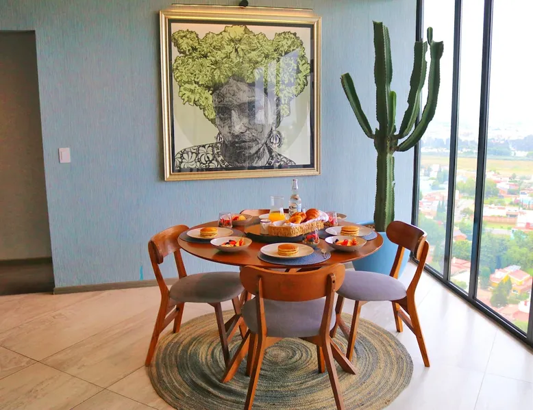 Wake up to a unique volcano landscape from the 18th floor. A spacious loft that blends style and comfort—ideal for families or longer stays. Features comfortable Queen beds and accommodates up to 6 guests (2 people each bed). Fully equipped kitchen, electric blinds, and high-speed Wi-Fi. 24/7 gym, 360° rooftop, covered parking, and a pet-friendly building with on-site guard and 24/7 security. Superhost with 4 years of outstanding reviews. The space 🌋 Wake up to volcano views Enjoy sunrises and sunsets from the 18th floor with completely unobstructed views. Every room offers a beautiful panorama of Puebla and Cholula. 🏢 Modern, bright loft Spaces designed for comfort and relaxation in a new building with excellent natural light. 🛏 Private spaces 3 spacious bedrooms with Queen beds and modern furniture Crib available Pet-friendly (please inform us if bringing more than one pet) 2.5 bathrooms conveniently located by the bedrooms Electric blackout blinds for restful sleep or natural daylight 🎬 Entertainment & comfort 55” Smart TV, high-speed Wi-Fi ideal for remote work, video calls, and streaming. Portable air conditioner for added comfort. 🍳 Fully equipped kitchen Stove, oven, microwave, coffee maker, kettle, toaster, dishes, glasses, and utensils. 🛡 Safety & privacy 24/7 security with cameras in common areas and on-site security personnel. Smart lock with personalized code and emergency exit access. 🏢 Building amenities Rooftop garden with 360° views, game room, library, and kids’ area. Gym with modern equipment. 📍 Prime location Quick access to the airport and highway without crossing the city. Located across from Centro Mayor (shops, banks, and supermarket). 5 min to Cholula, 10 min to Angelópolis, 13 min to downtown Puebla, 25 min to Val’Quirico and 30 min to Africam Safari. Guest access 🔑 APARTMENT ACCESS 📲 Access will be sent via a QR code—no keys needed. 🚪 With this QR, you’ll be able to enter from the building entrance elevator directly to the apartment. 📬 We’ll send the code before your arrival, and it will give you access to: 🌇 the rooftop 🏋️ the gym, 🧸 and the kids’ playroom. Other things to note With direct access to the Mexico–Puebla highway, you can quickly reach Angelópolis, Cholula, or Val’quirico. Ideal for those seeking fast mobility— the airport is just minutes away with no need to cross city traffic. Also close to shopping centers, hospitals, and local universities. **ROOFTOP, PATIO, & GYM** You will have access to these amenities, but only for visiting; private events are not allowed. ** ROOFTOP Don’t miss out on the spectacular views from the 25th-floor rooftop—360-degree views of all of Puebla. All access is by prior reservation and depends on the administration. ** PATIO: There is a fire pit area that’s perfect for enjoying some fresh air and having a nice afternoon with the people staying in the apartment. Please ask us beforehand if you’d like to use the fire pit, as we need to prepare it in advance for your stay (there is an additional cost, but it’s just for the gas, which is very inexpensive). ** GYM: with a treadmill, stair climber, a set of weights, and a leg extension and chest machine. Toilet guidance. In Mexico, many buildings have sensitive plumbing. To avoid blockages, please do not throw toilet paper into the toilet. We provide bins next to each toilet for paper disposal. This helps keep everything running smoothly and prevents plumbing issues. ** WE OFFER AIRPORT TRANSFER SERVICES.** This seasonal setup was created to celebrate Mexico’s Día de Muertos — a temporary touch to honor local tradition.