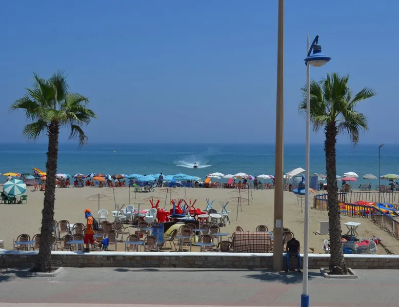 Nice beach front apartment, with a great view of the Mediterranean sea. Clean and modern with open plan kitchen, light and airy bedrooms. Close to the town centre. Perfect for small families. The space We have a nice open plan kitchen towards the sitting room Nice comfortable comer sofa from a long day rest. Also clean balcony from a great view directly towards the beach Rooms : Double bed Single beds either side of the room Each room with tinted window Guest access The space below your balcony is not in use