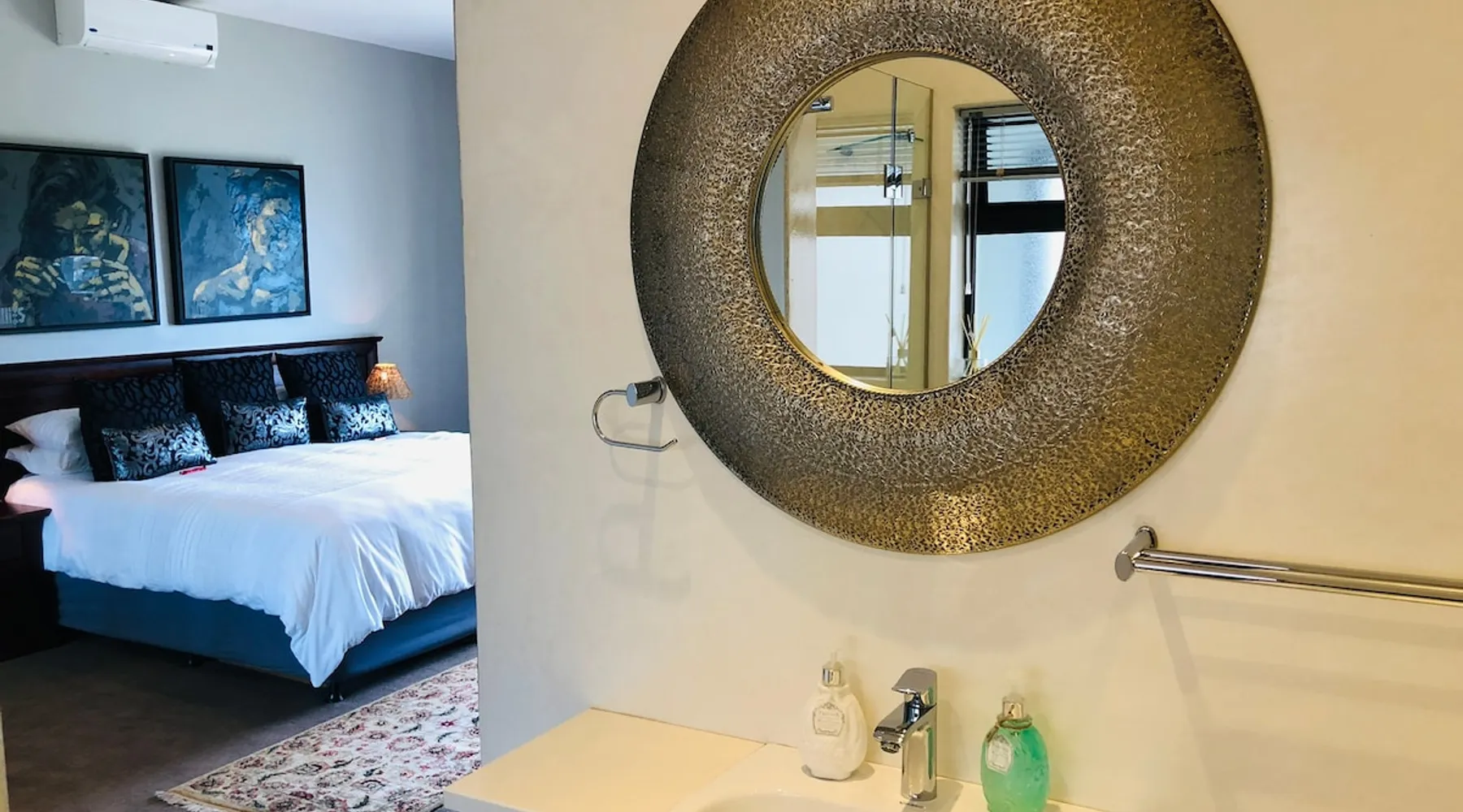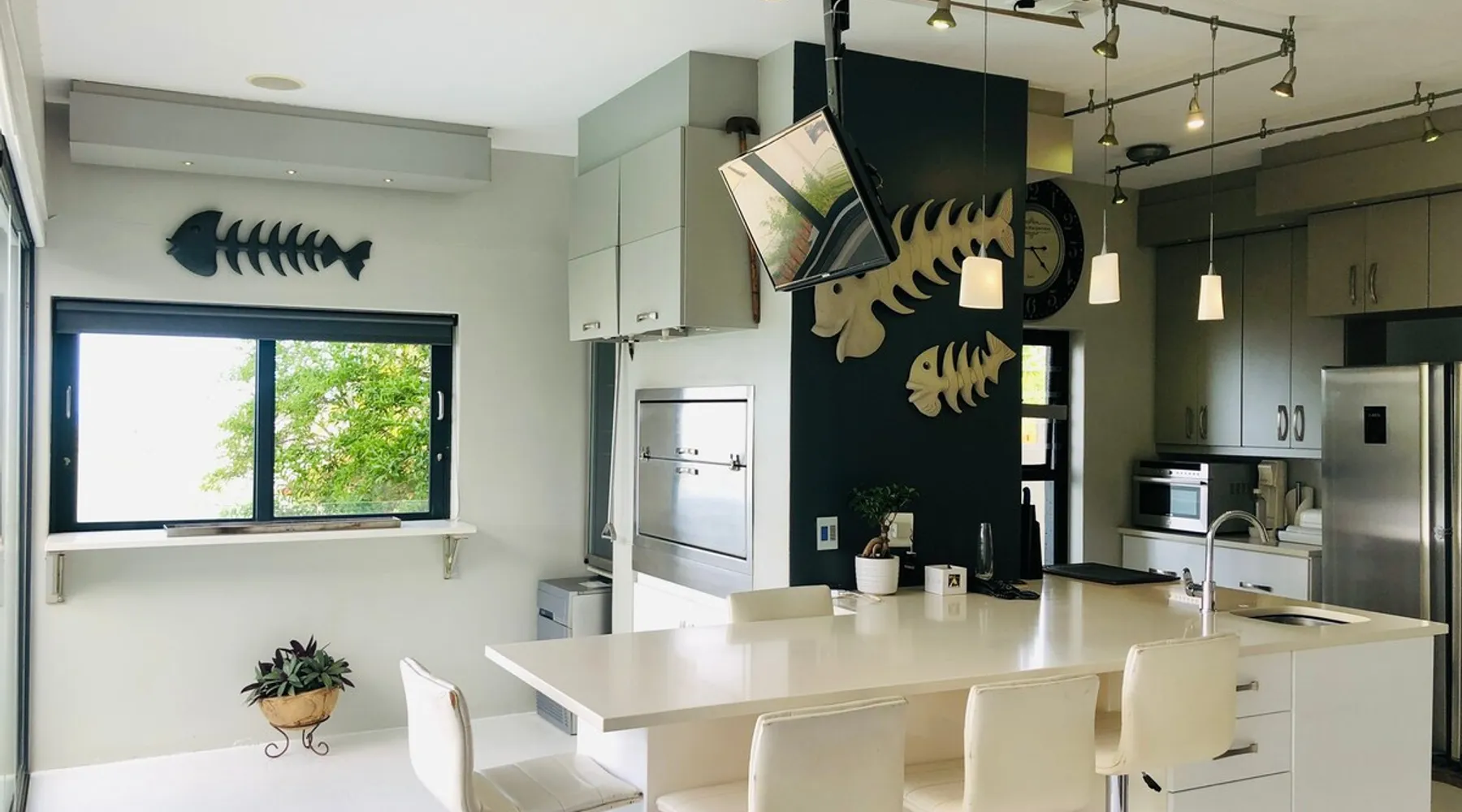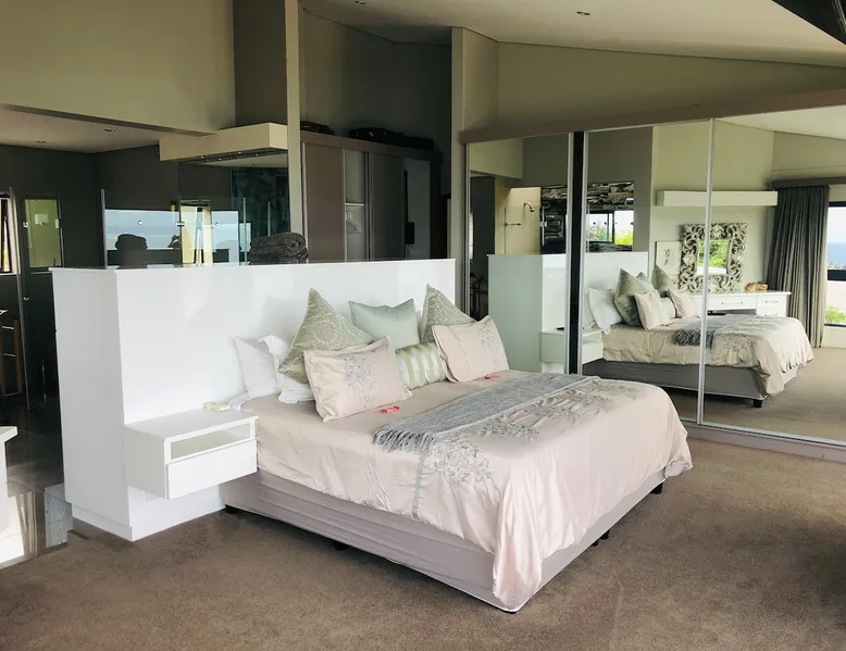 overlooking This property offers a double garage and shaded parking. You enter into an open concept area with 2 living rooms, dining room, kitchen, scullary, pantry and build-in braai area that flows out to the pool area with frameles glass stack doors. On this level are 2 guest toilets and a spacious guest room with full ensuite bedroom. Upstairs: lovely mainsuite with full ensuite, double guest bedroom with ensuite, gym, single bedroom and another bedroom withh kingsize bed that share a bathroom, large entertainment area with pool table. In the garden are a jungle gym, trampoline and places to just relax in peace. The entire villa Quiet safe upmarket neighbourhood