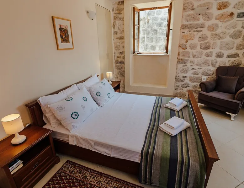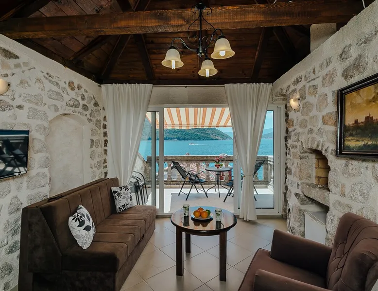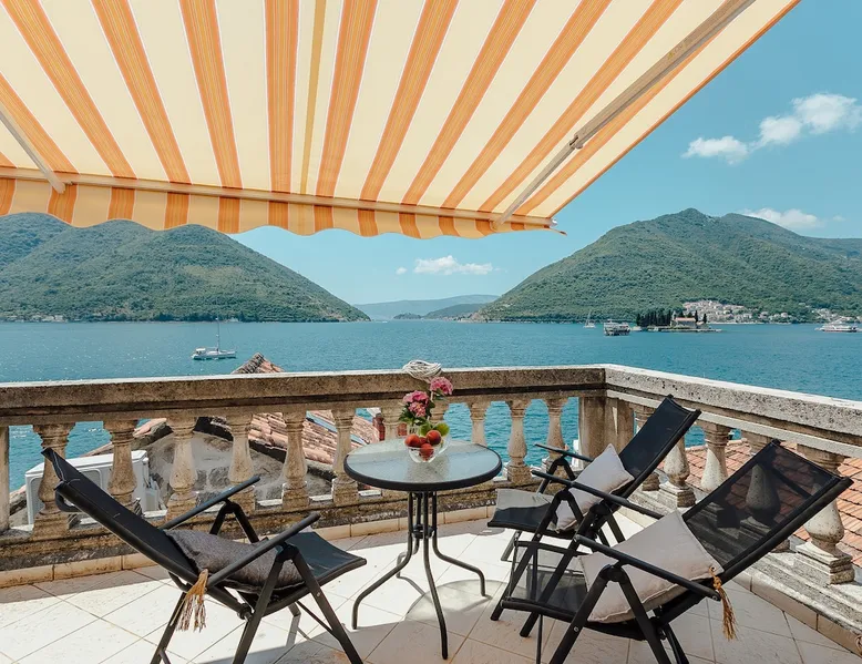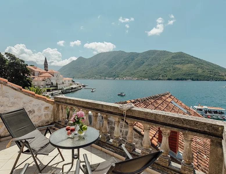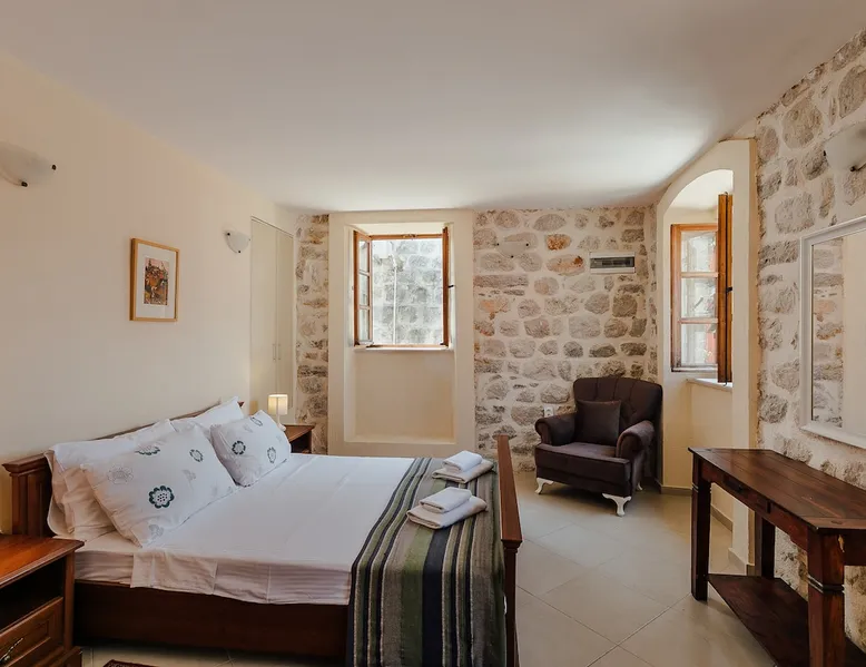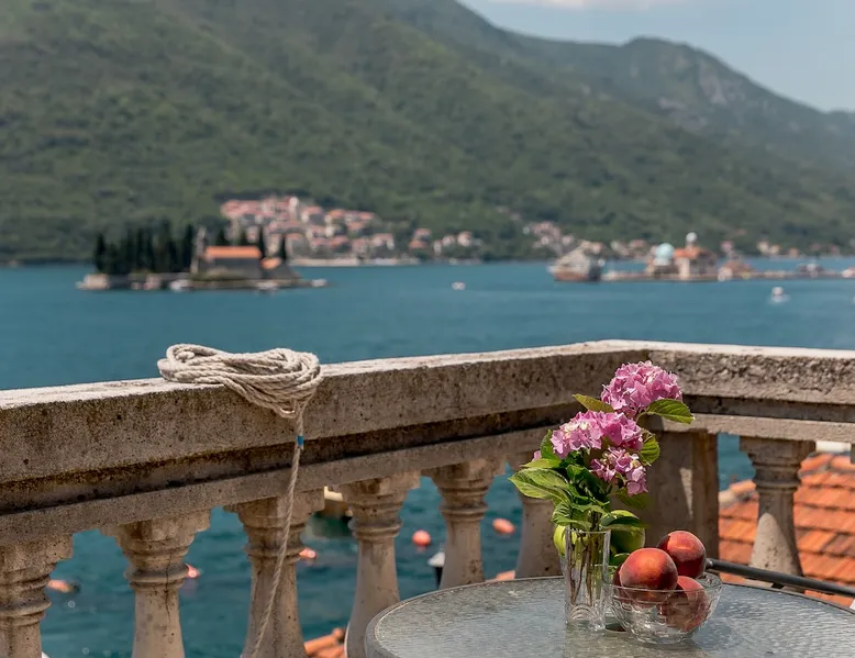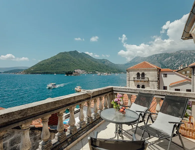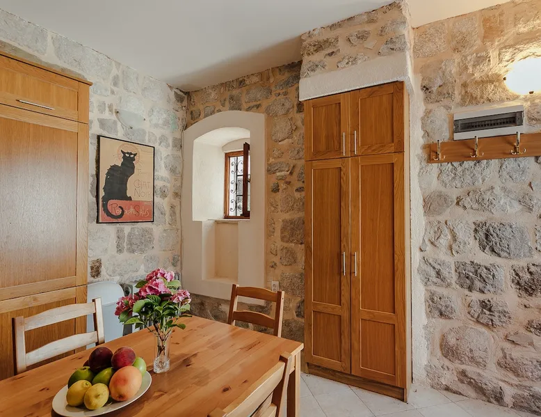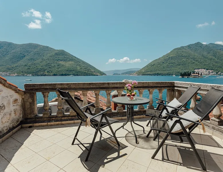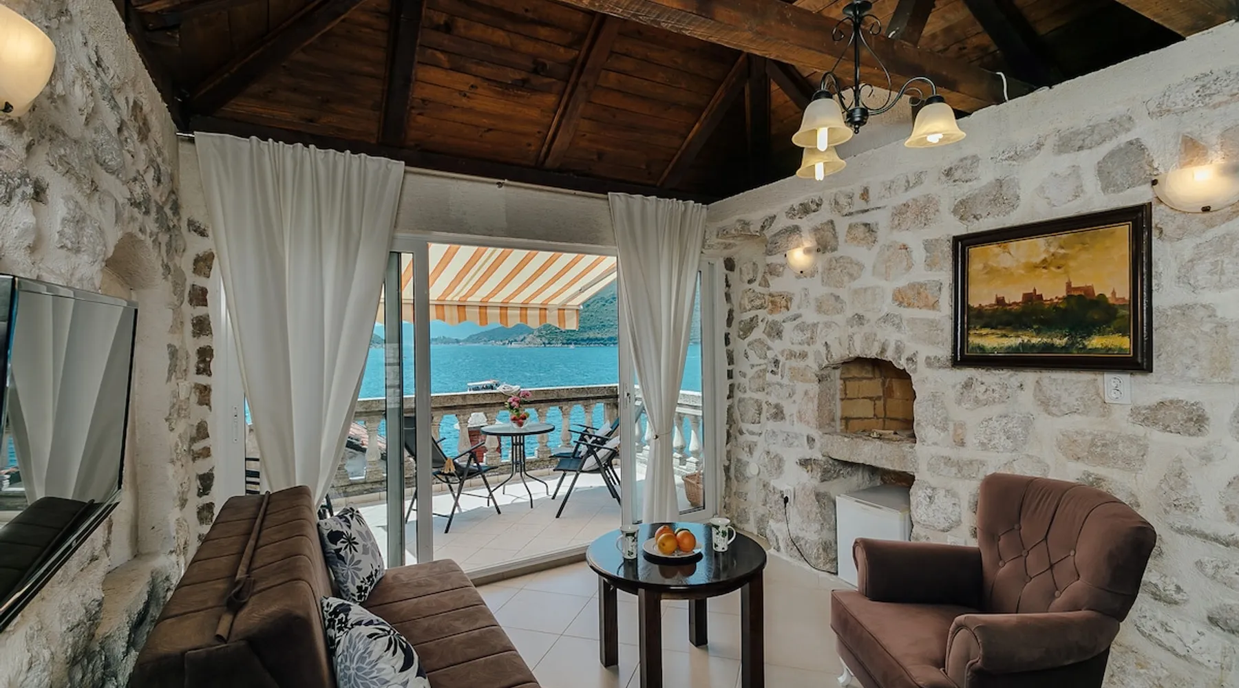 The house which is literally ten steps away from the sea. Inside the spiral staircase leads to the top floor living area, which lead to an open terrace with a view looking directly to the Island ‘lady of the rock’ Public transport: bus service between Kotor and Risan The nearest airport is Tivat in Montenegro (about half hour drive from Perast) There are many restaurants along the Riviera. The space You enter the house from the main town sea Riviera just past the museum building approaching from the Risan parking end. There is a small but famous Orthodox church next to the house. The main entrance door leads into the kitchen and dining area with original stone walls, stone tiled floor with a utility room behind and under the stone steps. This includes a washing machine, dryer, sink unit, and storage for cleaning materials. The kitchen dining area contains a fitted kitchen with hob, oven, dishwasher large integrated fridge freezer and sink set in a polished granite worktop; and dining table with seating for four comfortably but six at a push. Straight ahead are the original stone spiral steps to the first floor with purpose designed alcove with background light. There are two fold away directors’ chairs which can be used to sit outside the house and enjoy the quiet square used by other local residents and shaded with a large palm tree. The square is set down slightly from the Riviera road which gives it a discrete and private feel. From the square three steps takes you to the ponta and sea From the first floor landing is a fully fitted family shower room with stone tile floor and walls which contains shower, wall mounted WC, and granite worktop mounted WHB and vanity cupboard under. Set in the wall is a tall utility cupboard and window. Ahead is the second double bedroom with twin beds with bedside table and lamp. A large fitted cupboard unit containing the hot water boiler for both shower/bathrooms gives ample space for clothes storage. The original stone walls are a quiet backdrop for the period design dressing table chair and mirror. A period Persian rug lies between the twin beds. The spiral staircase continues to the second floor now with a window view of the side of the church and rises into the landing leading directly to the master double bedroom. Within the bedroom access to fully fitted bathroom with stone tiled walls and floor bath/shower, WC and granite worktop mounted WHB and vanity cupboard under. The bedroom contains a period bed with two bedside tables and lamps. The original stone walls are a quiet backdrop for the period design dressing table chair and mirror. Two period Persian rugs lay either side of the bed. The spiral staircase leads to the top floor living area which has maintained the original timber pitched roof and stone walls. The large sliding panoramic glass doors lead to a small stone floor open terrace with stunning view looking directly to the Island ‘lady of the rock’ and famous entrance to the Boka Kotorski Bay. There is an outside weather table and chairs with retractable overhead awning. Interestingly, an external drop-rope and pulley, is available for easy access to the ground kitchen to haul up and down teas and meals and anything else. Within the enclosed living room is a double sofa and two comfortable arm chairs beside an open high level fireplace. A small fridge is installed in the recess under the fireplace. The living room is serviced with internet access and television with many channels available. The area is supported with a good sized table on a period Persian rug All bedrooms, the second floor sitting room, and ground floor are air conditioned and these units can also provide warm air heating as well as the wood burning top floor fireplace. There is an intercom system on each level allowing access to the front door. A child’s cot is available. Guest access whole house is available for occupation Other things to note Parking: Perast has been assigned as a non-drive through zone for years now and only properties with private parking have parking places secured. Tourists and visitors can park at the end of each side of the village. The Risan side that is very close to the house is owned by a Conte Hotel. That is the side guests should park if possible since it is very close to the house. The parking charge is changing every year.