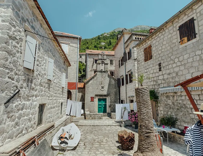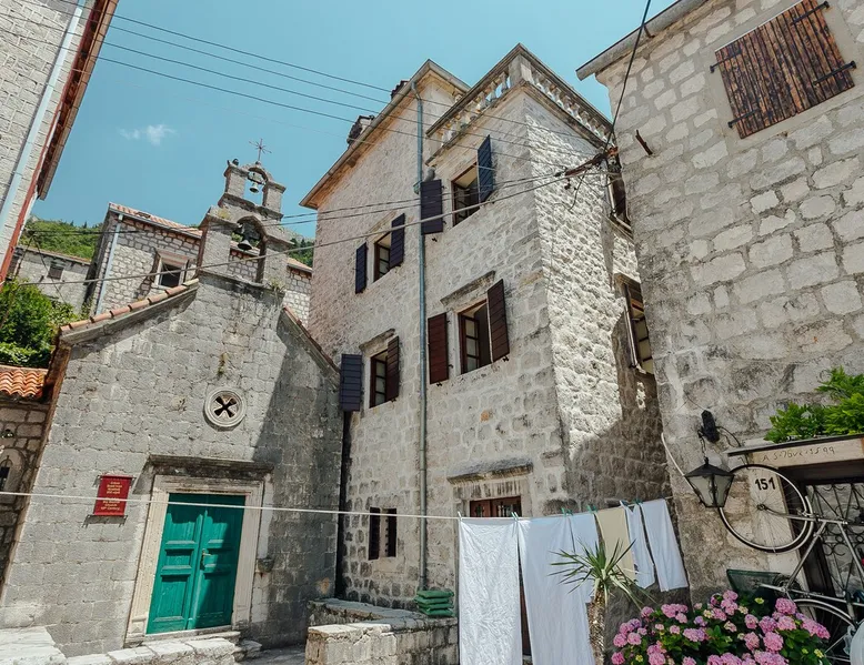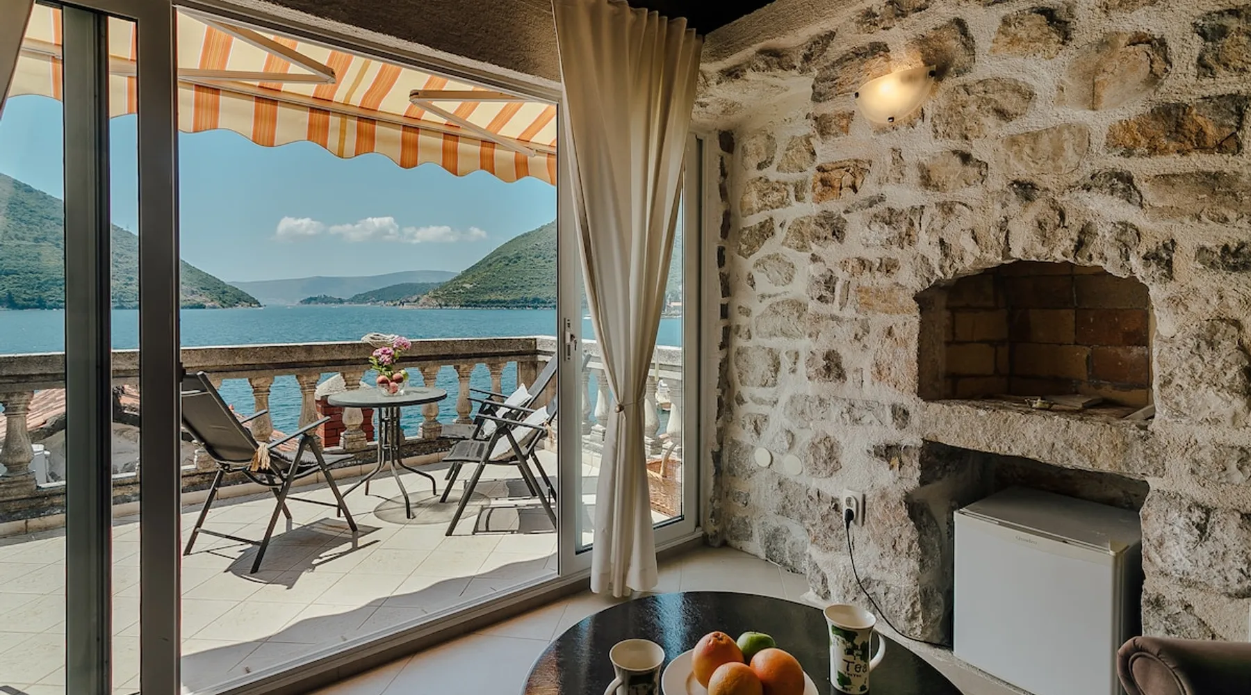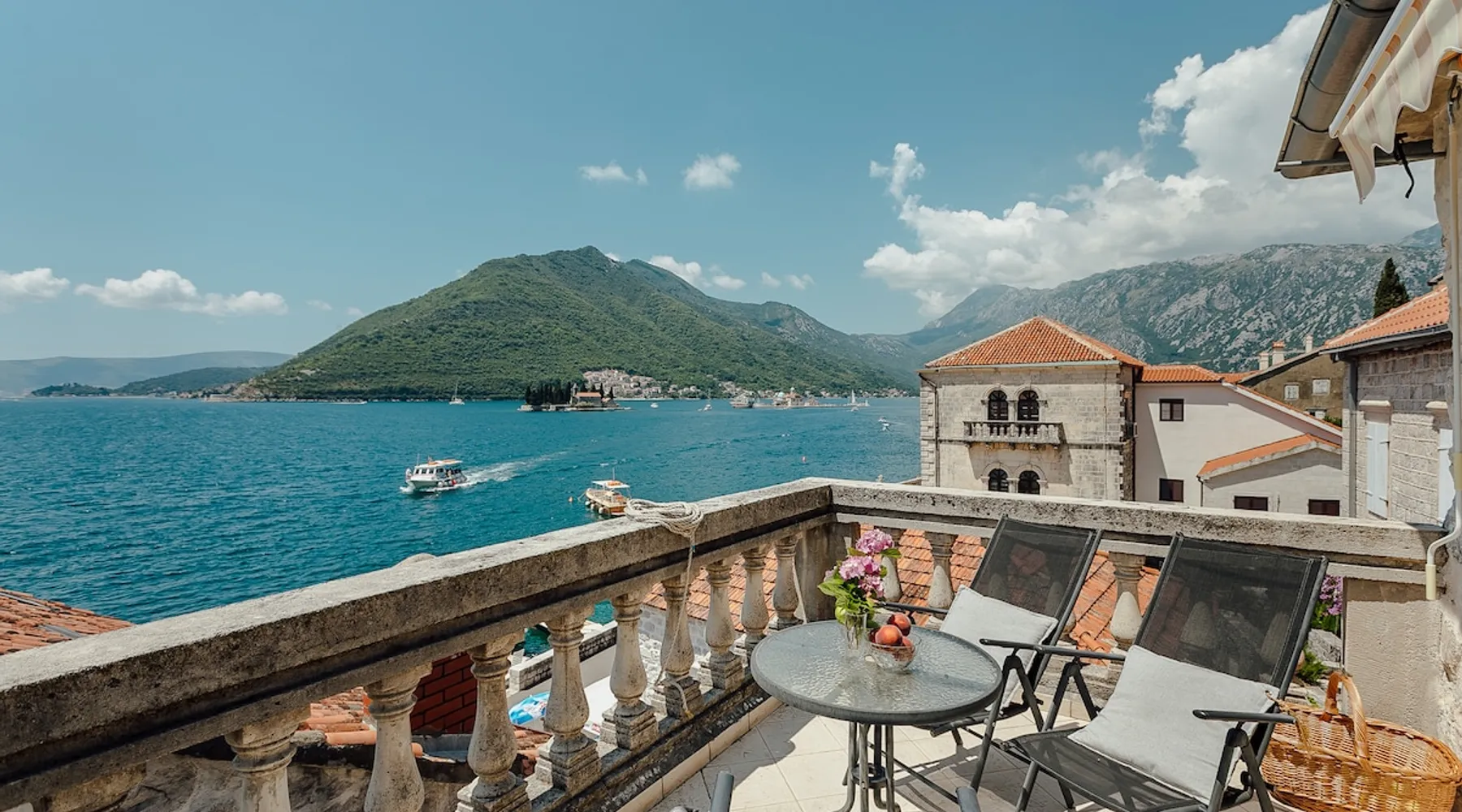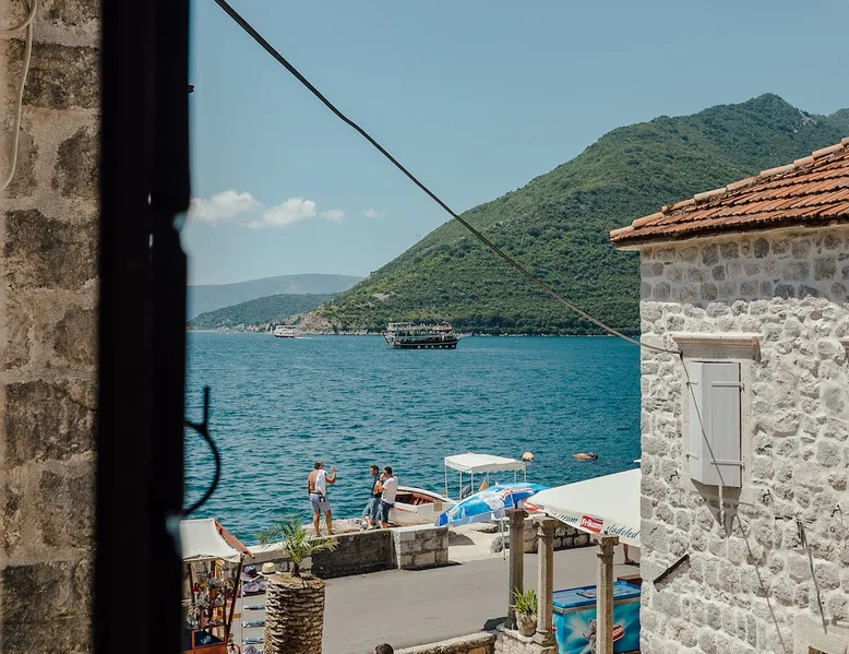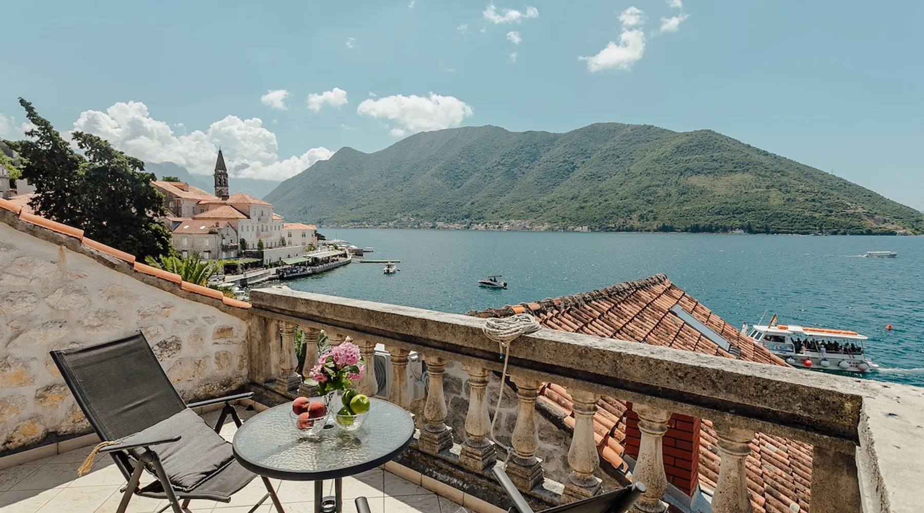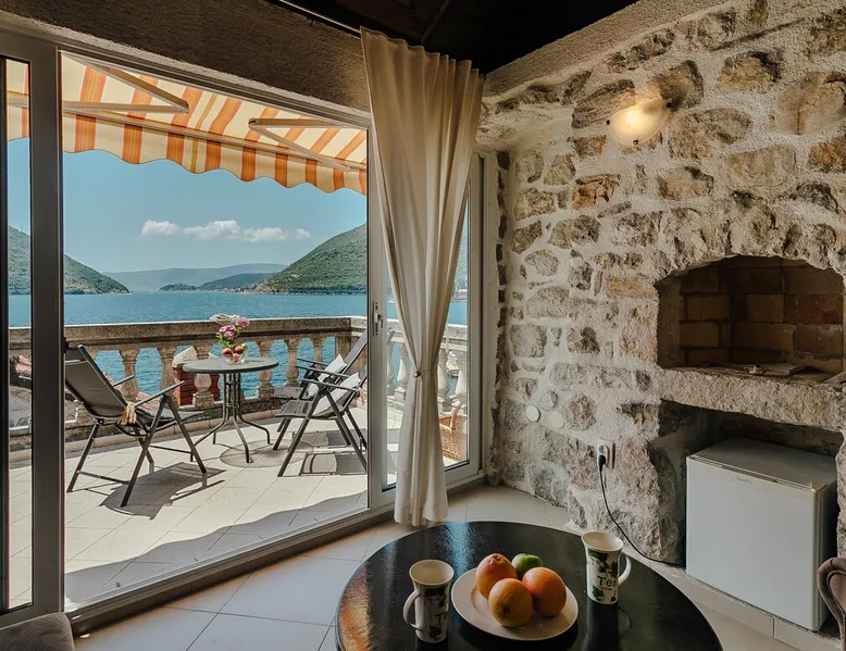The house which is literally ten steps away from the sea. Inside the spiral staircase leads to the top floor living area, which lead to an open terrace with a view looking directly to the Island ‘lady of the rock’ Public transport: bus service between Kotor and Risan The nearest airport is Tivat in Montenegro (about half hour drive from Perast) There are many restaurants along the Riviera. The space You enter the house from the main town sea Riviera just past the museum building approaching from the Risan parking end. There is a small but famous Orthodox church next to the house. The main entrance door leads into the kitchen and dining area with original stone walls, stone tiled floor with a utility room behind and under the stone steps. This includes a washing machine, dryer, sink unit, and storage for cleaning materials. The kitchen dining area contains a fitted kitchen with hob, oven, dishwasher large integrated fridge freezer and sink set in a polished granite worktop; and dining table with seating for four comfortably but six at a push. Straight ahead are the original stone spiral steps to the first floor with purpose designed alcove with background light. There are two fold away directors’ chairs which can be used to sit outside the house and enjoy the quiet square used by other local residents and shaded with a large palm tree. The square is set down slightly from the Riviera road which gives it a discrete and private feel. From the square three steps takes you to the ponta and sea From the first floor landing is a fully fitted family shower room with stone tile floor and walls which contains shower, wall mounted WC, and granite worktop mounted WHB and vanity cupboard under. Set in the wall is a tall utility cupboard and window. Ahead is the second double bedroom with twin beds with bedside table and lamp. A large fitted cupboard unit containing the hot water boiler for both shower/bathrooms gives ample space for clothes storage. The original stone walls are a quiet backdrop for the period design dressing table chair and mirror. A period Persian rug lies between the twin beds. The spiral staircase continues to the second floor now with a window view of the side of the church and rises into the landing leading directly to the master double bedroom. Within the bedroom access to fully fitted bathroom with stone tiled walls and floor bath/shower, WC and granite worktop mounted WHB and vanity cupboard under. The bedroom contains a period bed with two bedside tables and lamps. The original stone walls are a quiet backdrop for the period design dressing table chair and mirror. Two period Persian rugs lay either side of the bed. The spiral staircase leads to the top floor living area which has maintained the original timber pitched roof and stone walls. The large sliding panoramic glass doors lead to a small stone floor open terrace with stunning view looking directly to the Island ‘lady of the rock’ and famous entrance to the Boka Kotorski Bay. There is an outside weather table and chairs with retractable overhead awning. Interestingly, an external drop-rope and pulley, is available for easy access to the ground kitchen to haul up and down teas and meals and anything else. Within the enclosed living room is a double sofa and two comfortable arm chairs beside an open high level fireplace. A small fridge is installed in the recess under the fireplace. The living room is serviced with internet access and television with many channels available. The area is supported with a good sized table on a period Persian rug All bedrooms, the second floor sitting room, and ground floor are air conditioned and these units can also provide warm air heating as well as the wood burning top floor fireplace. There is an intercom system on each level allowing access to the front door. A child’s cot is available. Guest access whole house is available for occupation Other things to note Parking: Perast has been assigned as a non-drive through zone for years now and only properties with private parking have parking places secured. Tourists and visitors can park at the end of each side of the village. The Risan side that is very close to the house is owned by a Conte Hotel. That is the side guests should park if possible since it is very close to the house. The parking charge is changing every year.