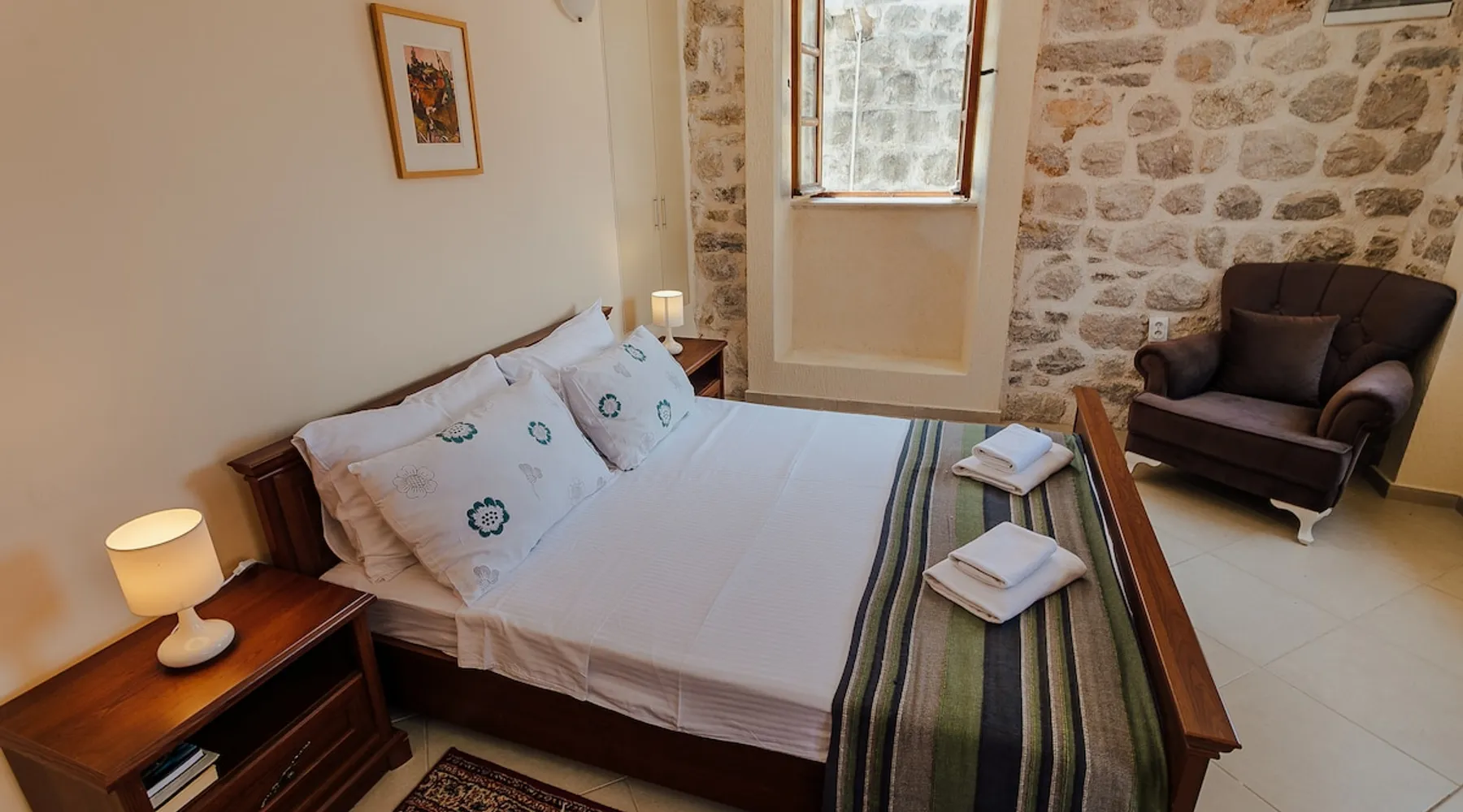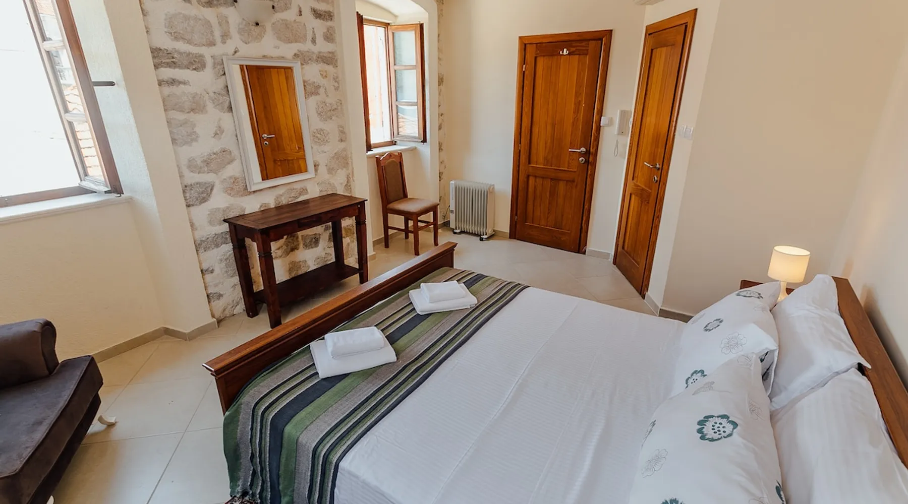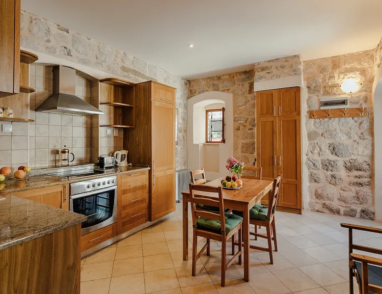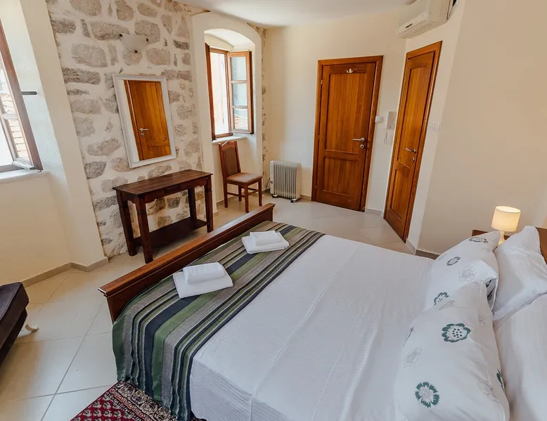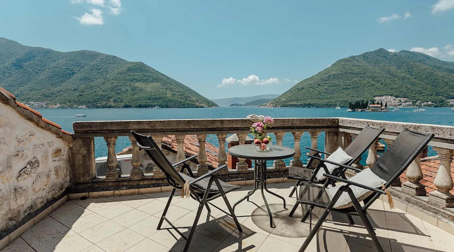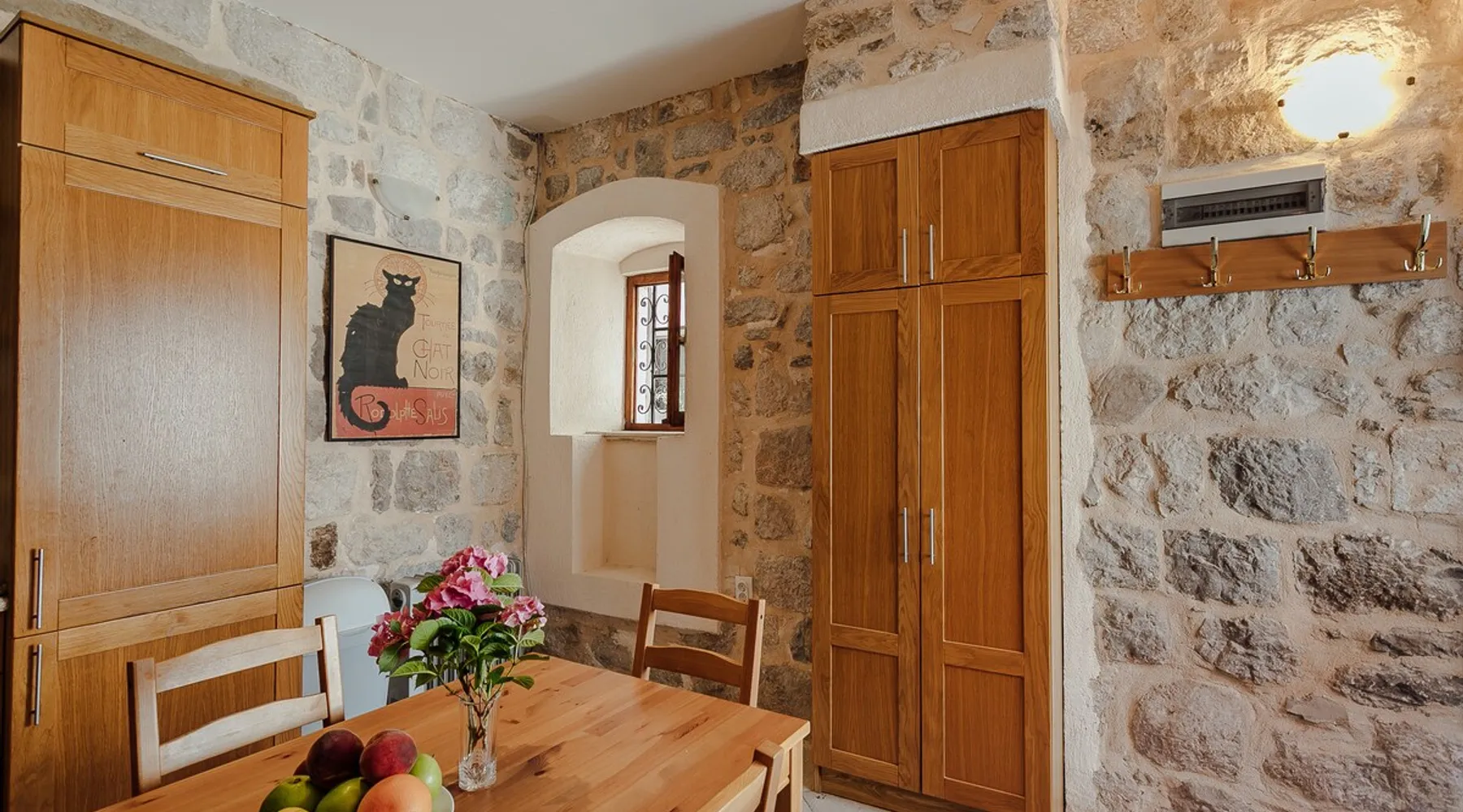 The house which is literally ten steps away from the sea. Inside the spiral staircase leads to the top floor living area, which lead to an open terrace with a view looking directly to the Island ‘lady of the rock’ Public transport: bus service between Kotor and Risan The nearest airport is Tivat in Montenegro (about half hour drive from Perast) There are many restaurants along the Riviera. The space You enter the house from the main town sea Riviera just past the museum building approaching from the Risan parking end. There is a small but famous Orthodox church next to the house. The main entrance door leads into the kitchen and dining area with original stone walls, stone tiled floor with a utility room behind and under the stone steps. This includes a washing machine, dryer, sink unit, and storage for cleaning materials. The kitchen dining area contains a fitted kitchen with hob, oven, dishwasher large integrated fridge freezer and sink set in a polished granite worktop; and dining table with seating for four comfortably but six at a push. Straight ahead are the original stone spiral steps to the first floor with purpose designed alcove with background light. There are two fold away directors’ chairs which can be used to sit outside the house and enjoy the quiet square used by other local residents and shaded with a large palm tree. The square is set down slightly from the Riviera road which gives it a discrete and private feel. From the square three steps takes you to the ponta and sea From the first floor landing is a fully fitted family shower room with stone tile floor and walls which contains shower, wall mounted WC, and granite worktop mounted WHB and vanity cupboard under. Set in the wall is a tall utility cupboard and window. Ahead is the second double bedroom with twin beds with bedside table and lamp. A large fitted cupboard unit containing the hot water boiler for both shower/bathrooms gives ample space for clothes storage. The original stone walls are a quiet backdrop for the period design dressing table chair and mirror. A period Persian rug lies between the twin beds. The spiral staircase continues to the second floor now with a window view of the side of the church and rises into the landing leading directly to the master double bedroom. Within the bedroom access to fully fitted bathroom with stone tiled walls and floor bath/shower, WC and granite worktop mounted WHB and vanity cupboard under. The bedroom contains a period bed with two bedside tables and lamps. The original stone walls are a quiet backdrop for the period design dressing table chair and mirror. Two period Persian rugs lay either side of the bed. The spiral staircase leads to the top floor living area which has maintained the original timber pitched roof and stone walls. The large sliding panoramic glass doors lead to a small stone floor open terrace with stunning view looking directly to the Island ‘lady of the rock’ and famous entrance to the Boka Kotorski Bay. There is an outside weather table and chairs with retractable overhead awning. Interestingly, an external drop-rope and pulley, is available for easy access to the ground kitchen to haul up and down teas and meals and anything else. Within the enclosed living room is a double sofa and two comfortable arm chairs beside an open high level fireplace. A small fridge is installed in the recess under the fireplace. The living room is serviced with internet access and television with many channels available. The area is supported with a good sized table on a period Persian rug All bedrooms, the second floor sitting room, and ground floor are air conditioned and these units can also provide warm air heating as well as the wood burning top floor fireplace. There is an intercom system on each level allowing access to the front door. A child’s cot is available. Guest access whole house is available for occupation Other things to note Parking: Perast has been assigned as a non-drive through zone for years now and only properties with private parking have parking places secured. Tourists and visitors can park at the end of each side of the village. The Risan side that is very close to the house is owned by a Conte Hotel. That is the side guests should park if possible since it is very close to the house. The parking charge is changing every year.