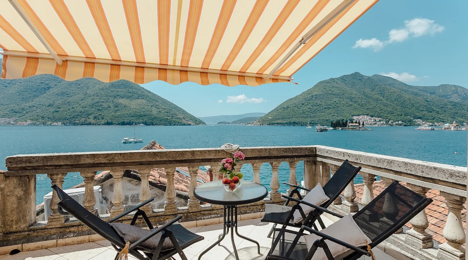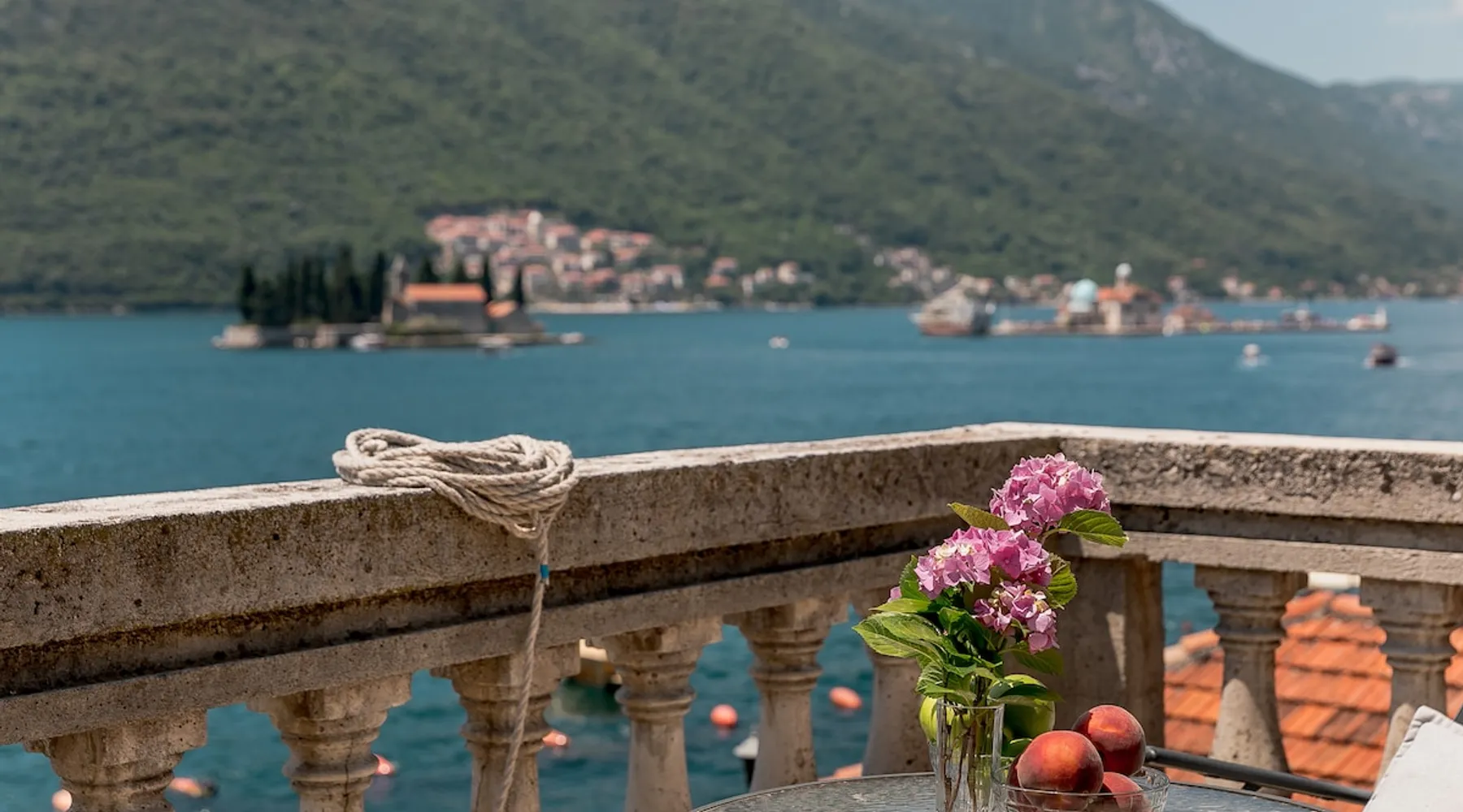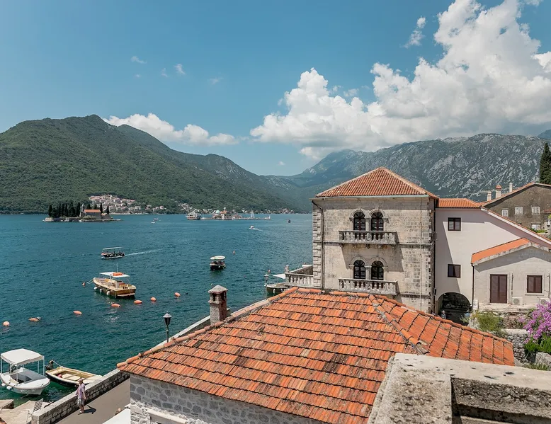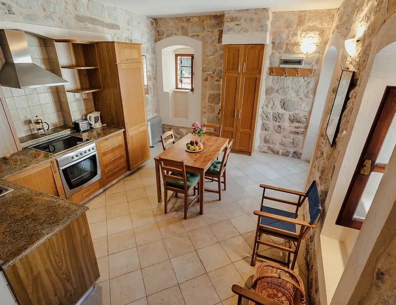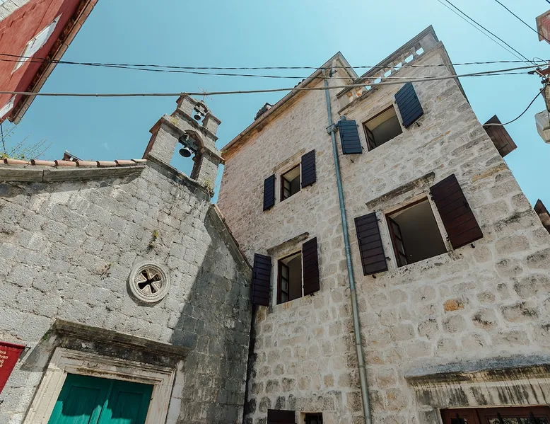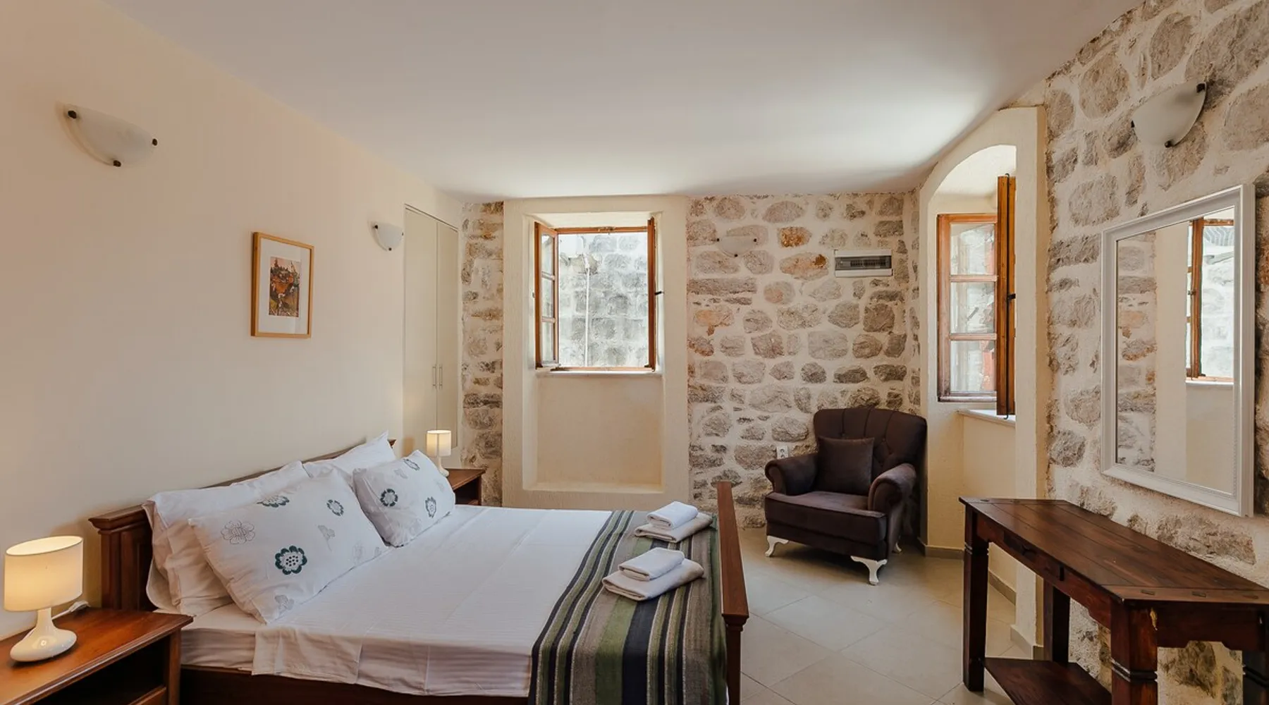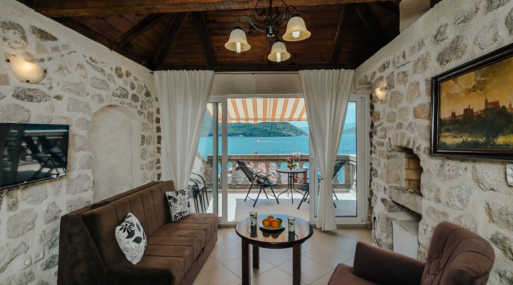 The house which is literally ten steps away from the sea. Inside the spiral staircase leads to the top floor living area, which lead to an open terrace with a view looking directly to the Island ‘lady of the rock’ Public transport: bus service between Kotor and Risan The nearest airport is Tivat in Montenegro (about half hour drive from Perast) There are many restaurants along the Riviera. The space You enter the house from the main town sea Riviera just past the museum building approaching from the Risan parking end. There is a small but famous Orthodox church next to the house. The main entrance door leads into the kitchen and dining area with original stone walls, stone tiled floor with a utility room behind and under the stone steps. This includes a washing machine, dryer, sink unit, and storage for cleaning materials. The kitchen dining area contains a fitted kitchen with hob, oven, dishwasher large integrated fridge freezer and sink set in a polished granite worktop; and dining table with seating for four comfortably but six at a push. Straight ahead are the original stone spiral steps to the first floor with purpose designed alcove with background light. There are two fold away directors’ chairs which can be used to sit outside the house and enjoy the quiet square used by other local residents and shaded with a large palm tree. The square is set down slightly from the Riviera road which gives it a discrete and private feel. From the square three steps takes you to the ponta and sea From the first floor landing is a fully fitted family shower room with stone tile floor and walls which contains shower, wall mounted WC, and granite worktop mounted WHB and vanity cupboard under. Set in the wall is a tall utility cupboard and window. Ahead is the second double bedroom with twin beds with bedside table and lamp. A large fitted cupboard unit containing the hot water boiler for both shower/bathrooms gives ample space for clothes storage. The original stone walls are a quiet backdrop for the period design dressing table chair and mirror. A period Persian rug lies between the twin beds. The spiral staircase continues to the second floor now with a window view of the side of the church and rises into the landing leading directly to the master double bedroom. Within the bedroom access to fully fitted bathroom with stone tiled walls and floor bath/shower, WC and granite worktop mounted WHB and vanity cupboard under. The bedroom contains a period bed with two bedside tables and lamps. The original stone walls are a quiet backdrop for the period design dressing table chair and mirror. Two period Persian rugs lay either side of the bed. The spiral staircase leads to the top floor living area which has maintained the original timber pitched roof and stone walls. The large sliding panoramic glass doors lead to a small stone floor open terrace with stunning view looking directly to the Island ‘lady of the rock’ and famous entrance to the Boka Kotorski Bay. There is an outside weather table and chairs with retractable overhead awning. Interestingly, an external drop-rope and pulley, is available for easy access to the ground kitchen to haul up and down teas and meals and anything else. Within the enclosed living room is a double sofa and two comfortable arm chairs beside an open high level fireplace. A small fridge is installed in the recess under the fireplace. The living room is serviced with internet access and television with many channels available. The area is supported with a good sized table on a period Persian rug All bedrooms, the second floor sitting room, and ground floor are air conditioned and these units can also provide warm air heating as well as the wood burning top floor fireplace. There is an intercom system on each level allowing access to the front door. A child’s cot is available. Guest access whole house is available for occupation Other things to note Parking: Perast has been assigned as a non-drive through zone for years now and only properties with private parking have parking places secured. Tourists and visitors can park at the end of each side of the village. The Risan side that is very close to the house is owned by a Conte Hotel. That is the side guests should park if possible since it is very close to the house. The parking charge is changing every year.