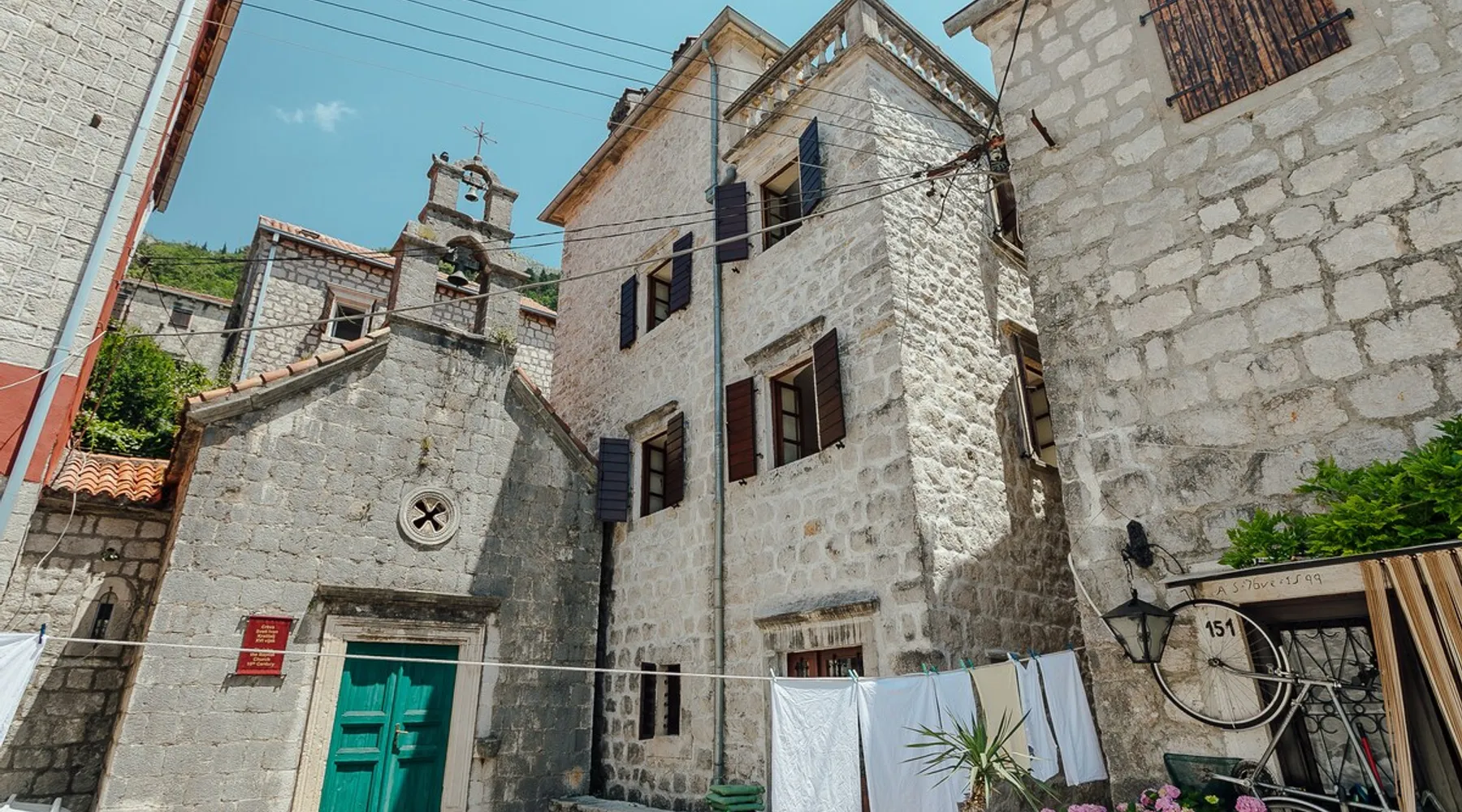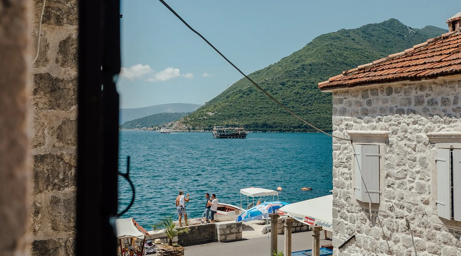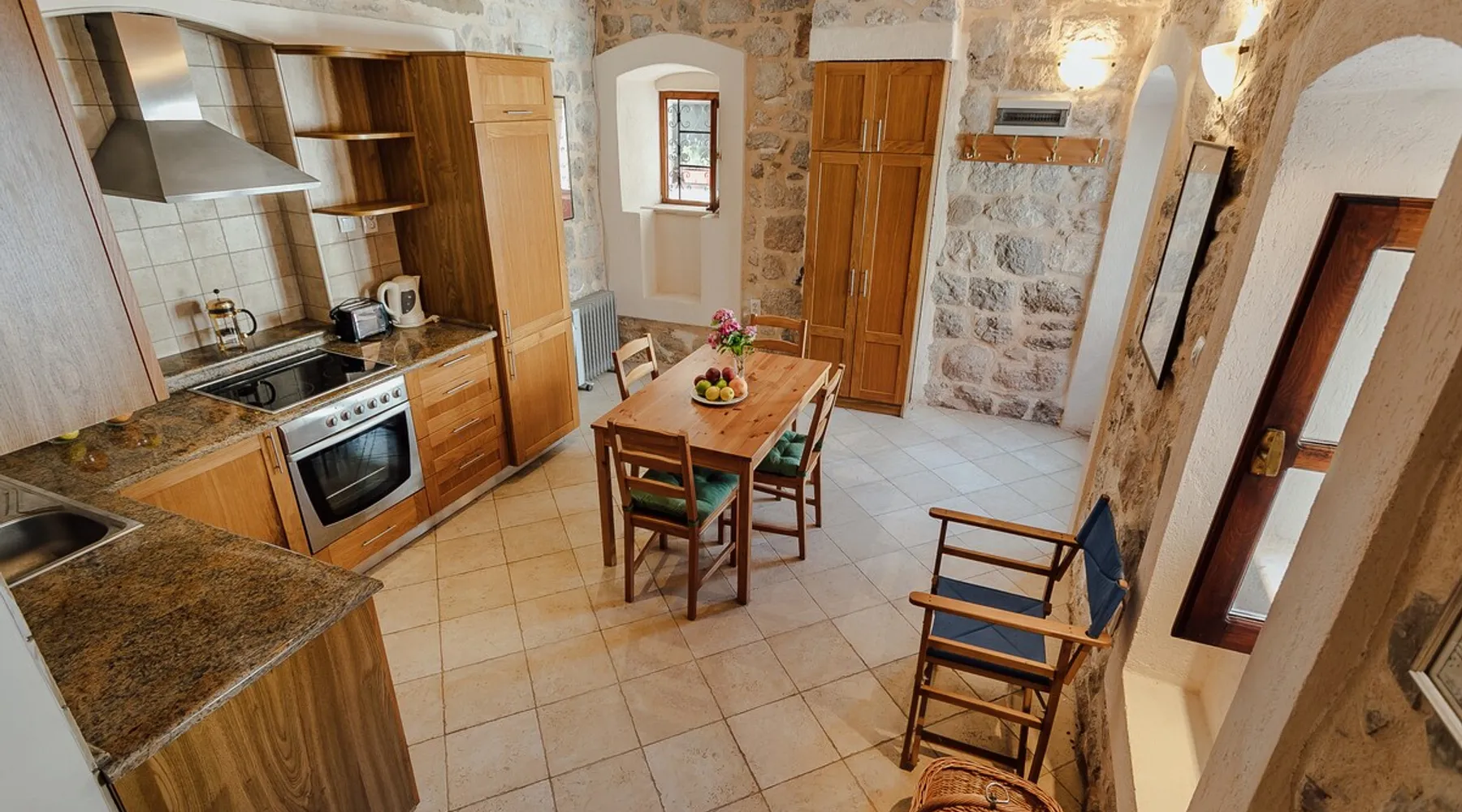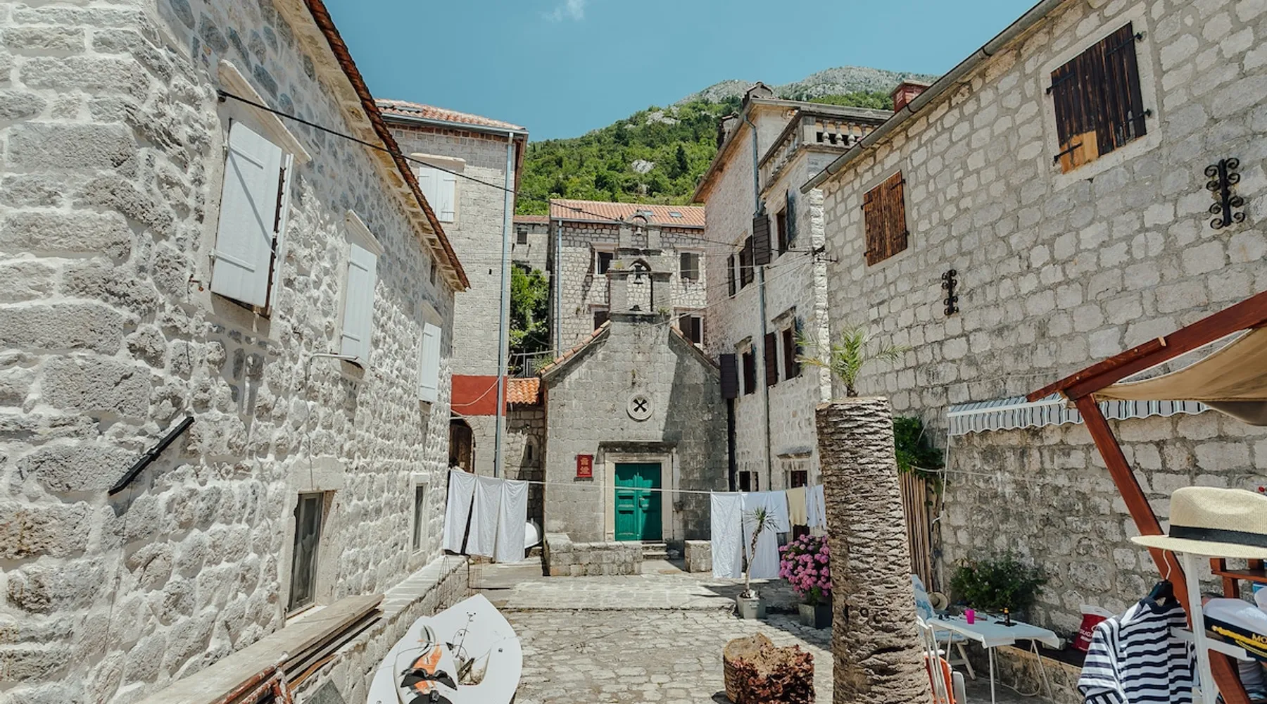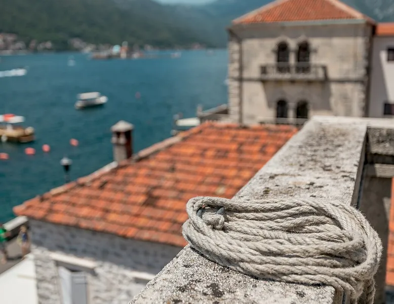 The house which is literally ten steps away from the sea. Inside the spiral staircase leads to the top floor living area, which lead to an open terrace with a view looking directly to the Island ‘lady of the rock’ Public transport: bus service between Kotor and Risan The nearest airport is Tivat in Montenegro (about half hour drive from Perast) There are many restaurants along the Riviera. The space You enter the house from the main town sea Riviera just past the museum building approaching from the Risan parking end. There is a small but famous Orthodox church next to the house. The main entrance door leads into the kitchen and dining area with original stone walls, stone tiled floor with a utility room behind and under the stone steps. This includes a washing machine, dryer, sink unit, and storage for cleaning materials. The kitchen dining area contains a fitted kitchen with hob, oven, dishwasher large integrated fridge freezer and sink set in a polished granite worktop; and dining table with seating for four comfortably but six at a push. Straight ahead are the original stone spiral steps to the first floor with purpose designed alcove with background light. There are two fold away directors’ chairs which can be used to sit outside the house and enjoy the quiet square used by other local residents and shaded with a large palm tree. The square is set down slightly from the Riviera road which gives it a discrete and private feel. From the square three steps takes you to the ponta and sea From the first floor landing is a fully fitted family shower room with stone tile floor and walls which contains shower, wall mounted WC, and granite worktop mounted WHB and vanity cupboard under. Set in the wall is a tall utility cupboard and window. Ahead is the second double bedroom with twin beds with bedside table and lamp. A large fitted cupboard unit containing the hot water boiler for both shower/bathrooms gives ample space for clothes storage. The original stone walls are a quiet backdrop for the period design dressing table chair and mirror. A period Persian rug lies between the twin beds. The spiral staircase continues to the second floor now with a window view of the side of the church and rises into the landing leading directly to the master double bedroom. Within the bedroom access to fully fitted bathroom with stone tiled walls and floor bath/shower, WC and granite worktop mounted WHB and vanity cupboard under. The bedroom contains a period bed with two bedside tables and lamps. The original stone walls are a quiet backdrop for the period design dressing table chair and mirror. Two period Persian rugs lay either side of the bed. The spiral staircase leads to the top floor living area which has maintained the original timber pitched roof and stone walls. The large sliding panoramic glass doors lead to a small stone floor open terrace with stunning view looking directly to the Island ‘lady of the rock’ and famous entrance to the Boka Kotorski Bay. There is an outside weather table and chairs with retractable overhead awning. Interestingly, an external drop-rope and pulley, is available for easy access to the ground kitchen to haul up and down teas and meals and anything else. Within the enclosed living room is a double sofa and two comfortable arm chairs beside an open high level fireplace. A small fridge is installed in the recess under the fireplace. The living room is serviced with internet access and television with many channels available. The area is supported with a good sized table on a period Persian rug All bedrooms, the second floor sitting room, and ground floor are air conditioned and these units can also provide warm air heating as well as the wood burning top floor fireplace. There is an intercom system on each level allowing access to the front door. A child’s cot is available. Guest access whole house is available for occupation Other things to note Parking: Perast has been assigned as a non-drive through zone for years now and only properties with private parking have parking places secured. Tourists and visitors can park at the end of each side of the village. The Risan side that is very close to the house is owned by a Conte Hotel. That is the side guests should park if possible since it is very close to the house. The parking charge is changing every year.