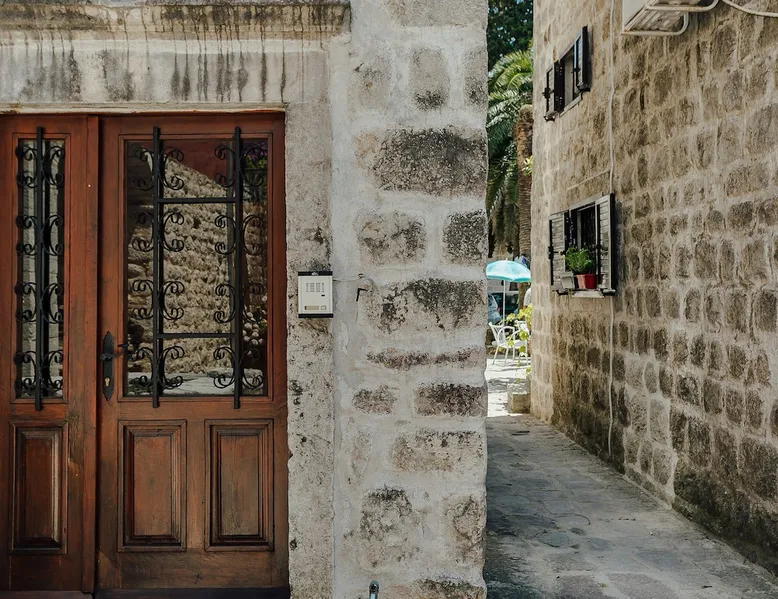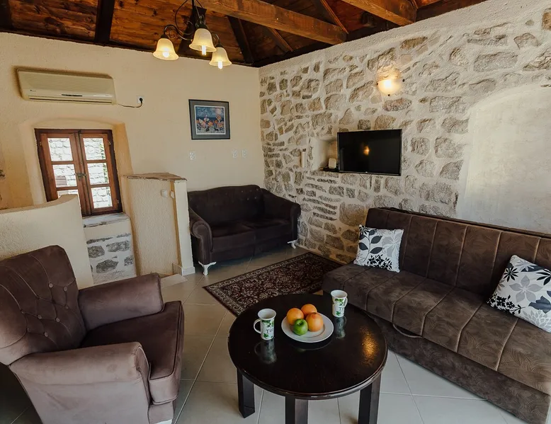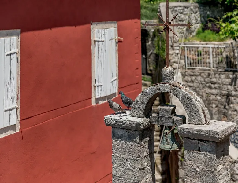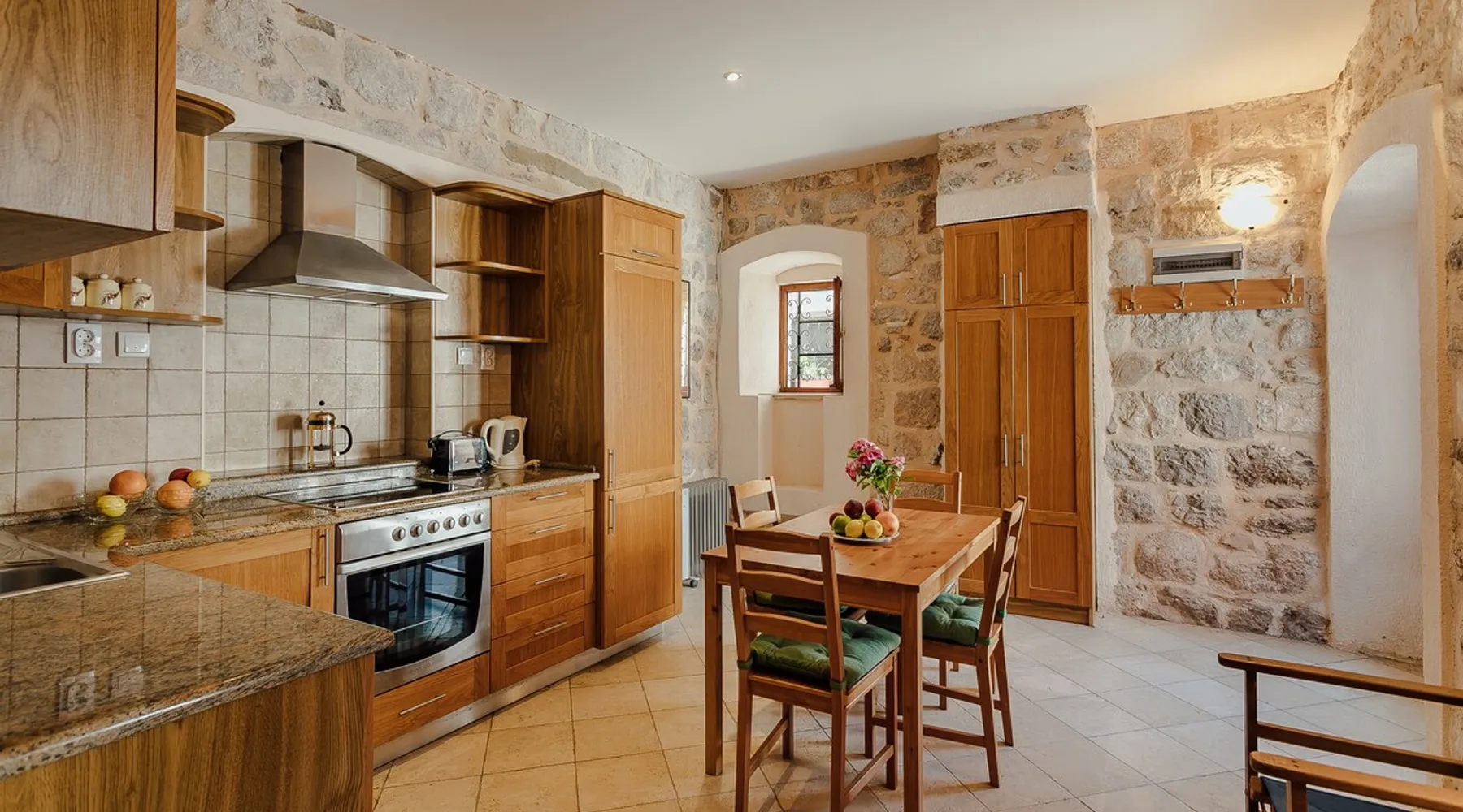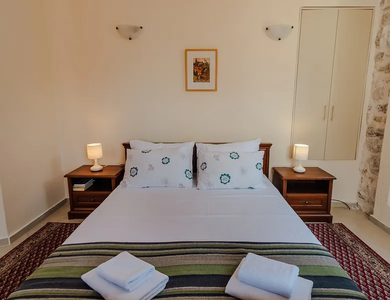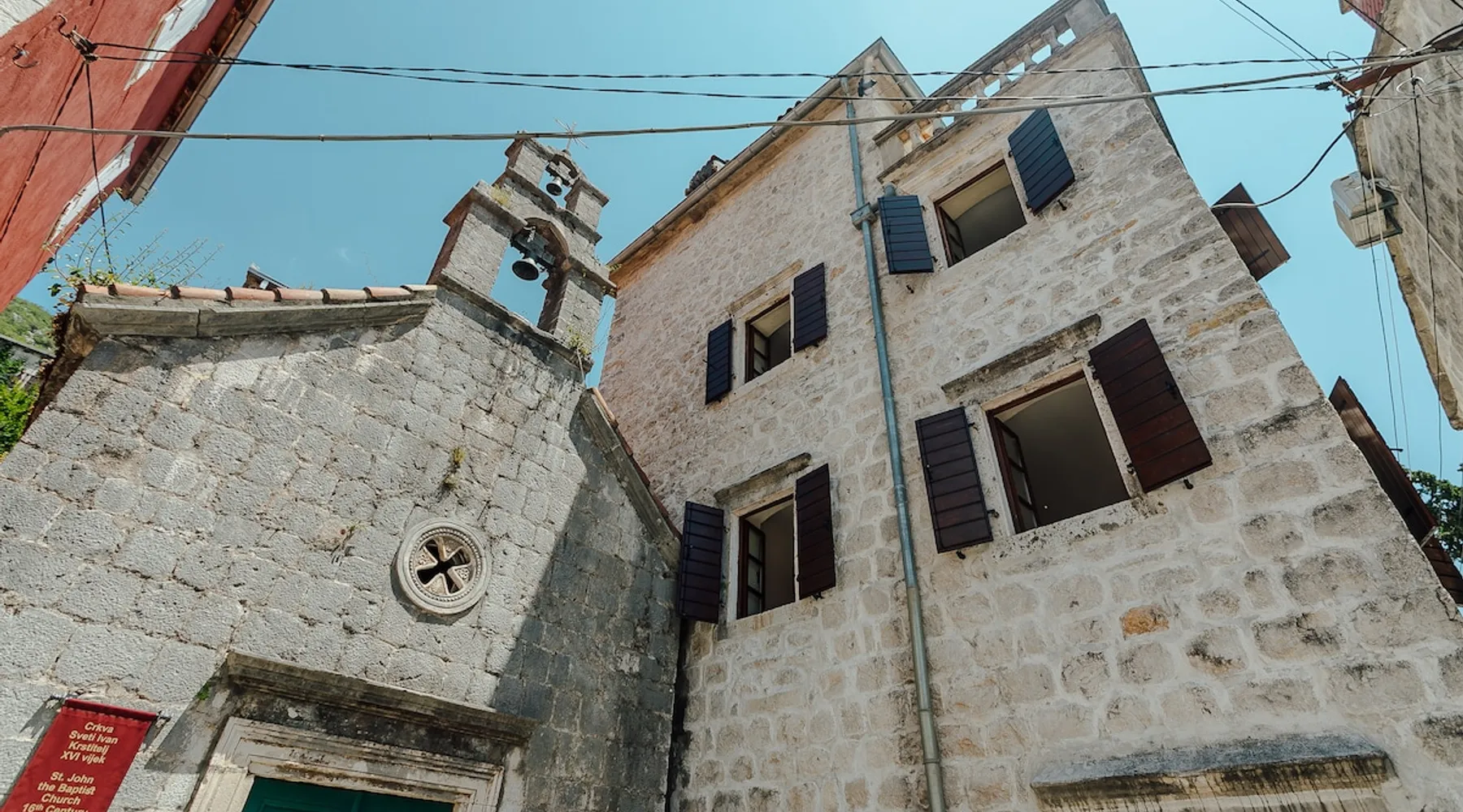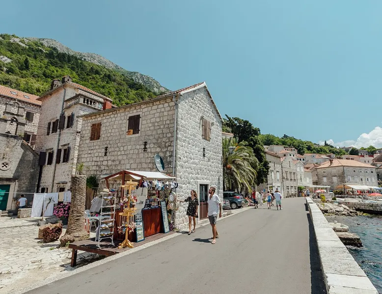 The house which is literally ten steps away from the sea. Inside the spiral staircase leads to the top floor living area, which lead to an open terrace with a view looking directly to the Island ‘lady of the rock’ Public transport: bus service between Kotor and Risan The nearest airport is Tivat in Montenegro (about half hour drive from Perast) There are many restaurants along the Riviera. The space You enter the house from the main town sea Riviera just past the museum building approaching from the Risan parking end. There is a small but famous Orthodox church next to the house. The main entrance door leads into the kitchen and dining area with original stone walls, stone tiled floor with a utility room behind and under the stone steps. This includes a washing machine, dryer, sink unit, and storage for cleaning materials. The kitchen dining area contains a fitted kitchen with hob, oven, dishwasher large integrated fridge freezer and sink set in a polished granite worktop; and dining table with seating for four comfortably but six at a push. Straight ahead are the original stone spiral steps to the first floor with purpose designed alcove with background light. There are two fold away directors’ chairs which can be used to sit outside the house and enjoy the quiet square used by other local residents and shaded with a large palm tree. The square is set down slightly from the Riviera road which gives it a discrete and private feel. From the square three steps takes you to the ponta and sea From the first floor landing is a fully fitted family shower room with stone tile floor and walls which contains shower, wall mounted WC, and granite worktop mounted WHB and vanity cupboard under. Set in the wall is a tall utility cupboard and window. Ahead is the second double bedroom with twin beds with bedside table and lamp. A large fitted cupboard unit containing the hot water boiler for both shower/bathrooms gives ample space for clothes storage. The original stone walls are a quiet backdrop for the period design dressing table chair and mirror. A period Persian rug lies between the twin beds. The spiral staircase continues to the second floor now with a window view of the side of the church and rises into the landing leading directly to the master double bedroom. Within the bedroom access to fully fitted bathroom with stone tiled walls and floor bath/shower, WC and granite worktop mounted WHB and vanity cupboard under. The bedroom contains a period bed with two bedside tables and lamps. The original stone walls are a quiet backdrop for the period design dressing table chair and mirror. Two period Persian rugs lay either side of the bed. The spiral staircase leads to the top floor living area which has maintained the original timber pitched roof and stone walls. The large sliding panoramic glass doors lead to a small stone floor open terrace with stunning view looking directly to the Island ‘lady of the rock’ and famous entrance to the Boka Kotorski Bay. There is an outside weather table and chairs with retractable overhead awning. Interestingly, an external drop-rope and pulley, is available for easy access to the ground kitchen to haul up and down teas and meals and anything else. Within the enclosed living room is a double sofa and two comfortable arm chairs beside an open high level fireplace. A small fridge is installed in the recess under the fireplace. The living room is serviced with internet access and television with many channels available. The area is supported with a good sized table on a period Persian rug All bedrooms, the second floor sitting room, and ground floor are air conditioned and these units can also provide warm air heating as well as the wood burning top floor fireplace. There is an intercom system on each level allowing access to the front door. A child’s cot is available. Guest access whole house is available for occupation Other things to note Parking: Perast has been assigned as a non-drive through zone for years now and only properties with private parking have parking places secured. Tourists and visitors can park at the end of each side of the village. The Risan side that is very close to the house is owned by a Conte Hotel. That is the side guests should park if possible since it is very close to the house. The parking charge is changing every year.