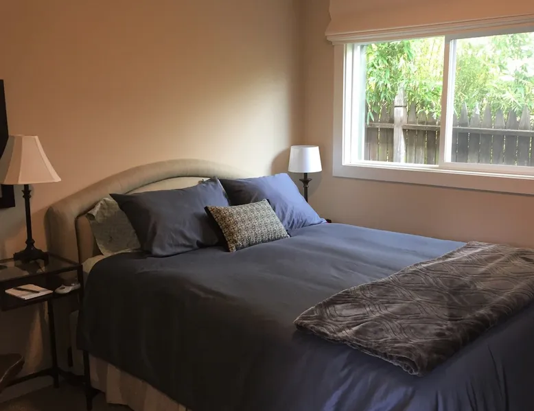 Small detached guest cottage (no kitchen) with a private entrance, queen bed /full bath/TV, and a small area with coffee/tea/fridge/microwave/toaster-oven and wifi. We're following strict sanitizing and washing protocols and provide cleaning supplies in the unit. We're in a quaint neighborhood in a flat area of Mill Valley. This space is comfortable for 1 and cozy for 2. A mile from downtown Mill Valley, many great hiking/mountain biking trails and San Francisco is 10 miles away. Guest access Guests have access the bedroom unit. The main house is not accessible, however, we are happy to provide storage for bikes or additional gear and loan extra supplies for your adventure, ie beach chairs, coolers, back packs, etc .