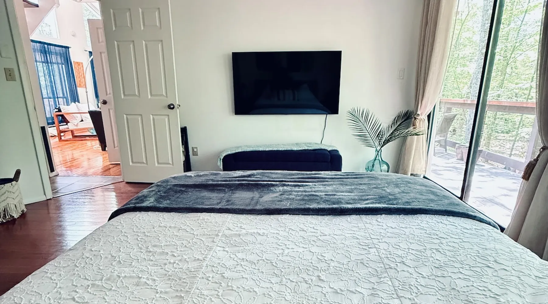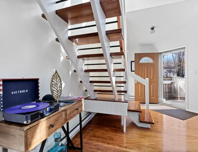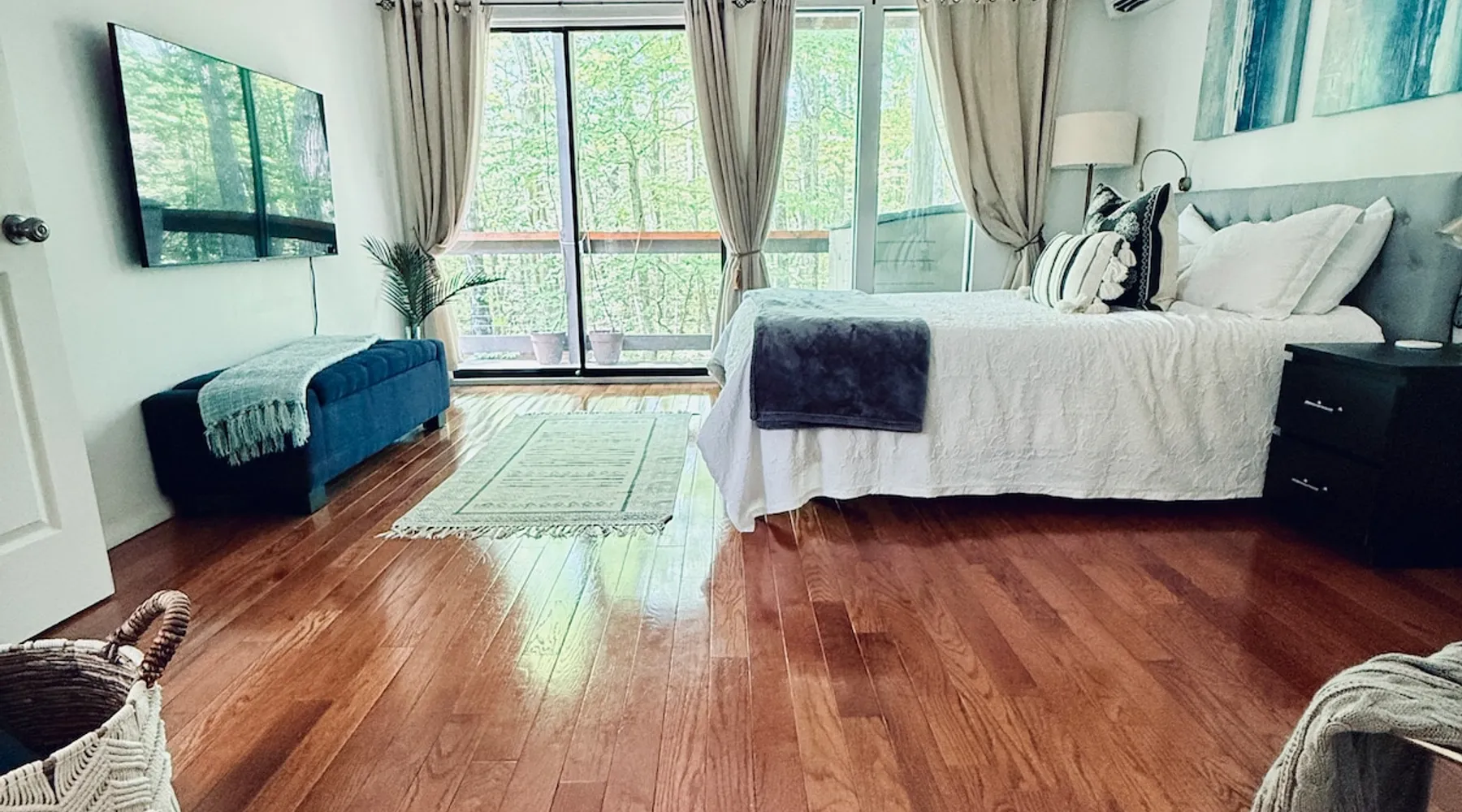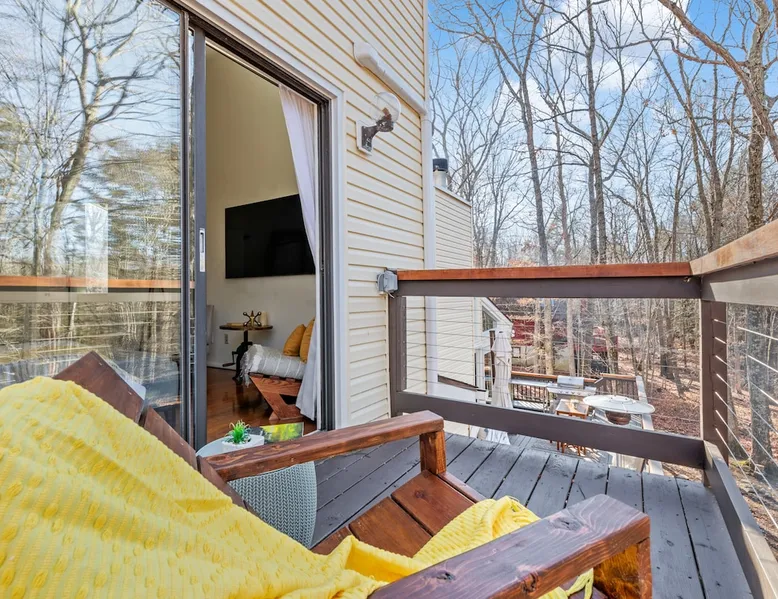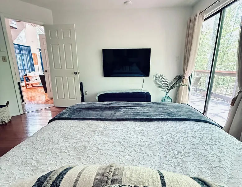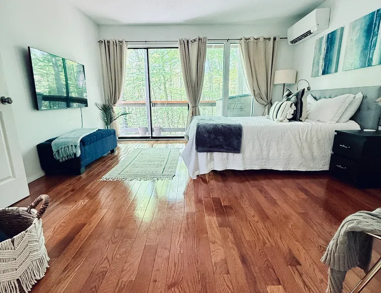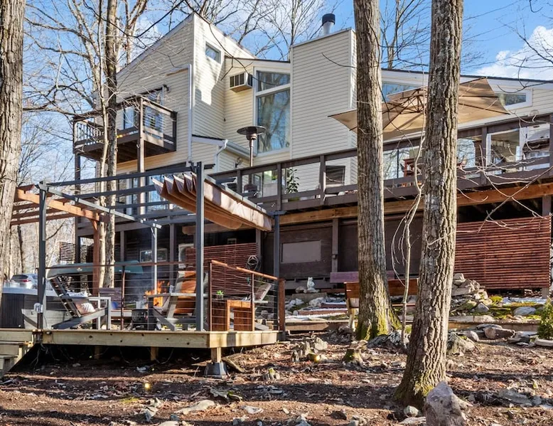 Welcome to the Luxury Sanctuary, your serene retreat in the heart of the picturesque Pocono Mountains. Whether you're seeking a thrilling adventure or a peaceful retreat, our location provides many opportunities for hiking, biking, skiing, and more. Enjoy morning coffee on the spacious deck. Book your escape today and create memories to last a lifetime amidst the beauty of this natural paradise. The space You're greeted by a warm and inviting atmosphere. The spacious living area features cozy furniture and a crackling fireplace, creating the ideal relaxing spot after a day of adventure. The kitchen has everything you need to whip up delicious meals, which you can enjoy in the adjacent dining area. The house boasts multiple bedrooms, each tastefully decorated and offering a peaceful retreat at the end of the day. Outside, a deck patio provides the perfect setting for al fresco dining or simply soaking up the forest views. Inside, you'll find an open and spacious layout that combines the living room, dining area, and kitchen. The interiors are bright and airy, with stylish decorations that blend well with the natural surroundings. The house has two full bathrooms and can comfortably accommodate up to six guests. The living area features a cozy fireplace, ideal for evening get-togethers, and a Family room with a top-of-the-line entertainment system. You can enjoy a 75" Smart UHD Smart screen TV with a 500-watt Surround Sound System, including installed apps such as MAX, Netflix, Amazon Prime, Disney+, and more. You'll be able to log in with your credentials. A 6-person hot tub is located in the backyard, perfect for relaxing and unwinding after exploring the nearby woods. The retreat includes a Game Room with a Pool Table, a Foosball table, and a Ping-Pong Table for entertainment. For those focused on wellness, there's a dedicated Yoga area, a Static Bicycle, and a treadmill to help you stay fit during your stay. With so many attractions nearby, including hiking paths, Camelback & Kalahari Water Parks, The Delaware Water Gap, Crossings Premium Outlet Shopping Mall, Lodge Wolf Resort, Bushkill Falls, the Appalachian Trail, Mount Tammany, and Minsi, there's no shortage of things to see and do. Whether you're seeking outdoor adventures or want to relax and unwind in a beautiful setting, this house offers the perfect home base for your Pocono getaway. Guest access Experience unparalleled convenience with our advanced keypad lock. Enter your unique PIN for seamless, keyless entry—no more fumbling for keys or worrying about whether the door is secure. The lock automatically reengages behind you, ensuring the property is always protected. During your stay, you’ll enjoy unrestricted access to the house, except for designated maintenance and supply areas. Upon check-out, your access code is immediately deactivated, guaranteeing both your privacy and security. Other things to note Bedroom linens and Bathroom towels: We will provide clean and washed sheets and towel sets for each guest. The beds will also be ready. Bedroom linens are provided but not exchanged during your stay. Guestbook Manual: A guestbook binder with the most essential information about the house will be on the kitchen table. Please take a moment to review it upon arrival—an envelope containing four badges to access the swimming pools during the summer season. Please ensure that you return them when checking out. Beach, Lake, and Pool towels will not be provided during your stay. Please bring your own. Please do not make loud noises outside after 10 p.m. and do not drive over the posted speed limits in the development (25 Mph Max speed); the community police will issue tickets if there are violations, and you will be held responsible. The cost/value of your reservation is automatically created when you select your dates and the total number of guests, including pets. The security deposit is charged only if there are damages, with no upfront fees or charges. A start-up set of garbage bags, toilet tissue, paper towels, shampoo, conditioner, and hand soap will be provided, but will not be replenished during your stay. We take the comfort and well-being of our guests seriously. Our property undergoes regular professional pest control to ensure a clean and pest-free environment, allowing you to relax and enjoy your stay with peace of mind. Important Disclaimer: By renting our home, you acknowledge and accept the natural conditions of the surrounding area, including the presence of insects and wildlife such as deer, raccoons, bears, squirrels, ants, spiders, etc., throughout the year. Due to the proximity to The Cranberry Preserve Bog, occasional encounters with bugs are inevitable and cannot be grounds for complaint or refund on Airbnb. We encourage our guests to notify us of any issues or concerns as soon as possible. We value open communication and believe it is the most effective way to address and resolve any issues promptly. We can't fix something that we do not know.