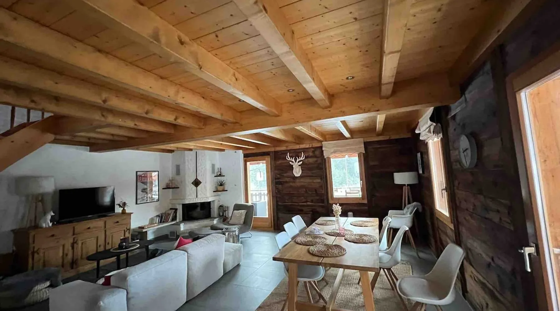 Large family cottage by the lake, terrace overlooking the lake and outdoor lawn up to the lake, parking and private access to the lake, quiet protected area and superb character , covered terrace overlooking the lake, in the heart of the resort, shops and restaurants 30 m away. The space The chalet is located in the middle of the resort with private access to the lake, it has a large balcony terrace sheltered by a winter garden, open plan living room with TV (140 channels) Wifi, modern kitchen, a magnificent view of the lake and mountains, underfloor heating and a fireplace, a mezzanine with small TV area. Guest access 1 private parking space, dishwasher , TV (140 channels) wifi, microwave, modern equipped kitchen. Other things to note Very quiet resort in the middle of authentic nature and postcard decor, Multiactivity St-Bernard Pass (more than 16 free activities)