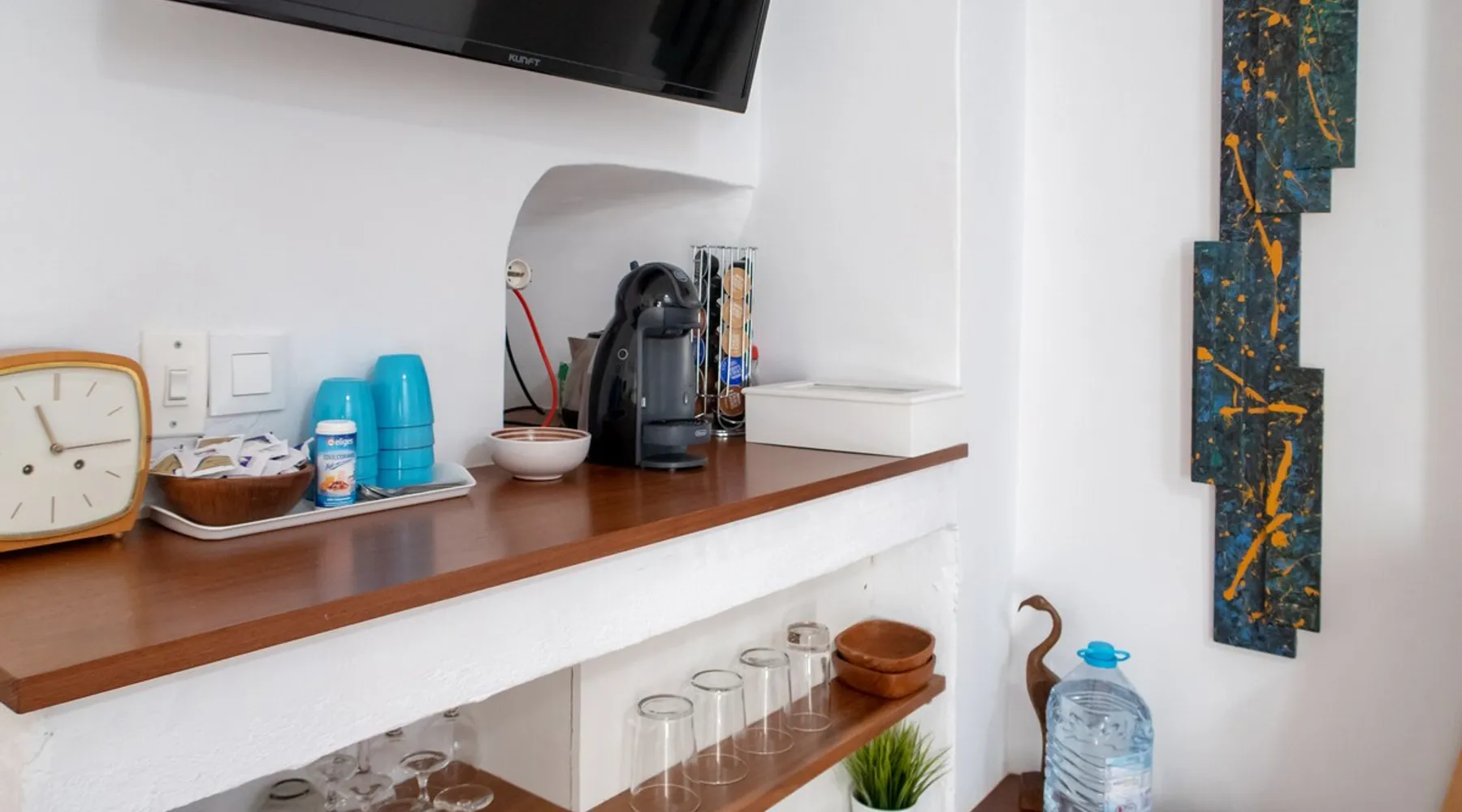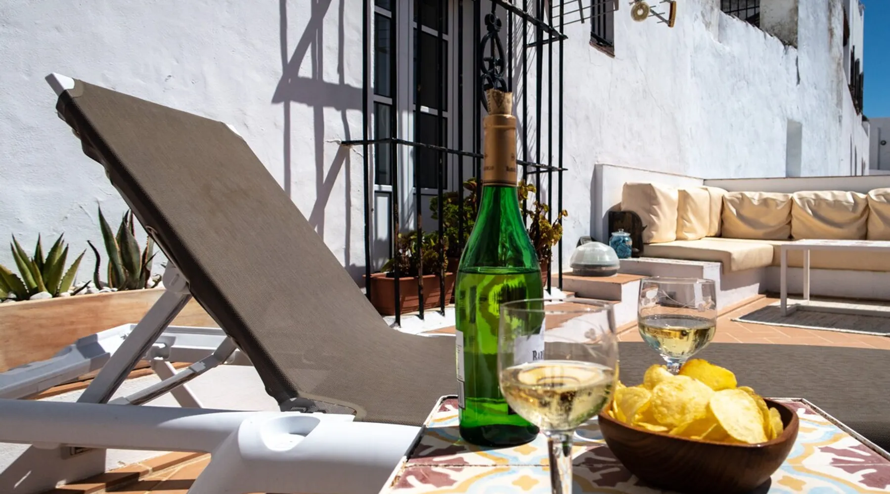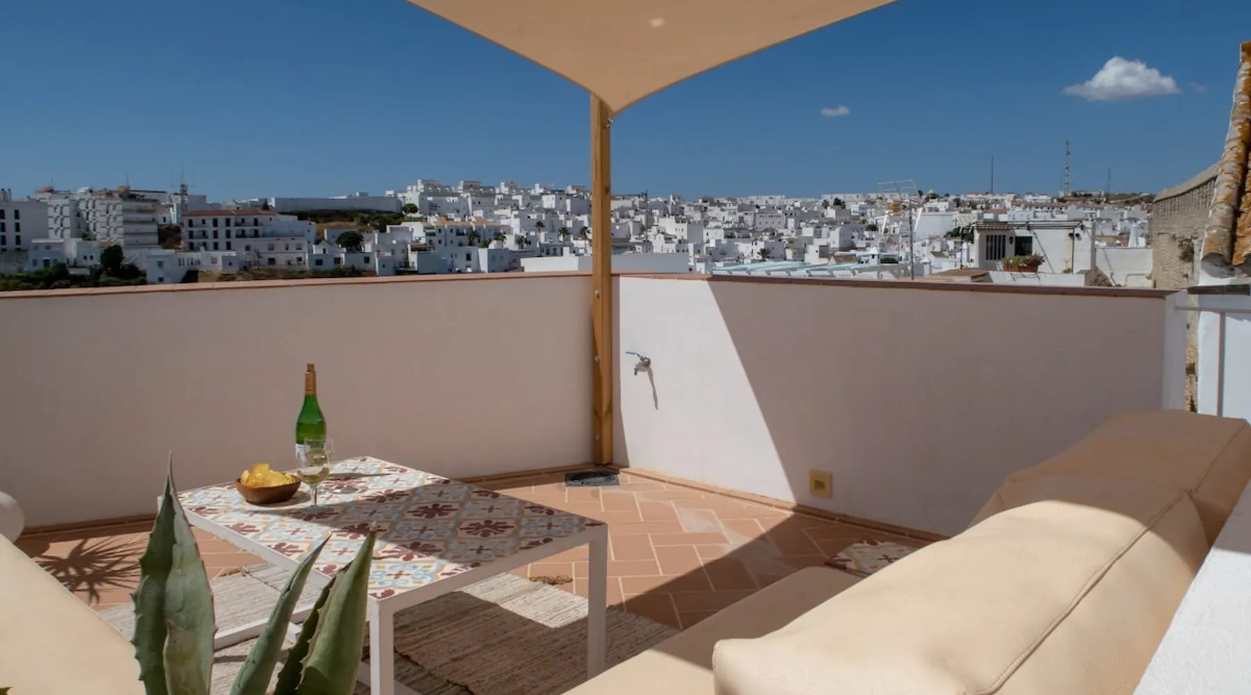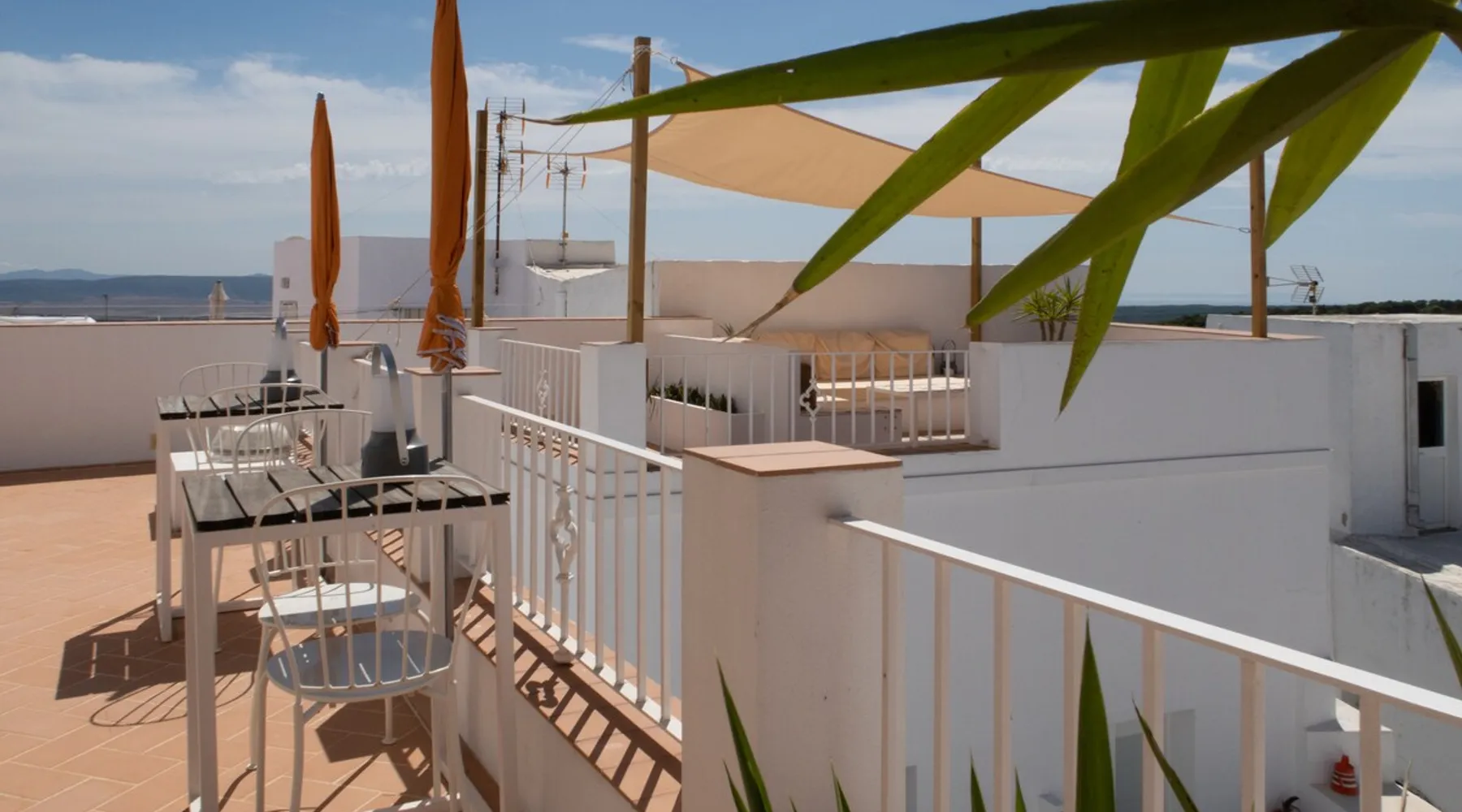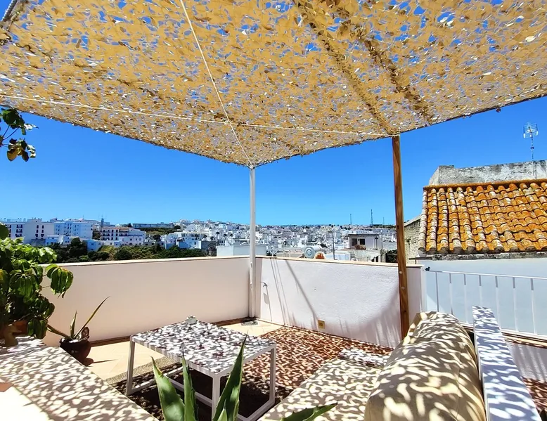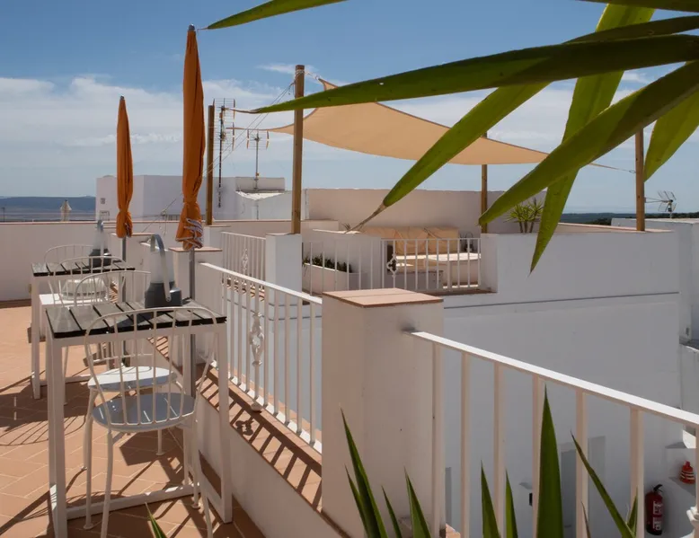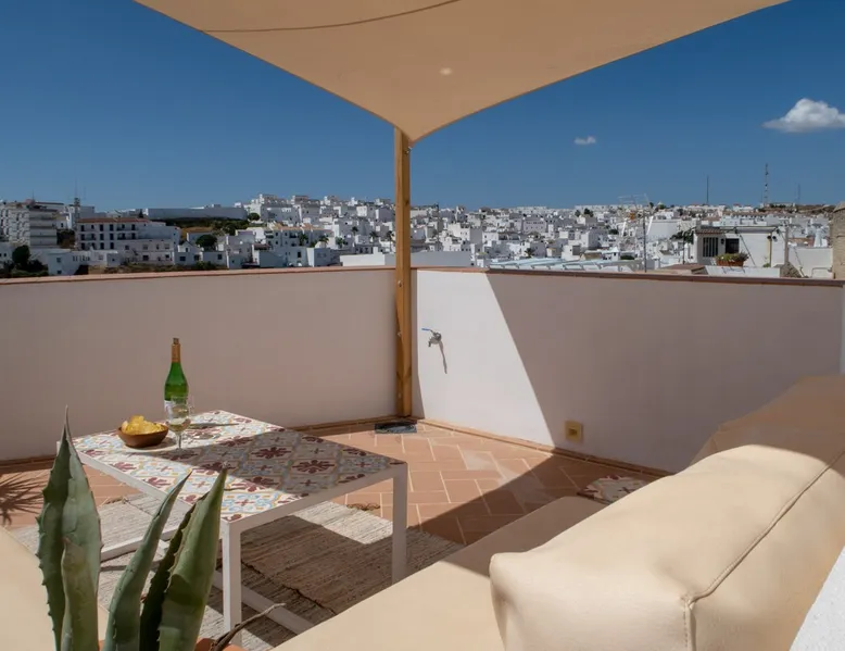 The duplex-room has 2 floors with internal stairway. On the first floor you will find a comfortable dubble bed (160x190cm) with heating, TV, ceiling fan and direct access outside. The ground floor includes a private bathroom with walk in shower, seperate toilet, big fridge and heating. It has 2 accesses: from the patio and the first floor. Size of about 25 m². Free wifi. Free public car parking closeby. Private parking at extra cost at 150m (on demand). The space VEJERÍSIMO is a Boutique Guest House situated in a quiet little street in the historic center of Vejer de la Frontera. The restaurants, typical bars and places of interest are just a footstep away. The centuries-old house has been restored maintaining Moorish features but with a 21th century swish. The house has 4 double rooms situated around a typical patio. Each room has his own private en-suite bathroom. Comunial areas: fully equiped kitchen (included dish washer and washing machine), patio, dubble roof terrace with long chairs, eating tables and chill-out corners. The Guest House has a lot of cozy corners: read a book next to the patio’s library or enjoy the roof terraces with its long chairs and chill-out corners. We promise you an unforgettable stay! Guest access Comunial areas: fully equiped kitchen (included dish washer and washing machine), patio, dubble roof terrace with long chairs, eating tables and chill-out corners. Registration number VTAR/CA/00496