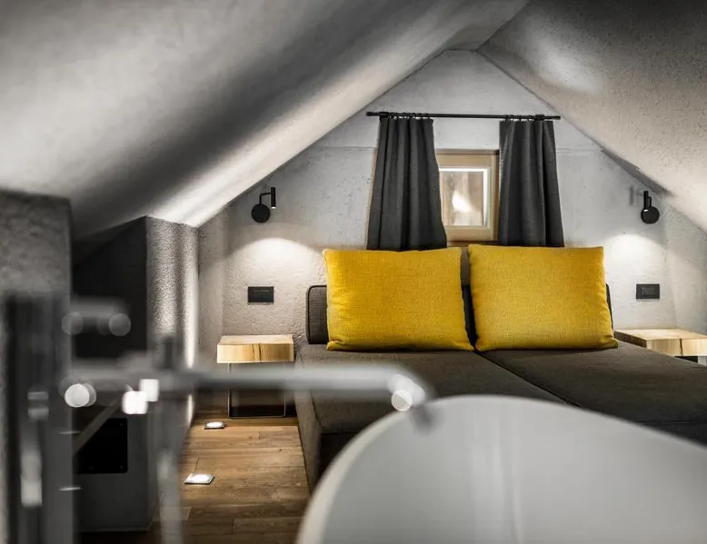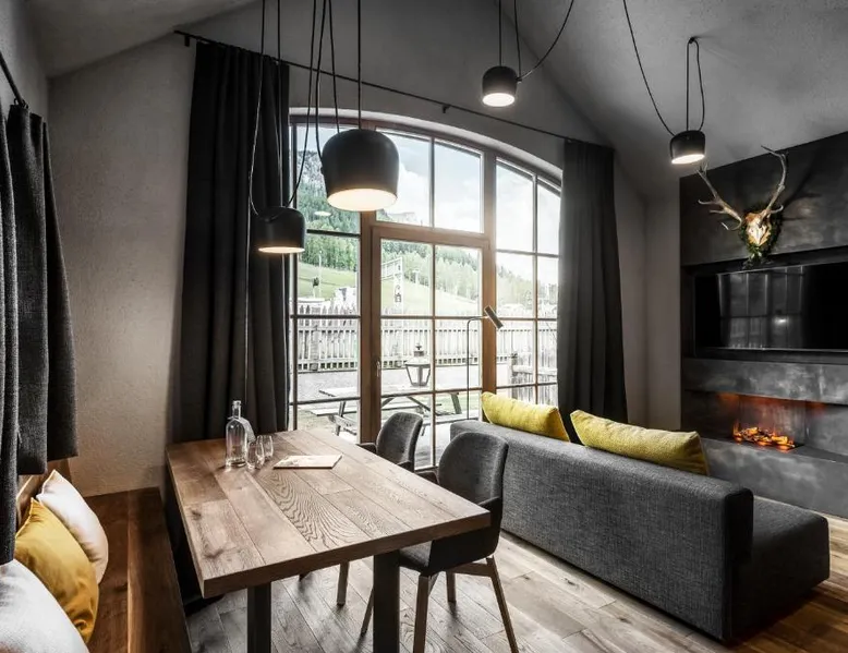 This graceful duplex apartment is a perfect mix of contemporary design and references to the Tyrolean traditions. The space The first level hosts a master bedroom with a double bed and a garden view balcony, as well as a cozy living room with a fireplace, sofa, satellite TV, dining area and a fully equipped kitchenette. The bathroom features a separate WC-bidet area, shower, double wash-basin, heated towel rails and hairdryer. On the superior level you will find a characteristic attic studio, easily transformable into another bedroom thanks to a double sofa-bed and a free standing bathtub. The apartment's highlight is a private terrace facing the impressive Gardenaccia massif. Feel free to relax on the loungers or enjoy your meals in the open air, inspired by the Alpine landscapes of rare beauty. Other things to note City taxes € 3,80 per person/ per day Registration Details IT021006B4DSRG763Z