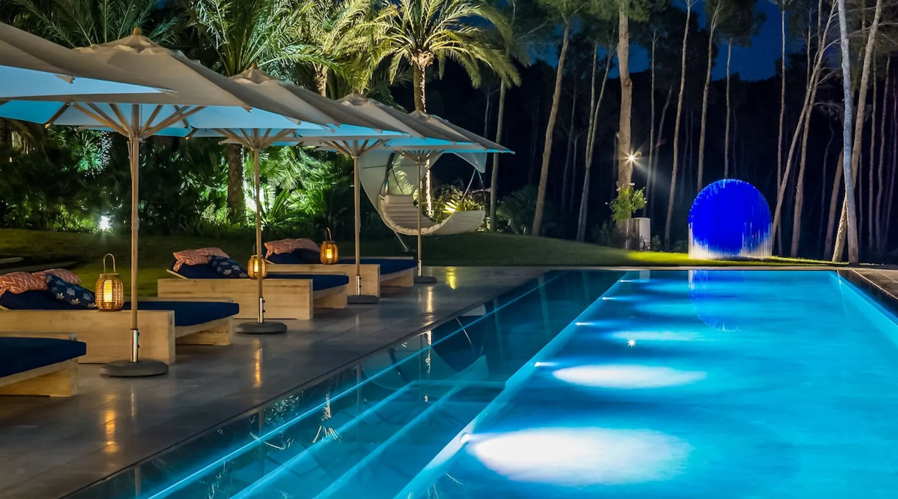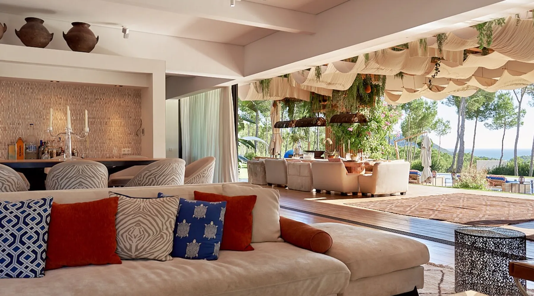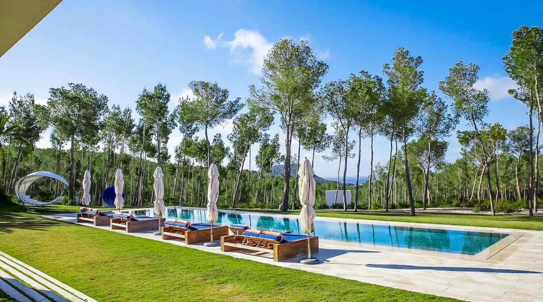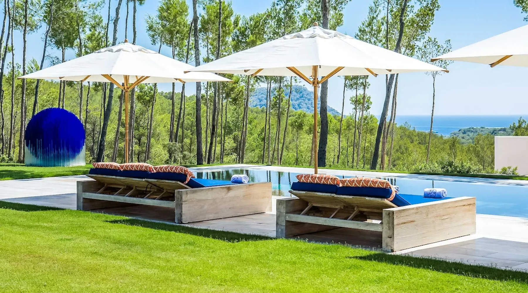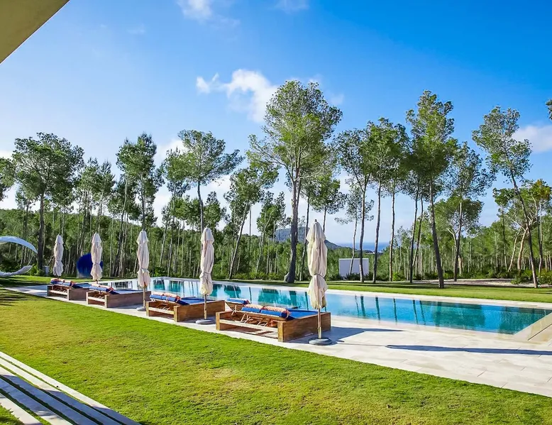 Set between San José and Cala Jondal, this secluded Ibizan property features modern architecture among palms and pines. A 25m heated infinity pool, fed by a private well, forms the centrepiece. Manicured grounds include a jacuzzi, pétanque pitch, outdoor cinema, and beach-style terrace with a bar. Inside, natural wood floors and contemporary design enhance en-suite bedrooms, each offering privacy and pool views. The space Privadia are proud to be an Airbnb Luxe Partner. As part of this partnership, all of our properties are individually inspected by Airbnb, ensuring authenticity and quality for all guests. Our relationship with Airbnb Luxe reflects our commitment to maintaining the highest standards across our portfolio of luxury villas. Located in a secluded area between San José and Cala Jondal, this contemporary Ibizan property combines modern design with a private, natural setting. Surrounded by mature pines and tall palms, the clean architectural lines of the villa are softened by the landscaped grounds, which include sculpted lawns and curated outdoor features. A 25-metre infinity pool sits at the heart of the property, drawing water from its own well and offering heating during cooler months (€300 per day). The pool is visible from all rooms and is bordered by loungers, shaded areas, and views through the trees to the Mediterranean. The outdoor spaces include a large jacuzzi for up to ten people, a pétanque pitch, contemporary sculpture installations, and an open-air cinema. A beach-style terrace set under the pines features white sand, a professional bar, and seating for up to 30 people. Additional outdoor dining and lounge areas are arranged across wide terraces and garden zones. Inside, the interiors are finished with natural wood flooring and modern fixtures, balancing a clean aesthetic with warmth and functionality. The layout ensures privacy for all sleeping areas, with every bedroom offering direct outdoor access and an en-suite bathroom. Sleeping Arrangements: - Master Suite Hastens king-size bed, fireplace, TV and Sonos music, air conditioning. En-suite bathroom with shower, bath and Hammam. Includes a private outdoor shower, access to the jacuzzi, and a private chill-out area. - Bedroom 2 King-size bed, TV and Sonos music, air conditioning, private outdoor shower and terrace, en-suite bathroom with shower. - Bedroom 3 King-size bed, TV and Sonos music, air conditioning, private terrace and outdoor shower, en-suite bathroom with shower. - Bedroom 4 King-size bed, TV and Sonos music, air conditioning, private terrace, en-suite bathroom with shower. - Bedroom 5 King-size bed, TV and Sonos music, air conditioning, private terrace and outdoor shower, en-suite bathroom with a bath. Kitchen Information: - Kitchen 1 – Fully equipped indoor kitchen Kitchen 2 – Outdoor kitchen suitable for catering and events Extra Cost: - Pool heating is available at €300 per day. Guest access Guests have full private access to the entire villa, including all indoor and outdoor spaces, the infinity pool, gardens, private terraces, and parking. Other things to note Please note that check-in is from 4 PM and check-out is by 10 AM, unless agreed otherwise in advance. The exact villa address will be shared 24 hours before arrival for security reasons. Full arrival instructions and access details will be provided closer to your check-in date via our Guest Experience team. We recommend hiring a car to make the most of your stay which we can help arrange. We also offer the option to pre-arrange a wide range of services to make your stay even more enjoyable – from boat rentals and private chefs to wellness sessions and grocery deliveries. Cleaning breakdown: 6 hours daily, 6 days per week Linen / Towel change - once per week. Live in couple help with cooking and driving. Registration Details Ibiza - Regional registration number ETV-2077-E