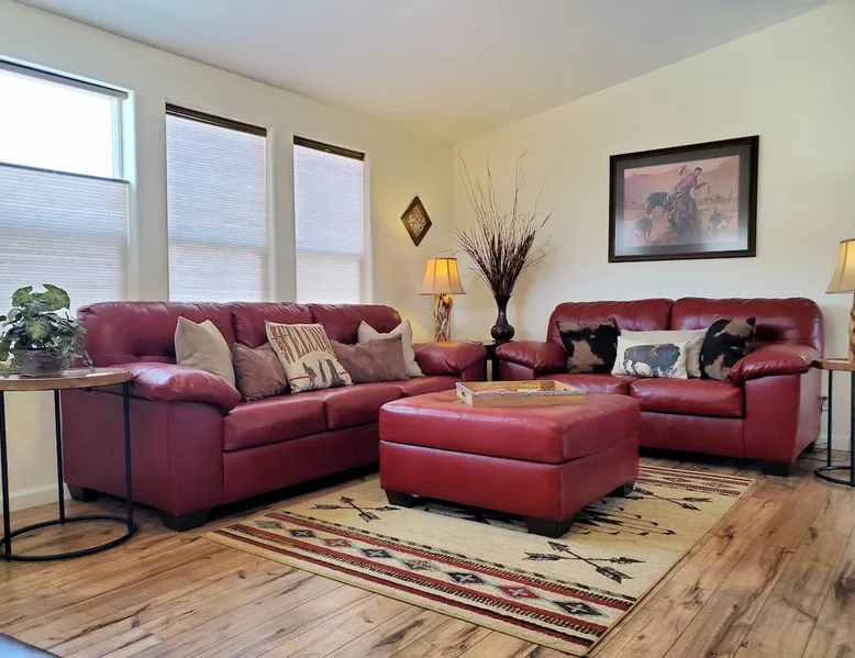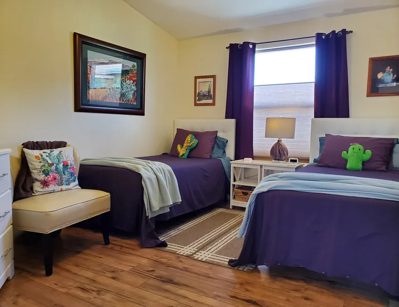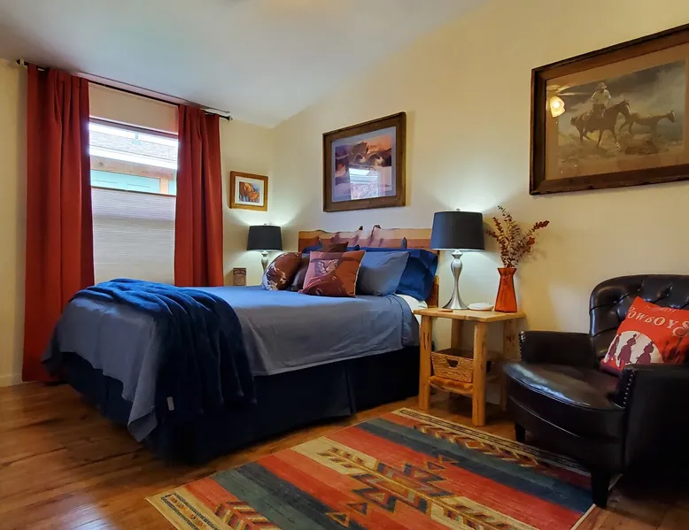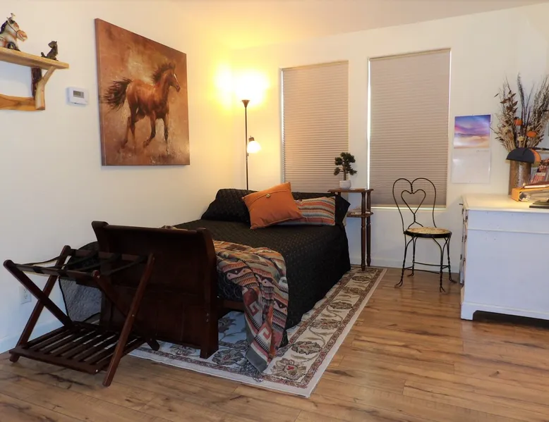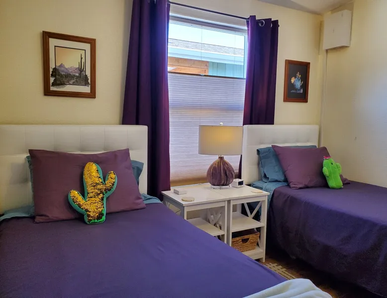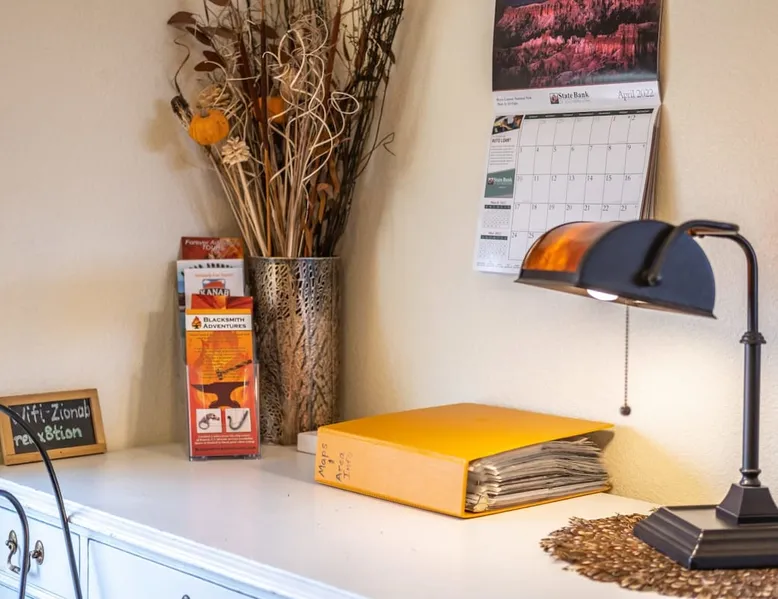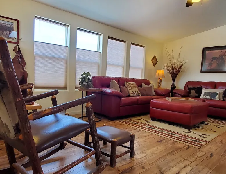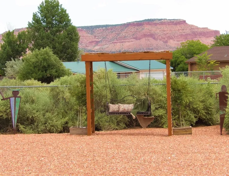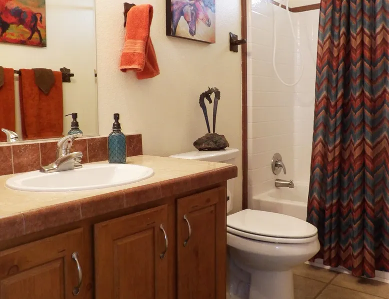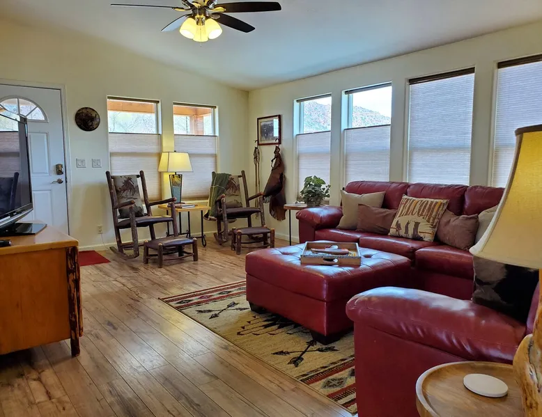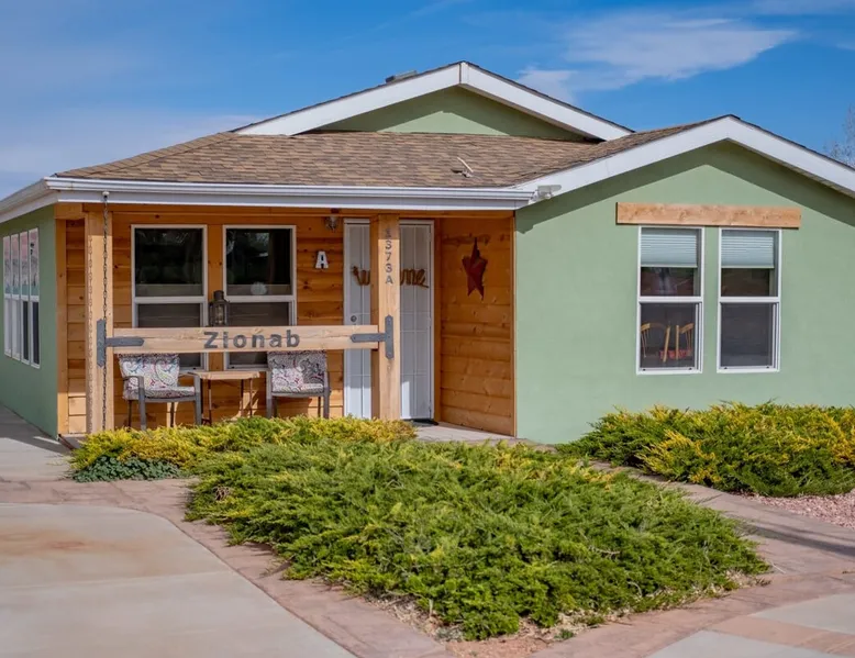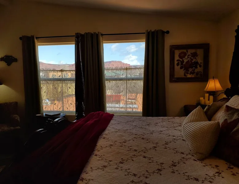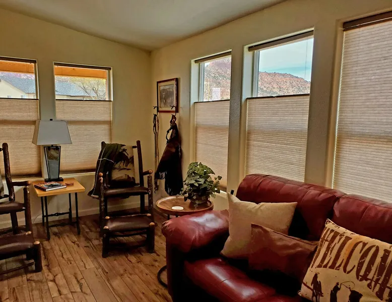 Our goal is for you to say, This is the BEST vacation rental ever! We want you to relax in comfort amid the art-filled, Western decor. Feel at home in the well-stocked, labeled kitchen & baths cleaned w/scent free products. Stay connected w/fast 1GB wifi. Drink in the red rock views from the BBQ patio. Stargaze beside the fire in the PRIVATE, fully fenced back yard! Keep kids busy w/board games & outdoor activities. All in Kanab which has 2 grocery stores, 35 eateries, 2 theaters & fun nitelife Unit A of Zionab Vacation Homes features a tasteful and fun decor with many original works of art, custom-made furnishings and hand-forged ironwork crafted by the owner. We have tried to supply the home so that all you need in order to vacation comfortably is your clothing. Each unit enjoys it's own private, unshared outdoor space. Cleanliness has always been a priority, but since the Pandemic, we've taken extra measures to ensure you arrive to a clean, sanitized home that is safe and comfortable. In 2022, we switched our laundry soap to scent free and started using more natural, low scented cleaning products like vinegar and Simple Green. Zionab is a great place to enjoy a working vacation with a dedicated work space and fast, reliable 1GBPS fiber-optic internet. The roomy kitchen is well-stocked for cooking up your family's favorites. Besides the glasstop stove/oven combo and microwave, there is a large and mini crock pot, an electric griddle for pancakes and such, a food processor for quick prep, a blender for your frozen favorites and a dishwasher for quick clean-up. There's also a 12-cup drip coffee pot with a single cup option and an electric water pot for tea. As for cooking essentials, Zionab provides a more than adequate supply of pots, pans, lids and bowls to prepare most dishes, along with a nice array of spices and staples like flour, sugars, oils and condiments. We have outfitted the house with indoor games, puzzles and quick crafts. For outdoor fun, there's corn hole and yard darts, a basketball hoop, soccer and footballs, and frisbees that can be enjoyed on site or across the street at the Ranchos City Park. Zionab has a huge outdoor fire-pit complete marshmallow roasters for S'mores. When you are ready to chill, our HUGE flat screen TV with ROKU streams dozens of channels. We offer Amazon Prime as well as a variety of DVD's and an HDMI cable connection for entertainment streamed from your device through the fast 1GBps fiber optic WIFI. There's also Red Box Rentals at both of the nearby grocery stores for newer releases. At day's end you can soothe those tired muscles in a hot, soaking bath in the Master Suite's garden tub outfitted with complimentary bath salts. The 50 gallon, quick-recovery water heater will ensure everyone has plenty of hot water to bathe before bed. Speaking of bed, the Master Suite features a gorgeous king-sized poster bed with a luxurious pillow top mattress piled hight with tons of pillows and invitingly crisp, clean sheets. Cellular shades and black-out curtains make sleeping-in so inviting. The Master bedroom is decorated in a romantic shabby chic decor that is full of soft, inviting textures that make you feel oh so pampered. Enjoy the cozy, mood setting electric fireplace as you wind down from your adventure filled day. The second bedroom is all horses and cowboys with denim and cowhide. The semi-firm, queen-size Serta pillow-top mattress is piled high with pillows and cozy bedding. The headboard is crafted of Juniper wood made from a tree that shaded a livestock shipping corral in it's former life. Blackout curtains and cellular shades close the world out to let you dream peacefully. A comfortable chair makes a great reading nook or spot to relax while you post pictures of the day's adventures. The Cowboy room features double closets with plenty of space to store luggage. This bedroom is located adjacent to the roomy guest bathroom which features a tub/shower combo. The third bedroom, the Cactus Room, features artwork of desert landscapes. It has two twin beds that can convert to a king size bed for added flexibility in accommodating couples. A large, comfortable chair provides a cozy spot for catching up on your social media. Luggage racks and a sizeable dresser help you stay organized. The fourth sleeping option is a futon couch that converts to a double bed located in the office area off to the side of the living room and kitchen. This sunny spot is perfect for enjoying your morning coffee or an afternoon nap. The office area includes a desk that is outfitted with a charging station, a complimentary laptop and our insider's guide to Kanab and the surrounding area. You are sure to enjoy Zionab's fiber optic internet speed of 1GBps - a rarity for a small town like Kanab. The West facing dining room seats eight and provides gorgeous views of the red rocks and lush green surroundings. A separate breakfast bar has seating for two. The back patio has a bistro table that seats two. Further out in the backyard by the outdoor fire pit is a picnic table that seats 6. It's the perfect area for singing campfire songs and roasting marshmallows or just soaking in the amazing red rock views. If you prefer to dine out, downtown Kanab is just 2 miles away and offers 35 eateries (of which only 4 are franchises). Zionab has central air conditioning and heat with ceiling fans in every room. There is an extra large washer and dryer for your convenience. Need to stretch your legs? Zionab is conveniently located across from a grassy, tree filled city park which offers the perfect place for travelers to stretch after being cramped in a car all day. Take a leisurely stroll around the 1/2 mile track, enjoy a heart pumping game of soccer, throw some Frisbee or fly a kite - all using the equipment available in Zionab's toy box. Prefer relaxing? Then you can enjoy the views of contrasting crimson red and verdant green scenery while you do some grilling on Zionab's private back pa