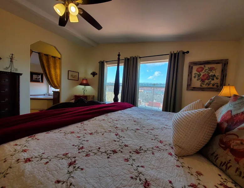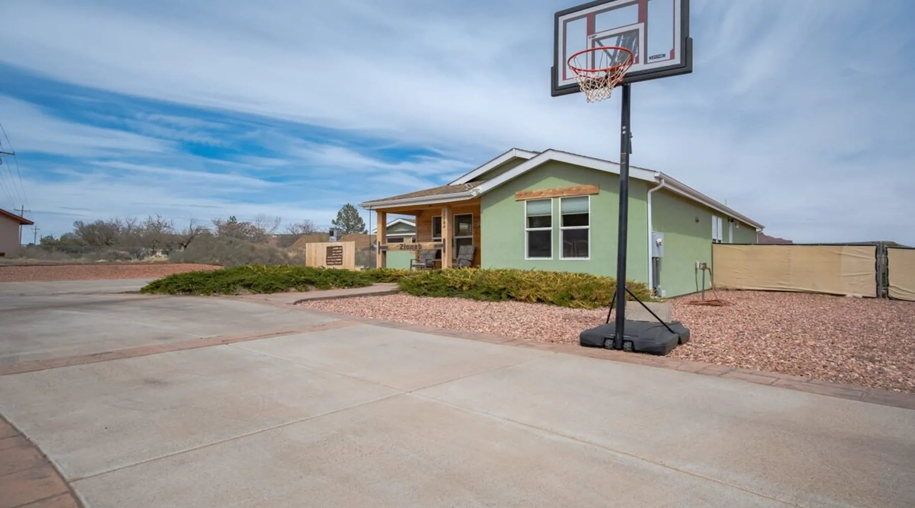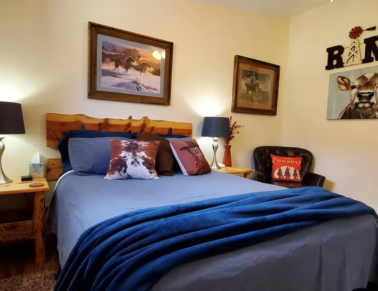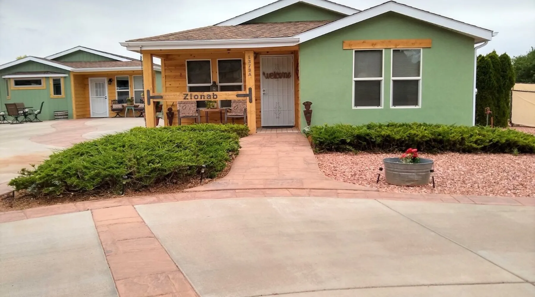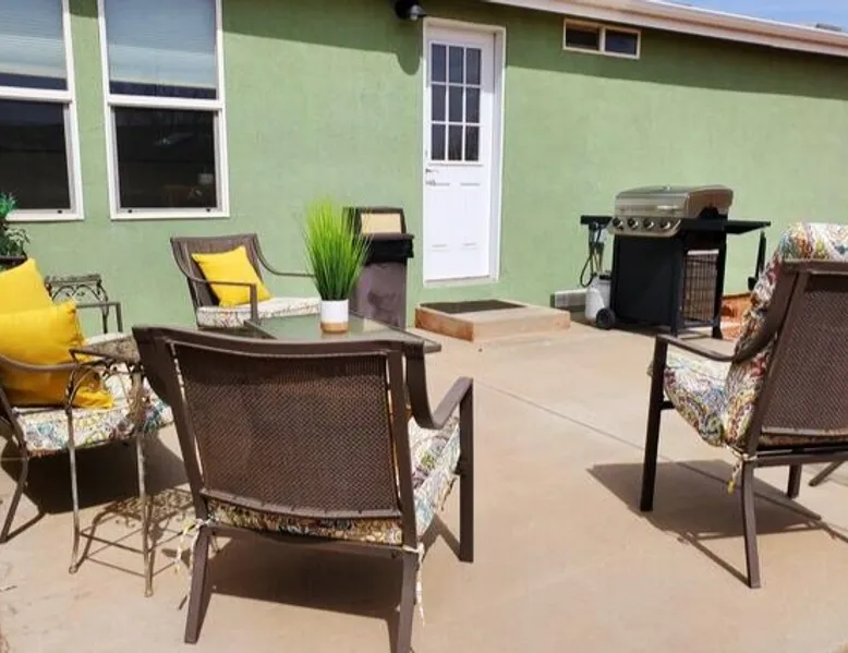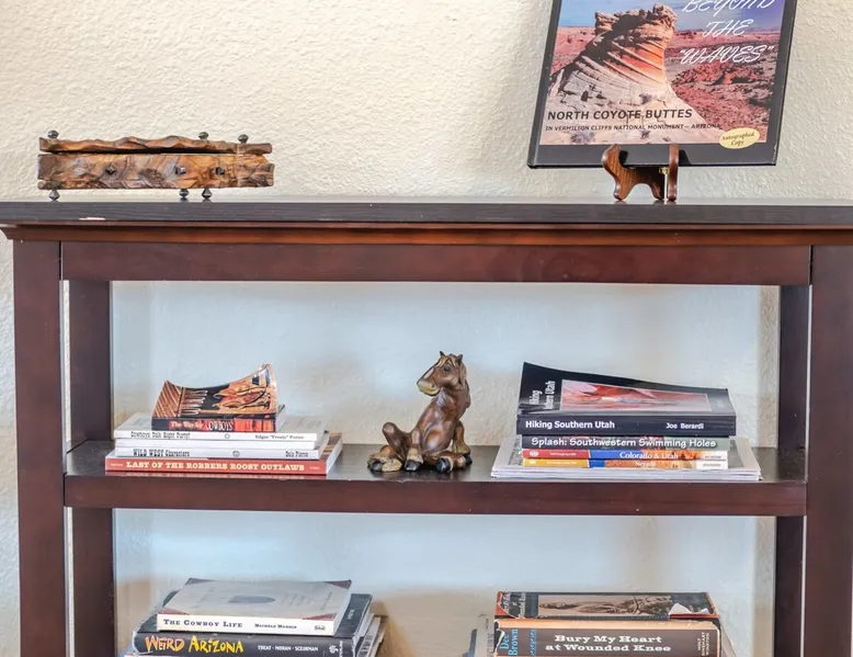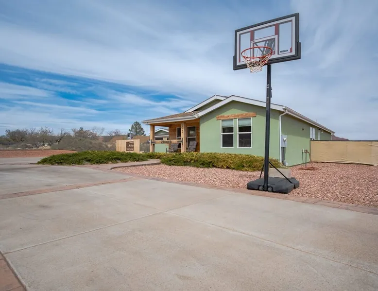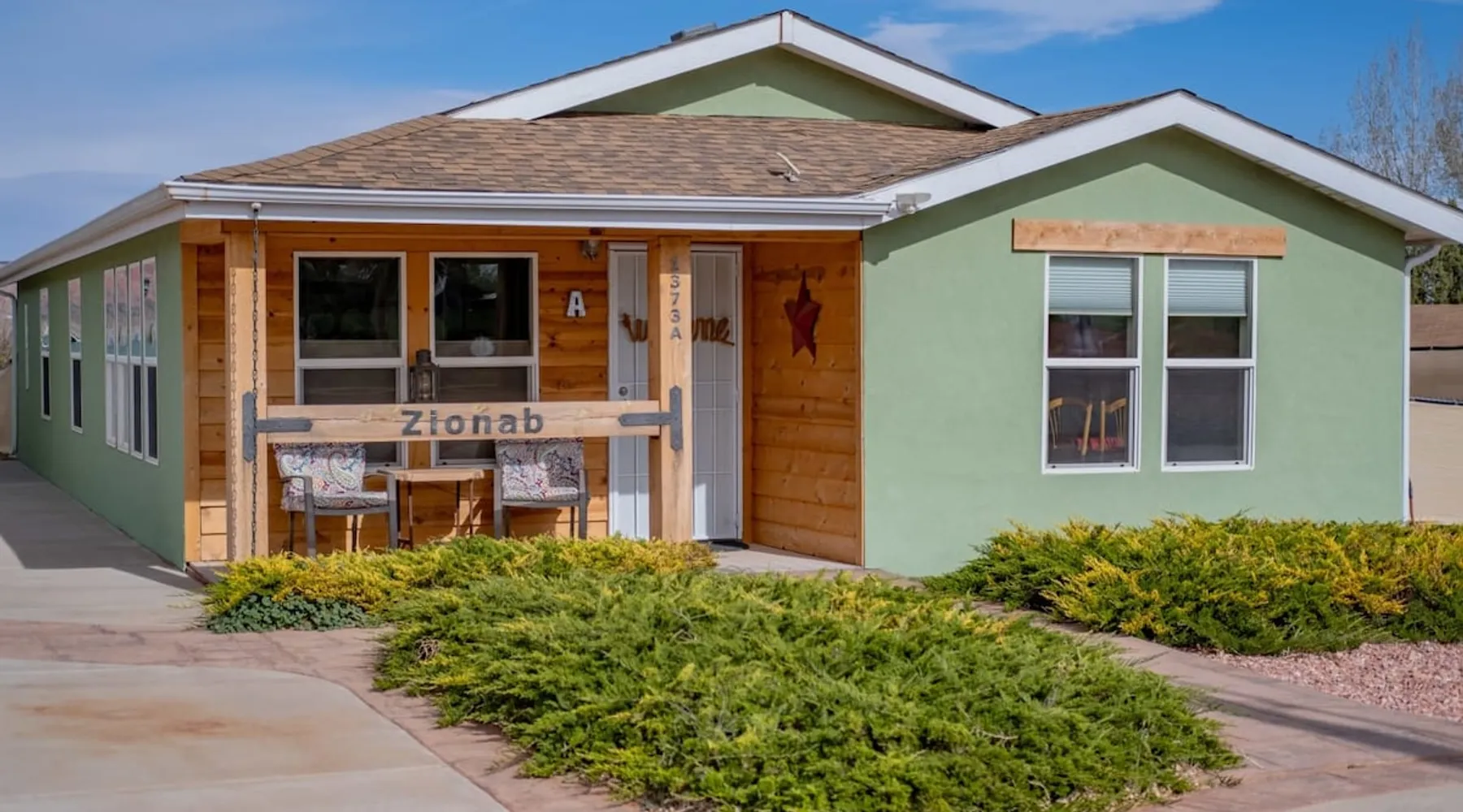 Our goal is for you to say, This is the BEST vacation rental ever! We want you to relax in comfort amid the art-filled, Western decor. Feel at home in the well-stocked, labeled kitchen & baths cleaned w/scent free products. Stay connected w/fast 1GB wifi. Drink in the red rock views from the BBQ patio. Stargaze beside the fire in the PRIVATE, fully fenced back yard! Keep kids busy w/board games & outdoor activities. All in Kanab which has 2 grocery stores, 35 eateries, 2 theaters & fun nitelife Unit A of Zionab Vacation Homes features a tasteful and fun decor with many original works of art, custom-made furnishings and hand-forged ironwork crafted by the owner. We have tried to supply the home so that all you need in order to vacation comfortably is your clothing. Each unit enjoys it's own private, unshared outdoor space. Cleanliness has always been a priority, but since the Pandemic, we've taken extra measures to ensure you arrive to a clean, sanitized home that is safe and comfortable. In 2022, we switched our laundry soap to scent free and started using more natural, low scented cleaning products like vinegar and Simple Green. Zionab is a great place to enjoy a working vacation with a dedicated work space and fast, reliable 1GBPS fiber-optic internet. The roomy kitchen is well-stocked for cooking up your family's favorites. Besides the glasstop stove/oven combo and microwave, there is a large and mini crock pot, an electric griddle for pancakes and such, a food processor for quick prep, a blender for your frozen favorites and a dishwasher for quick clean-up. There's also a 12-cup drip coffee pot with a single cup option and an electric water pot for tea. As for cooking essentials, Zionab provides a more than adequate supply of pots, pans, lids and bowls to prepare most dishes, along with a nice array of spices and staples like flour, sugars, oils and condiments. We have outfitted the house with indoor games, puzzles and quick crafts. For outdoor fun, there's corn hole and yard darts, a basketball hoop, soccer and footballs, and frisbees that can be enjoyed on site or across the street at the Ranchos City Park. Zionab has a huge outdoor fire-pit complete marshmallow roasters for S'mores. When you are ready to chill, our HUGE flat screen TV with ROKU streams dozens of channels. We offer Amazon Prime as well as a variety of DVD's and an HDMI cable connection for entertainment streamed from your device through the fast 1GBps fiber optic WIFI. There's also Red Box Rentals at both of the nearby grocery stores for newer releases. At day's end you can soothe those tired muscles in a hot, soaking bath in the Master Suite's garden tub outfitted with complimentary bath salts. The 50 gallon, quick-recovery water heater will ensure everyone has plenty of hot water to bathe before bed. Speaking of bed, the Master Suite features a gorgeous king-sized poster bed with a luxurious pillow top mattress piled hight with tons of pillows and invitingly crisp, clean sheets. Cellular shades and black-out curtains make sleeping-in so inviting. The Master bedroom is decorated in a romantic shabby chic decor that is full of soft, inviting textures that make you feel oh so pampered. Enjoy the cozy, mood setting electric fireplace as you wind down from your adventure filled day. The second bedroom is all horses and cowboys with denim and cowhide. The semi-firm, queen-size Serta pillow-top mattress is piled high with pillows and cozy bedding. The headboard is crafted of Juniper wood made from a tree that shaded a livestock shipping corral in it's former life. Blackout curtains and cellular shades close the world out to let you dream peacefully. A comfortable chair makes a great reading nook or spot to relax while you post pictures of the day's adventures. The Cowboy room features double closets with plenty of space to store luggage. This bedroom is located adjacent to the roomy guest bathroom which features a tub/shower combo. The third bedroom, the Cactus Room, features artwork of desert landscapes. It has two twin beds that can convert to a king size bed for added flexibility in accommodating couples. A large, comfortable chair provides a cozy spot for catching up on your social media. Luggage racks and a sizeable dresser help you stay organized. The fourth sleeping option is a futon couch that converts to a double bed located in the office area off to the side of the living room and kitchen. This sunny spot is perfect for enjoying your morning coffee or an afternoon nap. The office area includes a desk that is outfitted with a charging station, a complimentary laptop and our insider's guide to Kanab and the surrounding area. You are sure to enjoy Zionab's fiber optic internet speed of 1GBps - a rarity for a small town like Kanab. The West facing dining room seats eight and provides gorgeous views of the red rocks and lush green surroundings. A separate breakfast bar has seating for two. The back patio has a bistro table that seats two. Further out in the backyard by the outdoor fire pit is a picnic table that seats 6. It's the perfect area for singing campfire songs and roasting marshmallows or just soaking in the amazing red rock views. If you prefer to dine out, downtown Kanab is just 2 miles away and offers 35 eateries (of which only 4 are franchises). Zionab has central air conditioning and heat with ceiling fans in every room. There is an extra large washer and dryer for your convenience. Need to stretch your legs? Zionab is conveniently located across from a grassy, tree filled city park which offers the perfect place for travelers to stretch after being cramped in a car all day. Take a leisurely stroll around the 1/2 mile track, enjoy a heart pumping game of soccer, throw some Frisbee or fly a kite - all using the equipment available in Zionab's toy box. Prefer relaxing? Then you can enjoy the views of contrasting crimson red and verdant green scenery while you do some grilling on Zionab's private back pa