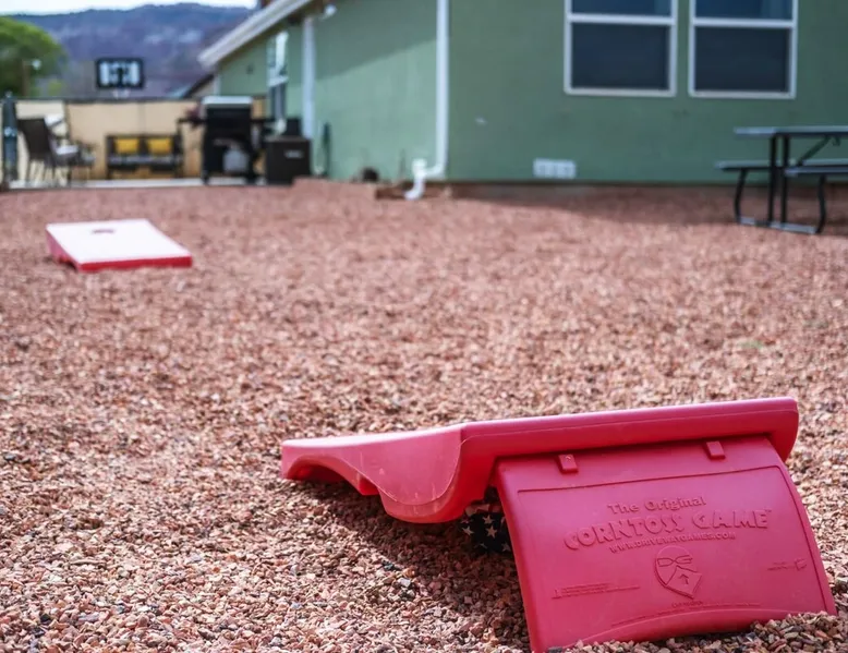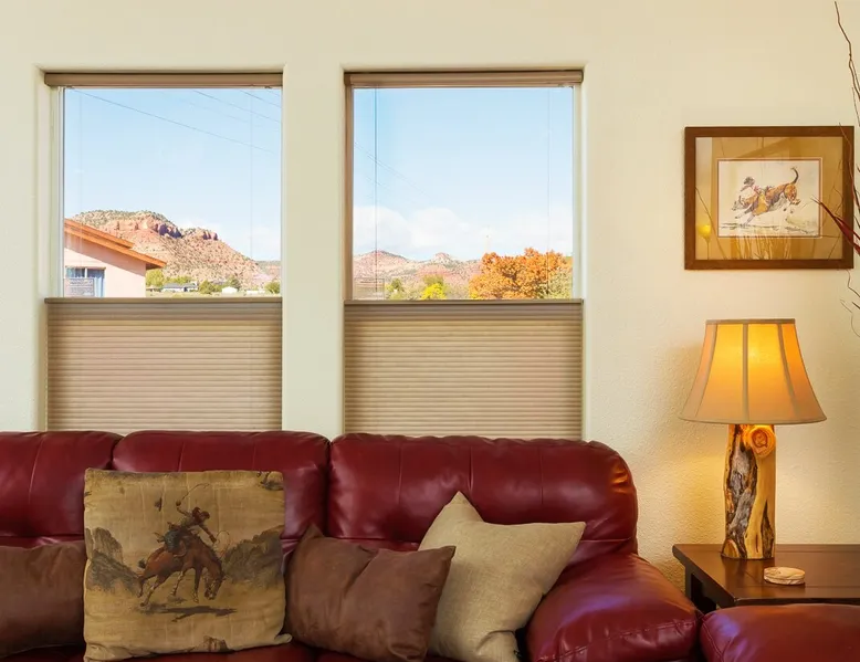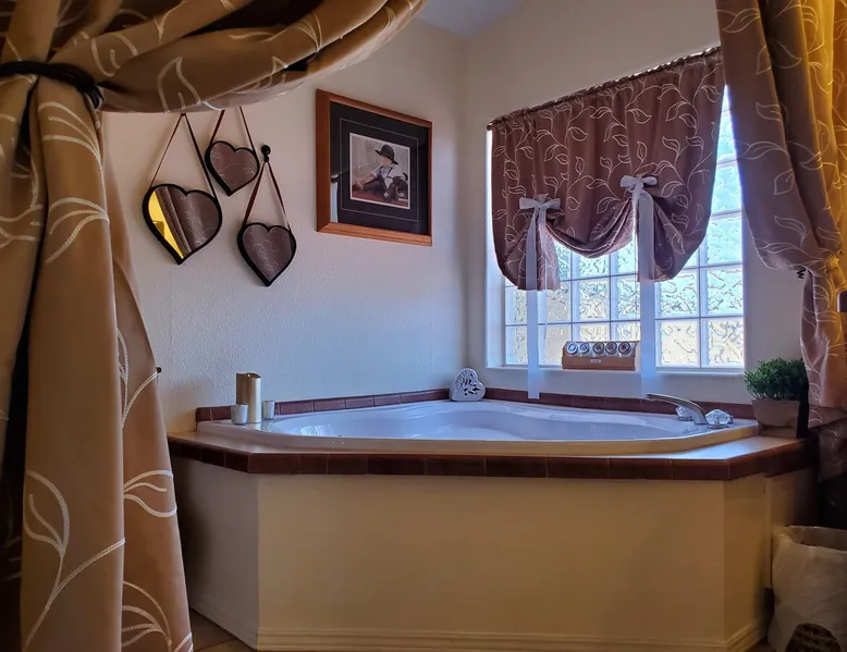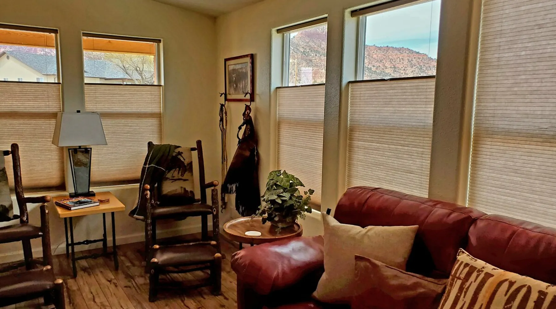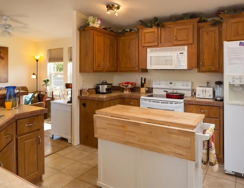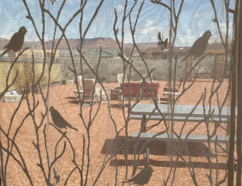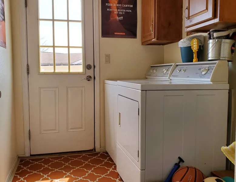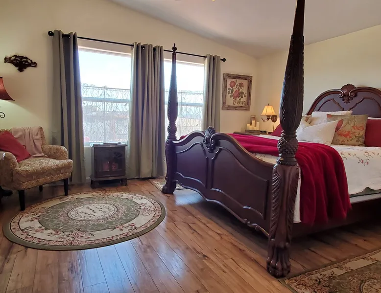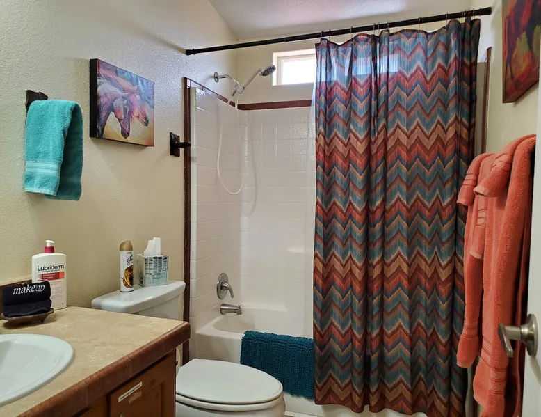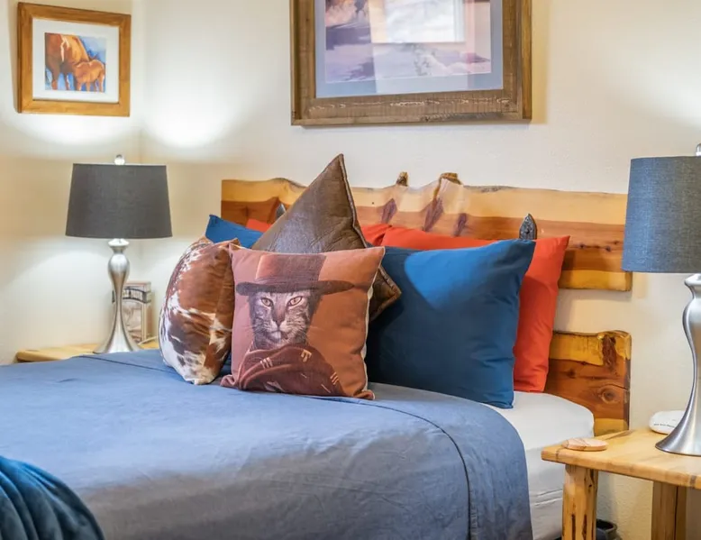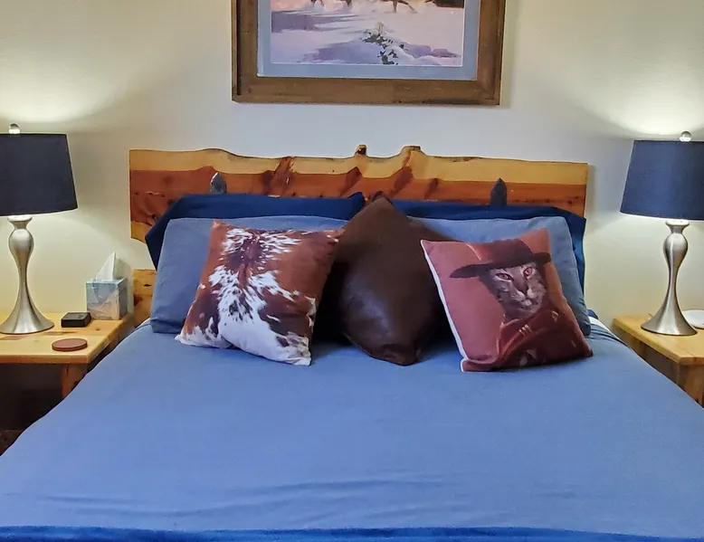 Our goal is for you to say, This is the BEST vacation rental ever! We want you to relax in comfort amid the art-filled, Western decor. Feel at home in the well-stocked, labeled kitchen & baths cleaned w/scent free products. Stay connected w/fast 1GB wifi. Drink in the red rock views from the BBQ patio. Stargaze beside the fire in the PRIVATE, fully fenced back yard! Keep kids busy w/board games & outdoor activities. All in Kanab which has 2 grocery stores, 35 eateries, 2 theaters & fun nitelife Unit A of Zionab Vacation Homes features a tasteful and fun decor with many original works of art, custom-made furnishings and hand-forged ironwork crafted by the owner. We have tried to supply the home so that all you need in order to vacation comfortably is your clothing. Each unit enjoys it's own private, unshared outdoor space. Cleanliness has always been a priority, but since the Pandemic, we've taken extra measures to ensure you arrive to a clean, sanitized home that is safe and comfortable. In 2022, we switched our laundry soap to scent free and started using more natural, low scented cleaning products like vinegar and Simple Green. Zionab is a great place to enjoy a working vacation with a dedicated work space and fast, reliable 1GBPS fiber-optic internet. The roomy kitchen is well-stocked for cooking up your family's favorites. Besides the glasstop stove/oven combo and microwave, there is a large and mini crock pot, an electric griddle for pancakes and such, a food processor for quick prep, a blender for your frozen favorites and a dishwasher for quick clean-up. There's also a 12-cup drip coffee pot with a single cup option and an electric water pot for tea. As for cooking essentials, Zionab provides a more than adequate supply of pots, pans, lids and bowls to prepare most dishes, along with a nice array of spices and staples like flour, sugars, oils and condiments. We have outfitted the house with indoor games, puzzles and quick crafts. For outdoor fun, there's corn hole and yard darts, a basketball hoop, soccer and footballs, and frisbees that can be enjoyed on site or across the street at the Ranchos City Park. Zionab has a huge outdoor fire-pit complete marshmallow roasters for S'mores. When you are ready to chill, our HUGE flat screen TV with ROKU streams dozens of channels. We offer Amazon Prime as well as a variety of DVD's and an HDMI cable connection for entertainment streamed from your device through the fast 1GBps fiber optic WIFI. There's also Red Box Rentals at both of the nearby grocery stores for newer releases. At day's end you can soothe those tired muscles in a hot, soaking bath in the Master Suite's garden tub outfitted with complimentary bath salts. The 50 gallon, quick-recovery water heater will ensure everyone has plenty of hot water to bathe before bed. Speaking of bed, the Master Suite features a gorgeous king-sized poster bed with a luxurious pillow top mattress piled hight with tons of pillows and invitingly crisp, clean sheets. Cellular shades and black-out curtains make sleeping-in so inviting. The Master bedroom is decorated in a romantic shabby chic decor that is full of soft, inviting textures that make you feel oh so pampered. Enjoy the cozy, mood setting electric fireplace as you wind down from your adventure filled day. The second bedroom is all horses and cowboys with denim and cowhide. The semi-firm, queen-size Serta pillow-top mattress is piled high with pillows and cozy bedding. The headboard is crafted of Juniper wood made from a tree that shaded a livestock shipping corral in it's former life. Blackout curtains and cellular shades close the world out to let you dream peacefully. A comfortable chair makes a great reading nook or spot to relax while you post pictures of the day's adventures. The Cowboy room features double closets with plenty of space to store luggage. This bedroom is located adjacent to the roomy guest bathroom which features a tub/shower combo. The third bedroom, the Cactus Room, features artwork of desert landscapes. It has two twin beds that can convert to a king size bed for added flexibility in accommodating couples. A large, comfortable chair provides a cozy spot for catching up on your social media. Luggage racks and a sizeable dresser help you stay organized. The fourth sleeping option is a futon couch that converts to a double bed located in the office area off to the side of the living room and kitchen. This sunny spot is perfect for enjoying your morning coffee or an afternoon nap. The office area includes a desk that is outfitted with a charging station, a complimentary laptop and our insider's guide to Kanab and the surrounding area. You are sure to enjoy Zionab's fiber optic internet speed of 1GBps - a rarity for a small town like Kanab. The West facing dining room seats eight and provides gorgeous views of the red rocks and lush green surroundings. A separate breakfast bar has seating for two. The back patio has a bistro table that seats two. Further out in the backyard by the outdoor fire pit is a picnic table that seats 6. It's the perfect area for singing campfire songs and roasting marshmallows or just soaking in the amazing red rock views. If you prefer to dine out, downtown Kanab is just 2 miles away and offers 35 eateries (of which only 4 are franchises). Zionab has central air conditioning and heat with ceiling fans in every room. There is an extra large washer and dryer for your convenience. Need to stretch your legs? Zionab is conveniently located across from a grassy, tree filled city park which offers the perfect place for travelers to stretch after being cramped in a car all day. Take a leisurely stroll around the 1/2 mile track, enjoy a heart pumping game of soccer, throw some Frisbee or fly a kite - all using the equipment available in Zionab's toy box. Prefer relaxing? Then you can enjoy the views of contrasting crimson red and verdant green scenery while you do some grilling on Zionab's private back pa