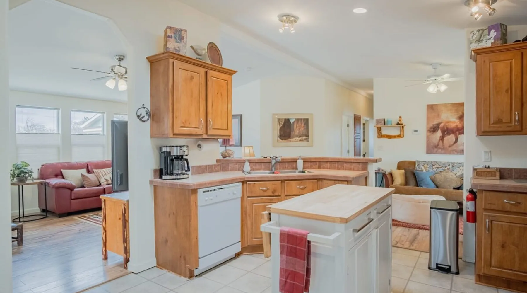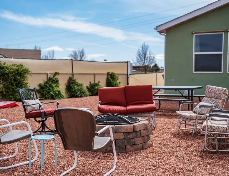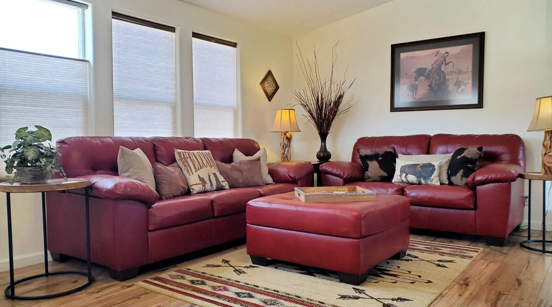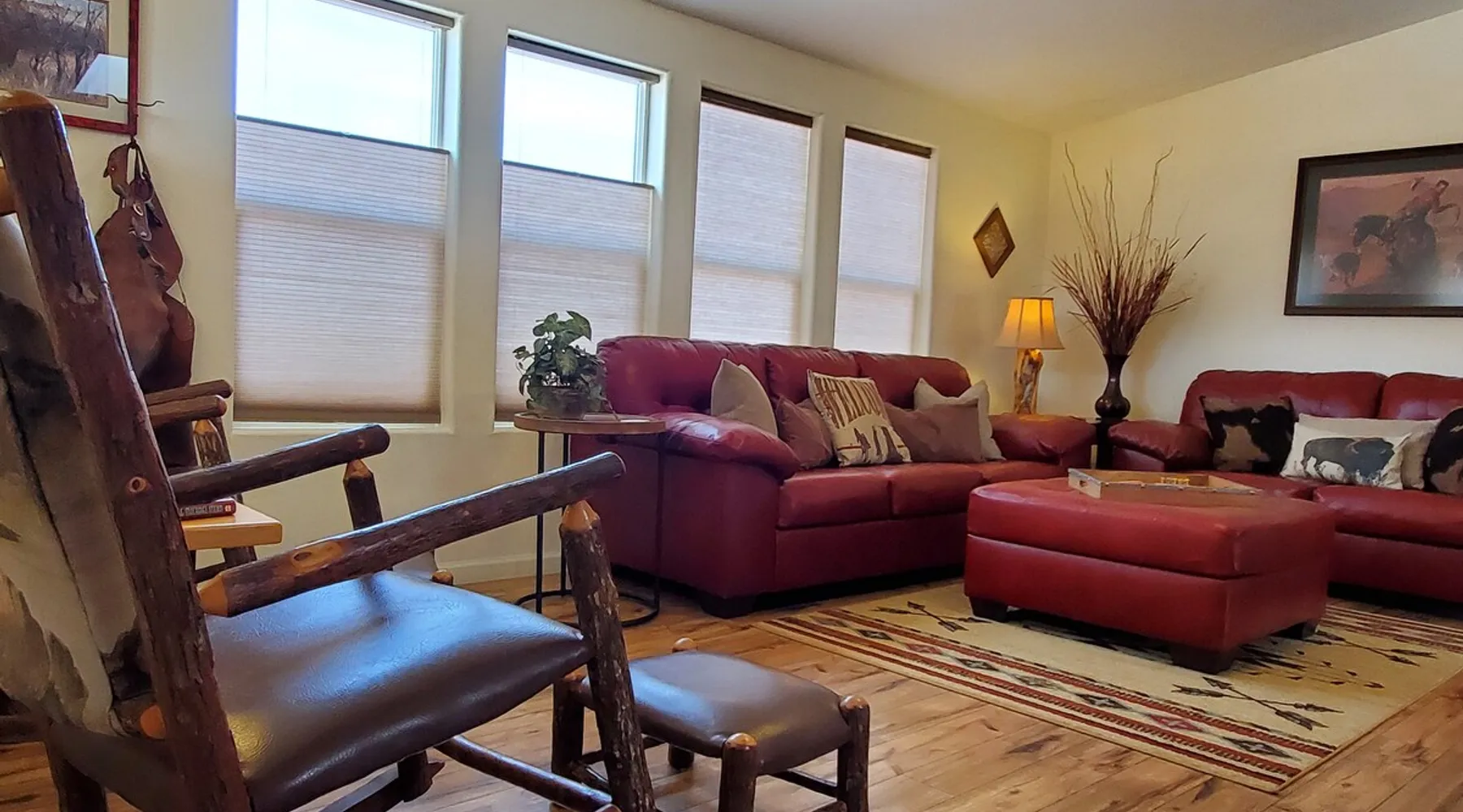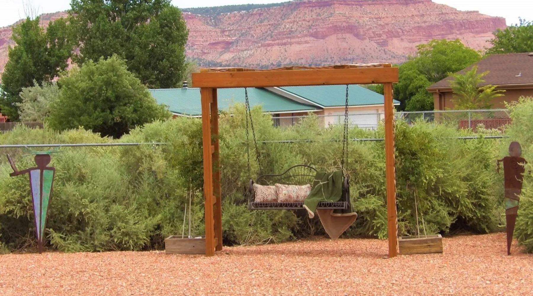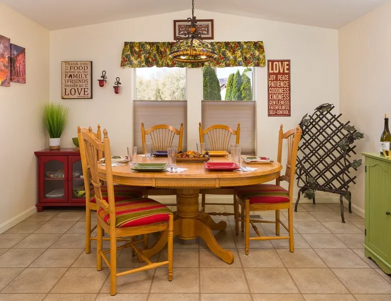 Our goal is for you to say, This is the BEST vacation rental ever! We want you to relax in comfort amid the art-filled, Western decor. Feel at home in the well-stocked, labeled kitchen & baths cleaned w/scent free products. Stay connected w/fast 1GB wifi. Drink in the red rock views from the BBQ patio. Stargaze beside the fire in the PRIVATE, fully fenced back yard! Keep kids busy w/board games & outdoor activities. All in Kanab which has 2 grocery stores, 35 eateries, 2 theaters & fun nitelife Unit A of Zionab Vacation Homes features a tasteful and fun decor with many original works of art, custom-made furnishings and hand-forged ironwork crafted by the owner. We have tried to supply the home so that all you need in order to vacation comfortably is your clothing. Each unit enjoys it's own private, unshared outdoor space. Cleanliness has always been a priority, but since the Pandemic, we've taken extra measures to ensure you arrive to a clean, sanitized home that is safe and comfortable. In 2022, we switched our laundry soap to scent free and started using more natural, low scented cleaning products like vinegar and Simple Green. Zionab is a great place to enjoy a working vacation with a dedicated work space and fast, reliable 1GBPS fiber-optic internet. The roomy kitchen is well-stocked for cooking up your family's favorites. Besides the glasstop stove/oven combo and microwave, there is a large and mini crock pot, an electric griddle for pancakes and such, a food processor for quick prep, a blender for your frozen favorites and a dishwasher for quick clean-up. There's also a 12-cup drip coffee pot with a single cup option and an electric water pot for tea. As for cooking essentials, Zionab provides a more than adequate supply of pots, pans, lids and bowls to prepare most dishes, along with a nice array of spices and staples like flour, sugars, oils and condiments. We have outfitted the house with indoor games, puzzles and quick crafts. For outdoor fun, there's corn hole and yard darts, a basketball hoop, soccer and footballs, and frisbees that can be enjoyed on site or across the street at the Ranchos City Park. Zionab has a huge outdoor fire-pit complete marshmallow roasters for S'mores. When you are ready to chill, our HUGE flat screen TV with ROKU streams dozens of channels. We offer Amazon Prime as well as a variety of DVD's and an HDMI cable connection for entertainment streamed from your device through the fast 1GBps fiber optic WIFI. There's also Red Box Rentals at both of the nearby grocery stores for newer releases. At day's end you can soothe those tired muscles in a hot, soaking bath in the Master Suite's garden tub outfitted with complimentary bath salts. The 50 gallon, quick-recovery water heater will ensure everyone has plenty of hot water to bathe before bed. Speaking of bed, the Master Suite features a gorgeous king-sized poster bed with a luxurious pillow top mattress piled hight with tons of pillows and invitingly crisp, clean sheets. Cellular shades and black-out curtains make sleeping-in so inviting. The Master bedroom is decorated in a romantic shabby chic decor that is full of soft, inviting textures that make you feel oh so pampered. Enjoy the cozy, mood setting electric fireplace as you wind down from your adventure filled day. The second bedroom is all horses and cowboys with denim and cowhide. The semi-firm, queen-size Serta pillow-top mattress is piled high with pillows and cozy bedding. The headboard is crafted of Juniper wood made from a tree that shaded a livestock shipping corral in it's former life. Blackout curtains and cellular shades close the world out to let you dream peacefully. A comfortable chair makes a great reading nook or spot to relax while you post pictures of the day's adventures. The Cowboy room features double closets with plenty of space to store luggage. This bedroom is located adjacent to the roomy guest bathroom which features a tub/shower combo. The third bedroom, the Cactus Room, features artwork of desert landscapes. It has two twin beds that can convert to a king size bed for added flexibility in accommodating couples. A large, comfortable chair provides a cozy spot for catching up on your social media. Luggage racks and a sizeable dresser help you stay organized. The fourth sleeping option is a futon couch that converts to a double bed located in the office area off to the side of the living room and kitchen. This sunny spot is perfect for enjoying your morning coffee or an afternoon nap. The office area includes a desk that is outfitted with a charging station, a complimentary laptop and our insider's guide to Kanab and the surrounding area. You are sure to enjoy Zionab's fiber optic internet speed of 1GBps - a rarity for a small town like Kanab. The West facing dining room seats eight and provides gorgeous views of the red rocks and lush green surroundings. A separate breakfast bar has seating for two. The back patio has a bistro table that seats two. Further out in the backyard by the outdoor fire pit is a picnic table that seats 6. It's the perfect area for singing campfire songs and roasting marshmallows or just soaking in the amazing red rock views. If you prefer to dine out, downtown Kanab is just 2 miles away and offers 35 eateries (of which only 4 are franchises). Zionab has central air conditioning and heat with ceiling fans in every room. There is an extra large washer and dryer for your convenience. Need to stretch your legs? Zionab is conveniently located across from a grassy, tree filled city park which offers the perfect place for travelers to stretch after being cramped in a car all day. Take a leisurely stroll around the 1/2 mile track, enjoy a heart pumping game of soccer, throw some Frisbee or fly a kite - all using the equipment available in Zionab's toy box. Prefer relaxing? Then you can enjoy the views of contrasting crimson red and verdant green scenery while you do some grilling on Zionab's private back pa
