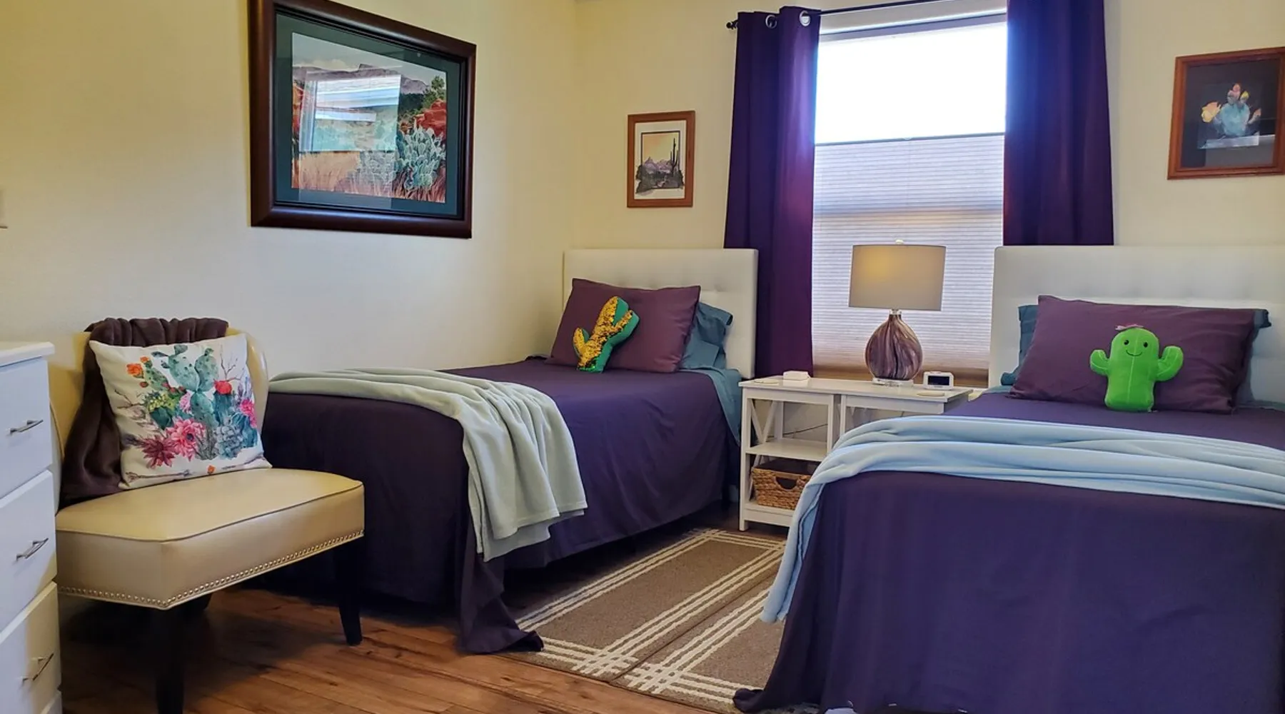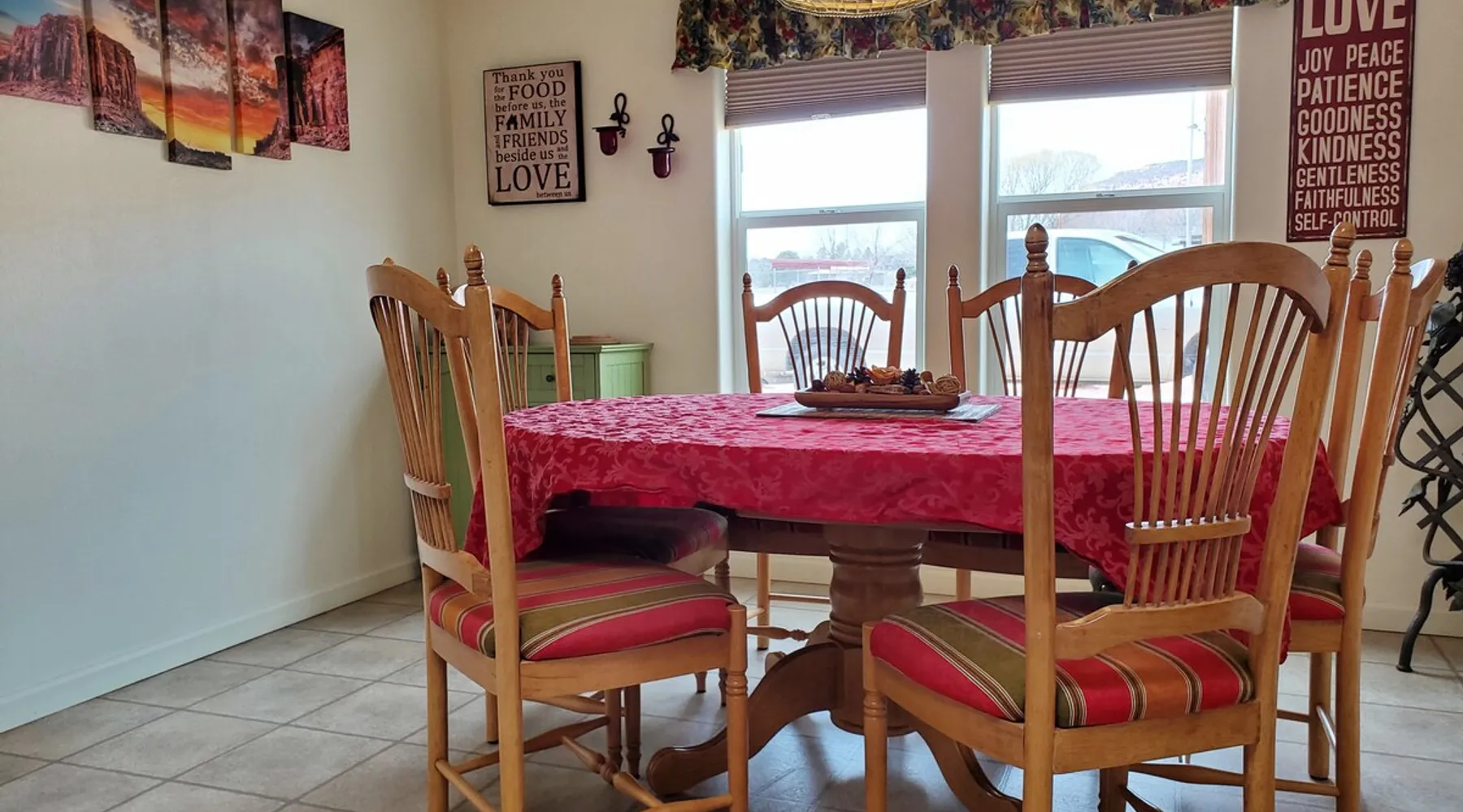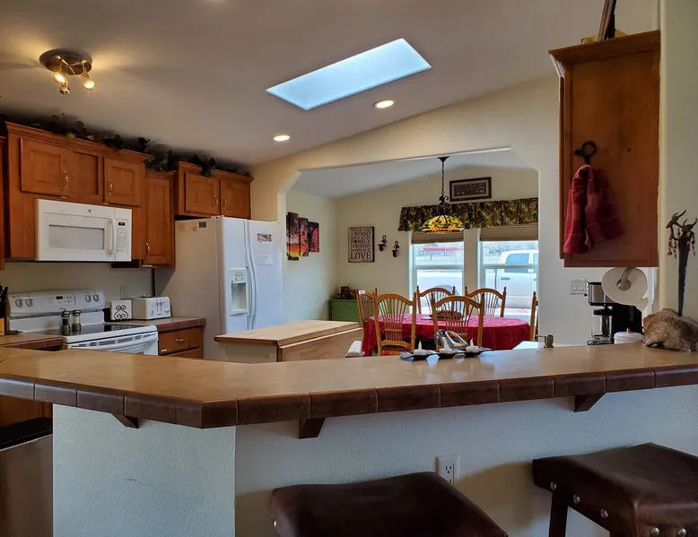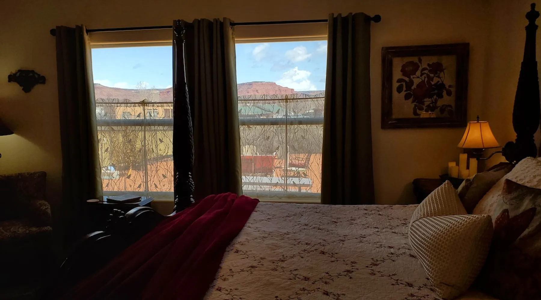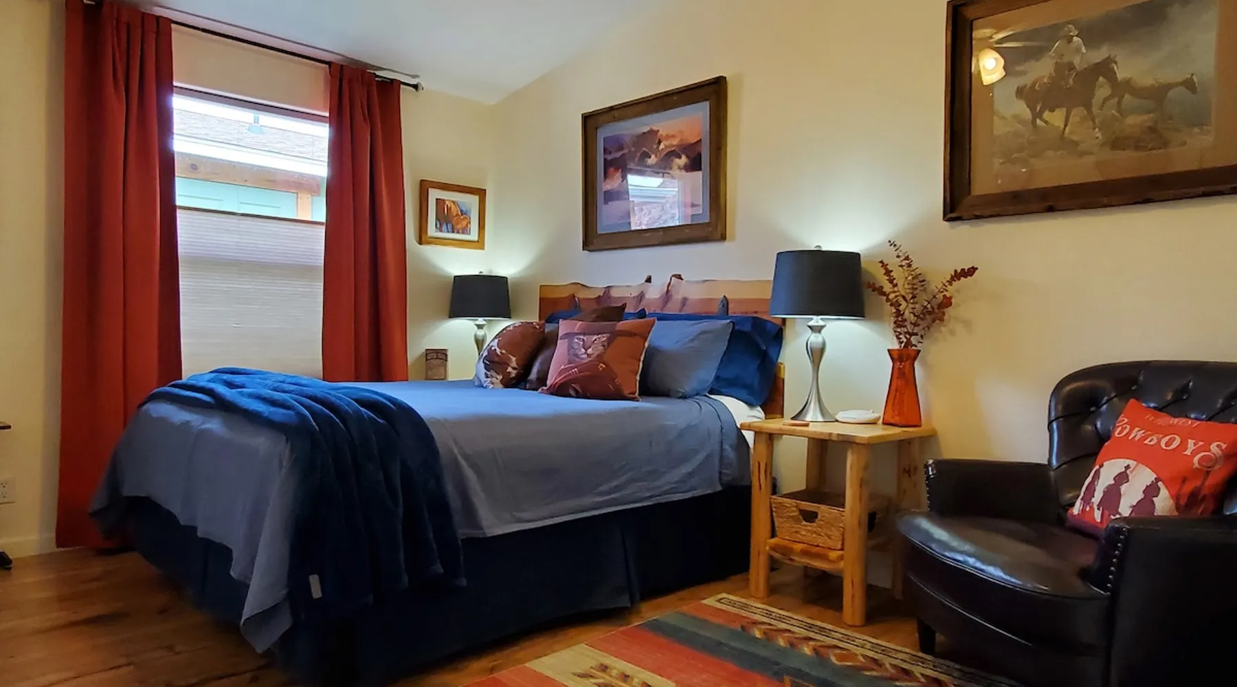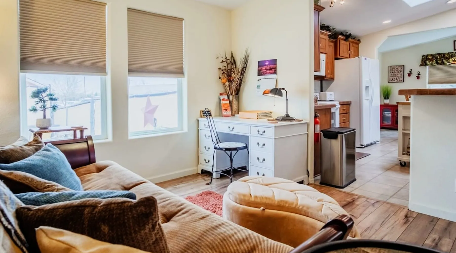 Our goal is for you to say, This is the BEST vacation rental ever! We want you to relax in comfort amid the art-filled, Western decor. Feel at home in the well-stocked, labeled kitchen & baths cleaned w/scent free products. Stay connected w/fast 1GB wifi. Drink in the red rock views from the BBQ patio. Stargaze beside the fire in the PRIVATE, fully fenced back yard! Keep kids busy w/board games & outdoor activities. All in Kanab which has 2 grocery stores, 35 eateries, 2 theaters & fun nitelife Unit A of Zionab Vacation Homes features a tasteful and fun decor with many original works of art, custom-made furnishings and hand-forged ironwork crafted by the owner. We have tried to supply the home so that all you need in order to vacation comfortably is your clothing. Each unit enjoys it's own private, unshared outdoor space. Cleanliness has always been a priority, but since the Pandemic, we've taken extra measures to ensure you arrive to a clean, sanitized home that is safe and comfortable. In 2022, we switched our laundry soap to scent free and started using more natural, low scented cleaning products like vinegar and Simple Green. Zionab is a great place to enjoy a working vacation with a dedicated work space and fast, reliable 1GBPS fiber-optic internet. The roomy kitchen is well-stocked for cooking up your family's favorites. Besides the glasstop stove/oven combo and microwave, there is a large and mini crock pot, an electric griddle for pancakes and such, a food processor for quick prep, a blender for your frozen favorites and a dishwasher for quick clean-up. There's also a 12-cup drip coffee pot with a single cup option and an electric water pot for tea. As for cooking essentials, Zionab provides a more than adequate supply of pots, pans, lids and bowls to prepare most dishes, along with a nice array of spices and staples like flour, sugars, oils and condiments. We have outfitted the house with indoor games, puzzles and quick crafts. For outdoor fun, there's corn hole and yard darts, a basketball hoop, soccer and footballs, and frisbees that can be enjoyed on site or across the street at the Ranchos City Park. Zionab has a huge outdoor fire-pit complete marshmallow roasters for S'mores. When you are ready to chill, our HUGE flat screen TV with ROKU streams dozens of channels. We offer Amazon Prime as well as a variety of DVD's and an HDMI cable connection for entertainment streamed from your device through the fast 1GBps fiber optic WIFI. There's also Red Box Rentals at both of the nearby grocery stores for newer releases. At day's end you can soothe those tired muscles in a hot, soaking bath in the Master Suite's garden tub outfitted with complimentary bath salts. The 50 gallon, quick-recovery water heater will ensure everyone has plenty of hot water to bathe before bed. Speaking of bed, the Master Suite features a gorgeous king-sized poster bed with a luxurious pillow top mattress piled hight with tons of pillows and invitingly crisp, clean sheets. Cellular shades and black-out curtains make sleeping-in so inviting. The Master bedroom is decorated in a romantic shabby chic decor that is full of soft, inviting textures that make you feel oh so pampered. Enjoy the cozy, mood setting electric fireplace as you wind down from your adventure filled day. The second bedroom is all horses and cowboys with denim and cowhide. The semi-firm, queen-size Serta pillow-top mattress is piled high with pillows and cozy bedding. The headboard is crafted of Juniper wood made from a tree that shaded a livestock shipping corral in it's former life. Blackout curtains and cellular shades close the world out to let you dream peacefully. A comfortable chair makes a great reading nook or spot to relax while you post pictures of the day's adventures. The Cowboy room features double closets with plenty of space to store luggage. This bedroom is located adjacent to the roomy guest bathroom which features a tub/shower combo. The third bedroom, the Cactus Room, features artwork of desert landscapes. It has two twin beds that can convert to a king size bed for added flexibility in accommodating couples. A large, comfortable chair provides a cozy spot for catching up on your social media. Luggage racks and a sizeable dresser help you stay organized. The fourth sleeping option is a futon couch that converts to a double bed located in the office area off to the side of the living room and kitchen. This sunny spot is perfect for enjoying your morning coffee or an afternoon nap. The office area includes a desk that is outfitted with a charging station, a complimentary laptop and our insider's guide to Kanab and the surrounding area. You are sure to enjoy Zionab's fiber optic internet speed of 1GBps - a rarity for a small town like Kanab. The West facing dining room seats eight and provides gorgeous views of the red rocks and lush green surroundings. A separate breakfast bar has seating for two. The back patio has a bistro table that seats two. Further out in the backyard by the outdoor fire pit is a picnic table that seats 6. It's the perfect area for singing campfire songs and roasting marshmallows or just soaking in the amazing red rock views. If you prefer to dine out, downtown Kanab is just 2 miles away and offers 35 eateries (of which only 4 are franchises). Zionab has central air conditioning and heat with ceiling fans in every room. There is an extra large washer and dryer for your convenience. Need to stretch your legs? Zionab is conveniently located across from a grassy, tree filled city park which offers the perfect place for travelers to stretch after being cramped in a car all day. Take a leisurely stroll around the 1/2 mile track, enjoy a heart pumping game of soccer, throw some Frisbee or fly a kite - all using the equipment available in Zionab's toy box. Prefer relaxing? Then you can enjoy the views of contrasting crimson red and verdant green scenery while you do some grilling on Zionab's private back pa