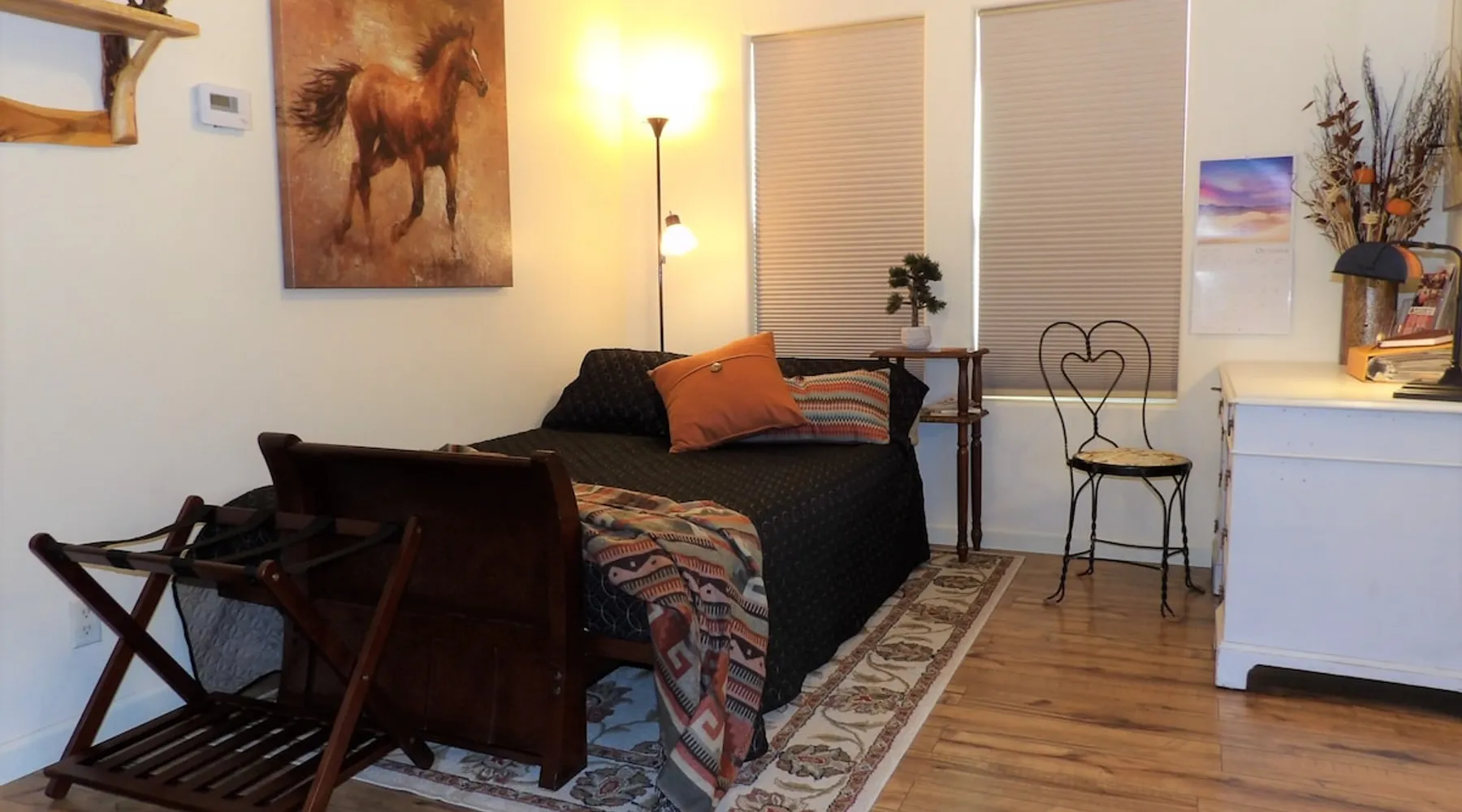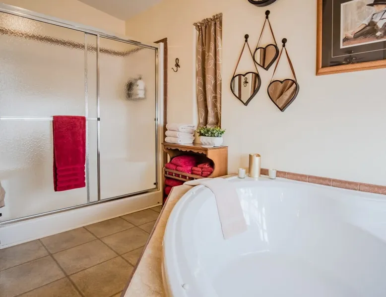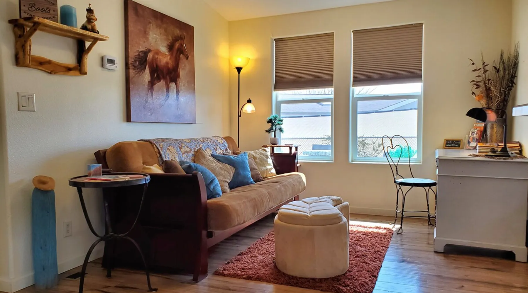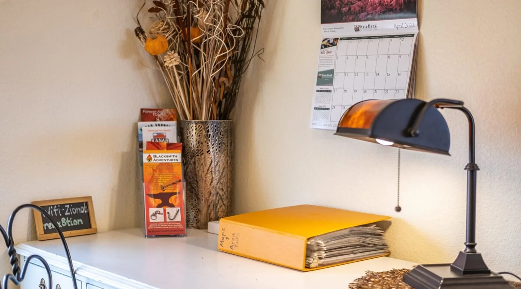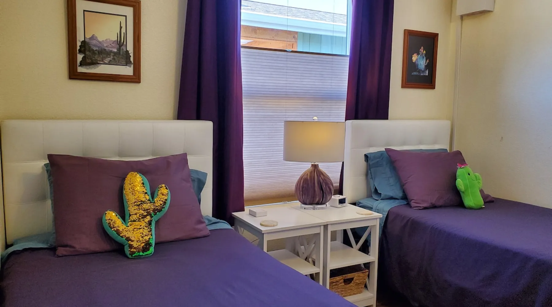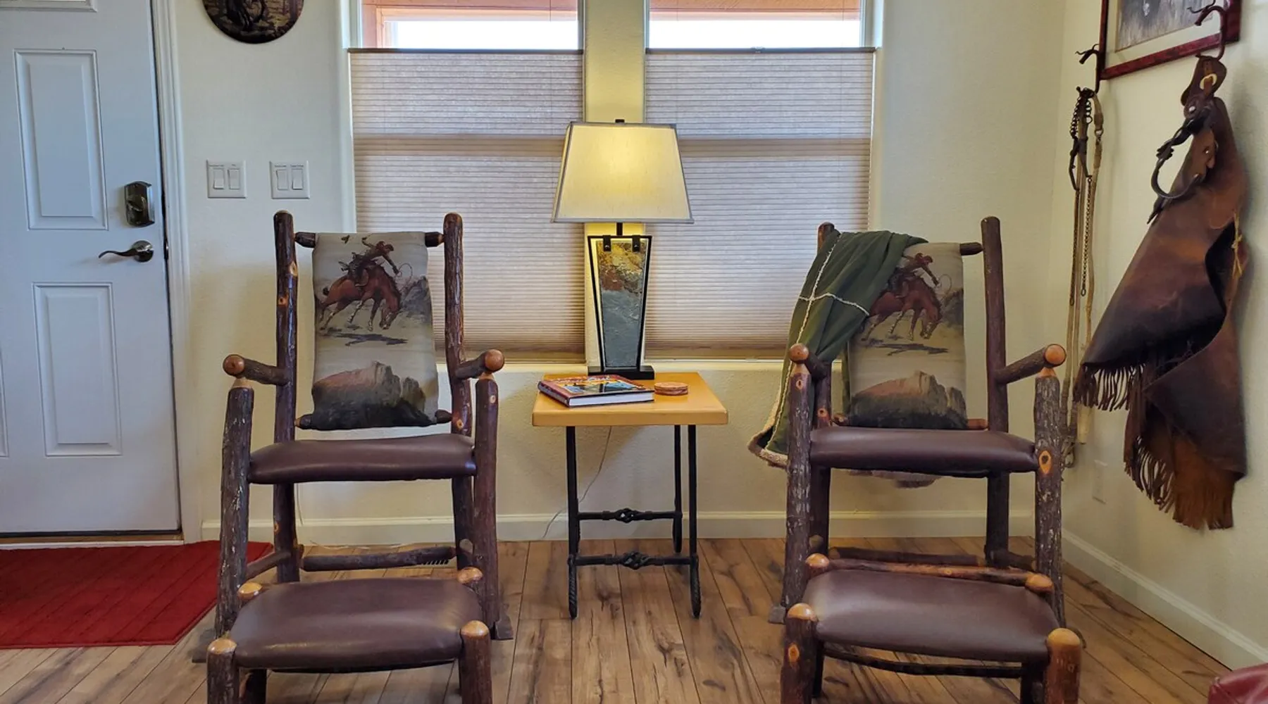 Our goal is for you to say, This is the BEST vacation rental ever! We want you to relax in comfort amid the art-filled, Western decor. Feel at home in the well-stocked, labeled kitchen & baths cleaned w/scent free products. Stay connected w/fast 1GB wifi. Drink in the red rock views from the BBQ patio. Stargaze beside the fire in the PRIVATE, fully fenced back yard! Keep kids busy w/board games & outdoor activities. All in Kanab which has 2 grocery stores, 35 eateries, 2 theaters & fun nitelife Unit A of Zionab Vacation Homes features a tasteful and fun decor with many original works of art, custom-made furnishings and hand-forged ironwork crafted by the owner. We have tried to supply the home so that all you need in order to vacation comfortably is your clothing. Each unit enjoys it's own private, unshared outdoor space. Cleanliness has always been a priority, but since the Pandemic, we've taken extra measures to ensure you arrive to a clean, sanitized home that is safe and comfortable. In 2022, we switched our laundry soap to scent free and started using more natural, low scented cleaning products like vinegar and Simple Green. Zionab is a great place to enjoy a working vacation with a dedicated work space and fast, reliable 1GBPS fiber-optic internet. The roomy kitchen is well-stocked for cooking up your family's favorites. Besides the glasstop stove/oven combo and microwave, there is a large and mini crock pot, an electric griddle for pancakes and such, a food processor for quick prep, a blender for your frozen favorites and a dishwasher for quick clean-up. There's also a 12-cup drip coffee pot with a single cup option and an electric water pot for tea. As for cooking essentials, Zionab provides a more than adequate supply of pots, pans, lids and bowls to prepare most dishes, along with a nice array of spices and staples like flour, sugars, oils and condiments. We have outfitted the house with indoor games, puzzles and quick crafts. For outdoor fun, there's corn hole and yard darts, a basketball hoop, soccer and footballs, and frisbees that can be enjoyed on site or across the street at the Ranchos City Park. Zionab has a huge outdoor fire-pit complete marshmallow roasters for S'mores. When you are ready to chill, our HUGE flat screen TV with ROKU streams dozens of channels. We offer Amazon Prime as well as a variety of DVD's and an HDMI cable connection for entertainment streamed from your device through the fast 1GBps fiber optic WIFI. There's also Red Box Rentals at both of the nearby grocery stores for newer releases. At day's end you can soothe those tired muscles in a hot, soaking bath in the Master Suite's garden tub outfitted with complimentary bath salts. The 50 gallon, quick-recovery water heater will ensure everyone has plenty of hot water to bathe before bed. Speaking of bed, the Master Suite features a gorgeous king-sized poster bed with a luxurious pillow top mattress piled hight with tons of pillows and invitingly crisp, clean sheets. Cellular shades and black-out curtains make sleeping-in so inviting. The Master bedroom is decorated in a romantic shabby chic decor that is full of soft, inviting textures that make you feel oh so pampered. Enjoy the cozy, mood setting electric fireplace as you wind down from your adventure filled day. The second bedroom is all horses and cowboys with denim and cowhide. The semi-firm, queen-size Serta pillow-top mattress is piled high with pillows and cozy bedding. The headboard is crafted of Juniper wood made from a tree that shaded a livestock shipping corral in it's former life. Blackout curtains and cellular shades close the world out to let you dream peacefully. A comfortable chair makes a great reading nook or spot to relax while you post pictures of the day's adventures. The Cowboy room features double closets with plenty of space to store luggage. This bedroom is located adjacent to the roomy guest bathroom which features a tub/shower combo. The third bedroom, the Cactus Room, features artwork of desert landscapes. It has two twin beds that can convert to a king size bed for added flexibility in accommodating couples. A large, comfortable chair provides a cozy spot for catching up on your social media. Luggage racks and a sizeable dresser help you stay organized. The fourth sleeping option is a futon couch that converts to a double bed located in the office area off to the side of the living room and kitchen. This sunny spot is perfect for enjoying your morning coffee or an afternoon nap. The office area includes a desk that is outfitted with a charging station, a complimentary laptop and our insider's guide to Kanab and the surrounding area. You are sure to enjoy Zionab's fiber optic internet speed of 1GBps - a rarity for a small town like Kanab. The West facing dining room seats eight and provides gorgeous views of the red rocks and lush green surroundings. A separate breakfast bar has seating for two. The back patio has a bistro table that seats two. Further out in the backyard by the outdoor fire pit is a picnic table that seats 6. It's the perfect area for singing campfire songs and roasting marshmallows or just soaking in the amazing red rock views. If you prefer to dine out, downtown Kanab is just 2 miles away and offers 35 eateries (of which only 4 are franchises). Zionab has central air conditioning and heat with ceiling fans in every room. There is an extra large washer and dryer for your convenience. Need to stretch your legs? Zionab is conveniently located across from a grassy, tree filled city park which offers the perfect place for travelers to stretch after being cramped in a car all day. Take a leisurely stroll around the 1/2 mile track, enjoy a heart pumping game of soccer, throw some Frisbee or fly a kite - all using the equipment available in Zionab's toy box. Prefer relaxing? Then you can enjoy the views of contrasting crimson red and verdant green scenery while you do some grilling on Zionab's private back pa